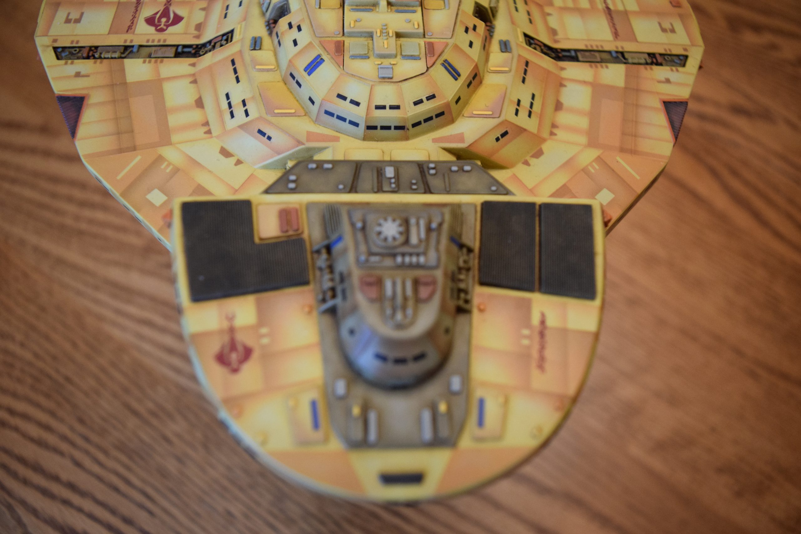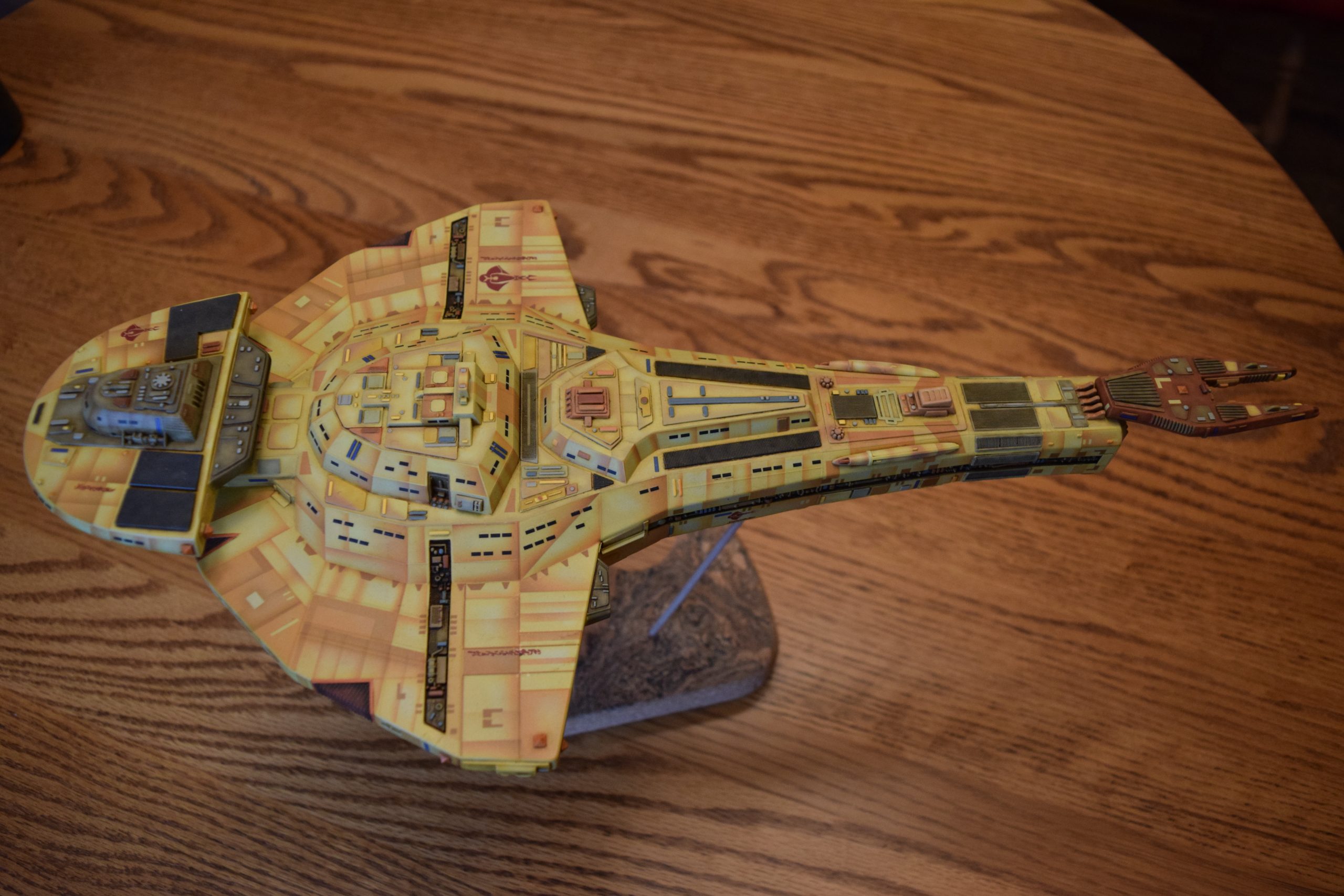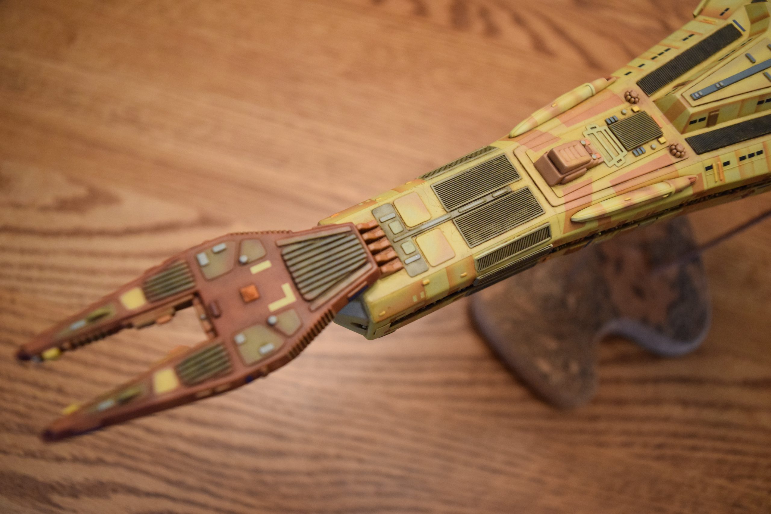 I would like to share pictures of my build-up of the AMT Galor Class Cardassian Cruiser from Round 2. I studied references of the studio model to match colors used for the main hull and details. For the base color, I two additional colors for primary shading, then, I used the hull plating decals from Round 2 (available separately for this subject) to provide the panel shading that is prominent on this subject. The Round 2 hull plating decals have a translucence to them that allowed the base color and primary shading to also show through. As the Round 2 hull plating decals cover most (but not all) of the areas of the ship, I shaded additional area that were not covered by the hull plating decals. A raw umber wash was used to emphasize and provide depth to details. Dry brushing with lightened base color was used to hi-light details as well.