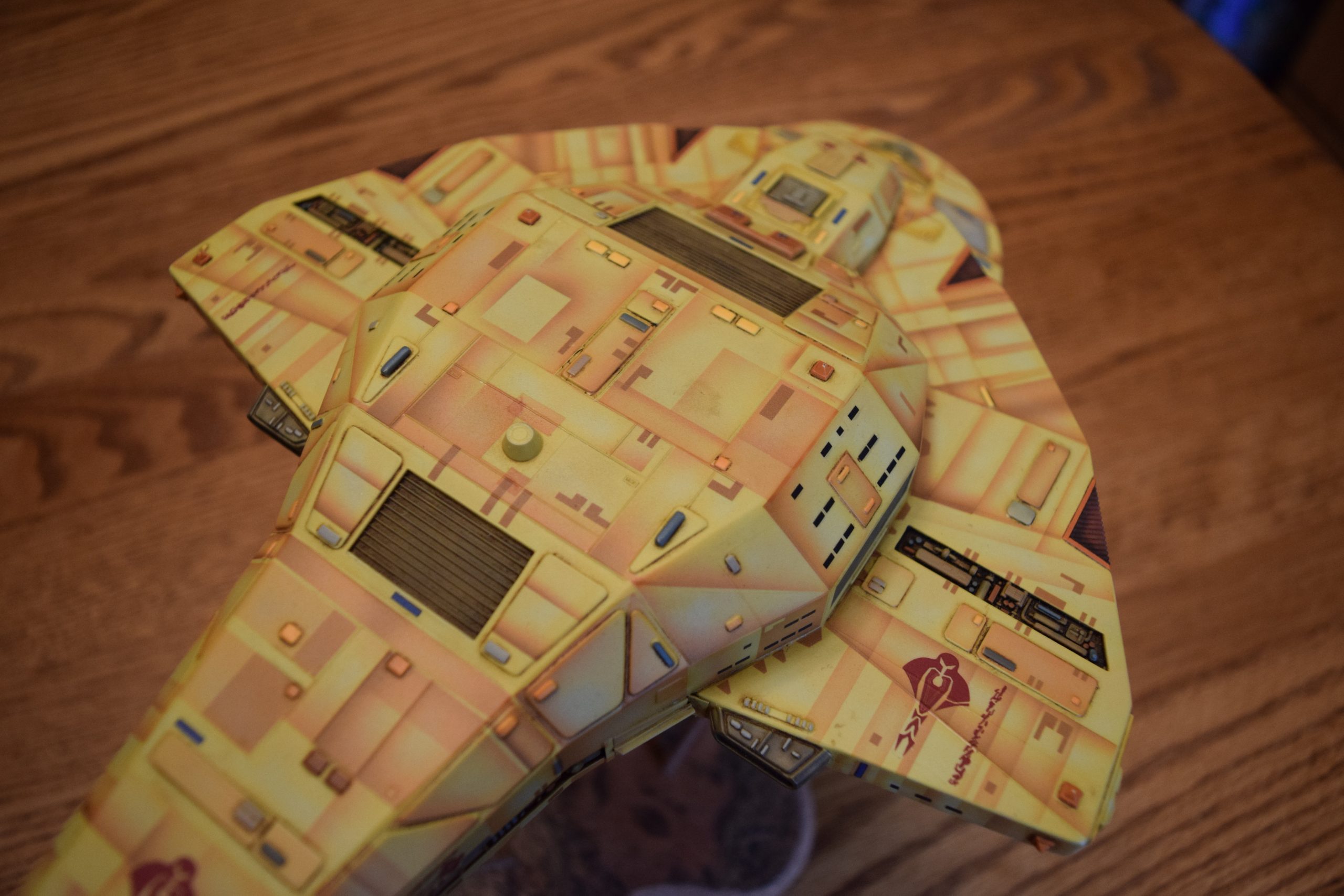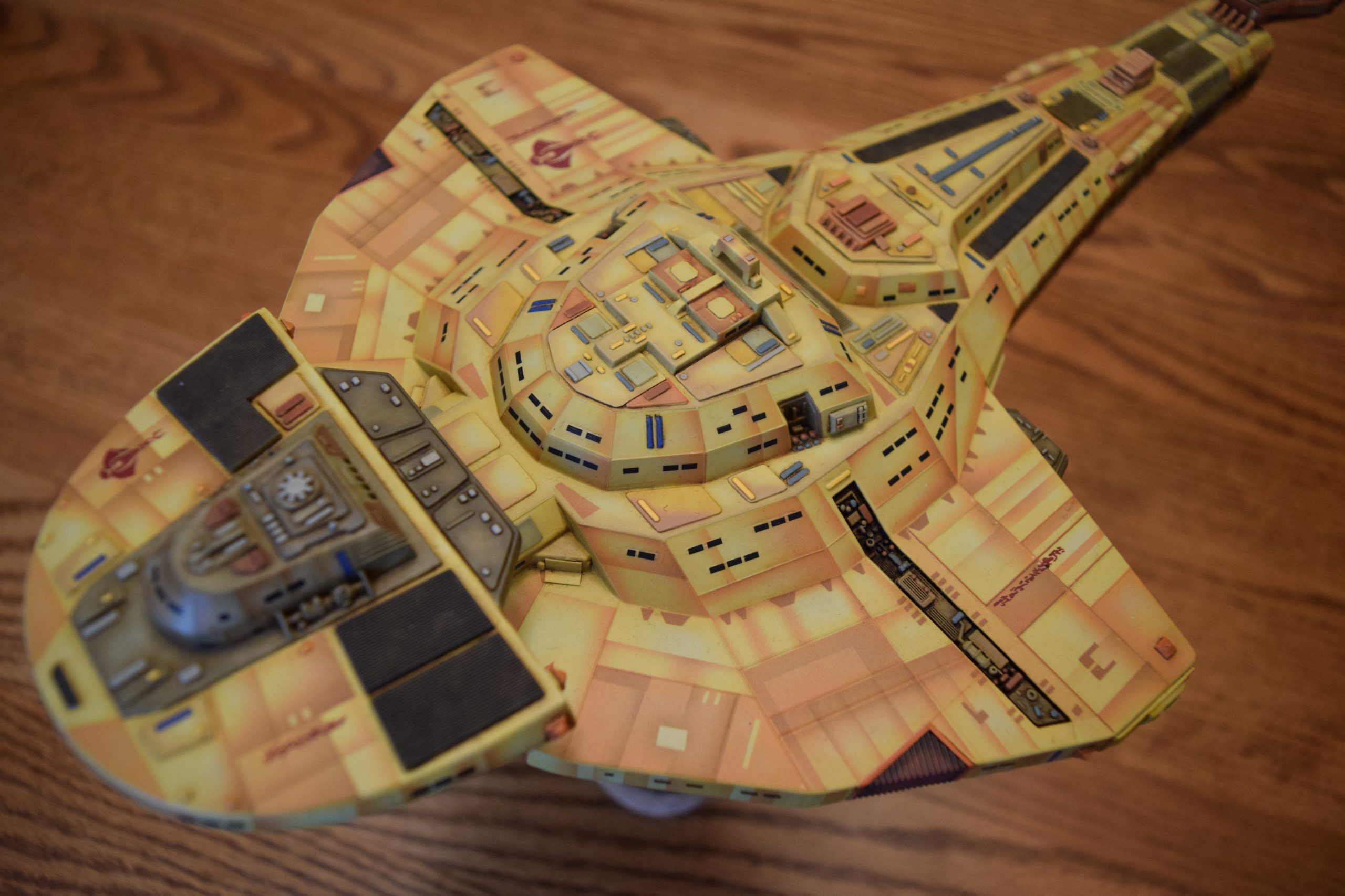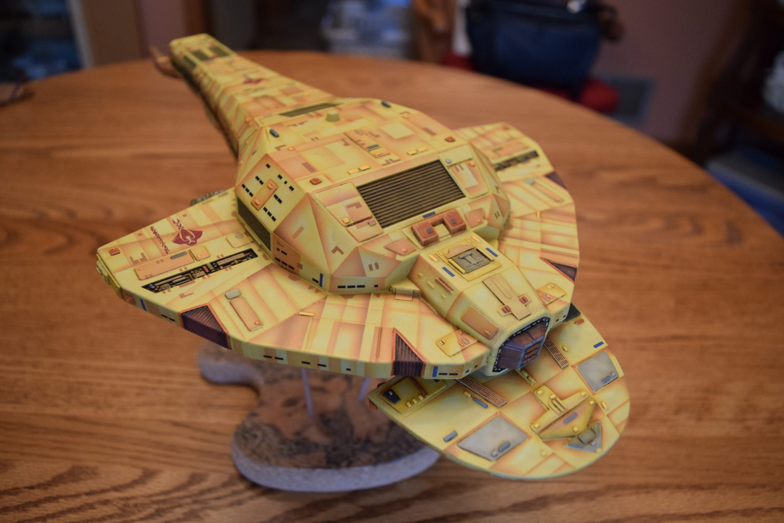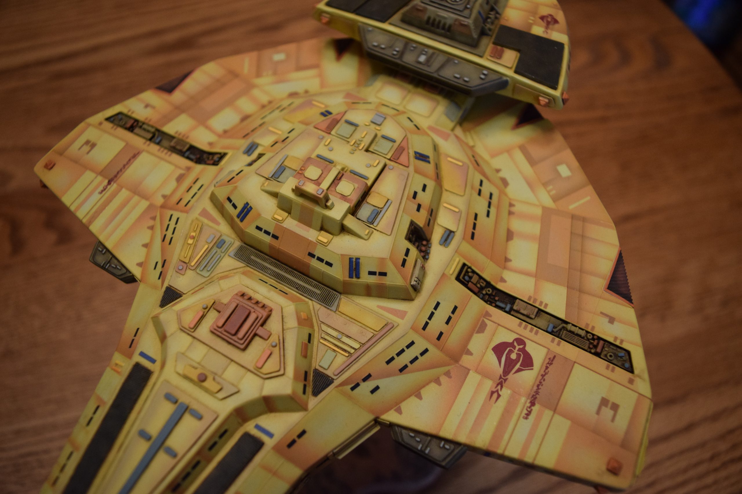 I would like to share pictures of my build-up of the AMT Galor Class Cardassian Cruiser from Round 2. I studied references of the studio model to match colors used for the main hull and details. For the base color, I two additional colors for primary shading, then, I used the hull plating decals from Round 2 (available separately for this subject) to provide the panel shading that is prominent on this subject. The Round 2 hull plating decals have a translucence to them that allowed the base color and primary shading to also show through. As the Round 2 hull plating decals cover most (but not all) of the areas of the ship, I shaded additional area that were not covered by the hull plating decals. A raw umber wash was used to emphasize and provide depth to details. Dry brushing with lightened base color was used to hi-light details as well.