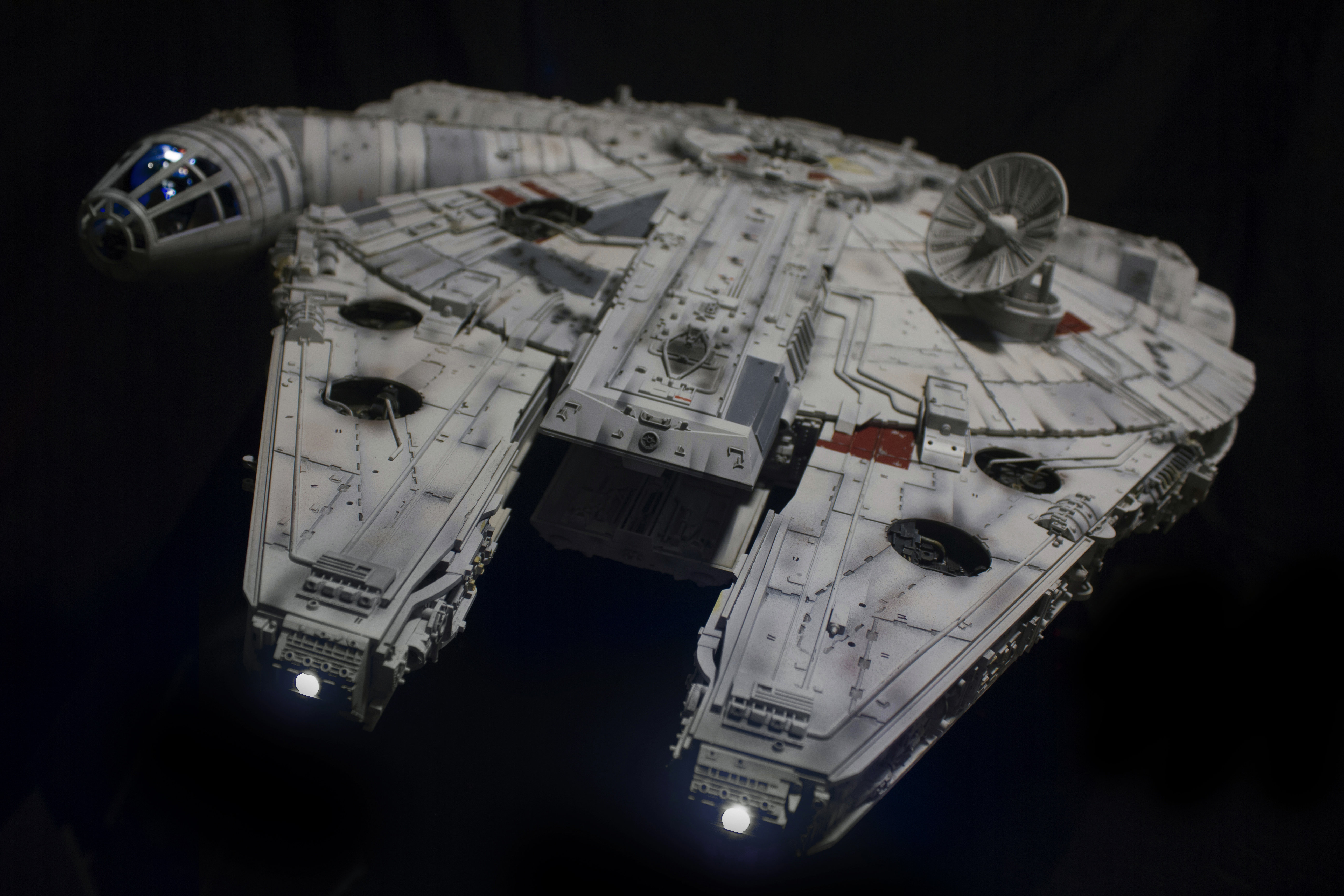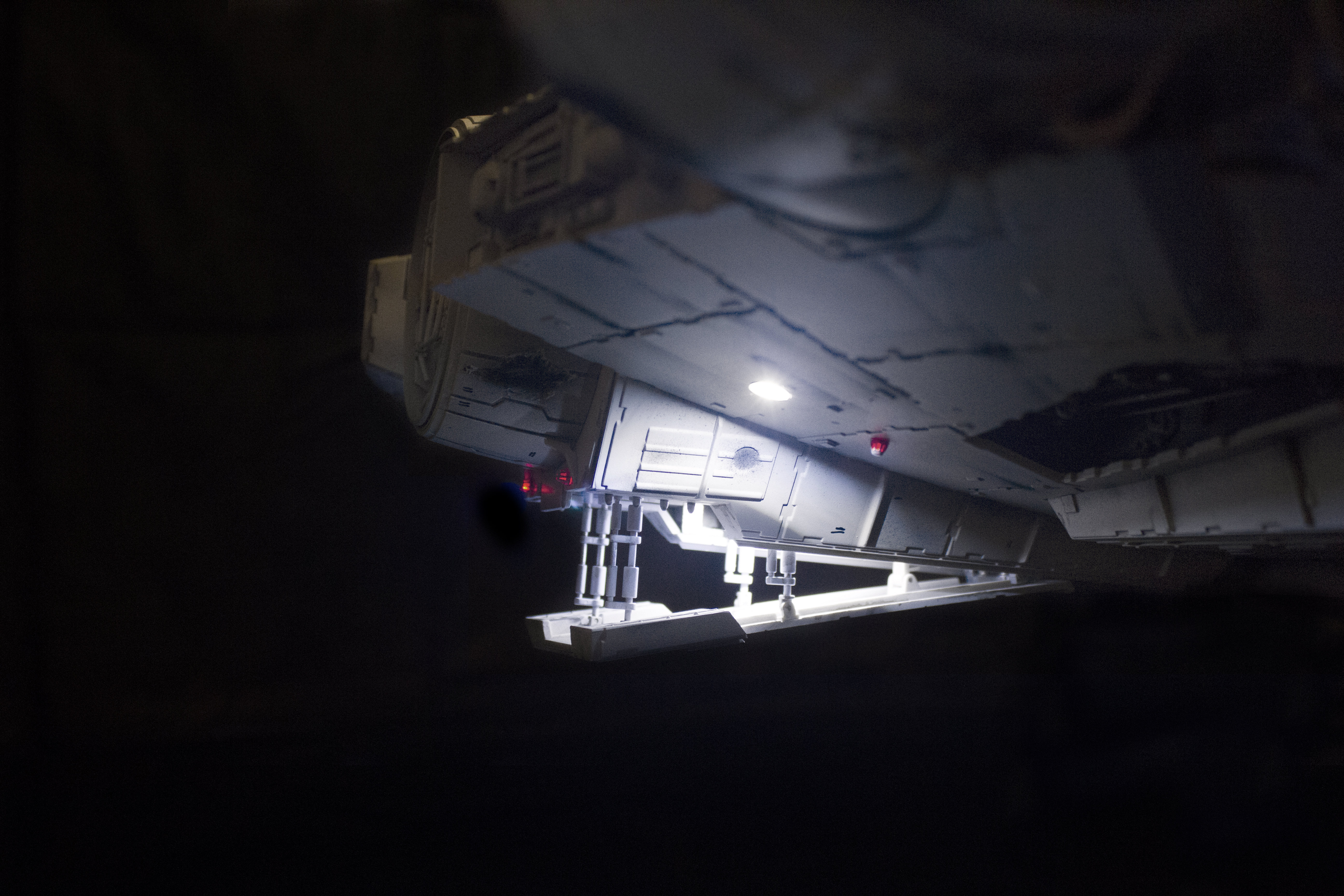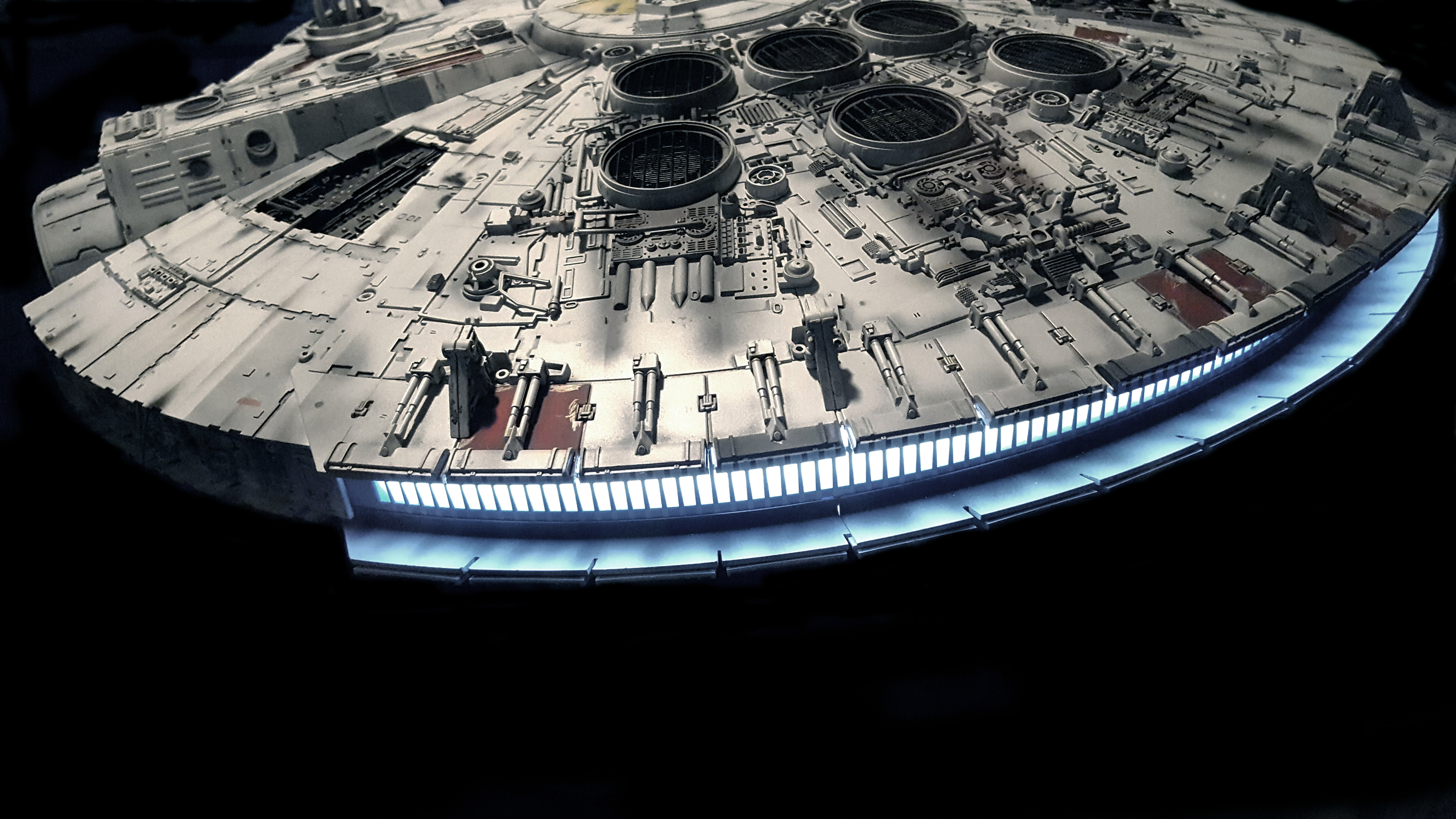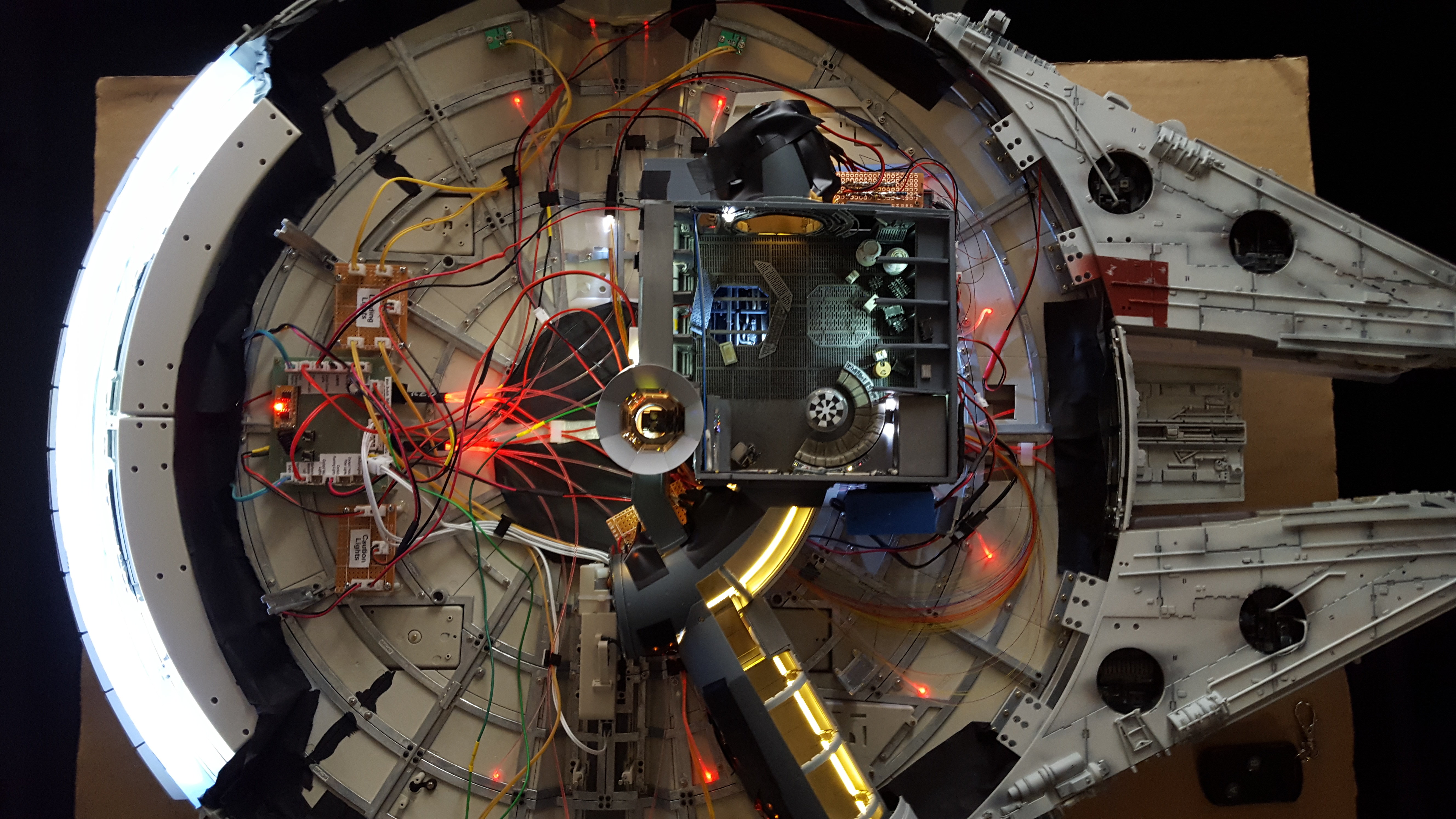 This is my pride and joy. The DeAgostini studio scale Millennium Falcon. Heavily modified by myself, not Han Solo. All lighting was done with LEDs, from 3mm to 0402 SMD LEDs, along with some fiber optics throughout. I had to make additional bread boards and wiring to connect it all to the main kit circuit board. The whole model running off of a 9v power supply.