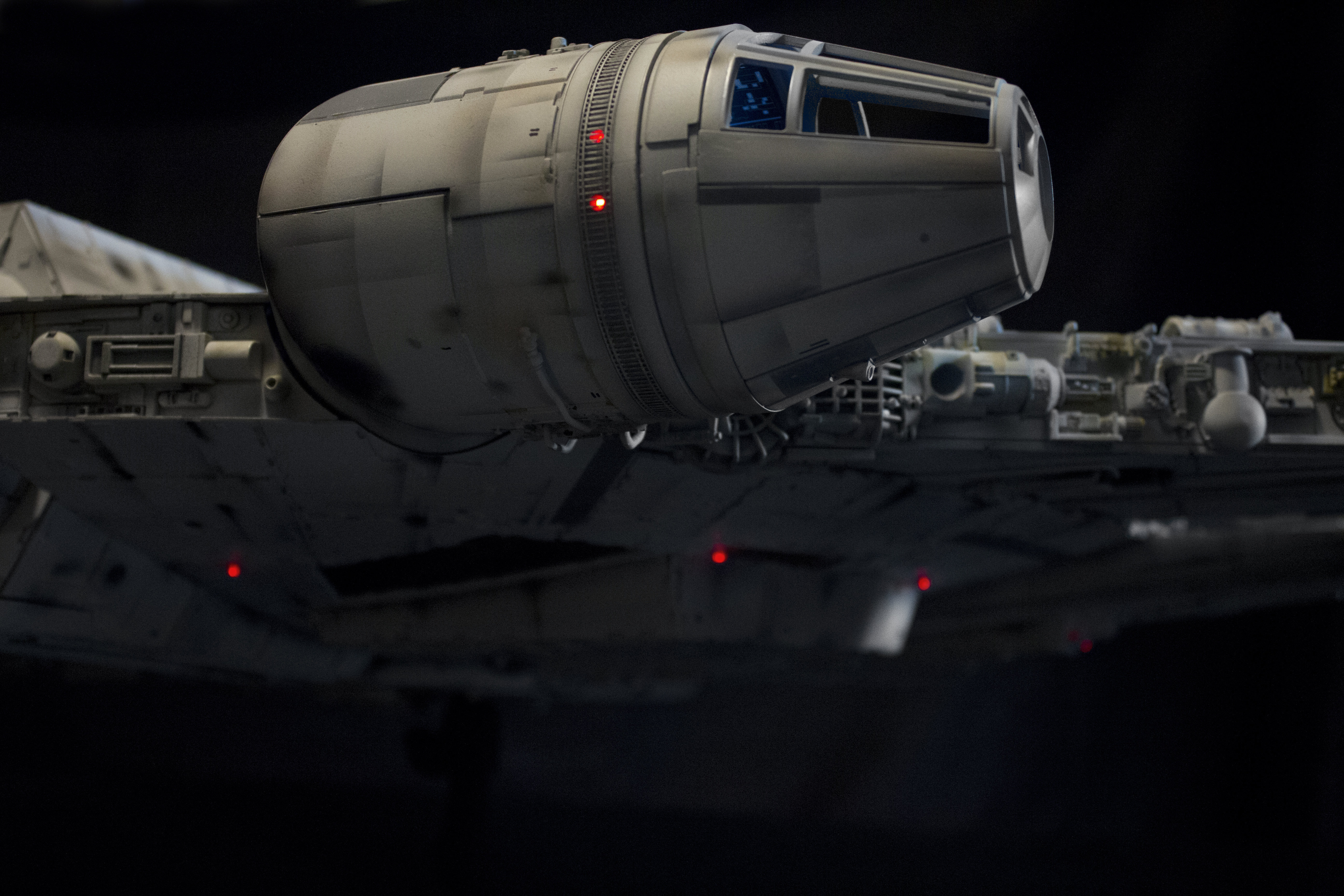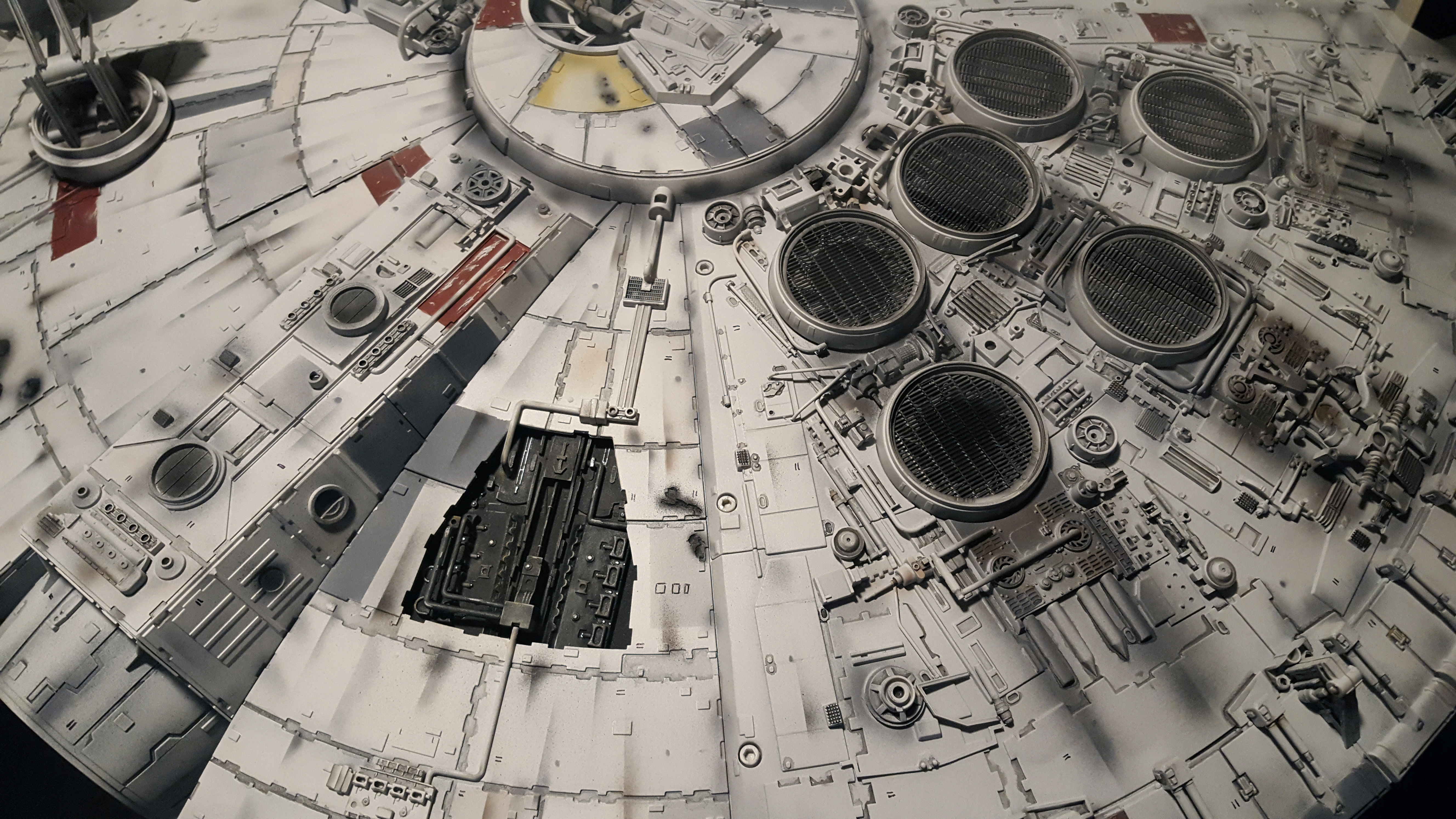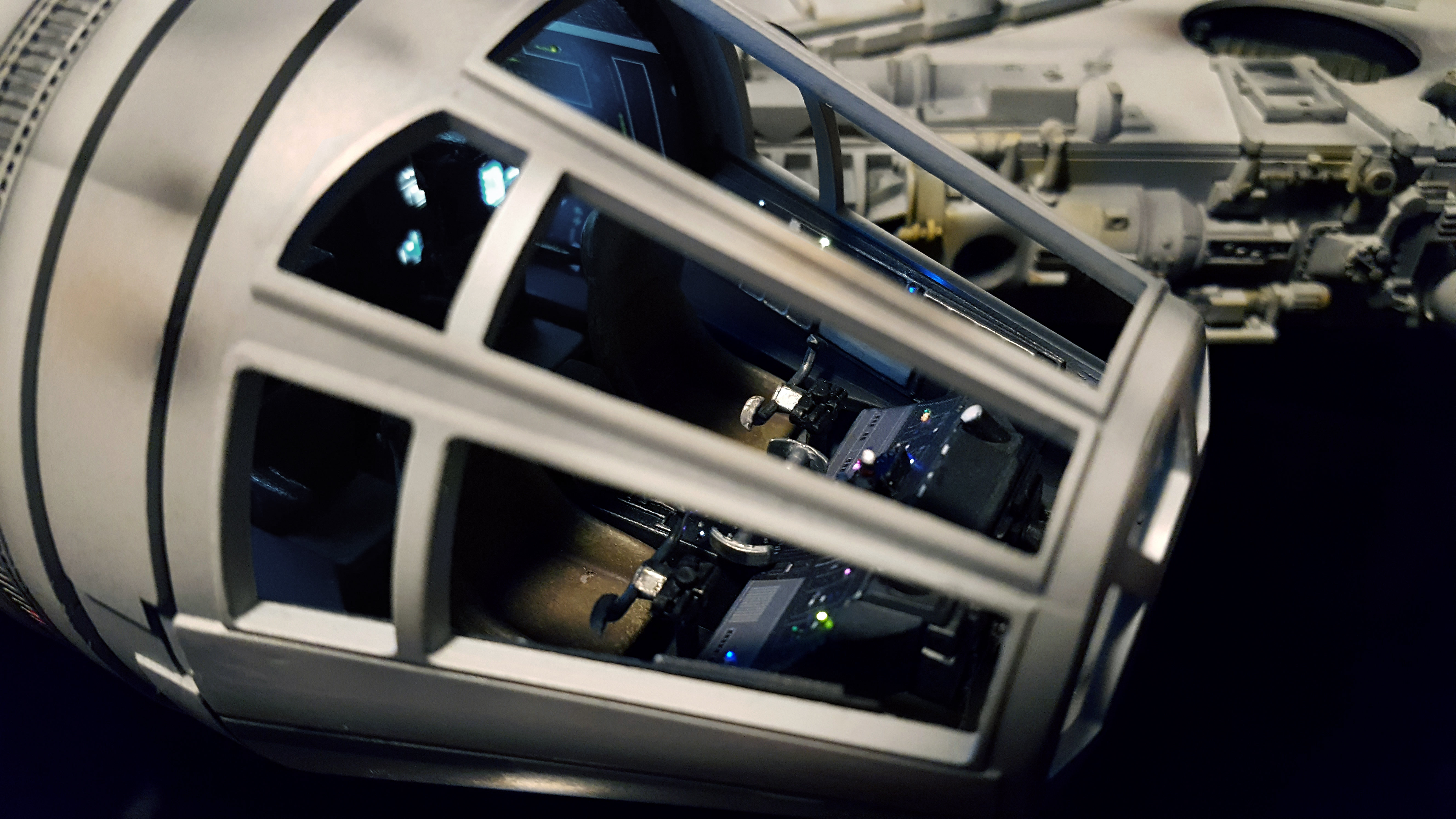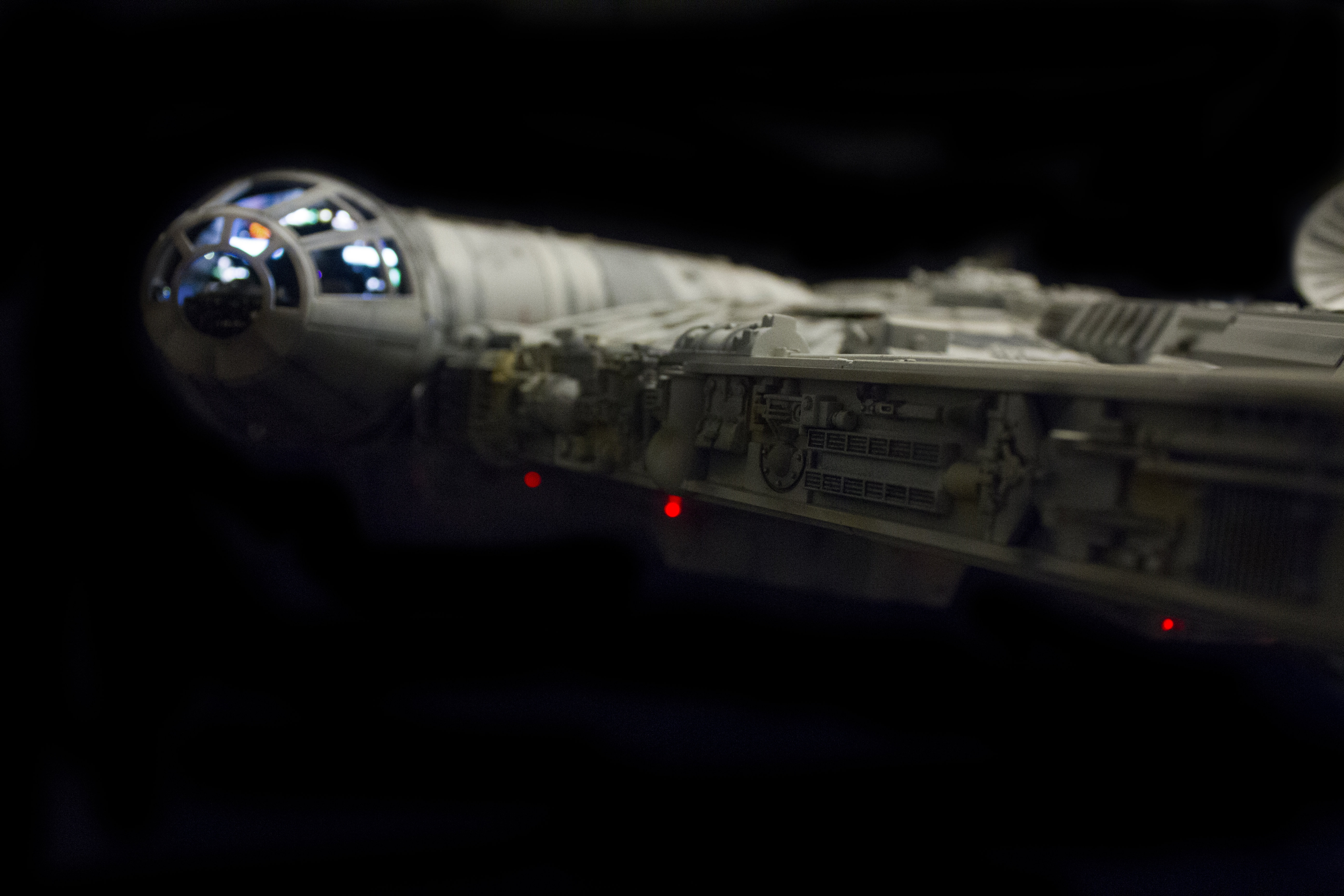 This is my pride and joy. The DeAgostini studio scale Millennium Falcon. Heavily modified by myself, not Han Solo. All lighting was done with LEDs, from 3mm to 0402 SMD LEDs, along with some fiber optics throughout. I had to make additional bread boards and wiring to connect it all to the main kit circuit board. The whole model running off of a 9v power supply.