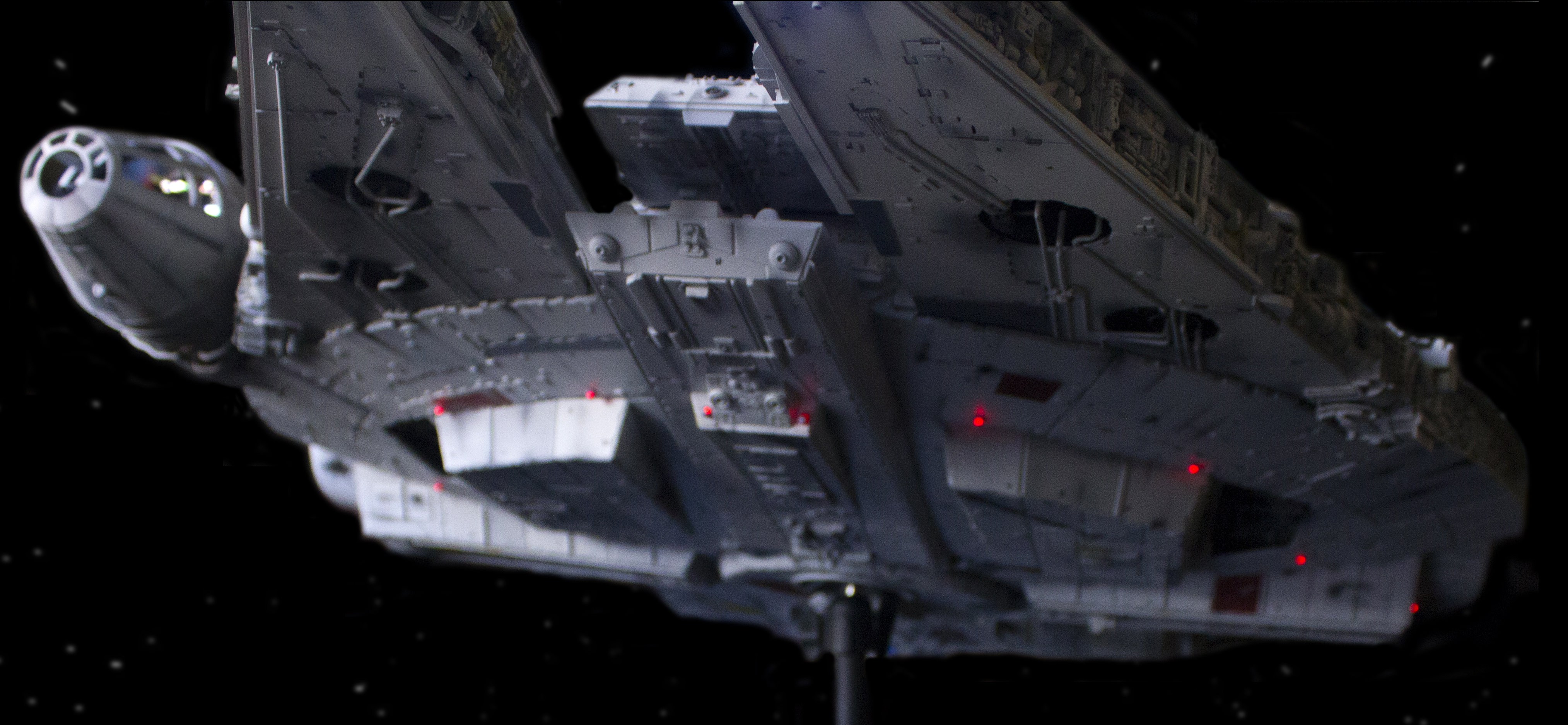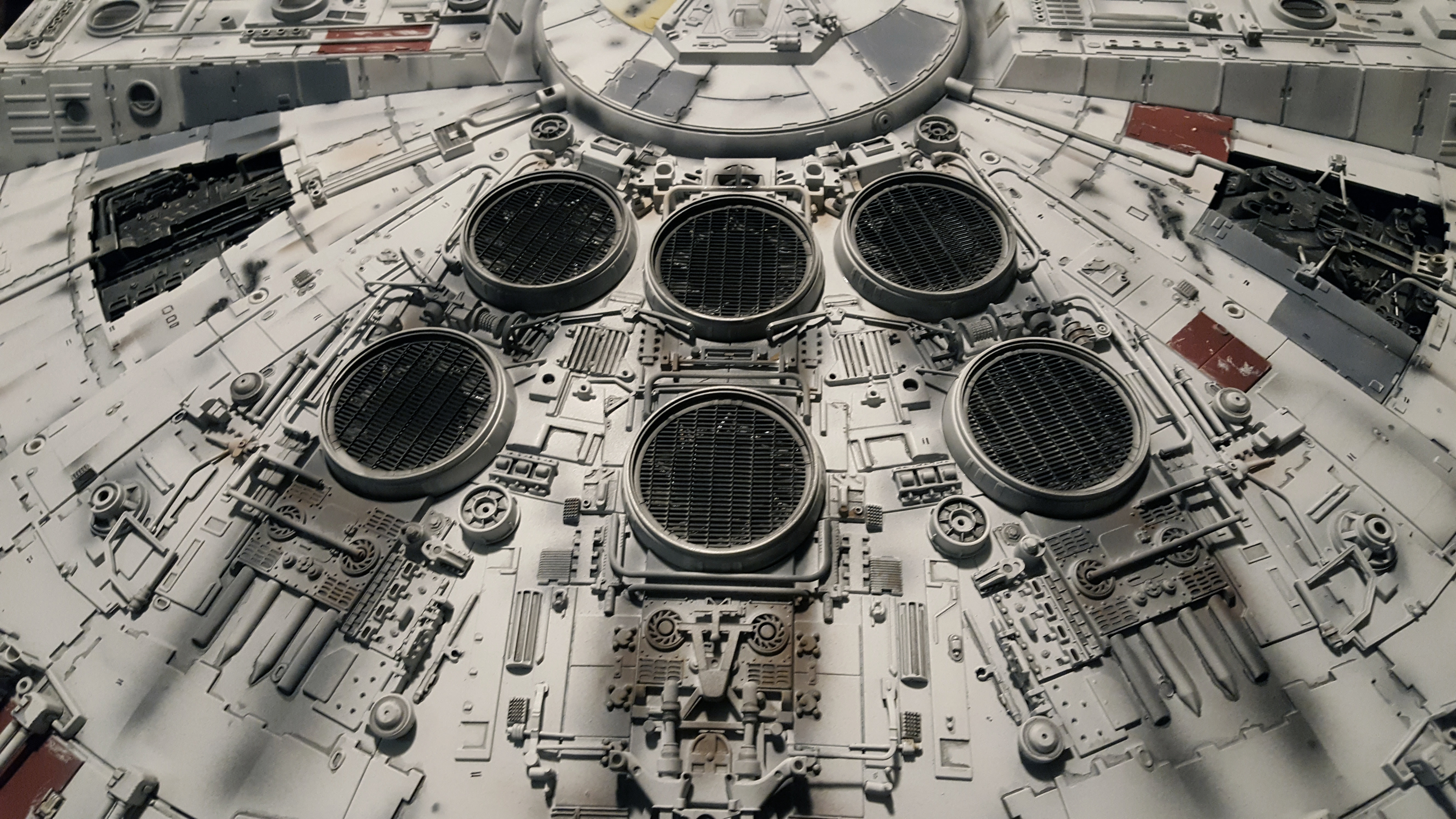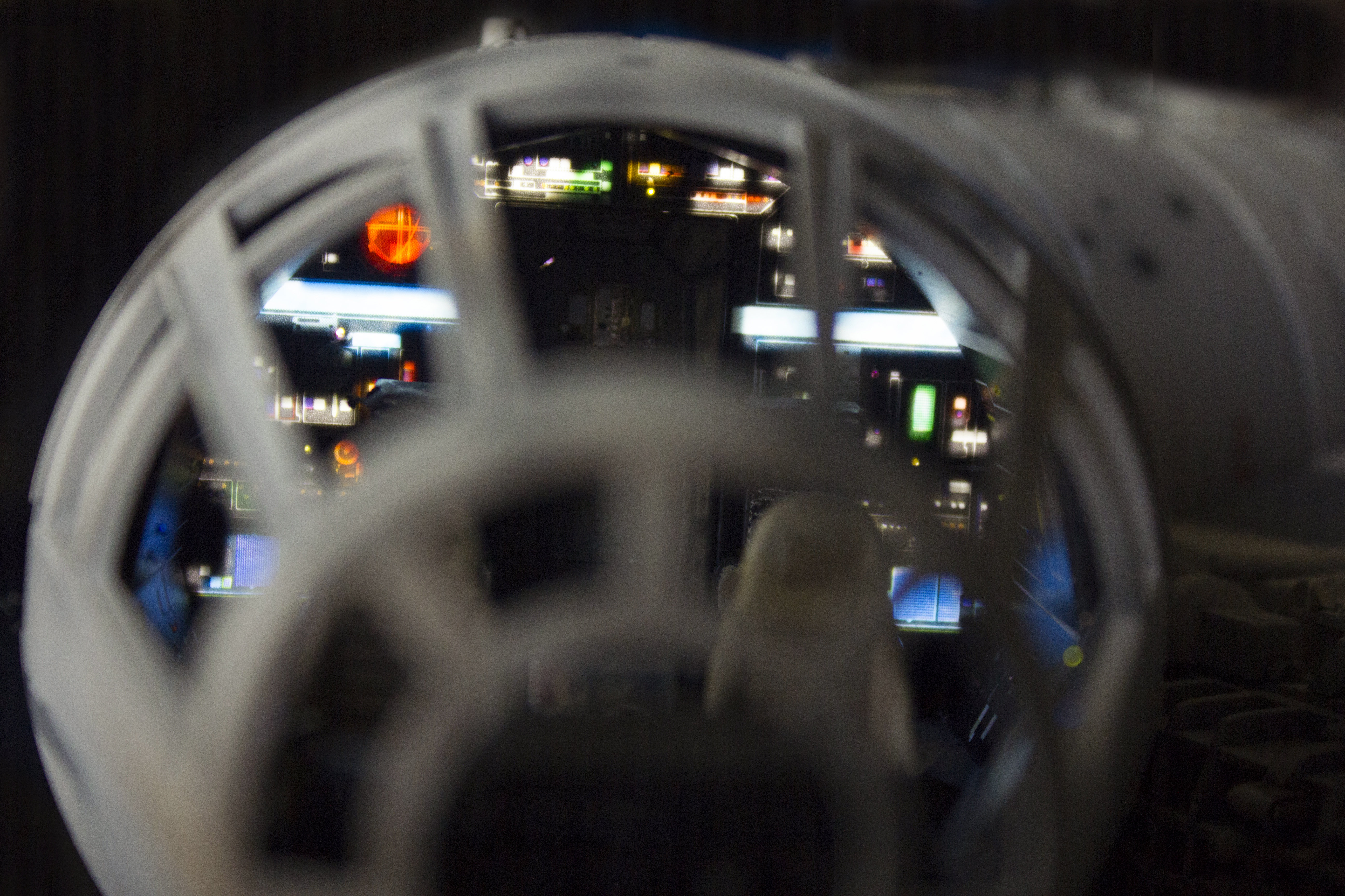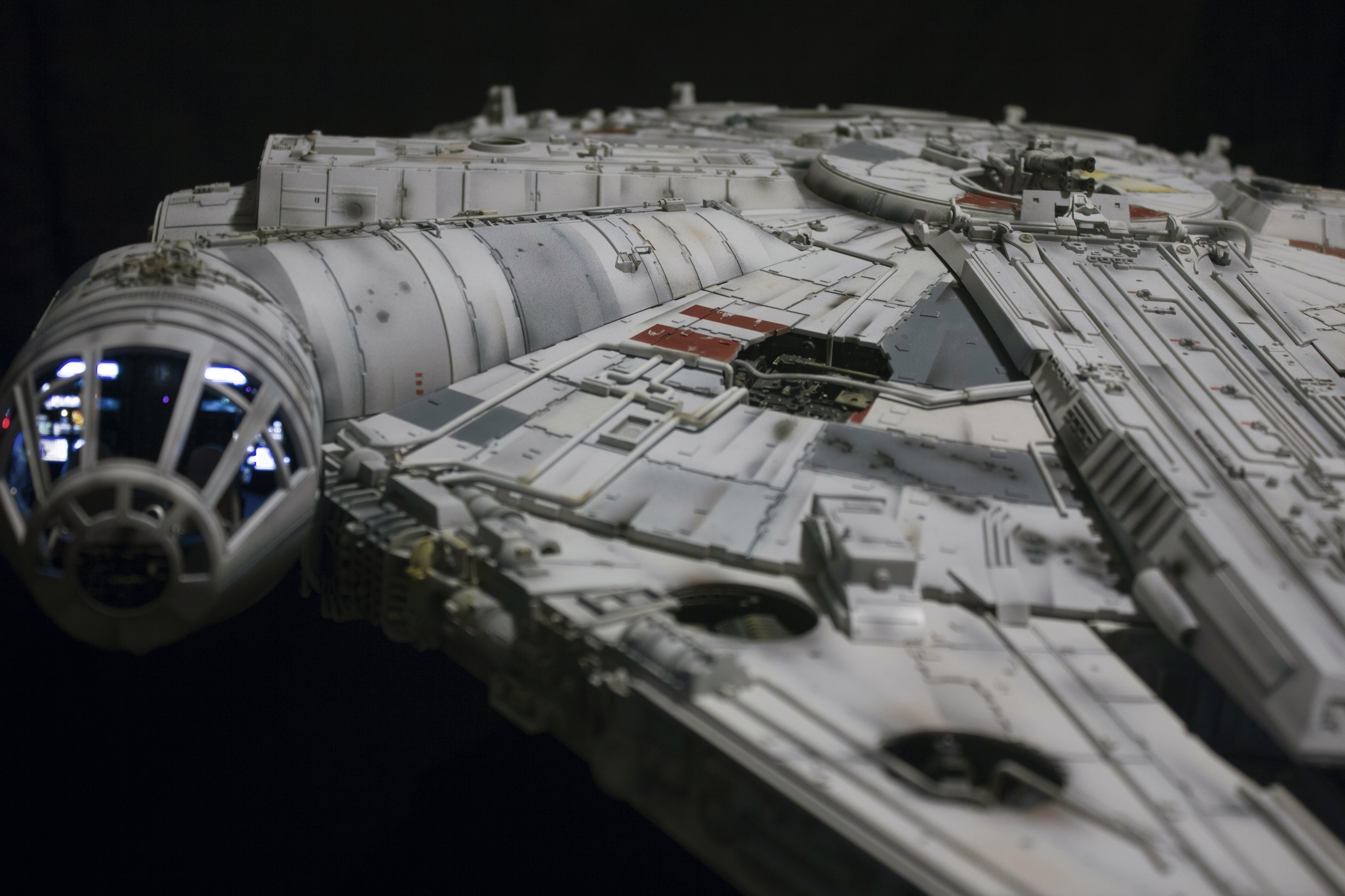 This is my pride and joy. The DeAgostini studio scale Millennium Falcon. Heavily modified by myself, not Han Solo. All lighting was done with LEDs, from 3mm to 0402 SMD LEDs, along with some fiber optics throughout. I had to make additional bread boards and wiring to connect it all to the main kit circuit board. The whole model running off of a 9v power supply.