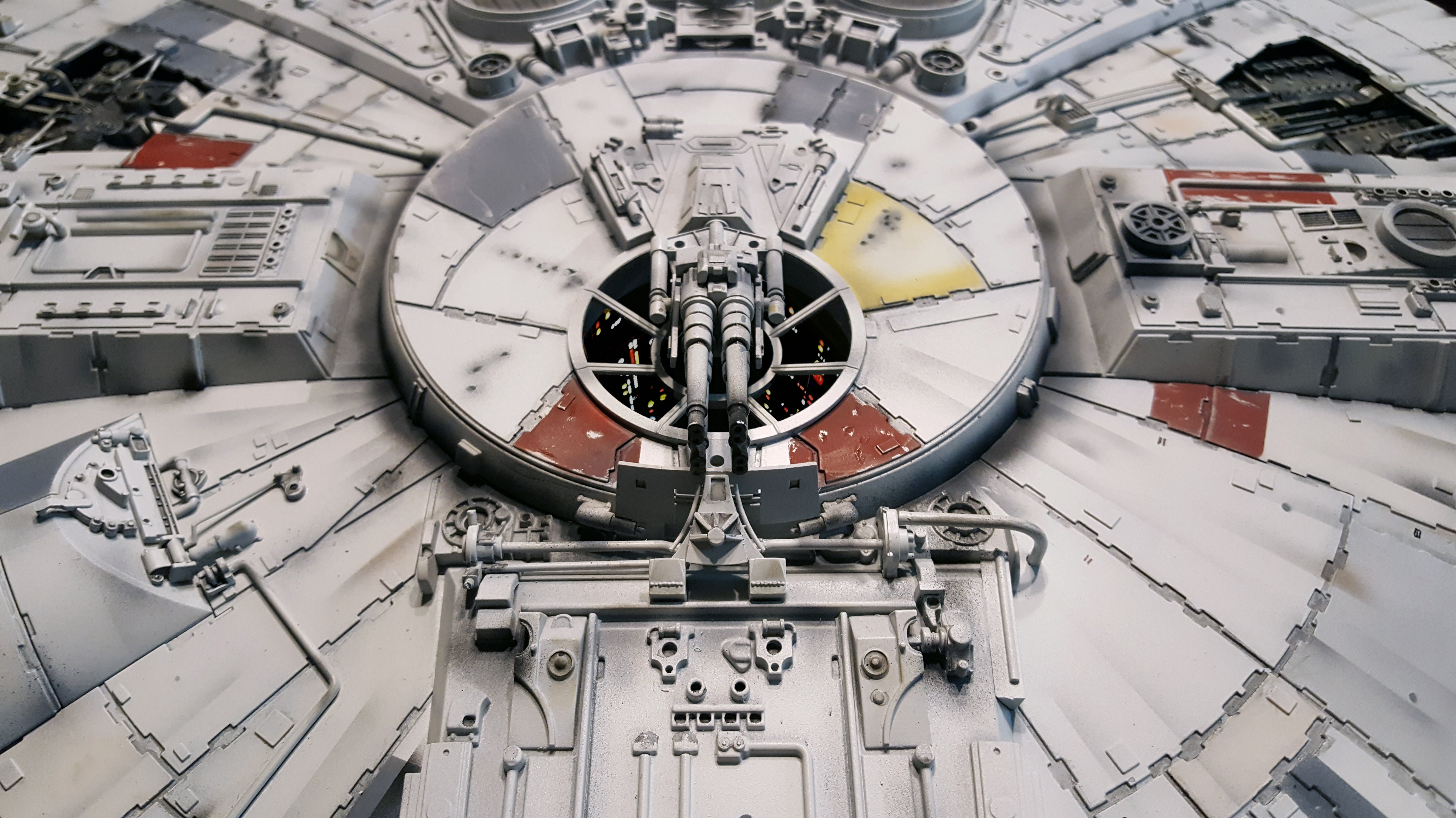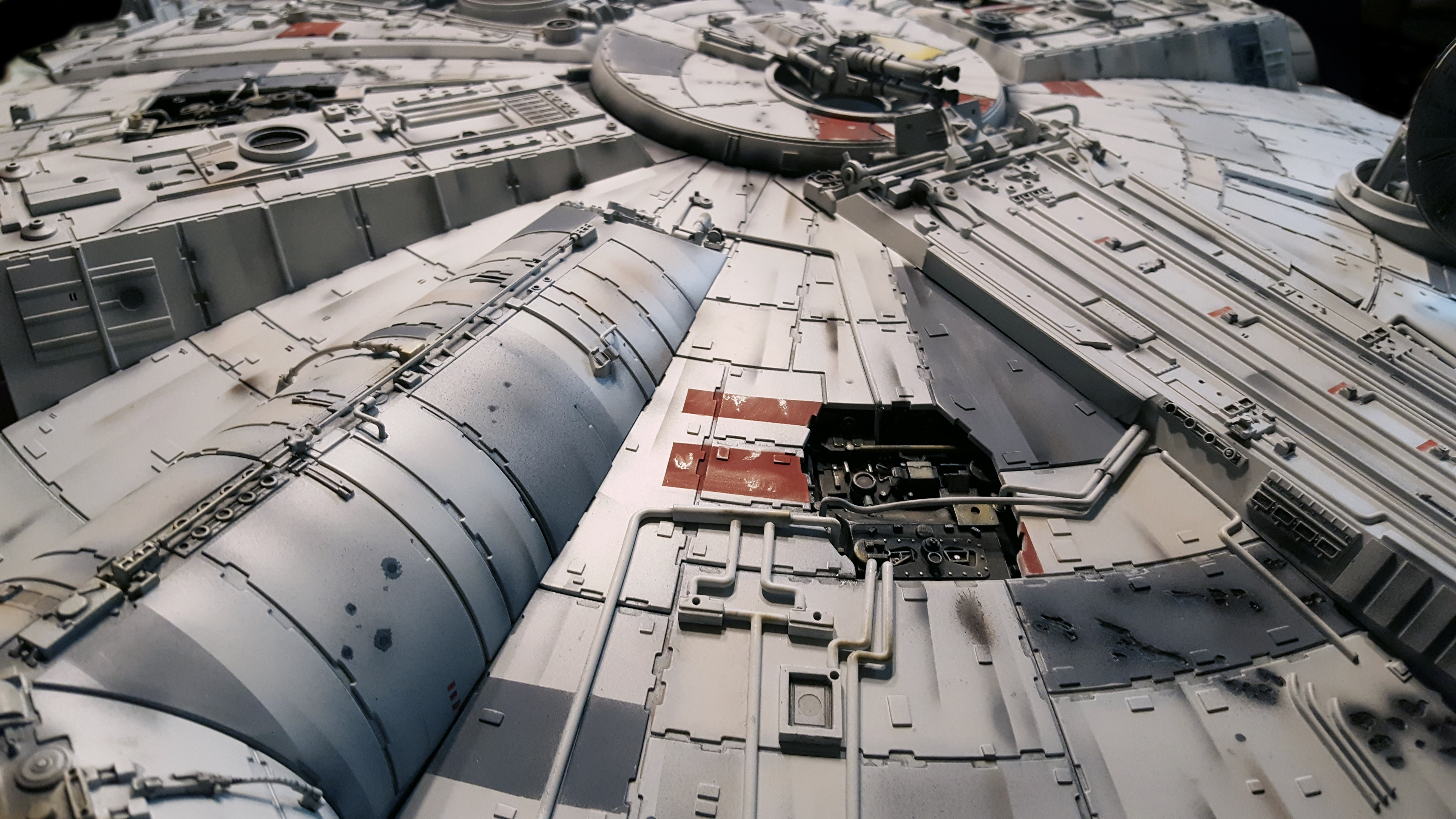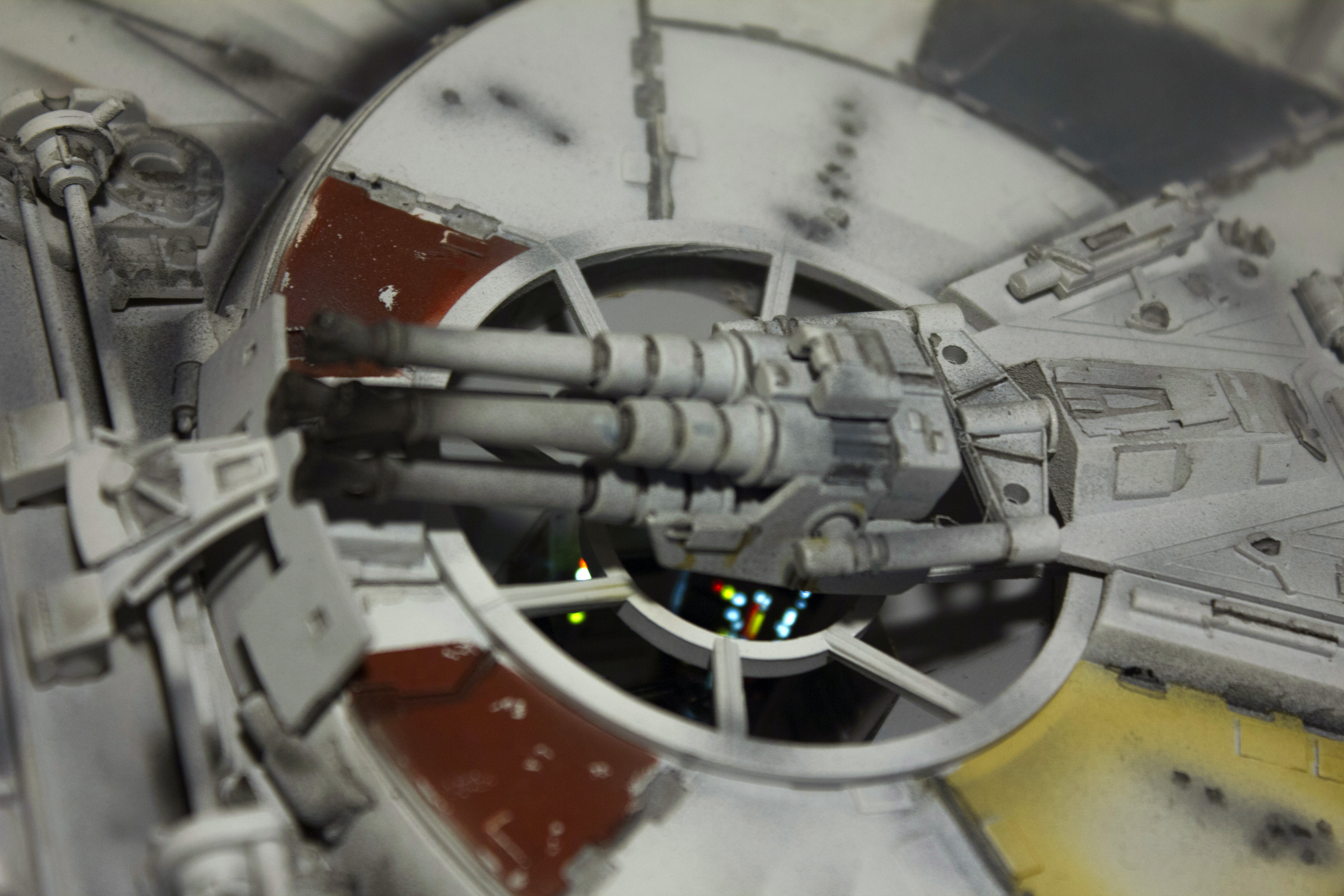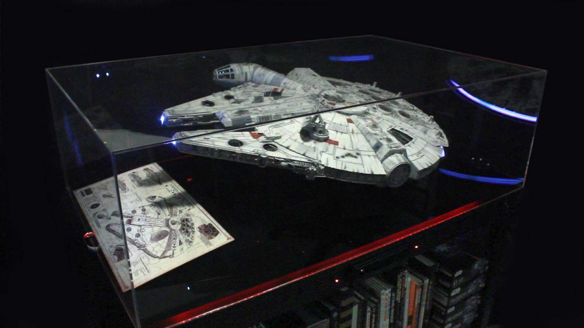 This is my pride and joy. The DeAgostini studio scale Millennium Falcon. Heavily modified by myself, not Han Solo. All lighting was done with LEDs, from 3mm to 0402 SMD LEDs, along with some fiber optics throughout. I had to make additional bread boards and wiring to connect it all to the main kit circuit board. The whole model running off of a 9v power supply.