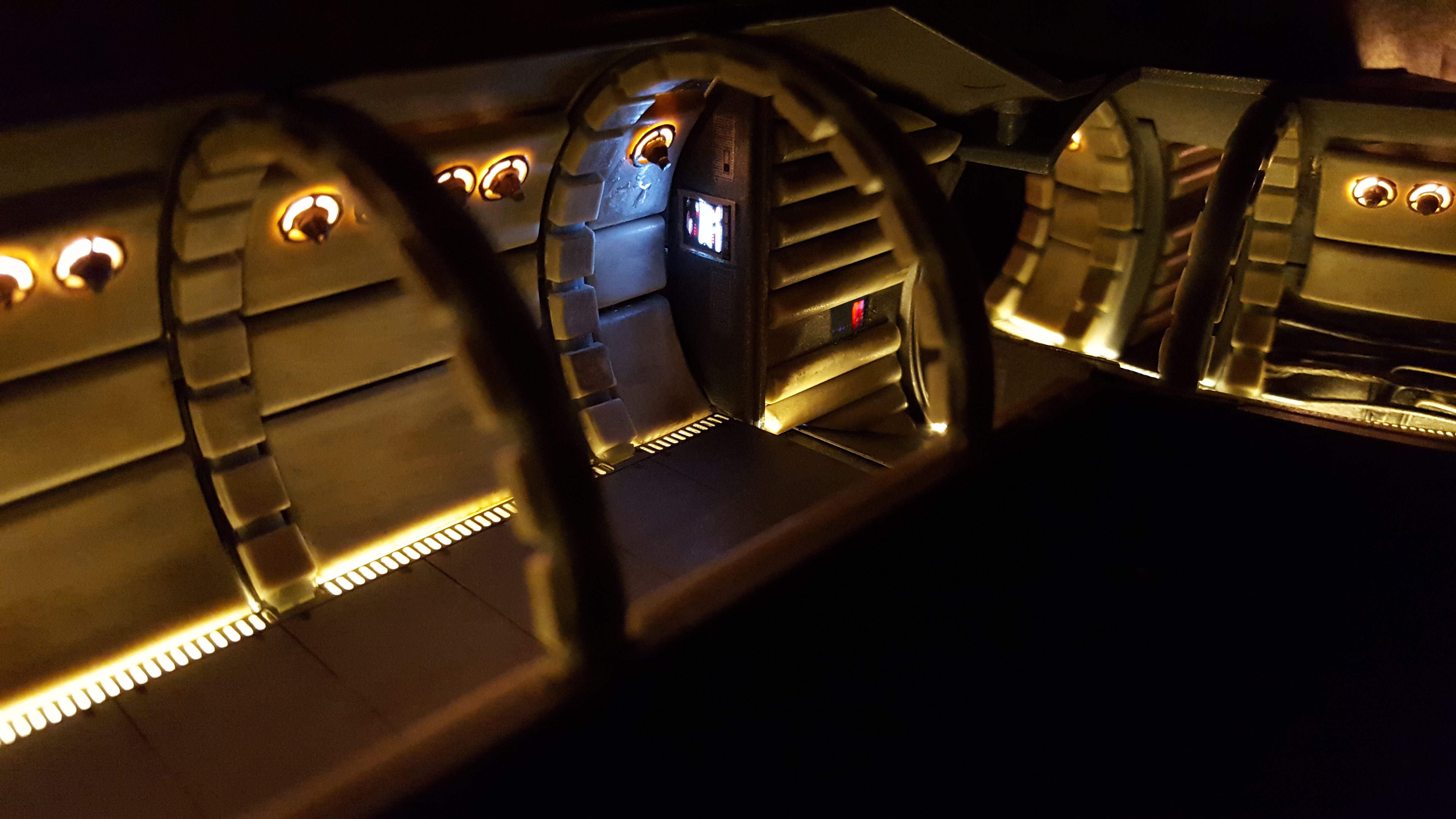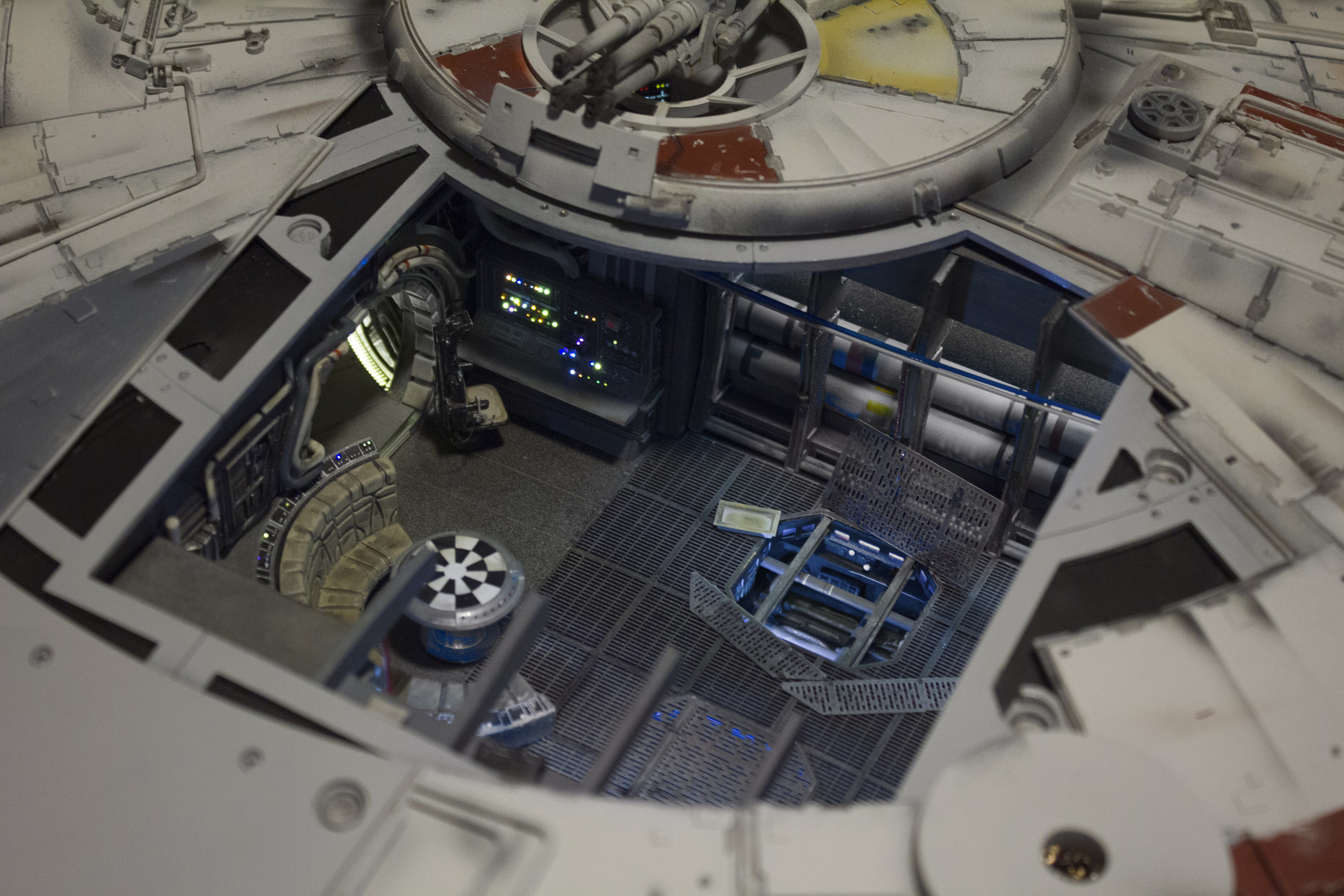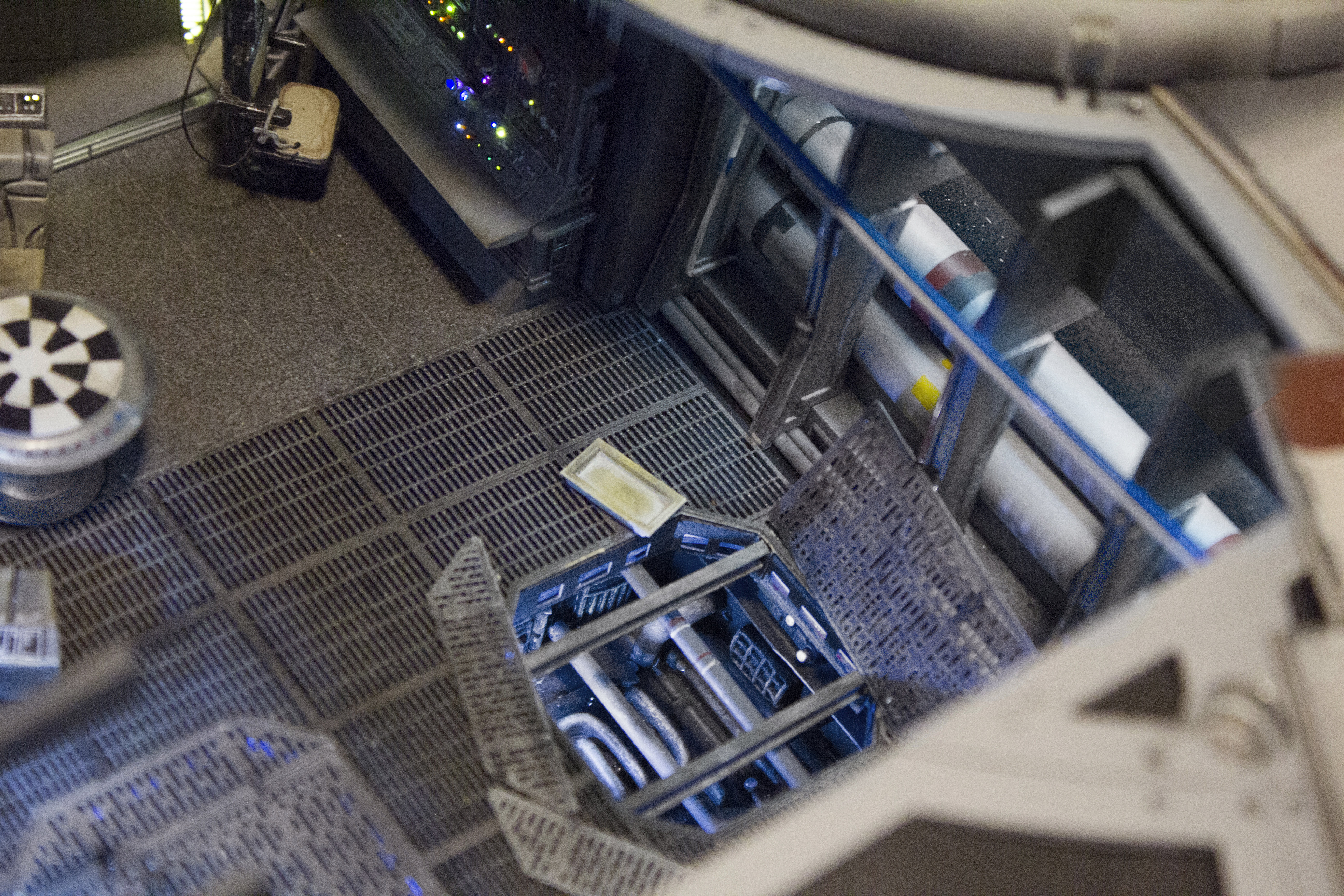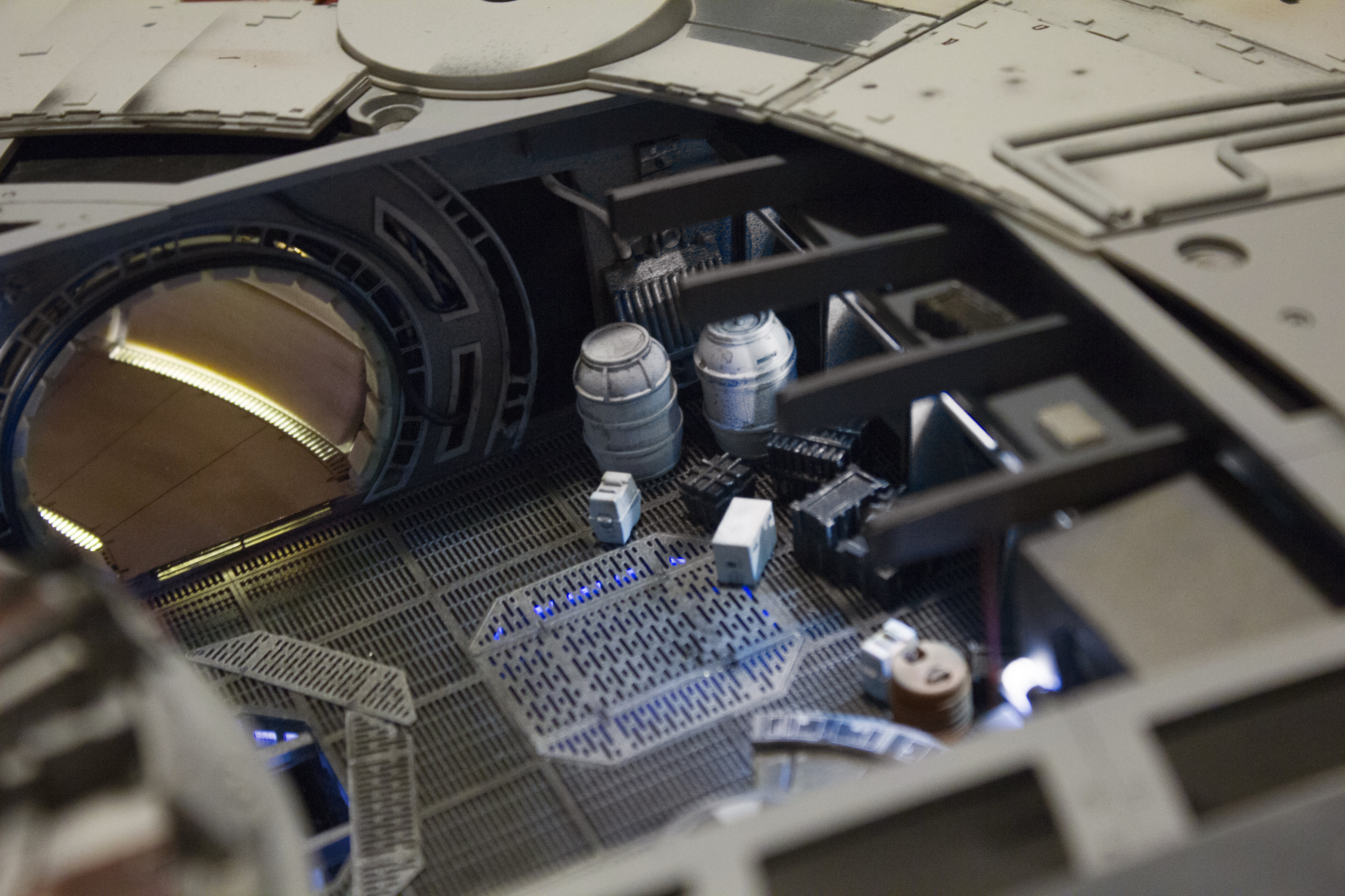 The cockpit monitor was scratch built from styrene. Cockpit lighting was done with .25mm fiber optic. The rear cockpit wall was one of the only kit lighting parts kept. In the hold, most of the additions were scratch built out of styrene. There are some greeblies which I added from pieces of an old MPC Falcon kit. The corridor floors are photo etch with lighting underneath. The corridor scones were scratch built with styrene tubing and lit with 0402 SMD LEDs. The crates, barrels and navigation chair were 3D printed from Shapeways. The Nav computer was lit using .25mm fiber optic. The maintenance pit was scratch built with styene sheets and tubing, with a few greeblies from the MPC Falcon. The circuitry bay was scratch built with styrene and greeblies from the MPC Falcon. All of the wall additions were done with styrene and some greeblies here and there.