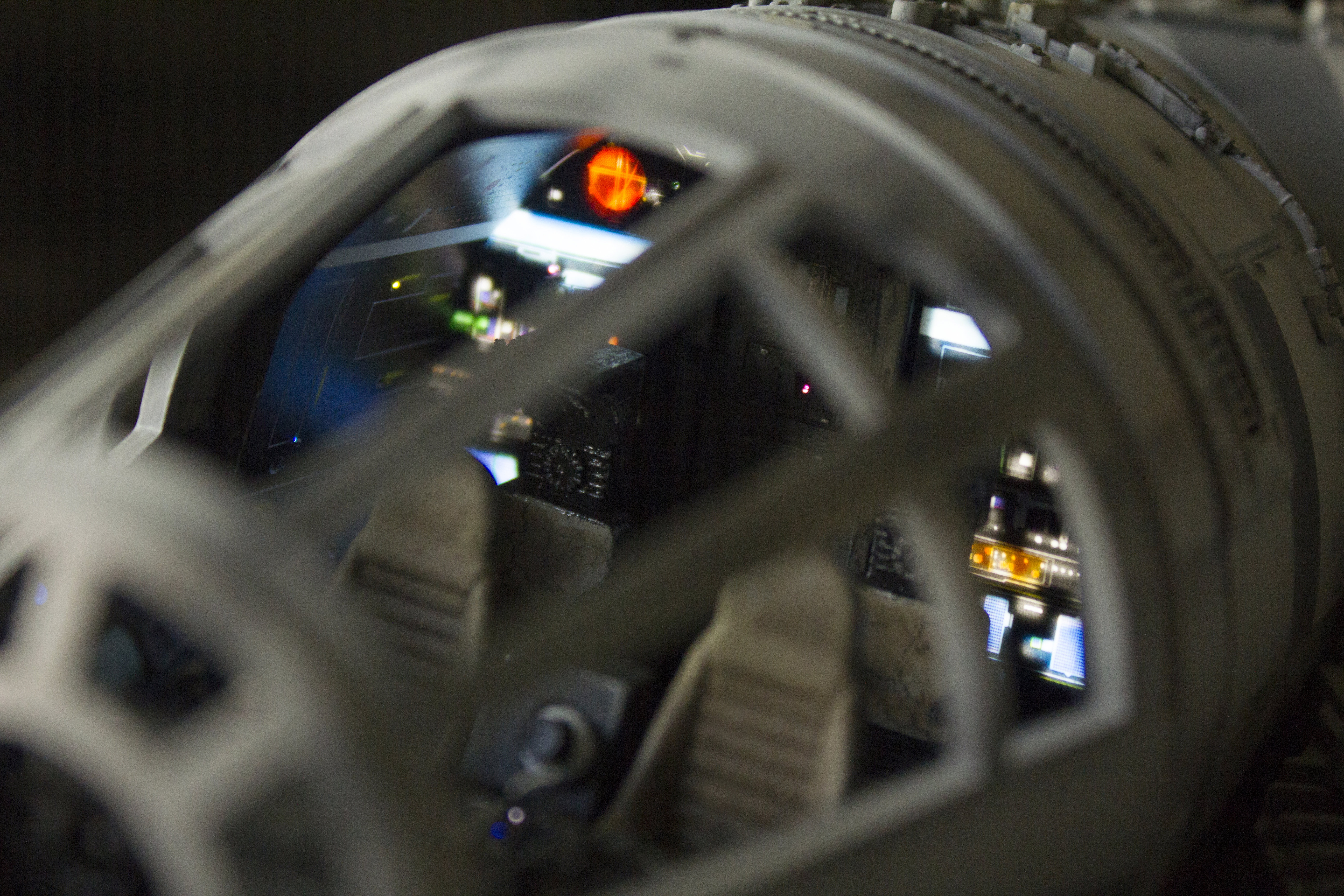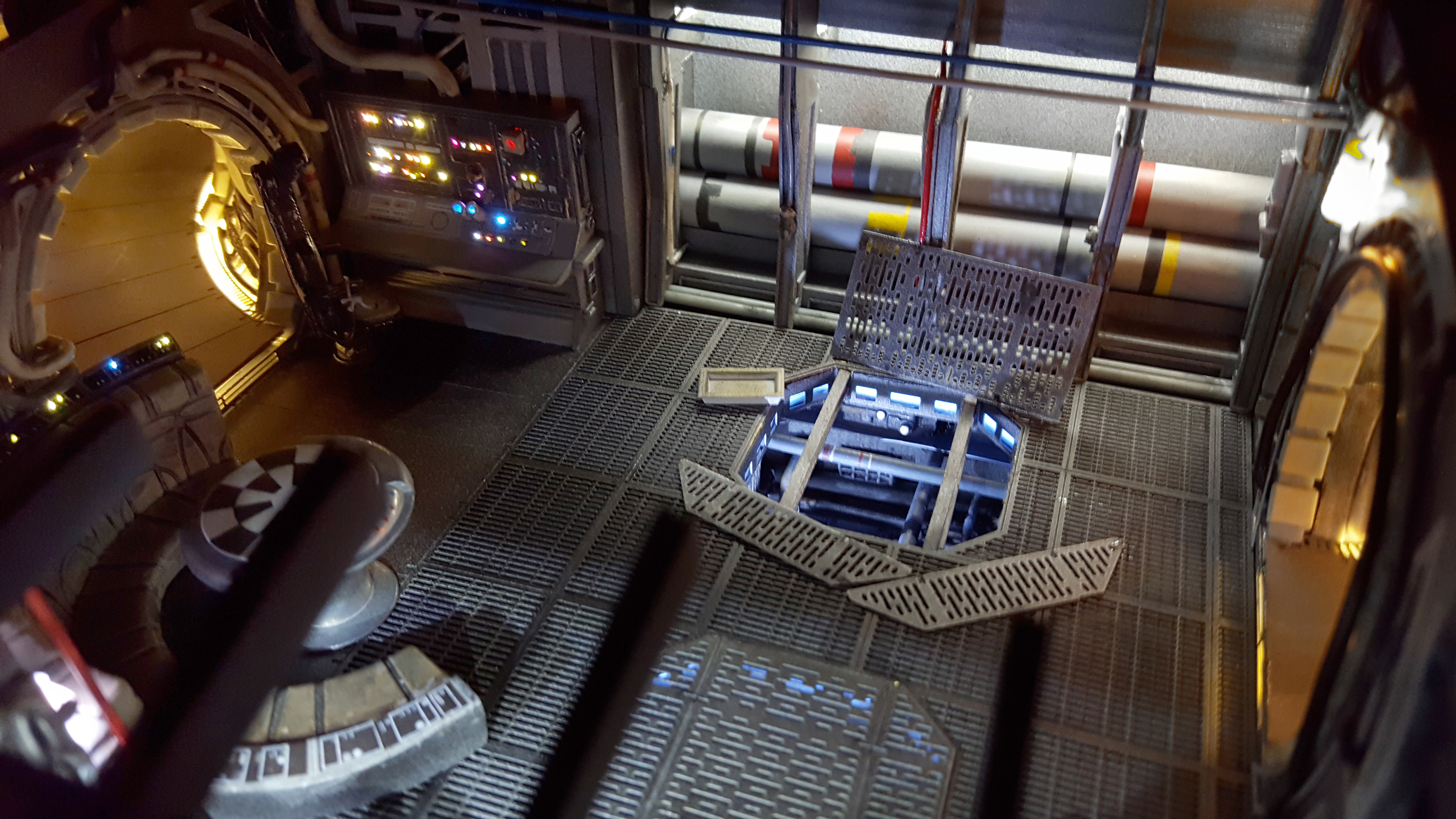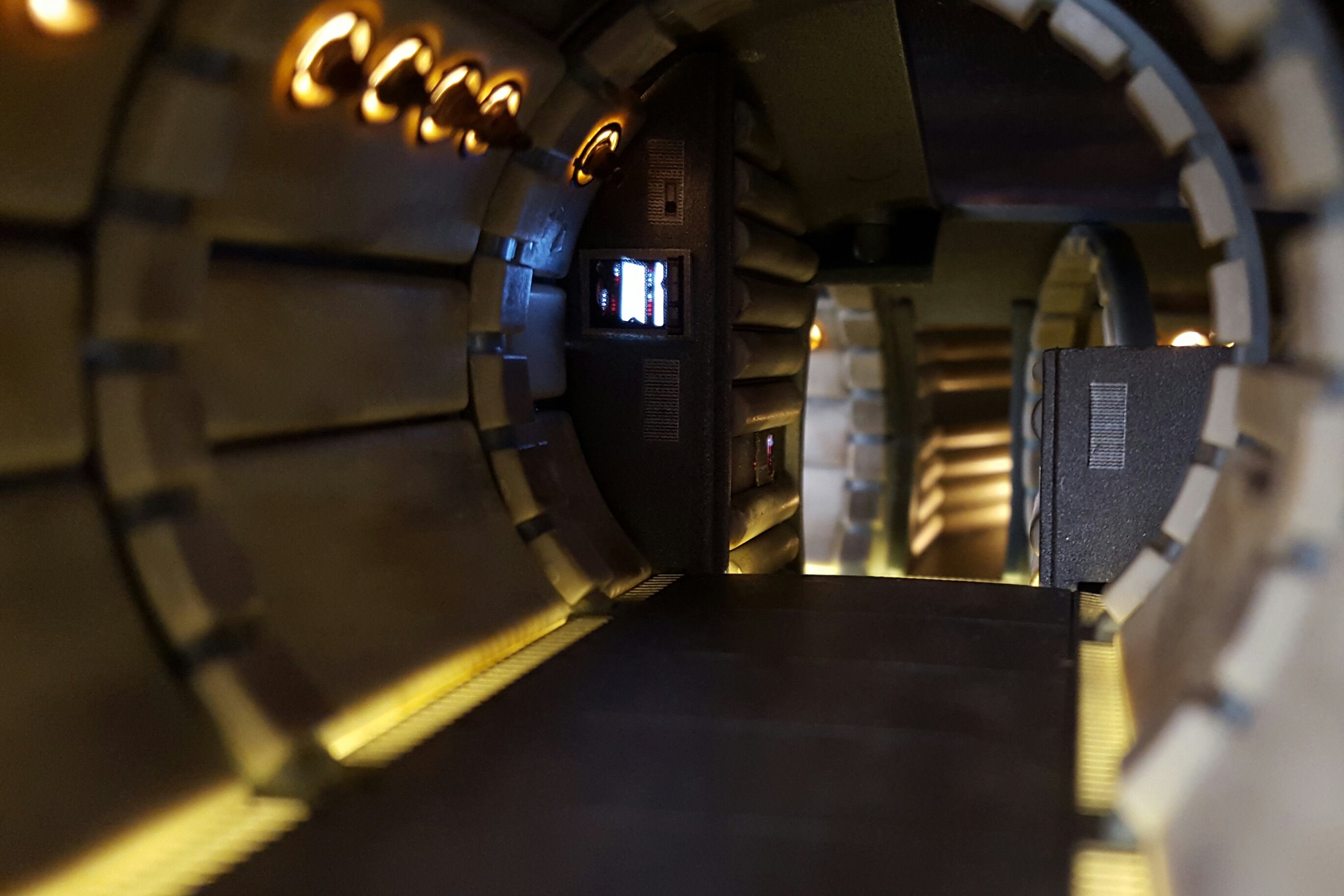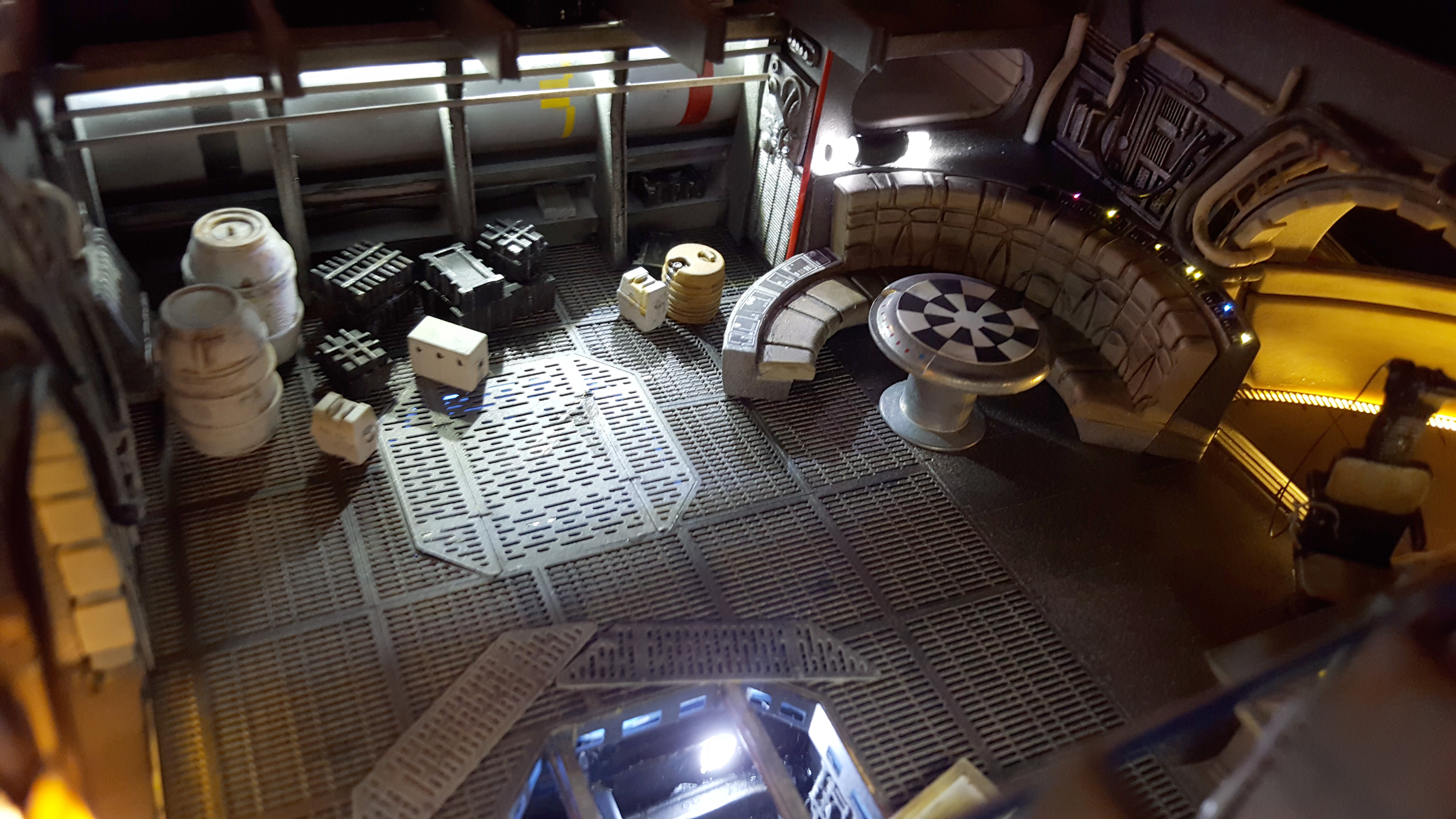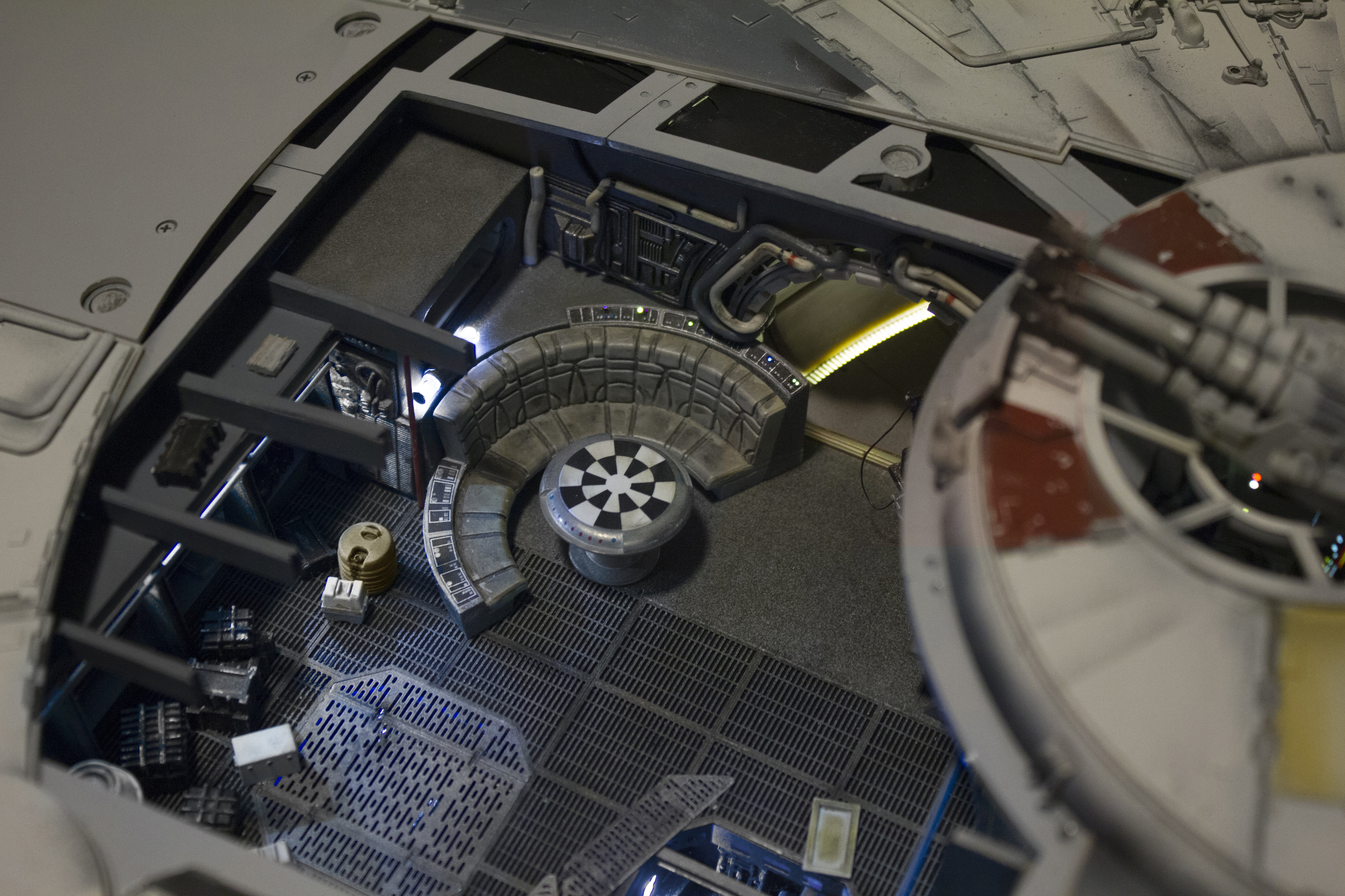 The cockpit monitor was scratch built from styrene. Cockpit lighting was done with .25mm fiber optic. The rear cockpit wall was one of the only kit lighting parts kept. In the hold, most of the additions were scratch built out of styrene. There are some greeblies which I added from pieces of an old MPC Falcon kit. The corridor floors are photo etch with lighting underneath. The corridor scones were scratch built with styrene tubing and lit with 0402 SMD LEDs. The crates, barrels and navigation chair were 3D printed from Shapeways. The Nav computer was lit using .25mm fiber optic. The maintenance pit was scratch built with styene sheets and tubing, with a few greeblies from the MPC Falcon. The circuitry bay was scratch built with styrene and greeblies from the MPC Falcon. All of the wall additions were done with styrene and some greeblies here and there.