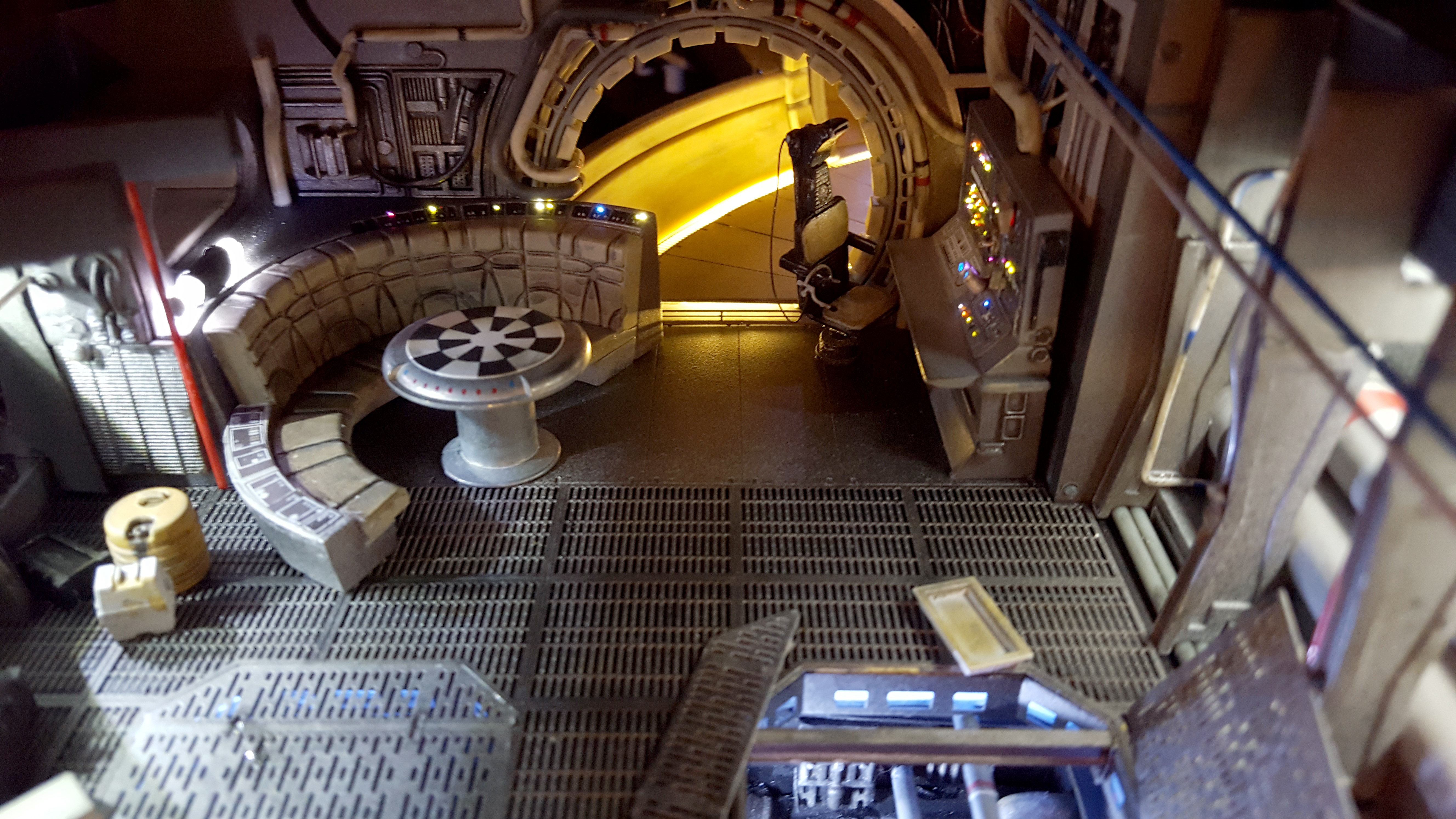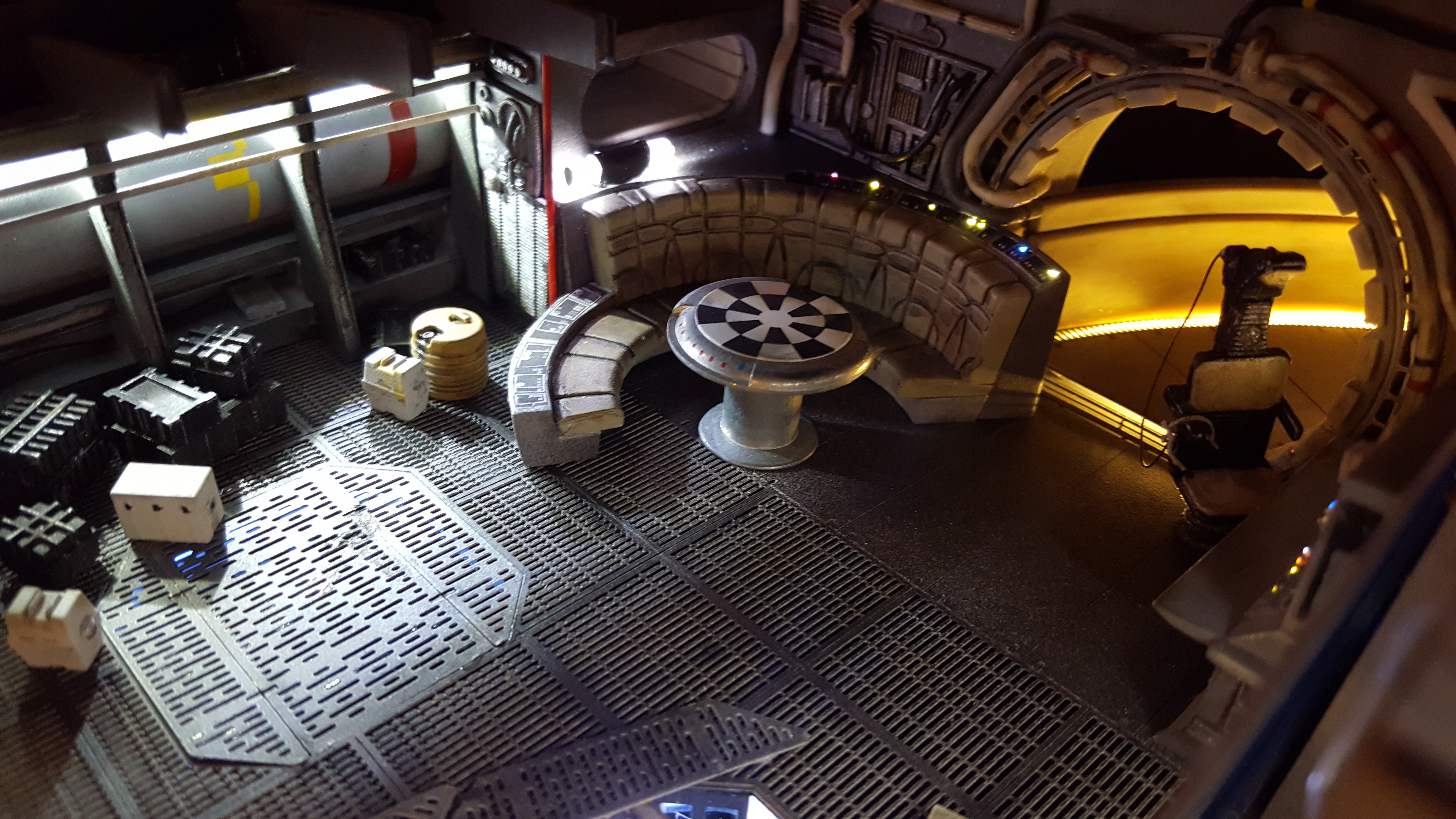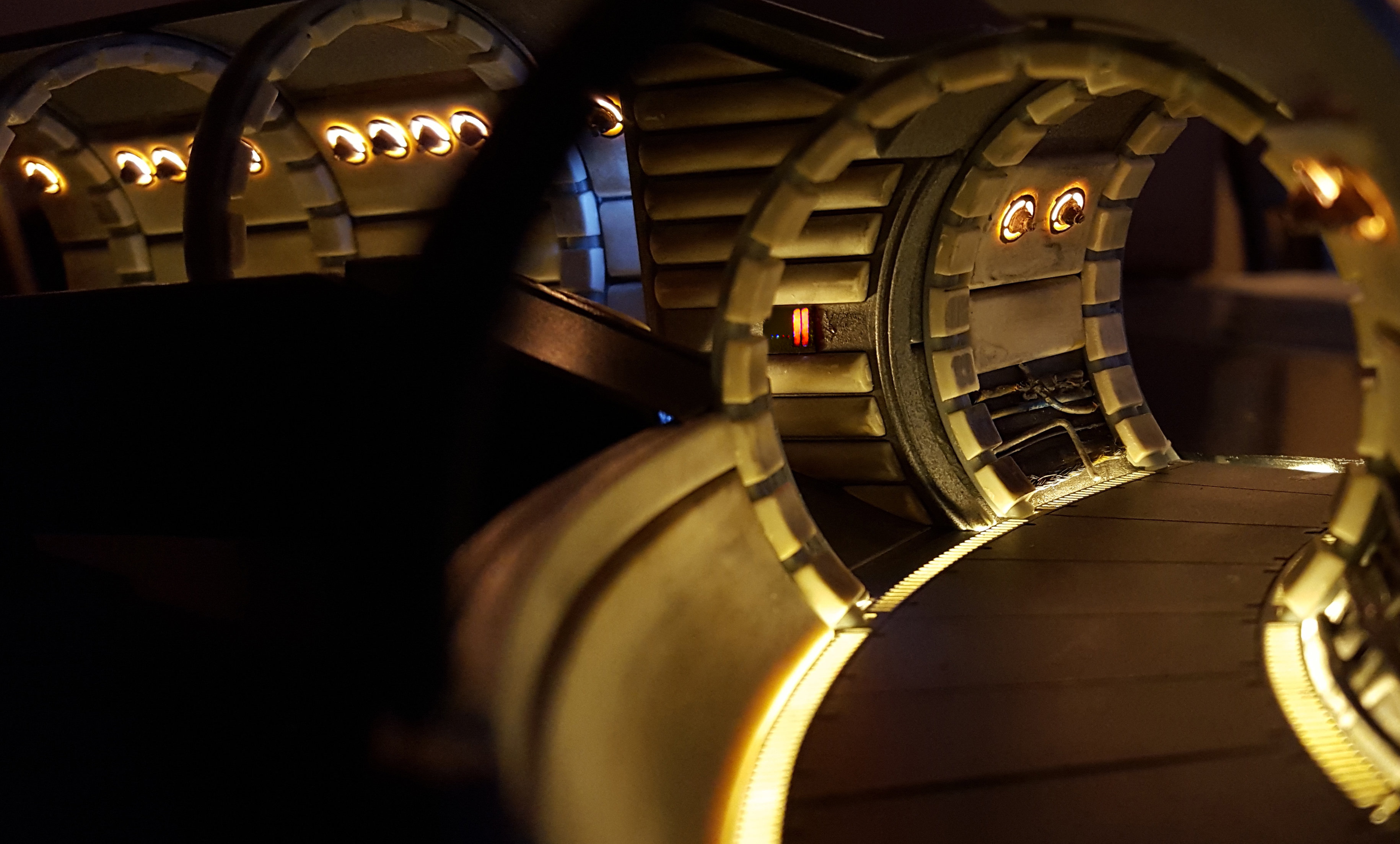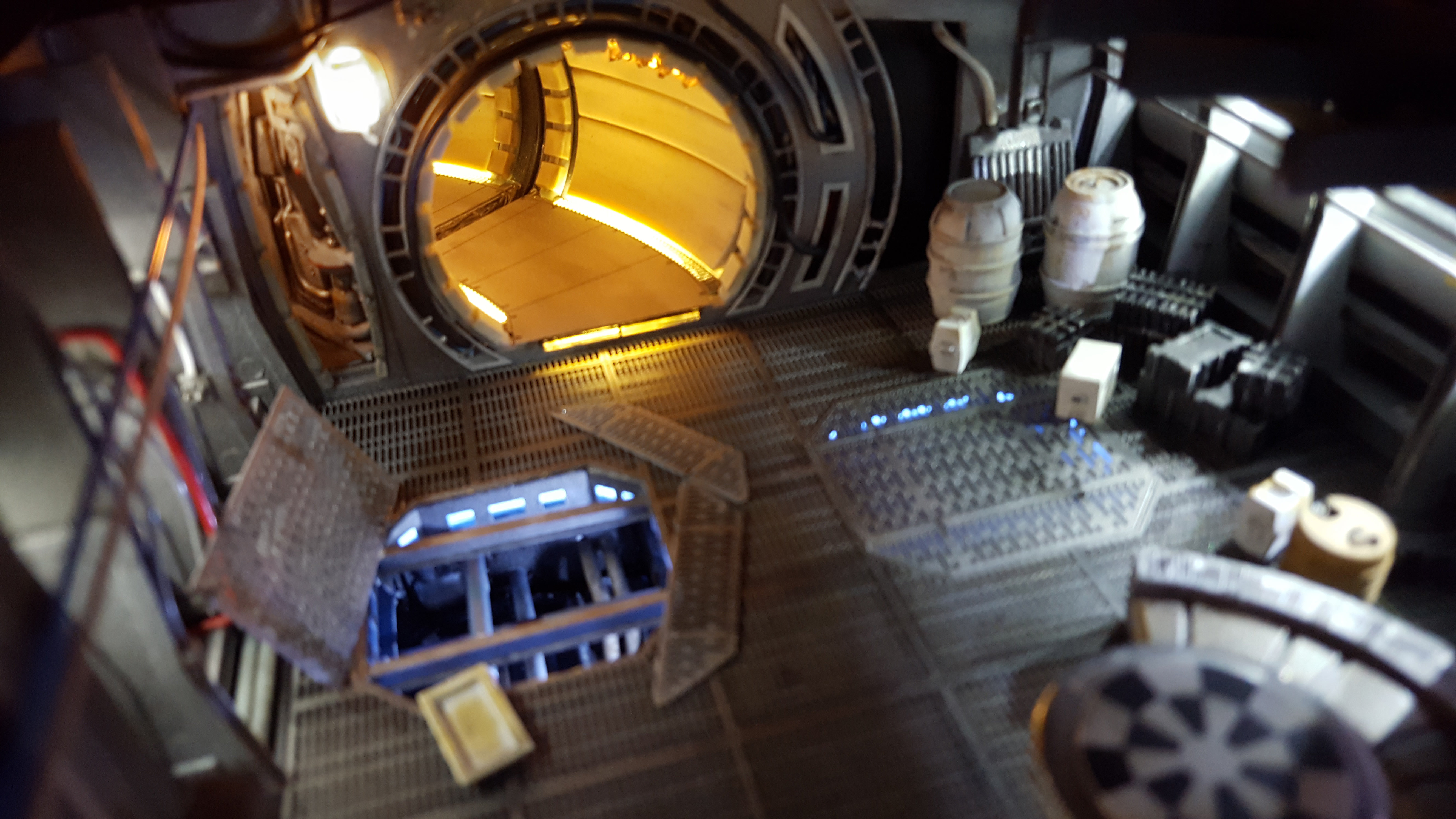 The cockpit monitor was scratch built from styrene. Cockpit lighting was done with .25mm fiber optic. The rear cockpit wall was one of the only kit lighting parts kept. In the hold, most of the additions were scratch built out of styrene. There are some greeblies which I added from pieces of an old MPC Falcon kit. The corridor floors are photo etch with lighting underneath. The corridor scones were scratch built with styrene tubing and lit with 0402 SMD LEDs. The crates, barrels and navigation chair were 3D printed from Shapeways. The Nav computer was lit using .25mm fiber optic. The maintenance pit was scratch built with styene sheets and tubing, with a few greeblies from the MPC Falcon. The circuitry bay was scratch built with styrene and greeblies from the MPC Falcon. All of the wall additions were done with styrene and some greeblies here and there.