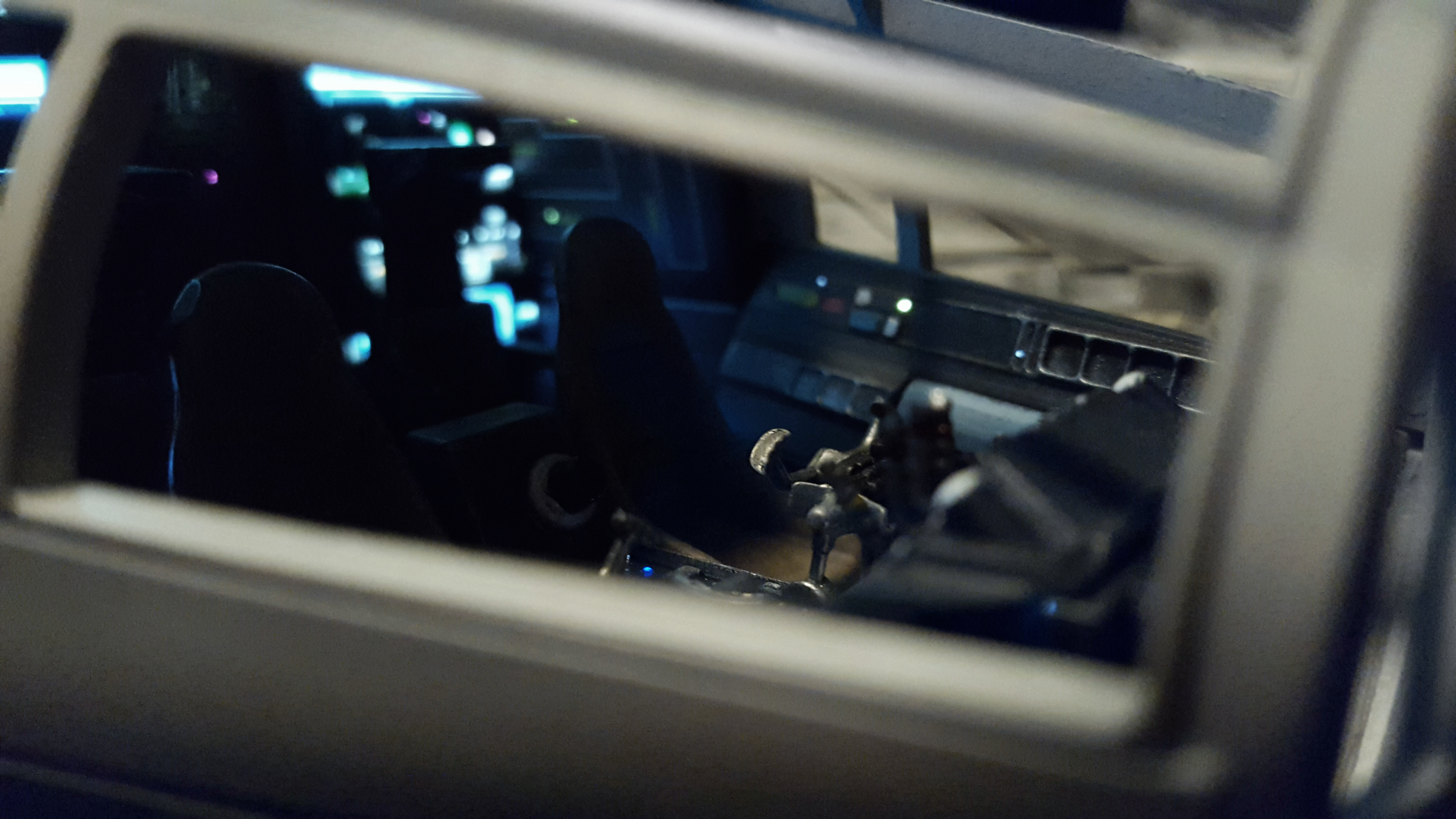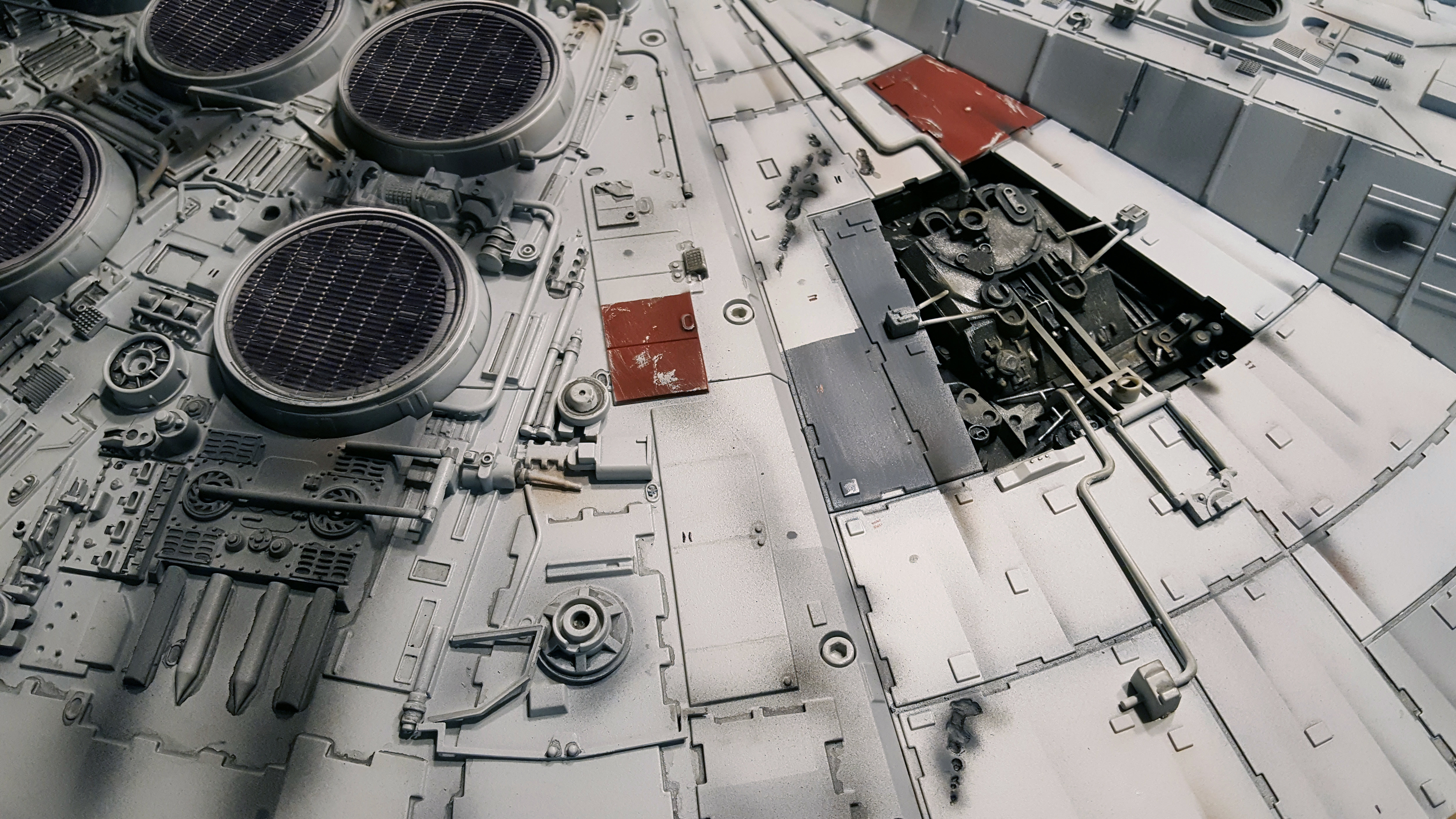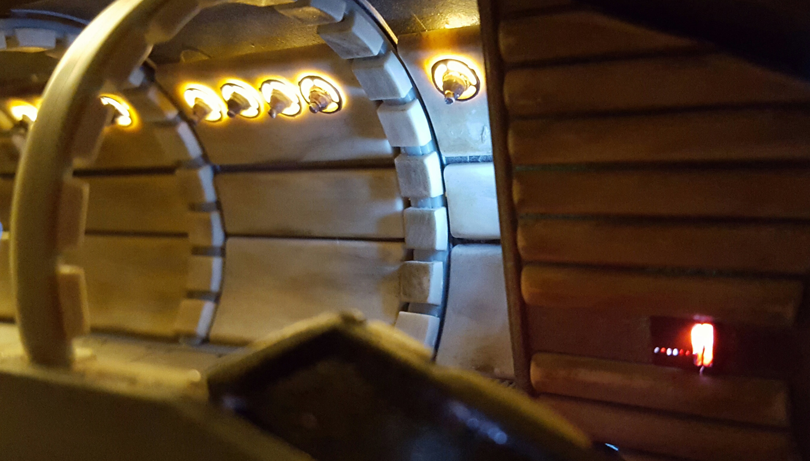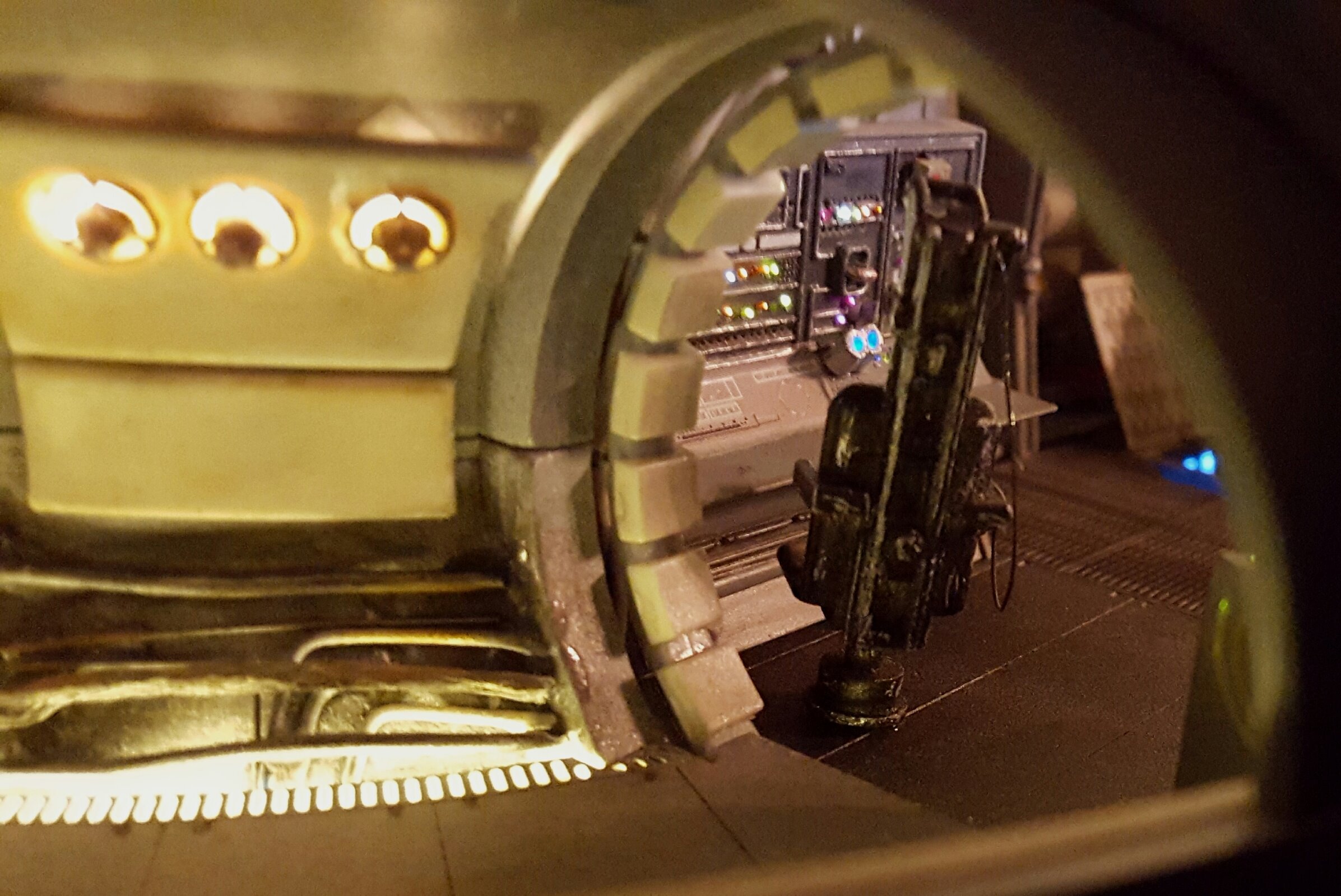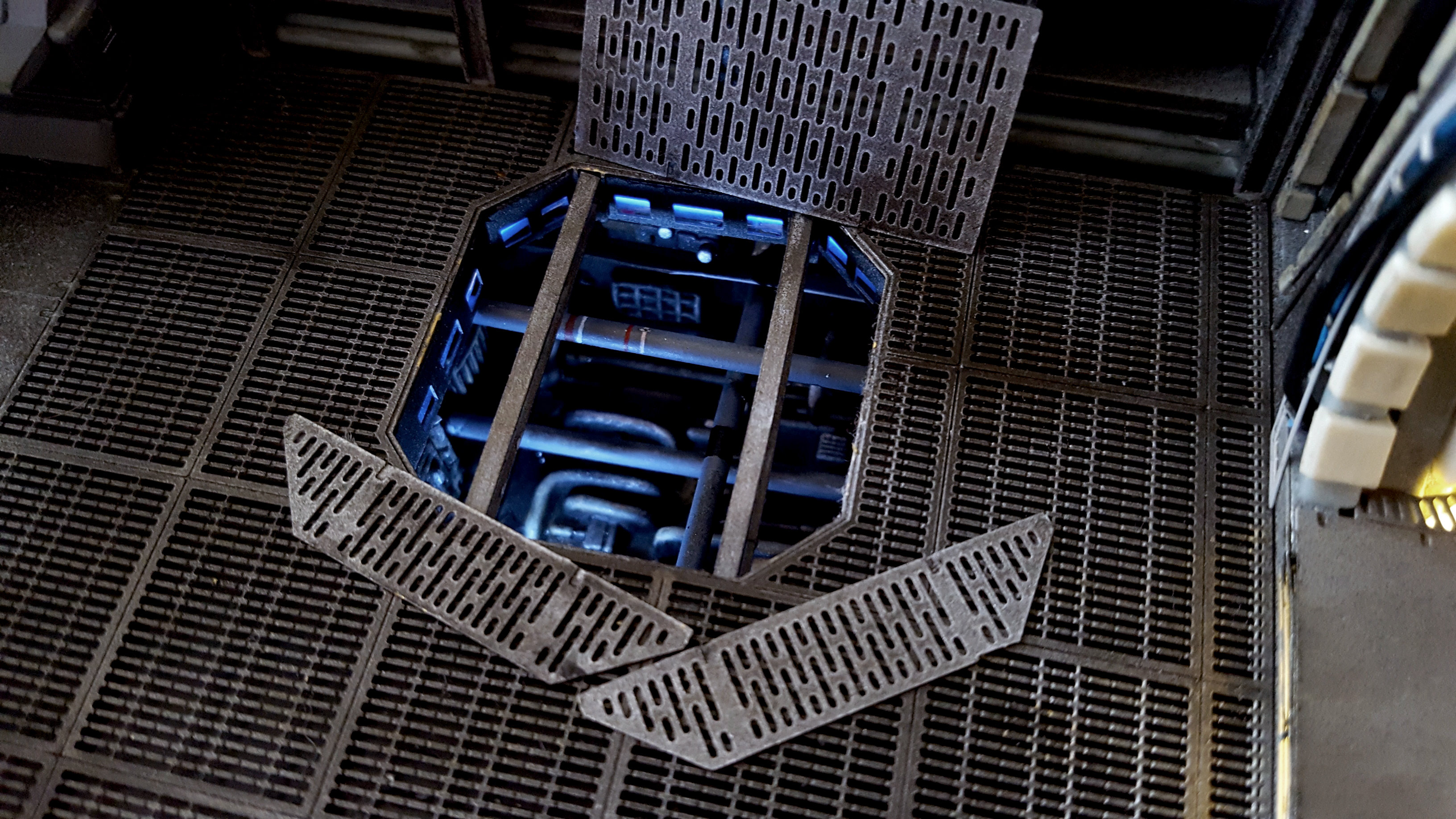 The cockpit monitor was scratch built from styrene. Cockpit lighting was done with .25mm fiber optic. The rear cockpit wall was one of the only kit lighting parts kept. In the hold, most of the additions were scratch built out of styrene. There are some greeblies which I added from pieces of an old MPC Falcon kit. The corridor floors are photo etch with lighting underneath. The corridor scones were scratch built with styrene tubing and lit with 0402 SMD LEDs. The crates, barrels and navigation chair were 3D printed from Shapeways. The Nav computer was lit using .25mm fiber optic. The maintenance pit was scratch built with styene sheets and tubing, with a few greeblies from the MPC Falcon. The circuitry bay was scratch built with styrene and greeblies from the MPC Falcon. All of the wall additions were done with styrene and some greeblies here and there.