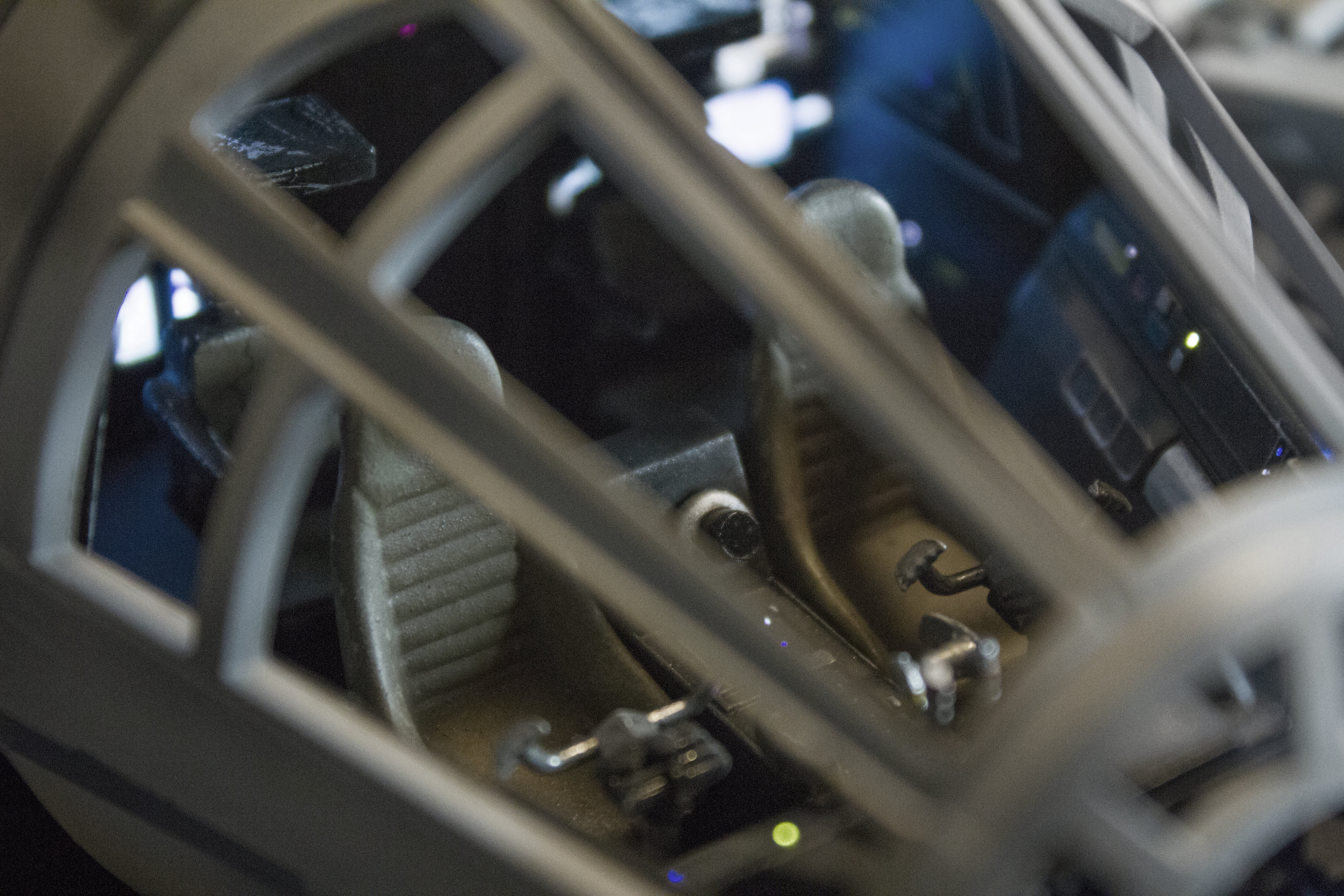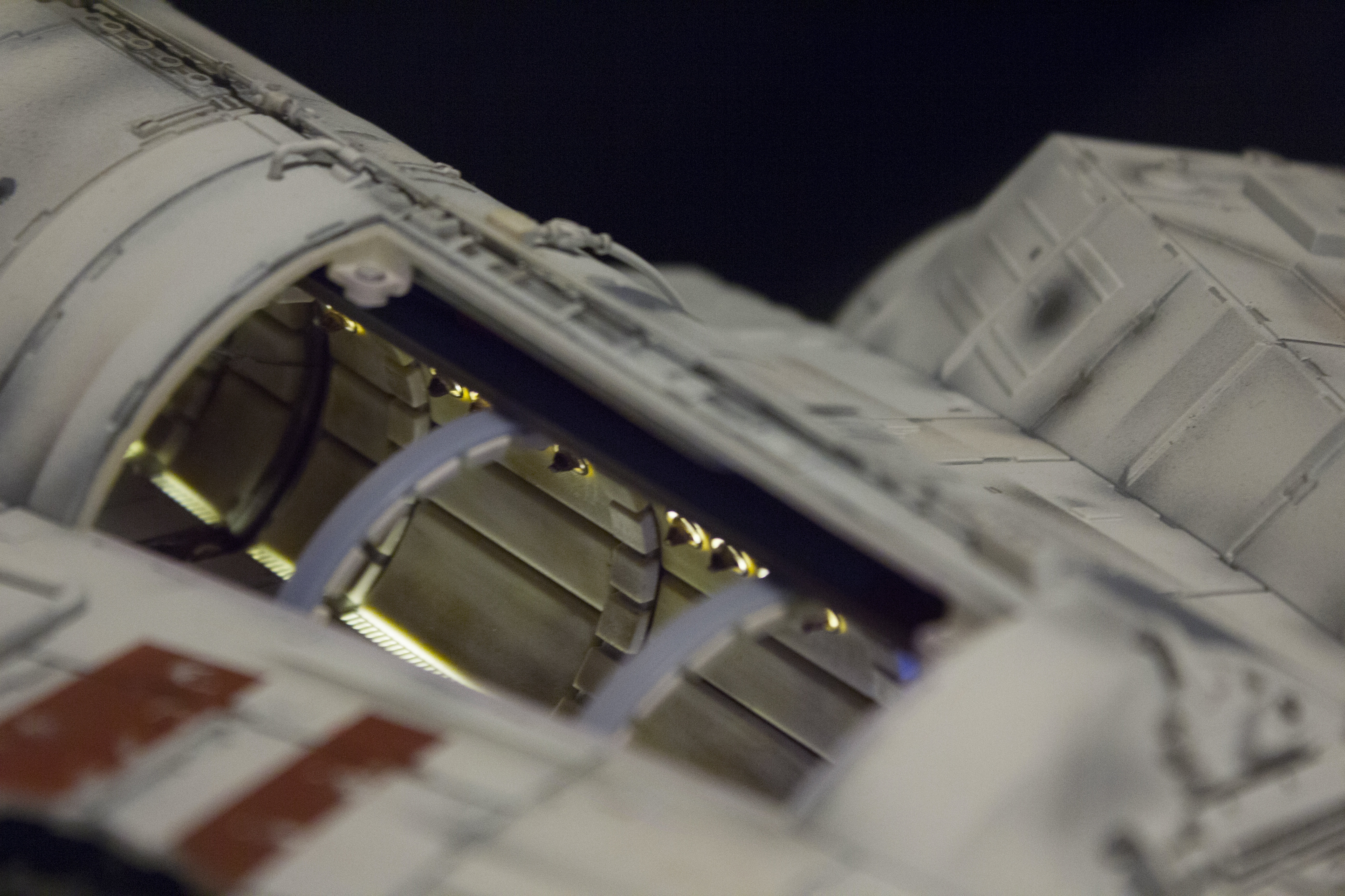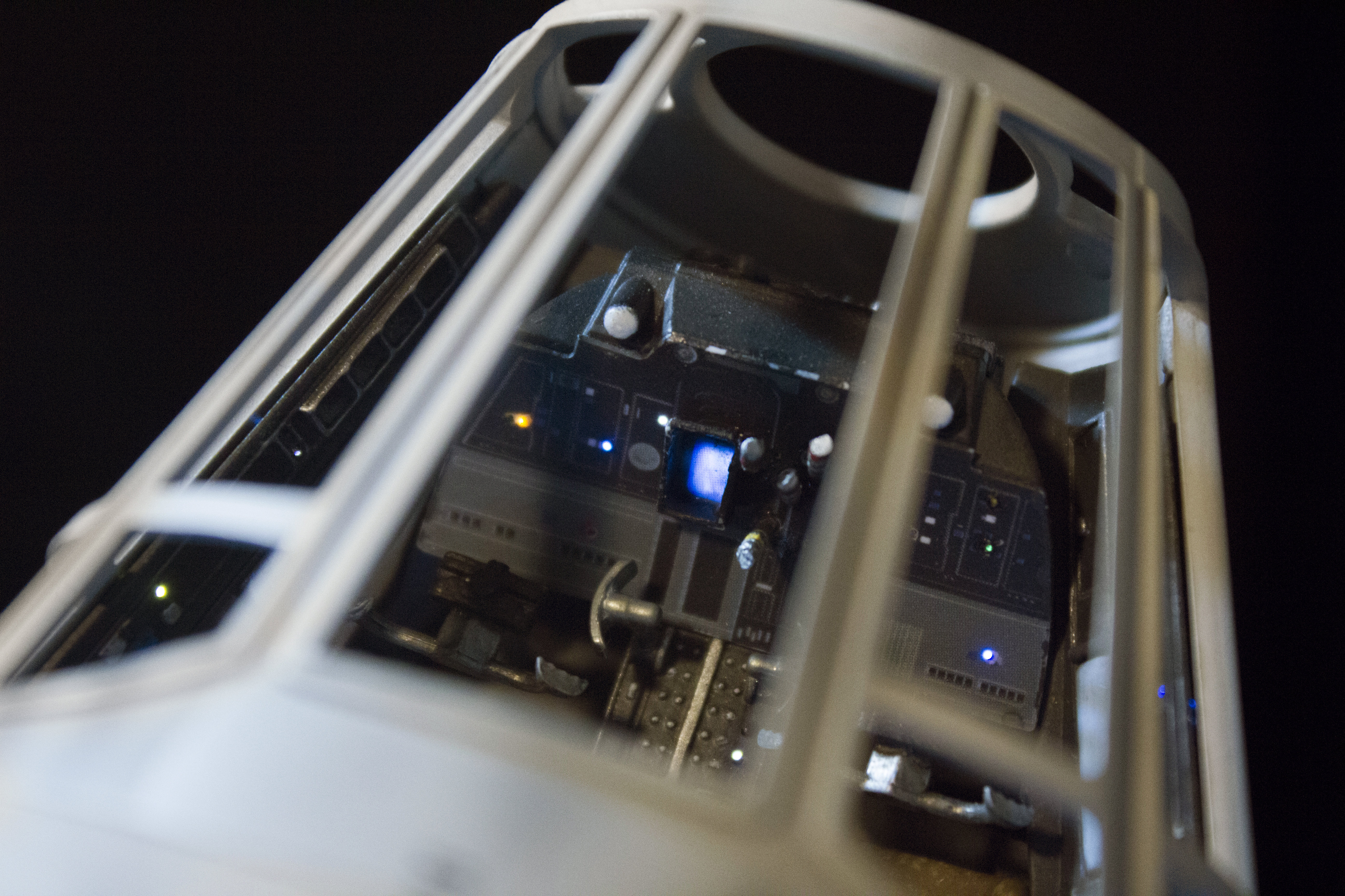 The red caution lighting around the underside of the hull and escape pods were done with 1.5mm fiber optics run to some internal red LEDs, and 3D printed light housings.. The engine lighting was slightly modded with additional LEDs to even out the lighting across the back with a photo etch engine grill. I rewired the landing lights so that they only come on when the landing ramp is lowered, and turn off when the ramp is closed. As my model is displayed in the flying position, I don’t really ever have the ramp open. The front headlights are the only other kit lights that were kept.