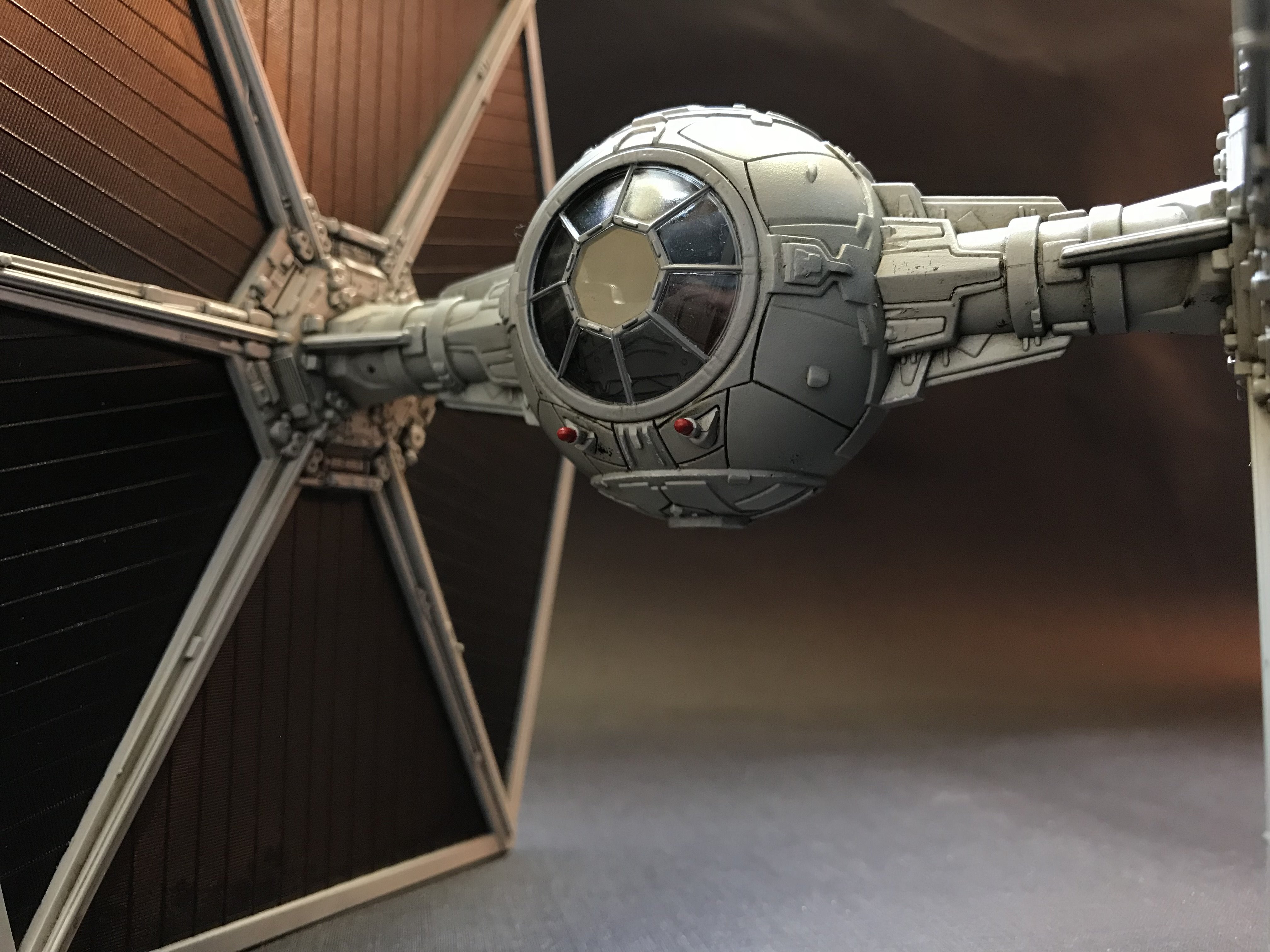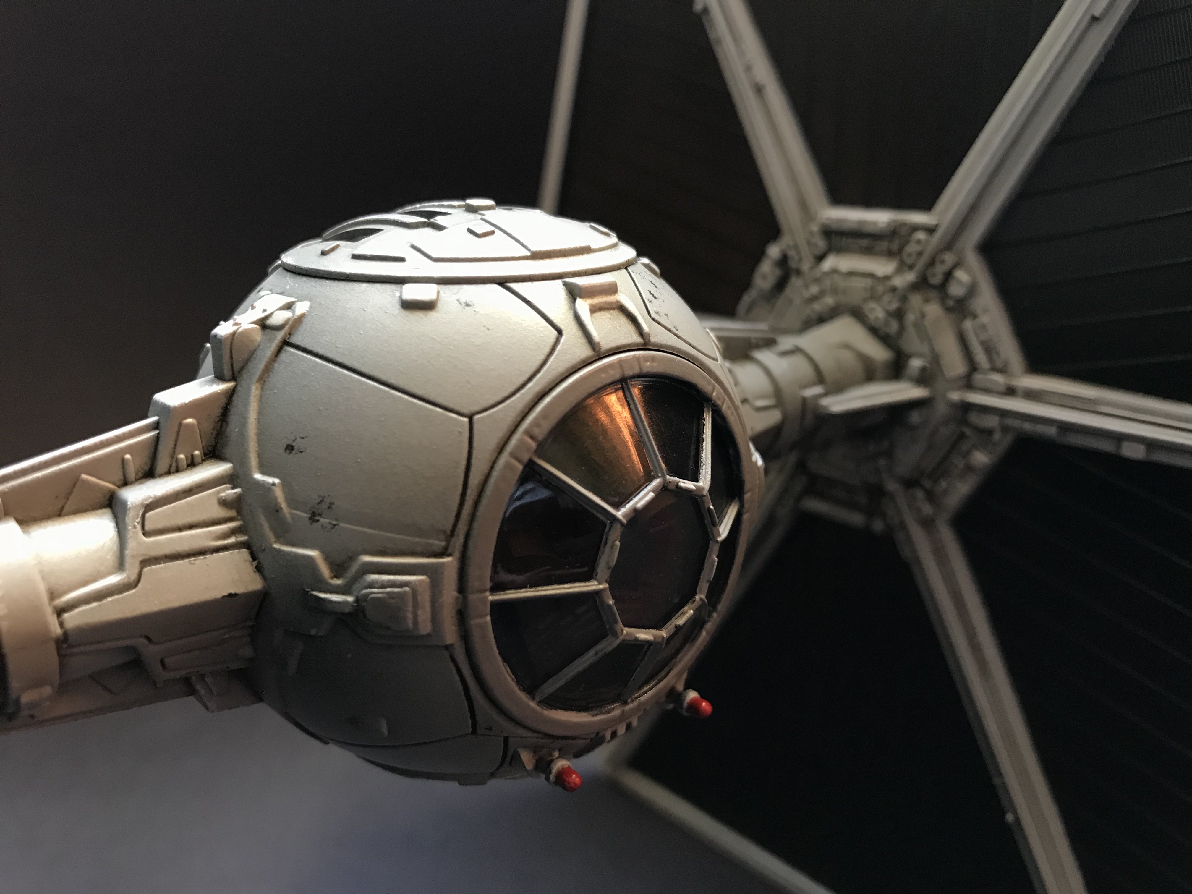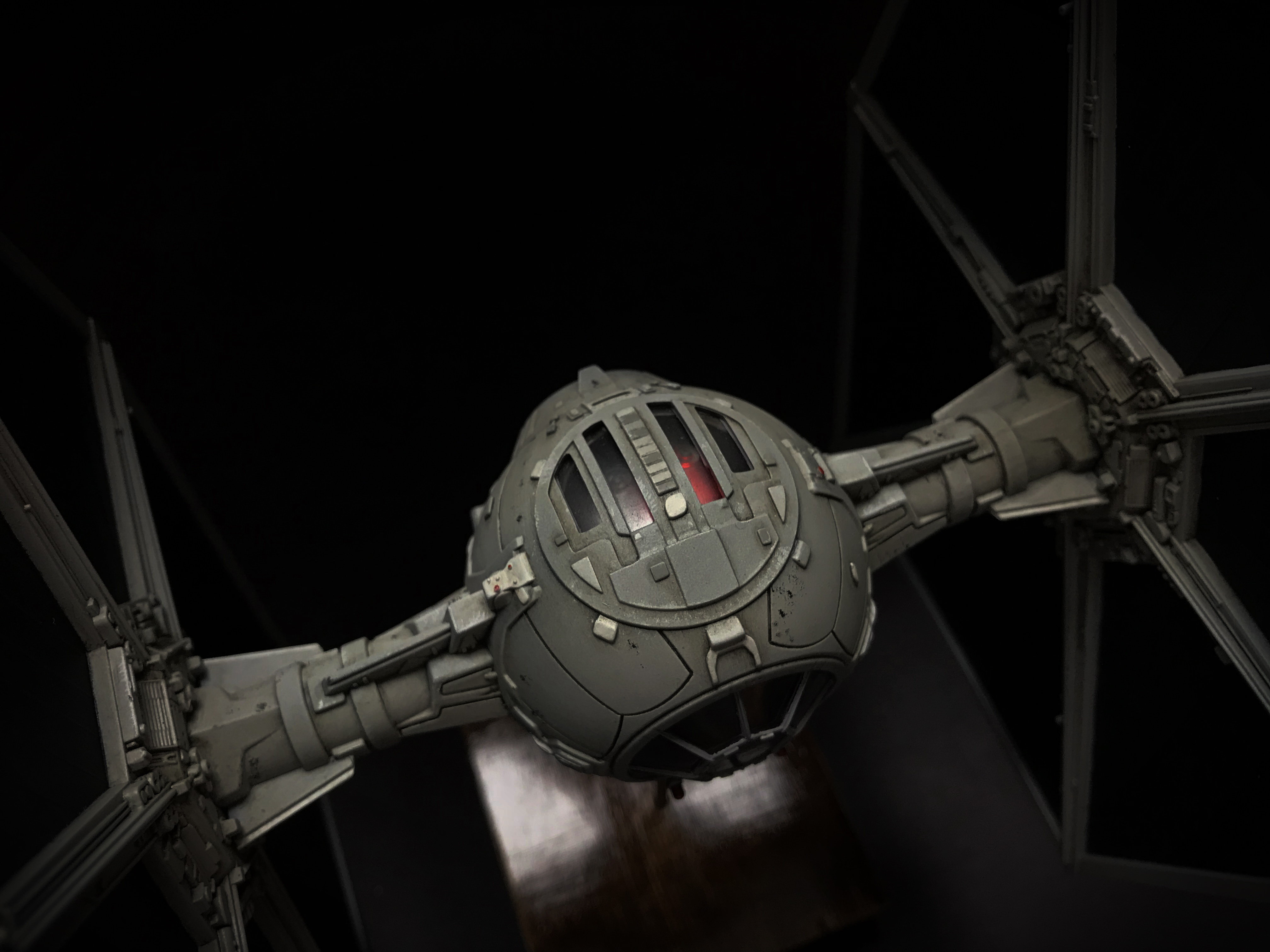This is the Revell Easykit I had for a while and decided to paint it to train my airbrush skills. Tamiya colors, Starship wash and Streaking fluids from AMMO MIG were used. I tried a bit of decent chipping and dry brushing on this build. The case socket is made from “walnut tree” … , felt and brass. The red cockpit light can be switched on, the LED is integrated in the brass tube stand.
