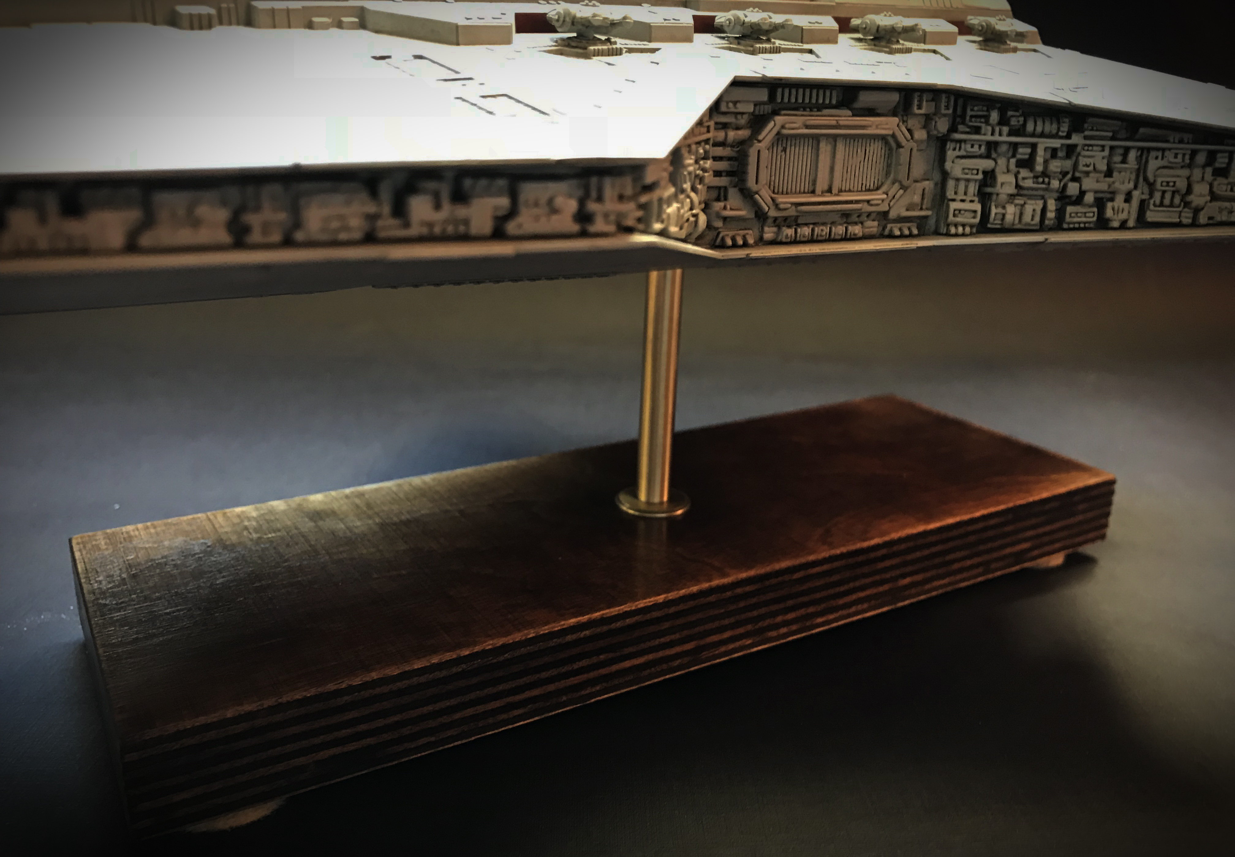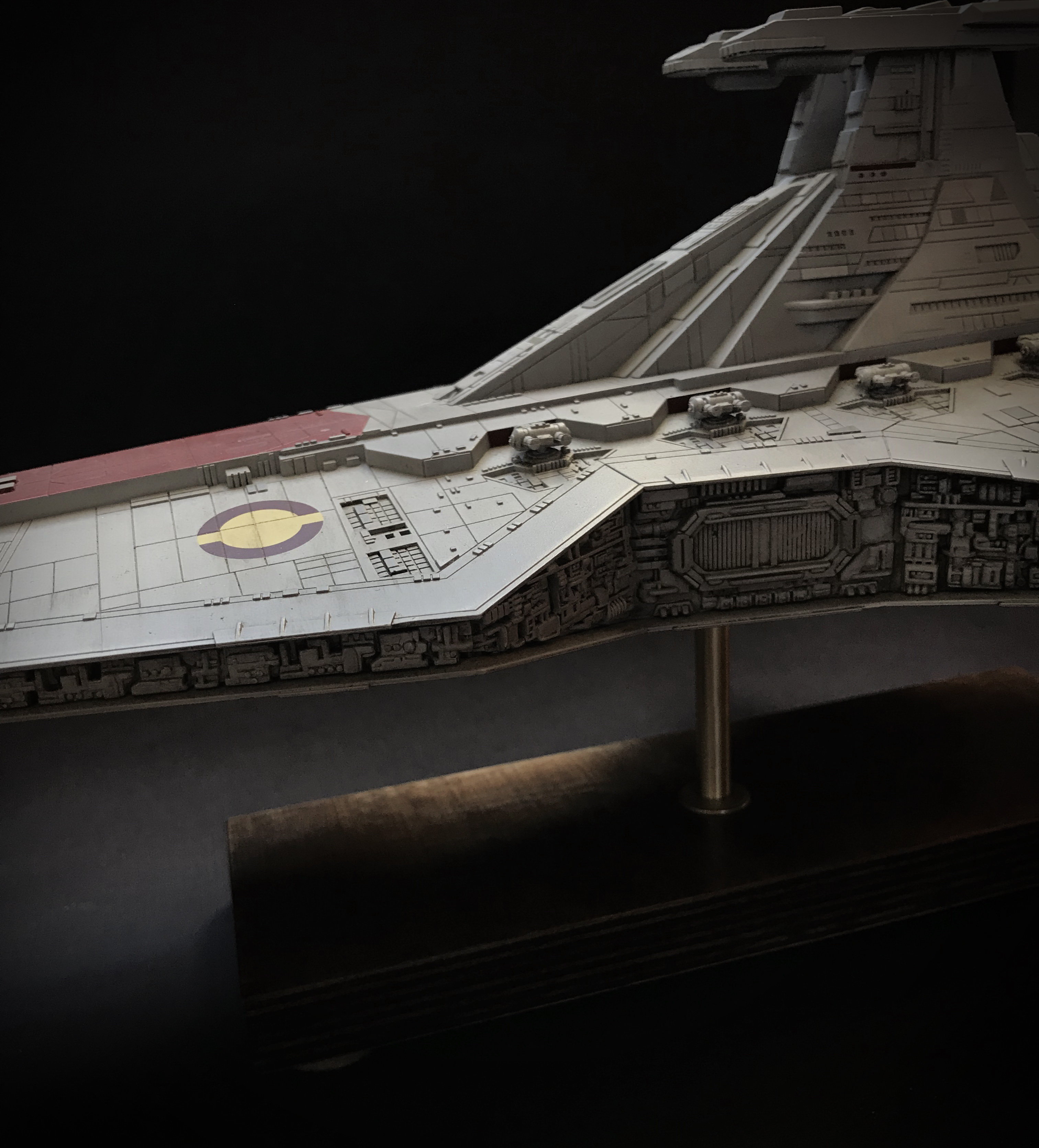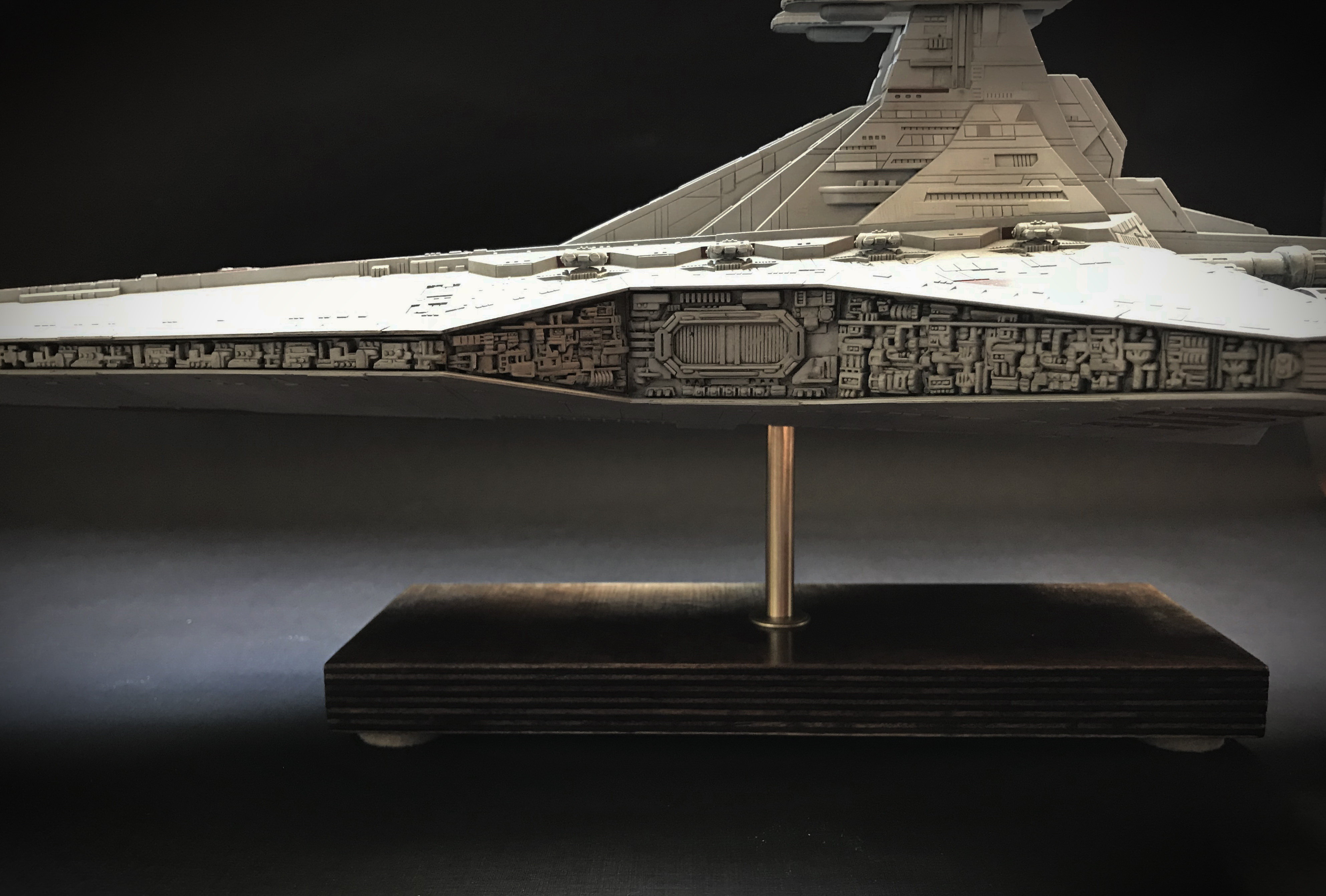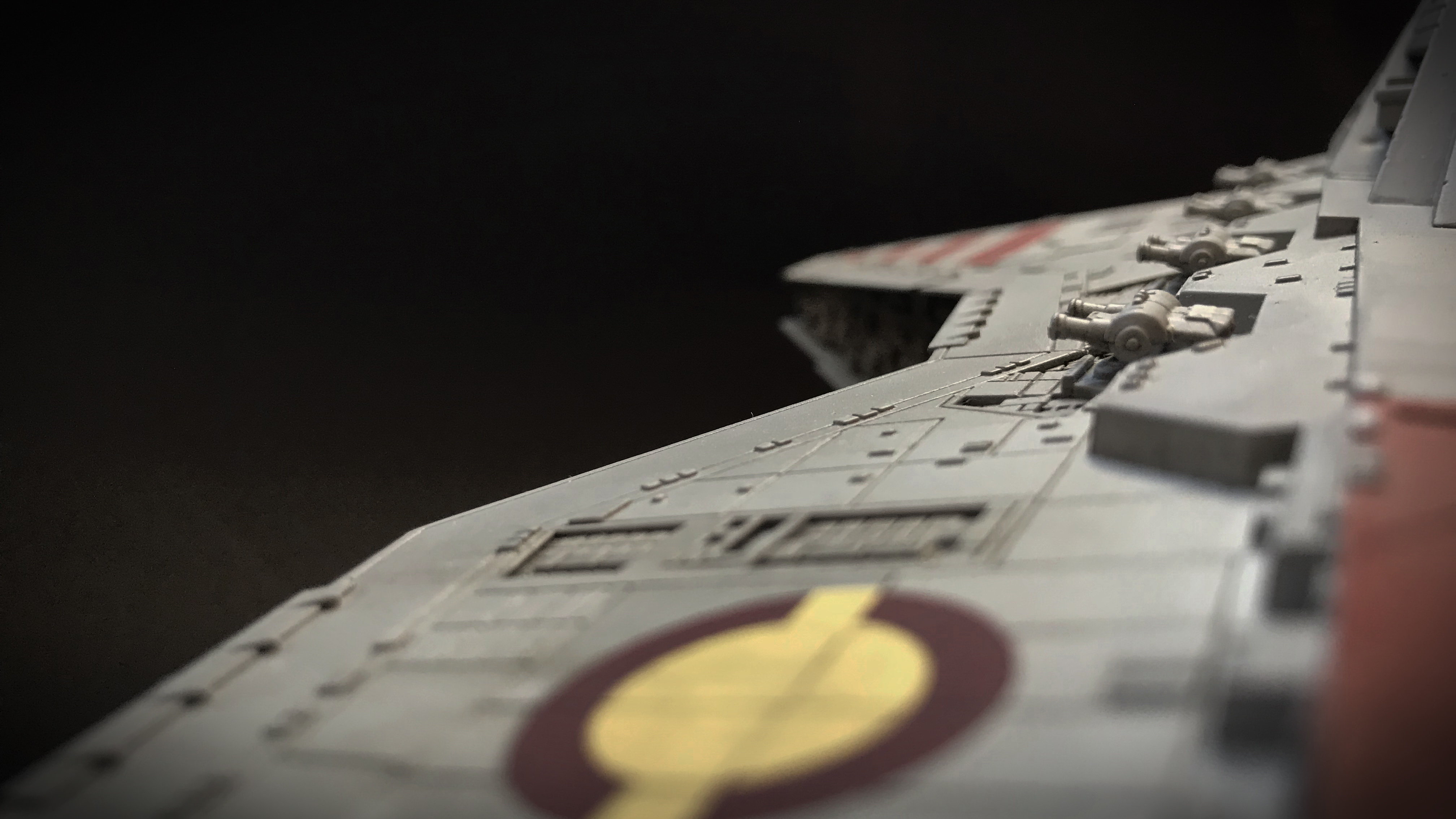 This is the older Revell Kit. The scale is roughly 1:2700. I built this years ago straight OOB. This year I used it as test build to check my airbrush and other skills. I wanted a battleship, plain and simple, with not much coloring, and a decent “used” look. Tamiya colors, Starship wash and Streaking fluids from AMMO MIG were used. The stand is brass and stained wood which were polished then.