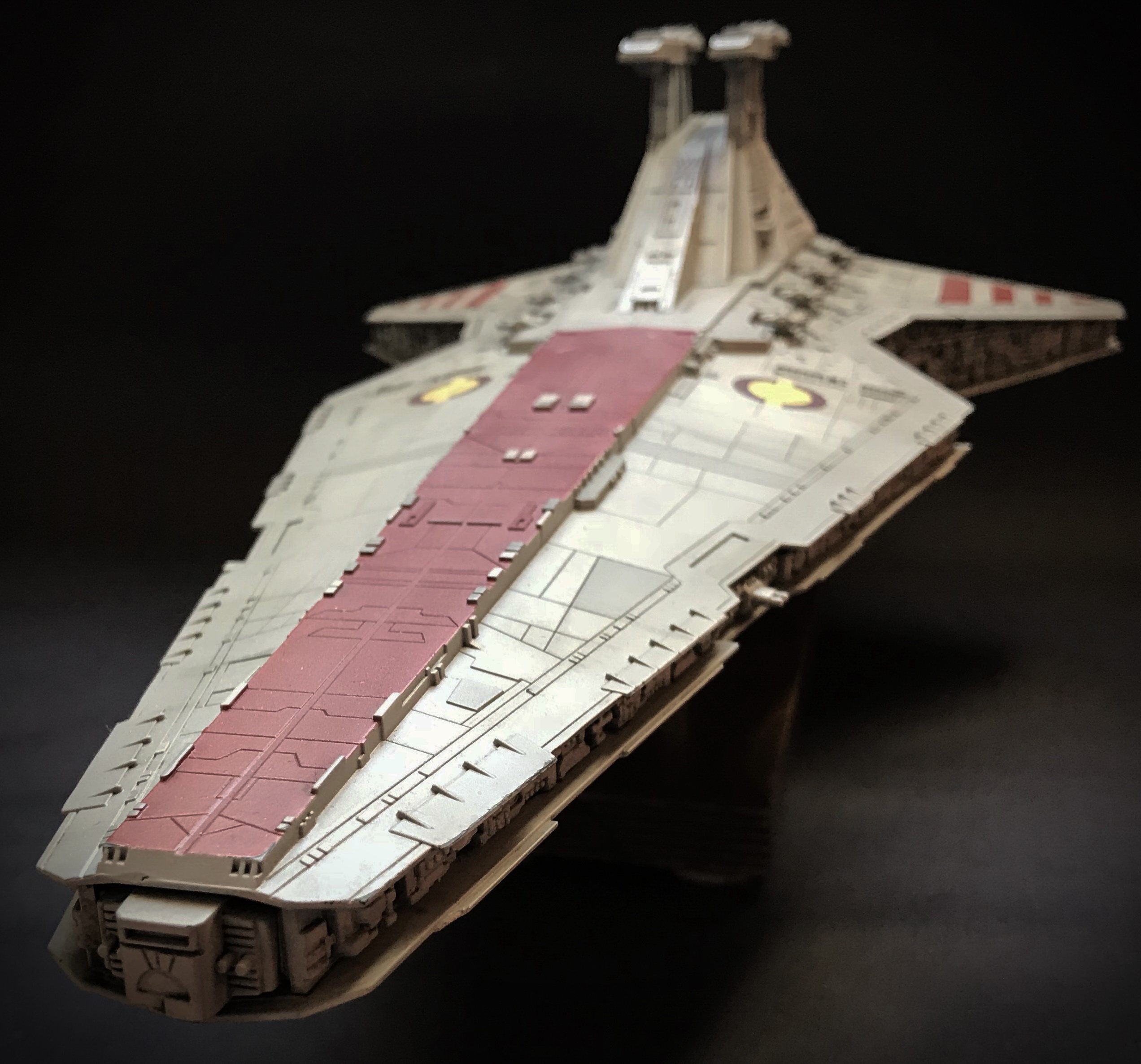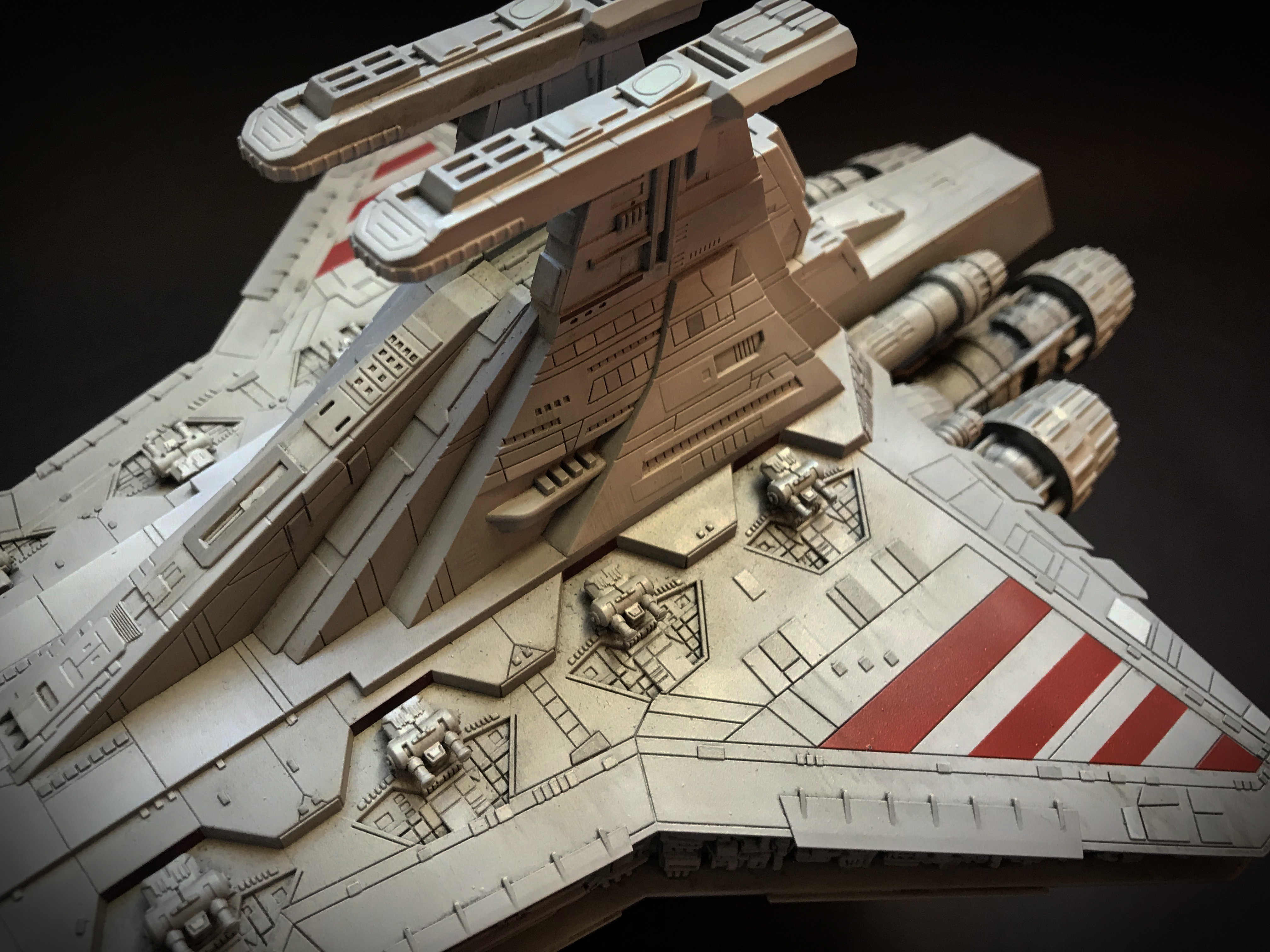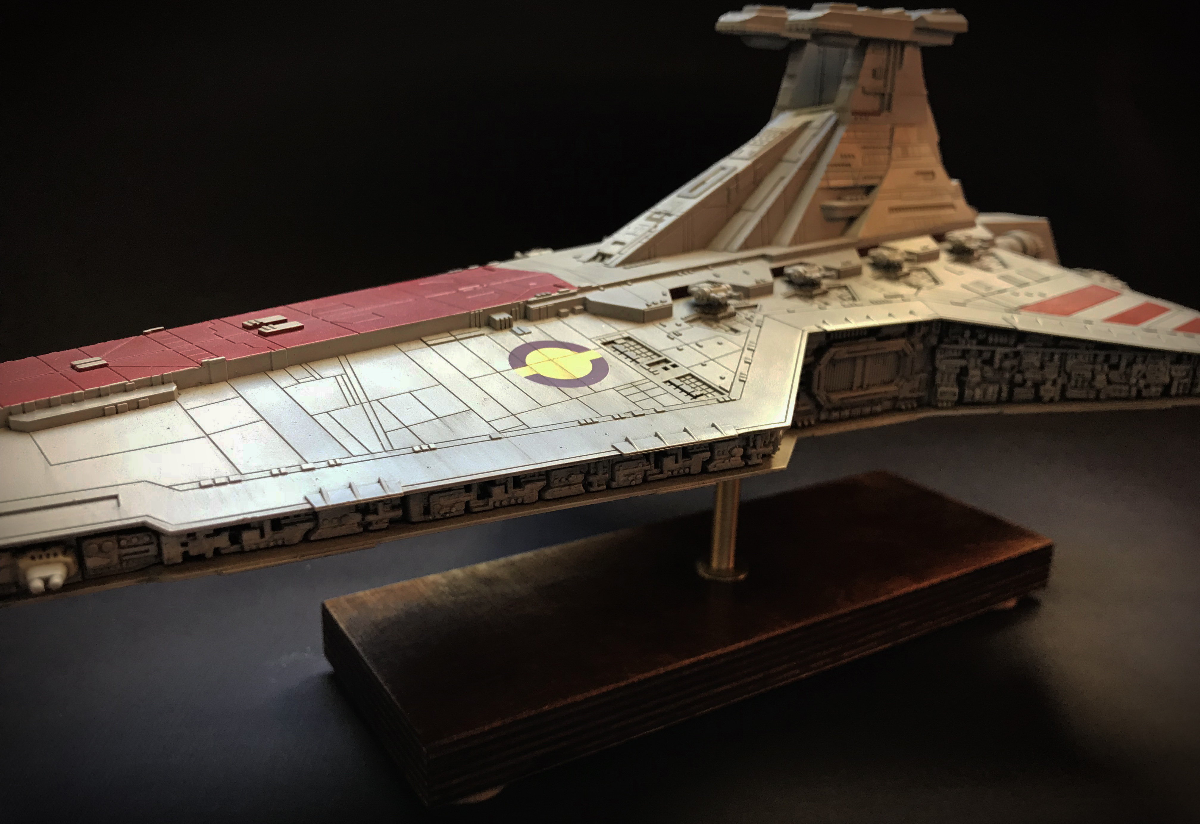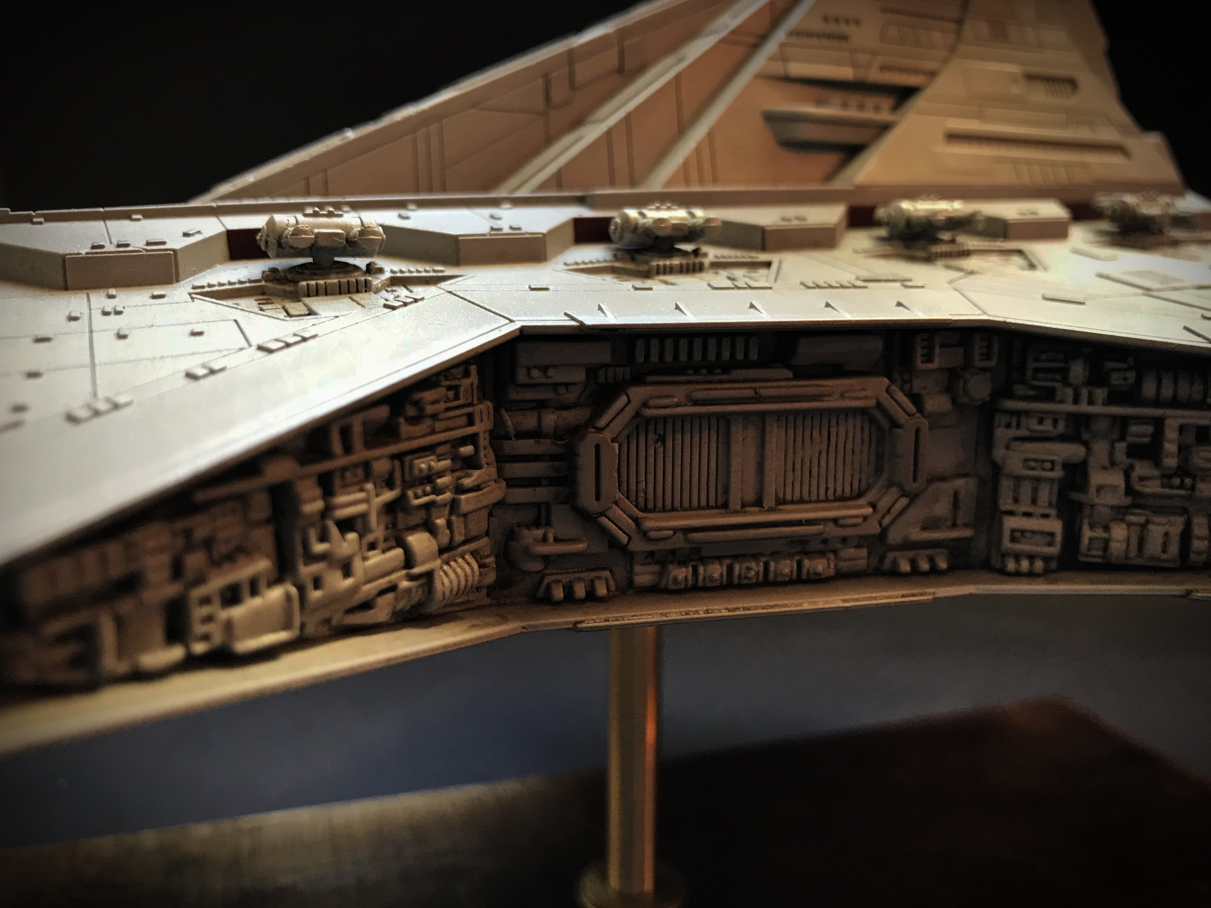 This is the older Revell Kit. The scale is roughly 1:2700. I built this years ago straight OOB. This year I used it as test build to check my airbrush and other skills. I wanted a battleship, plain and simple, with not much coloring, and a decent “used” look. Tamiya colors, Starship wash and Streaking fluids from AMMO MIG were used. The stand is brass and stained wood which were polished then.