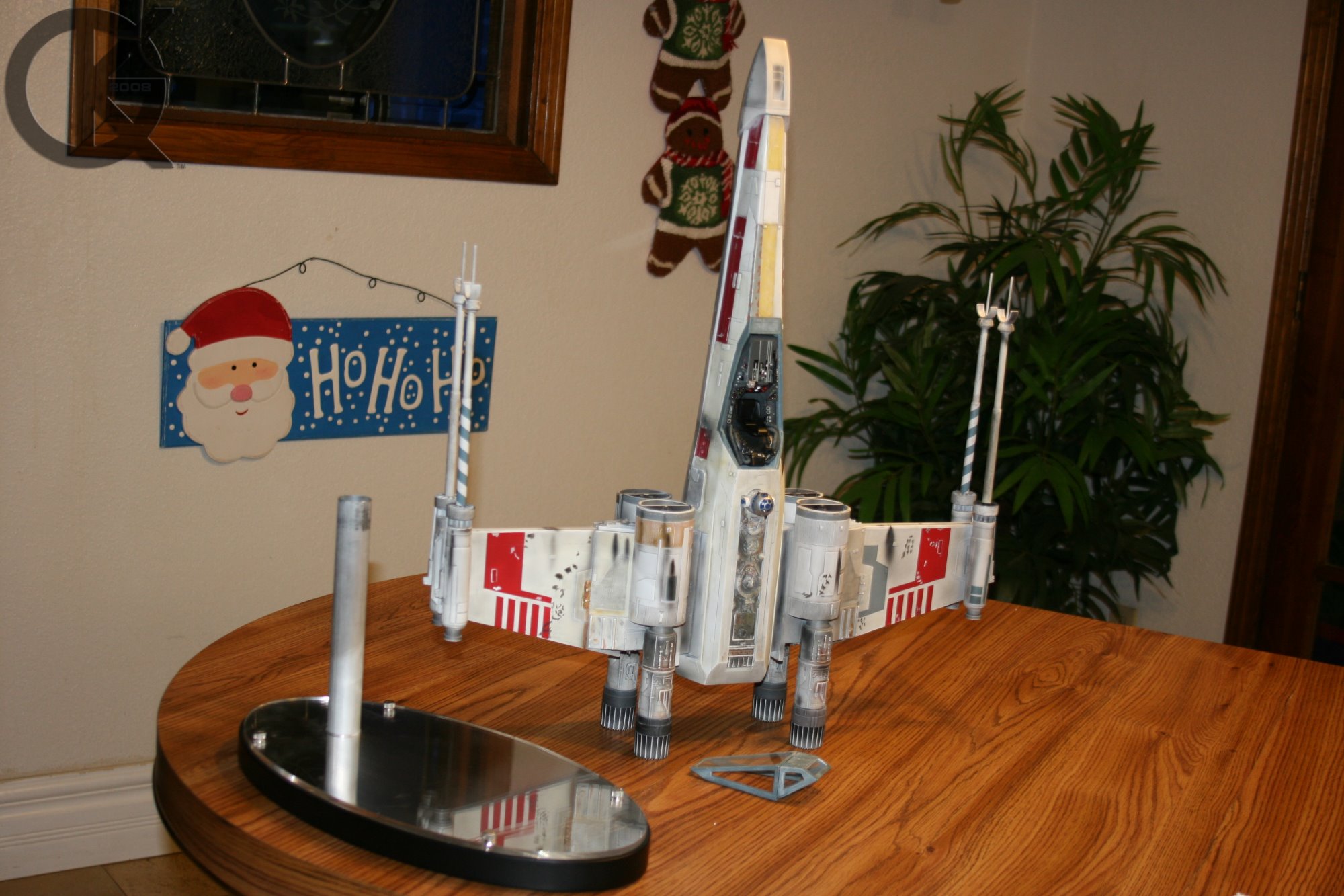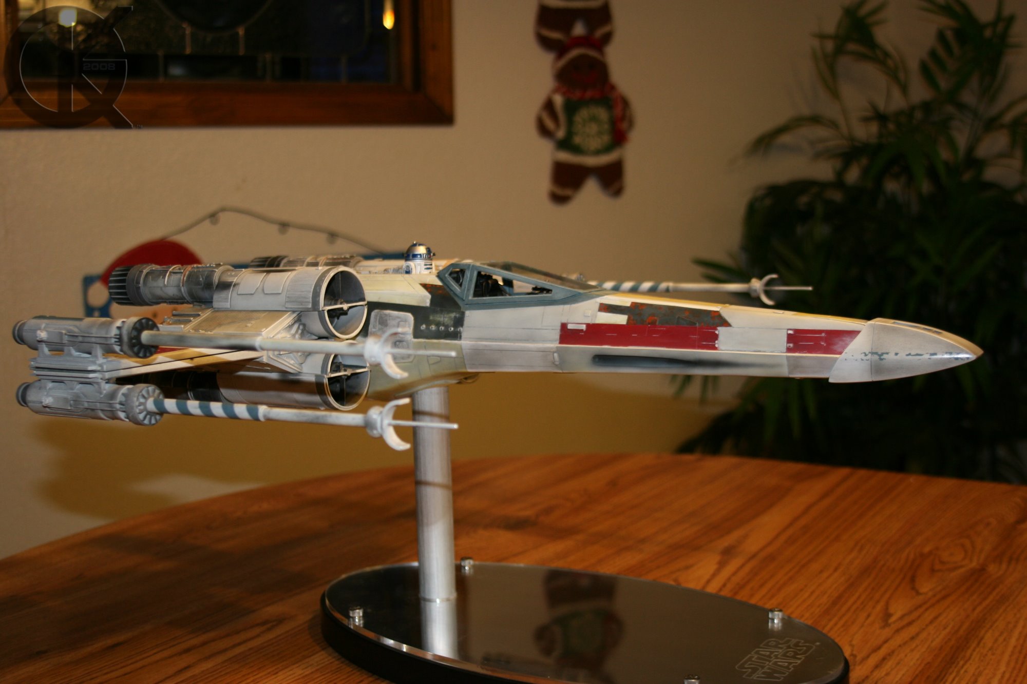 Now.. back to it’s weight and coldness. Upon tapping on the item a few times, this fuselage was obviously cast in polystone… a VERY time-durable casting material. My first impression was “WOW”. I then felt around to see what else was obvious in the materials. The wings are metal and are VERY rigid. They have an unseen magnet within them to keep them closed until manually opened…. which I did immediately following my inspection of materials. This X-wing had been shipped around the world several times to different individuals, so I was expecting some problems which did show up in small amount. The wings, when manually opened, are supposed to open together so that if you open one wing, the others do as well.. This one had a busted gadget inside that only allowed the cross wings to open simultaneously. And the second set would not stay in place. I attribute this damage (even though it was professionally packed) to our fine world delivery services, and the handling of it by many before myself.