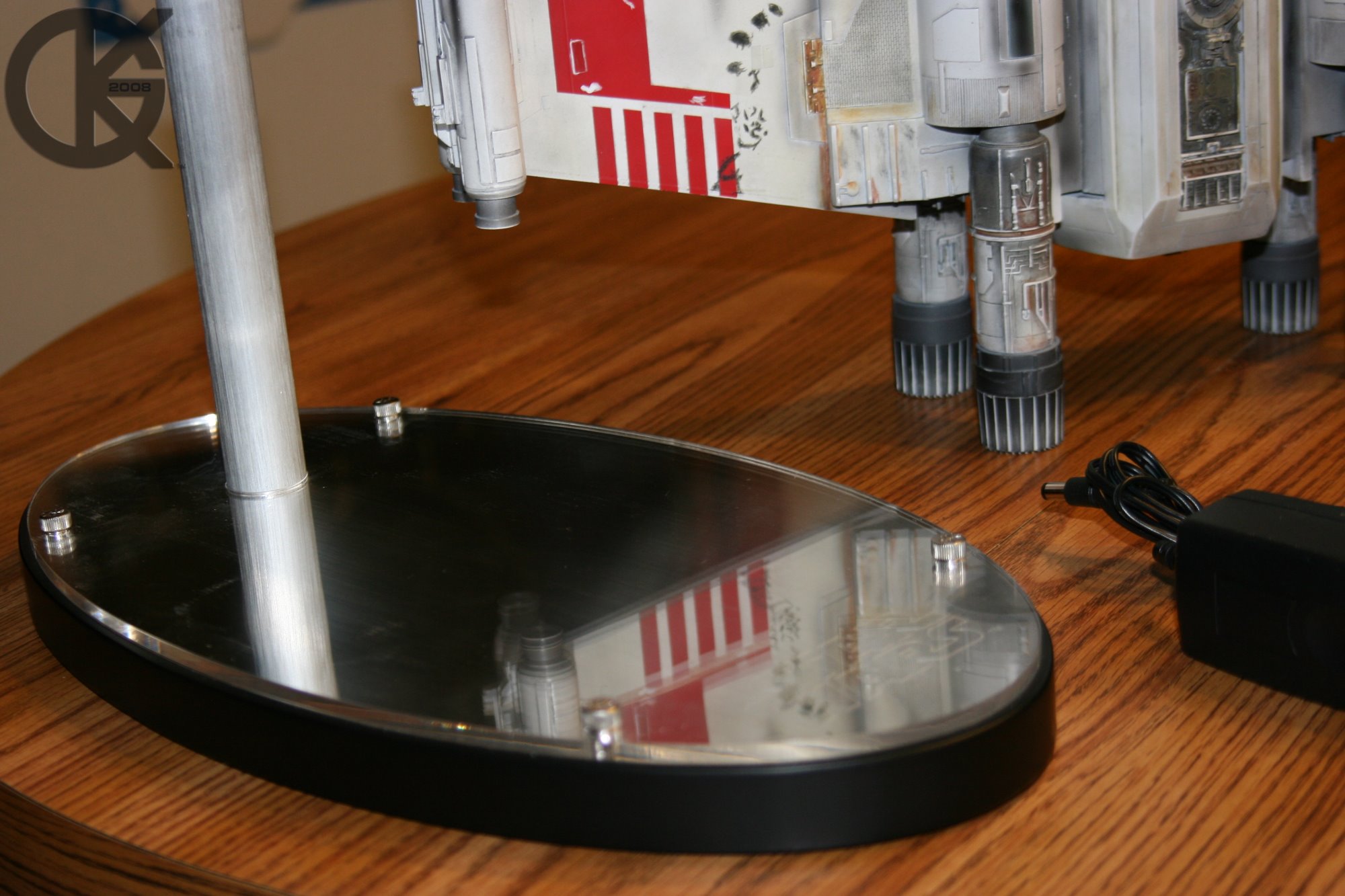 Now, the stand is a brushed aluminum looking, clear acrylic covered, black oval base, with a 1 inch aluminum pipe extruding from it that has the electronic connector inside. The brushed aluminum under the clear acrylic is etched with “STAR WARS”. Very nice indeed! However.. the mounting pipe really bugs me. This is something I very much dislike in mass offered pieces and may just be my personal preference. The stands piping is always too large due to a few skinny wires being placed through in my opinion. This REALLY detracts from the awesome look of any piece that would sit atop of them! ICONS did it to their X-wing with a huge, clear acrylic rod! Somebody,…ANYBODY, needs to rethink a better way of mounting models with electronics. The smaller, the better! And PLEASE…. make them positional.. like the panavise camera stand. That rant now over , the electronic connector is a simple connection that will fit only one direction.. so there is no making a mistake. The power button resides on the side of the base as a simple toggle switch. The power plugs in just aft of the toggle switch.