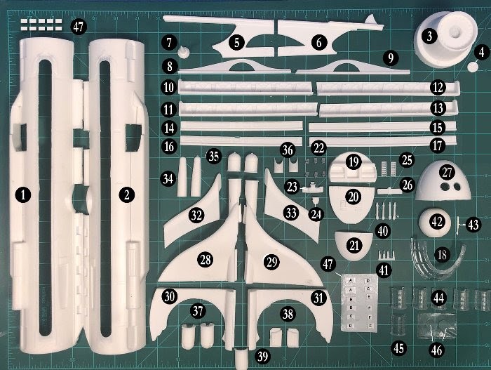 This huge, screen-accurate 1:144-scale multi-media kit was patterned by Scott Lowther and cast by Creative Cast Parts. It’s 75-plus pieces include a detailed cockpit interior, clear resin windows, and dozens of photo-etched brass detail parts. Decals were designed by JBOT and printed by Tango Papa Decals.