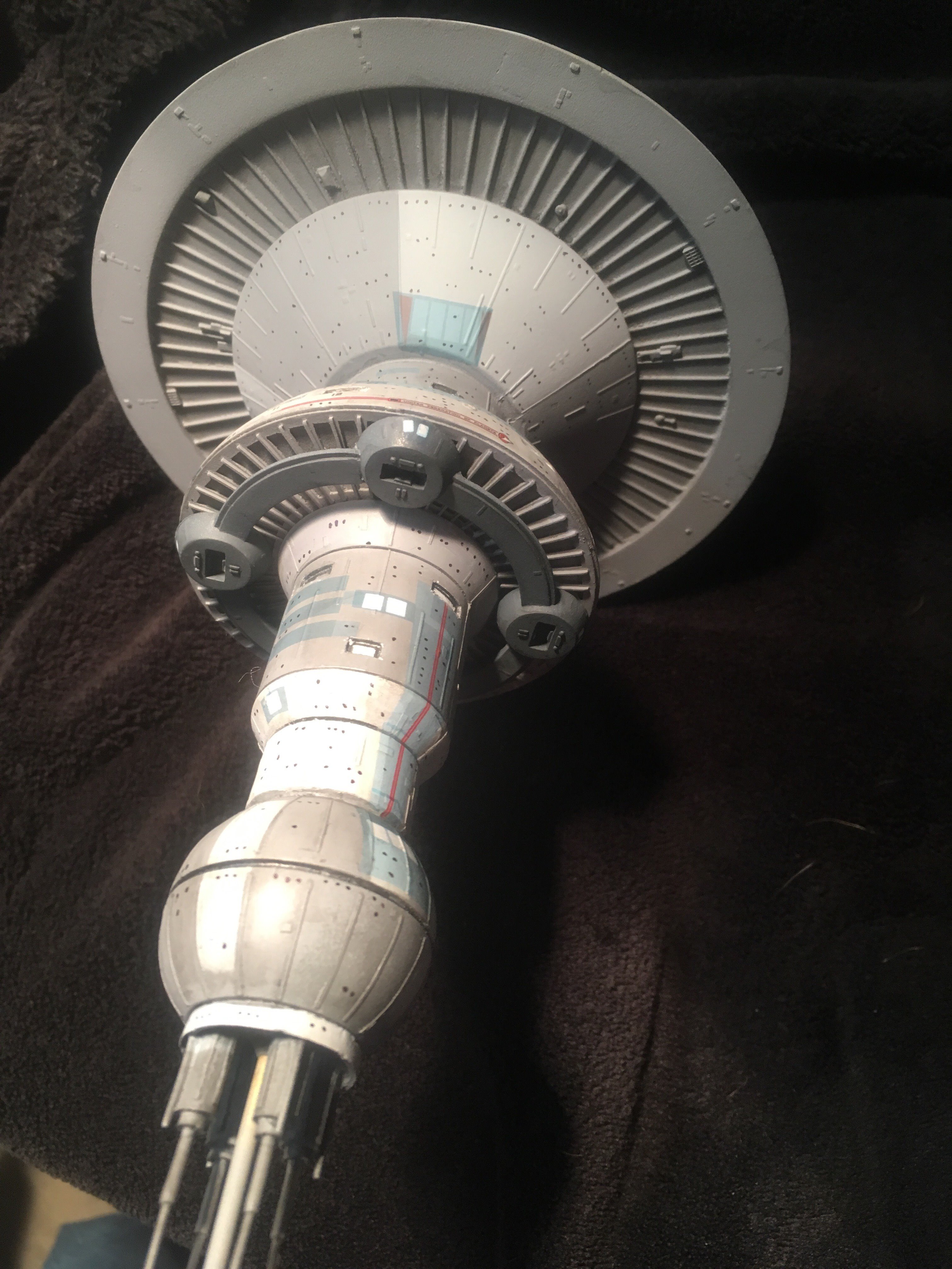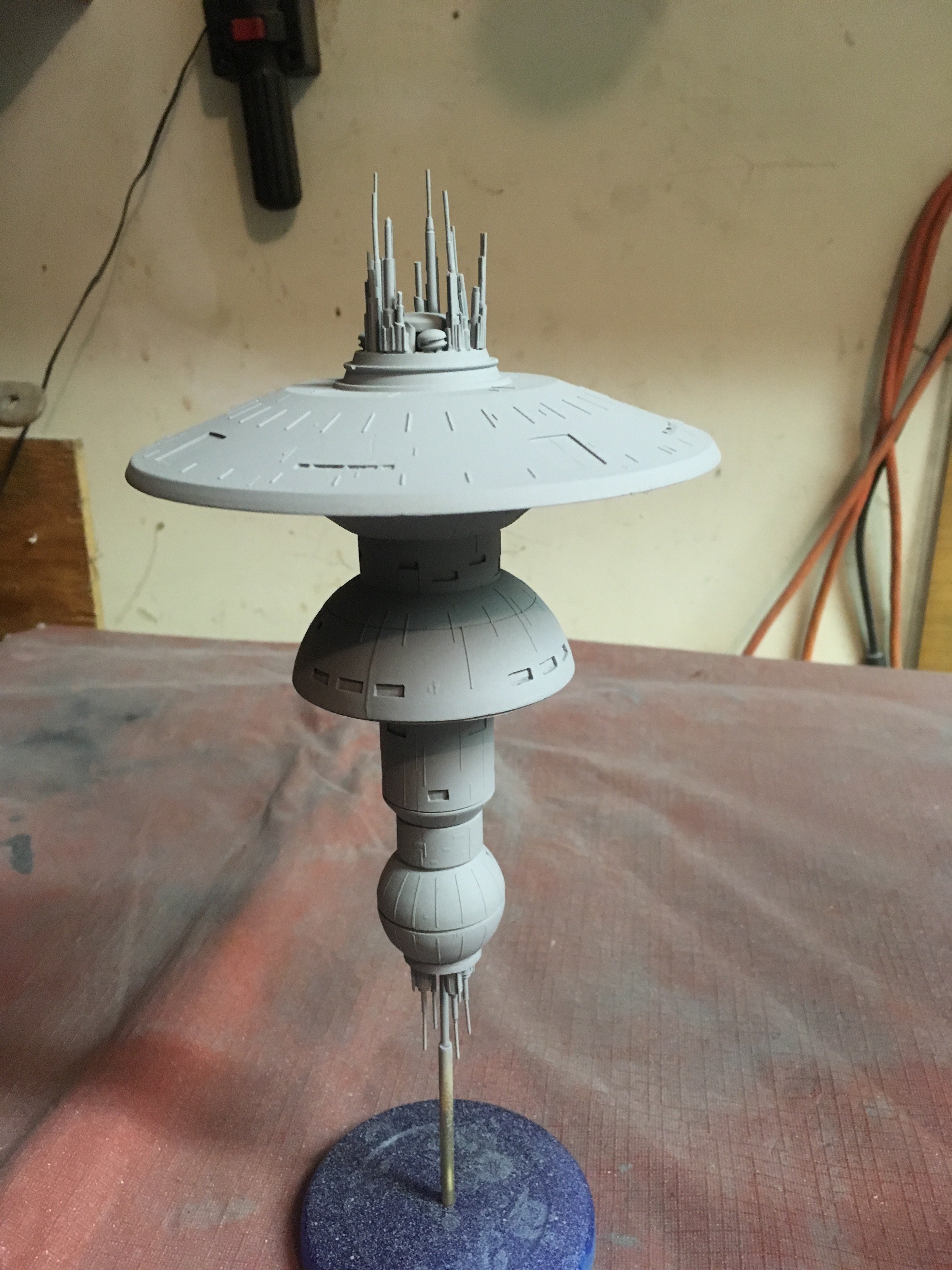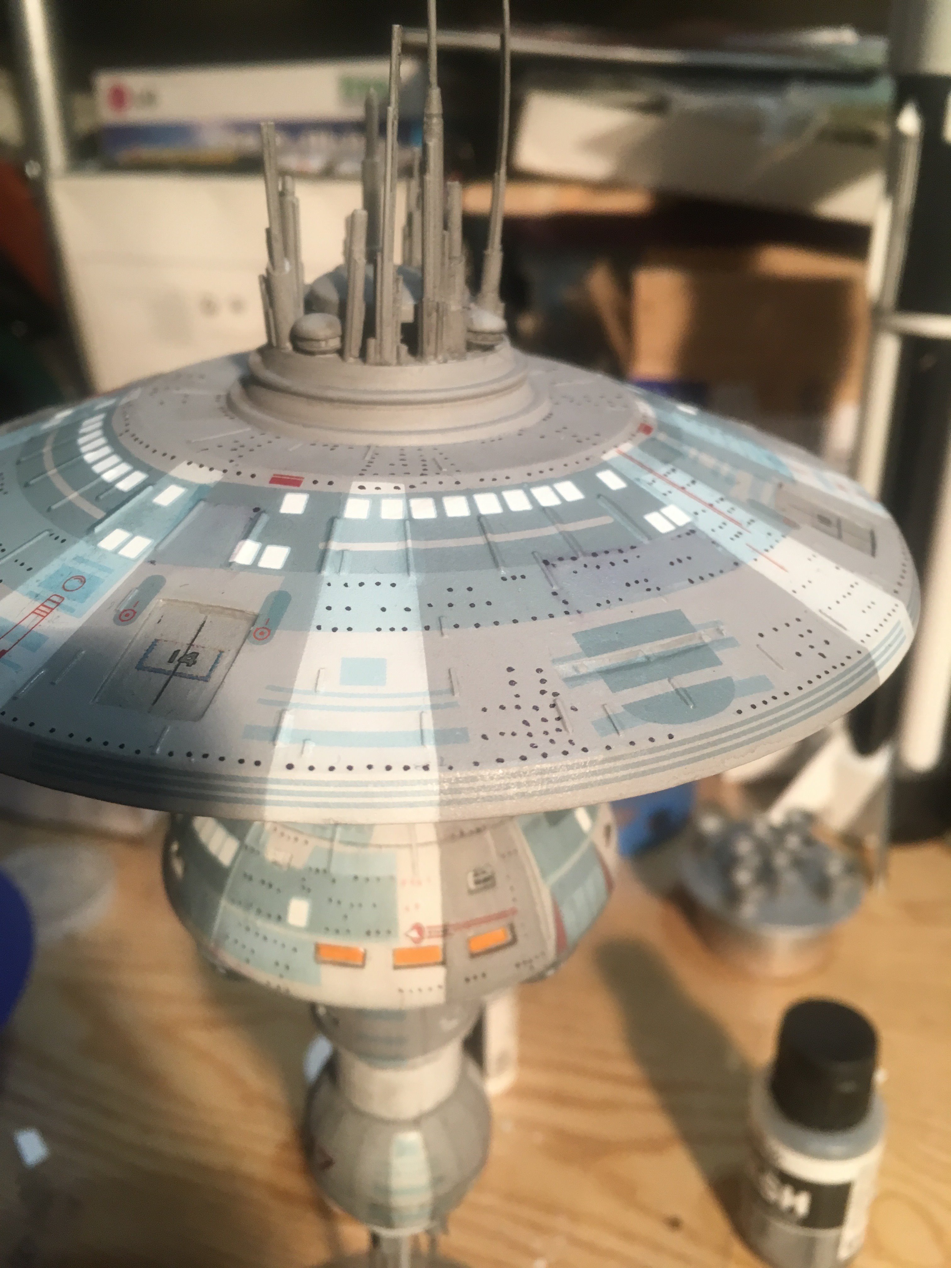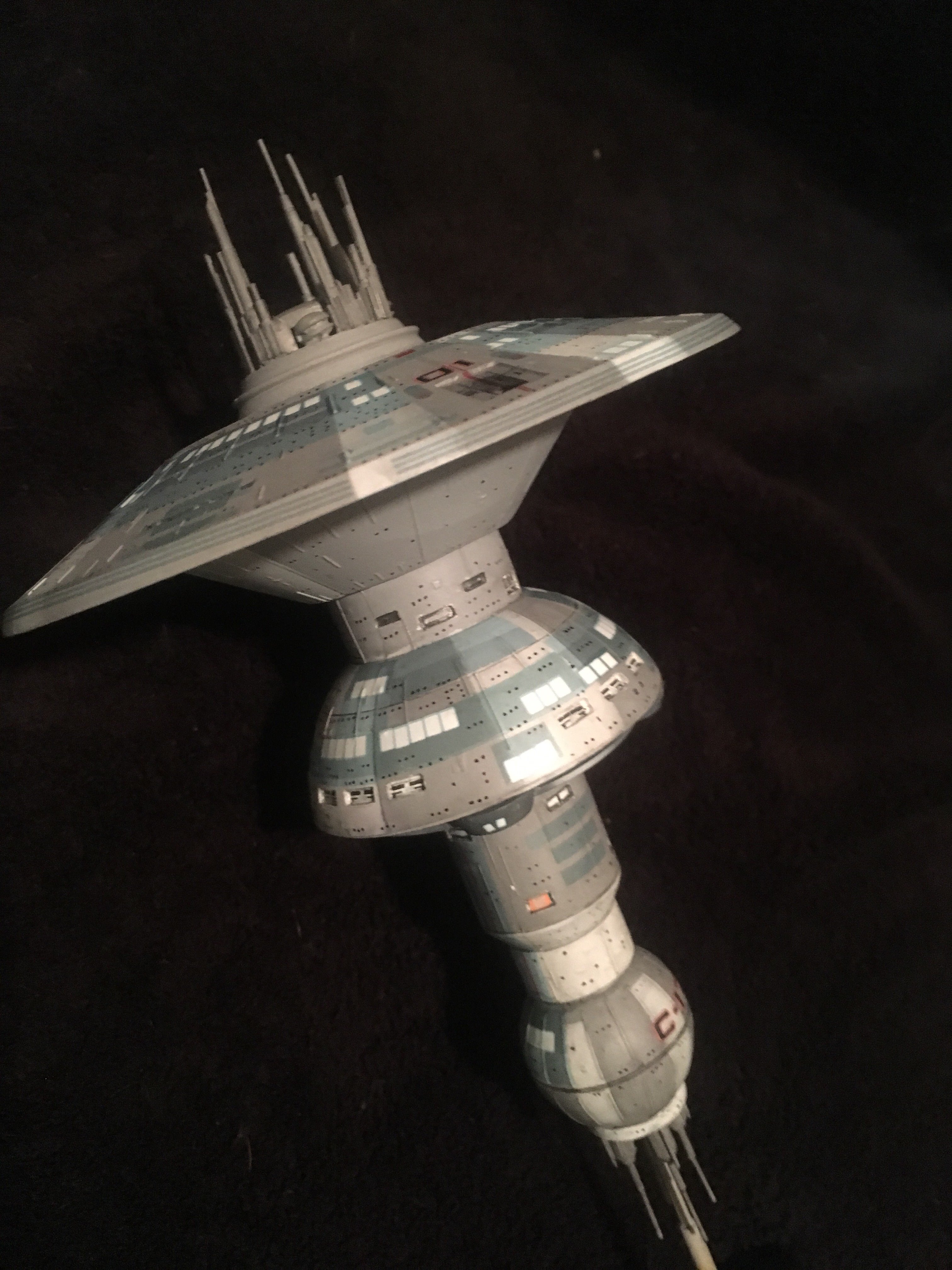 I finished another commission build for a client,.. the Starfleet Space Dock). He wanted a simple paint job, with the painted on black dots for the windows. The kit is from Federation Models, and is all resin. I added decals and shading. The decals are from the Enterprise 1701-C 1:1000 scale kit.