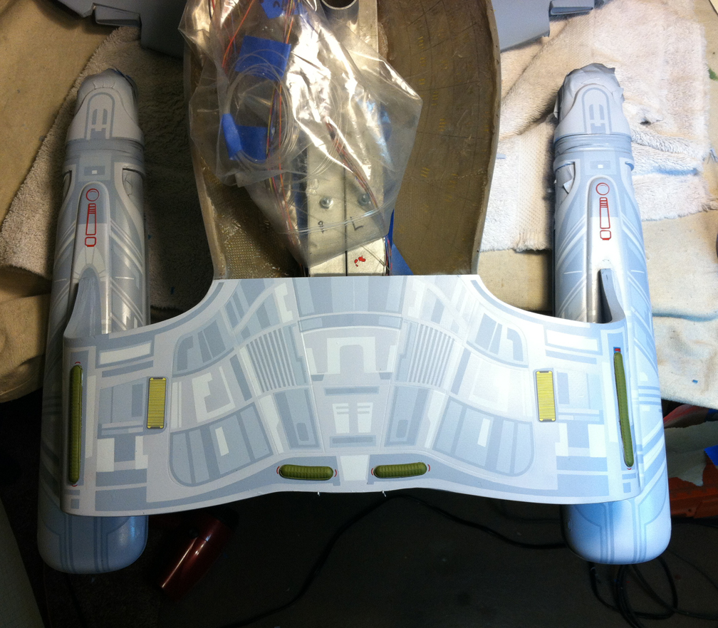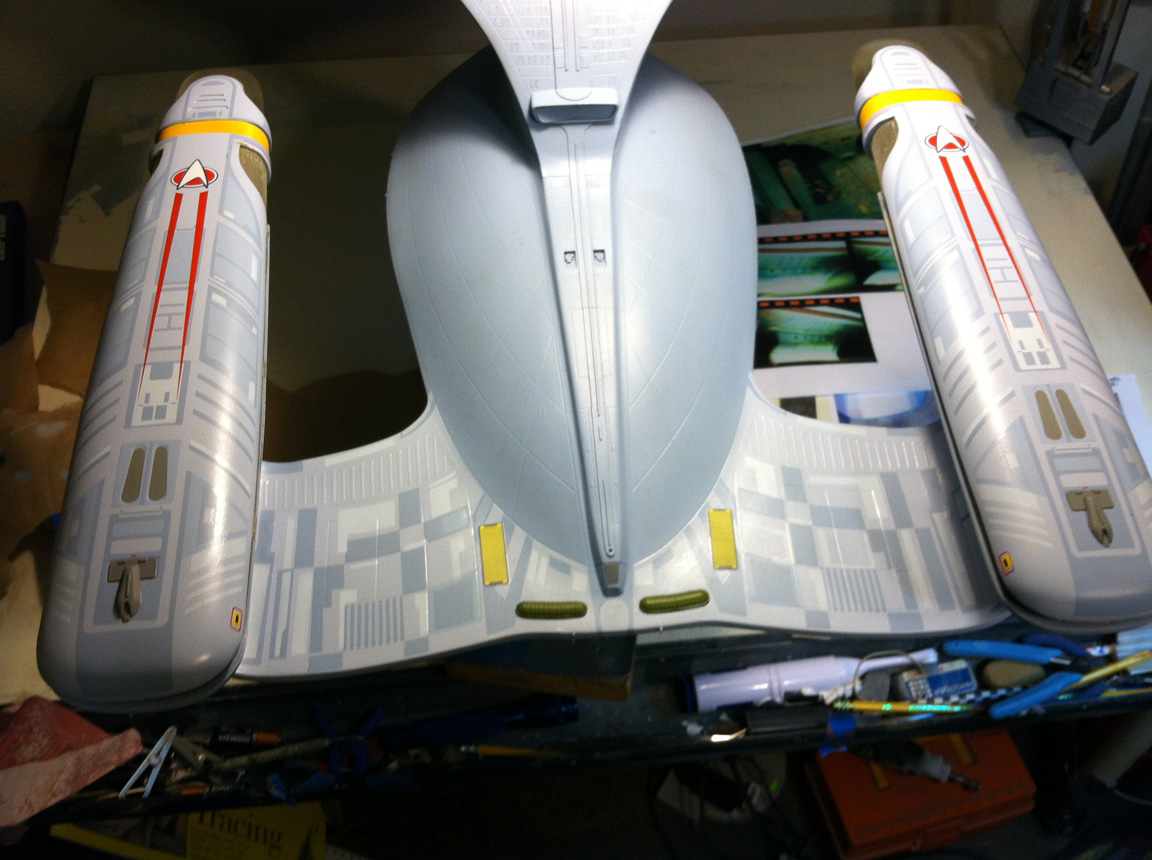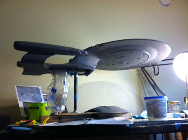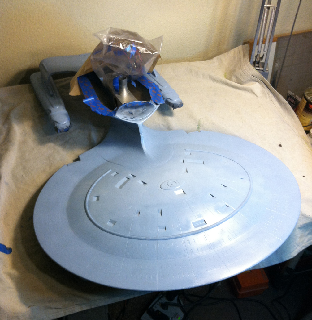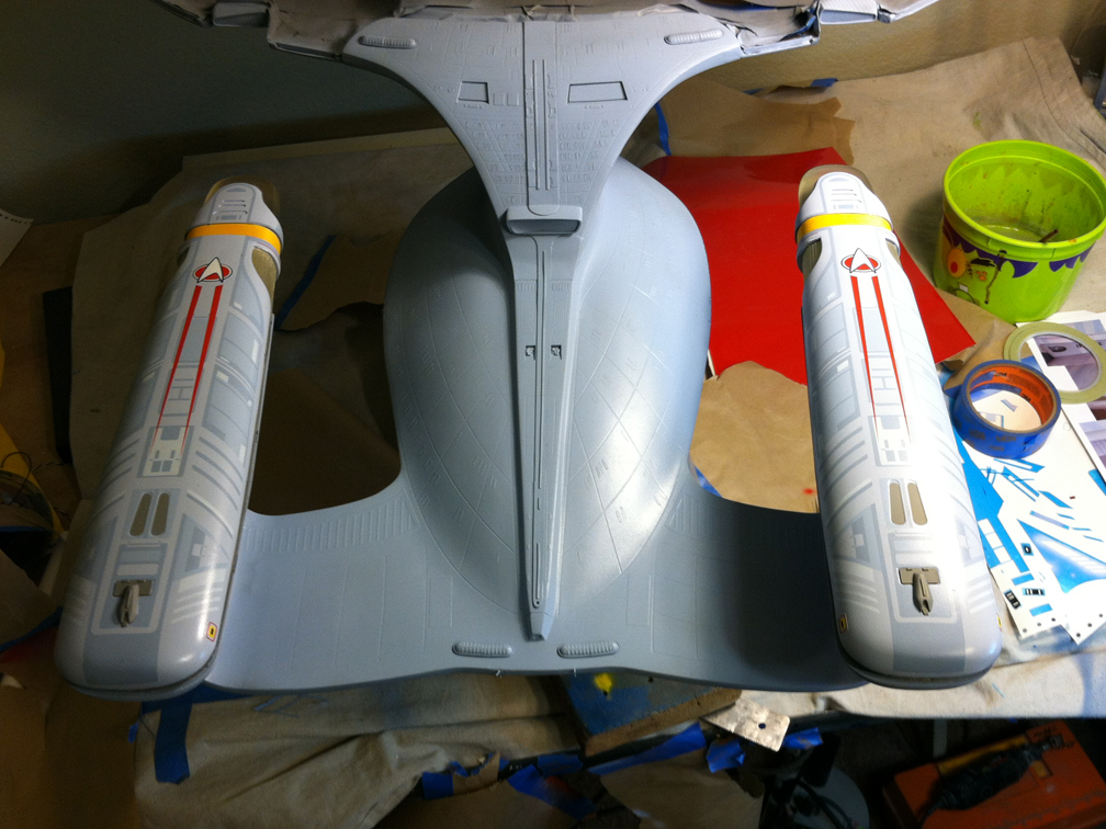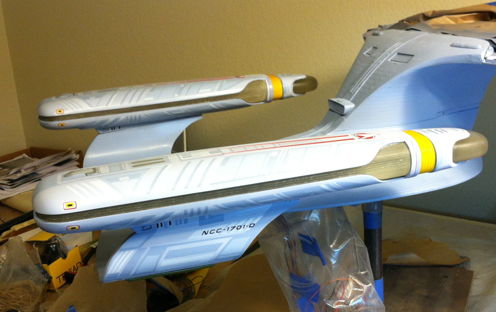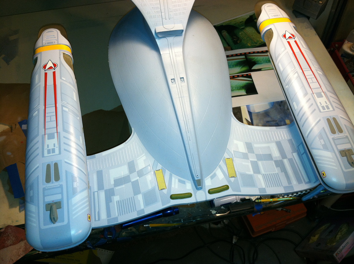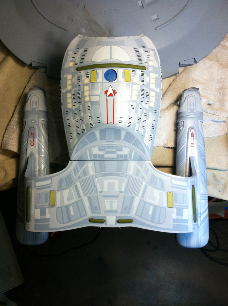 After a slight break from this project in order to finish the Studio Tydirum and Studio Defiant, Dan Grumeretz is back at the huge 1:650 Enterprise D build (which I was going to label as YAMATO, but decided that we would honor the Enterprise yet another time.). Having fit the entire project together, with the armature cut to fit precisely, some details refined to the GENERATIONS Film model, and the lighting ready to go, Dan has started bringing the piece together with the layers of paint needed on this piece. EVERYTHING you see in these photos is paint… Markings and all… NO DECALS!! The static copper nacelle effect is being tested as you can see in one shot. When the entire ridge section is completed…. it will be amazing looking! All in all, I am excited to report that this piece will be finished by mid January after years upon years of being placed on the back burner. With luck, Blue Screen photos will be coming by the end of January 2014. I am extremely excited about this project, can you tell?!! Dan is doing world class work!! Thank you Dan!