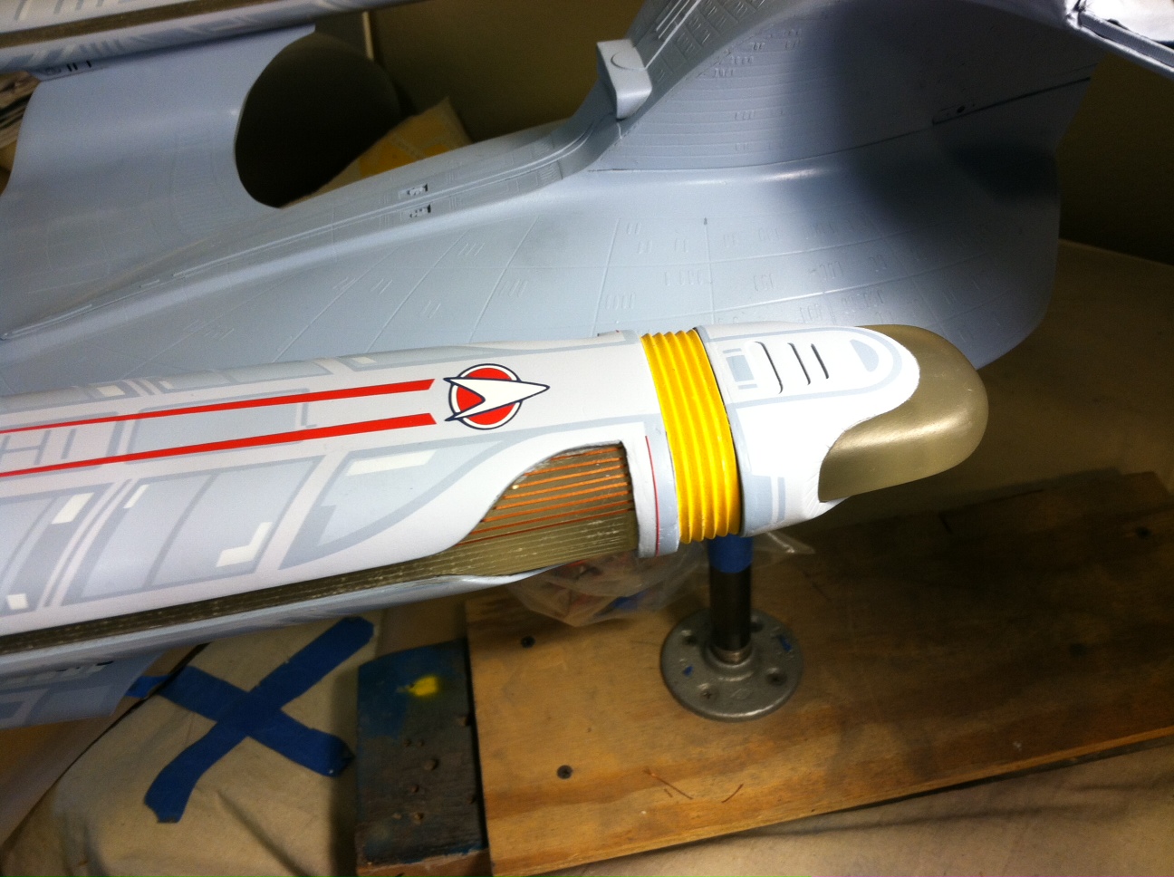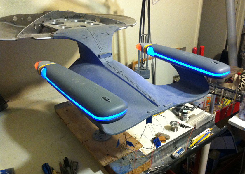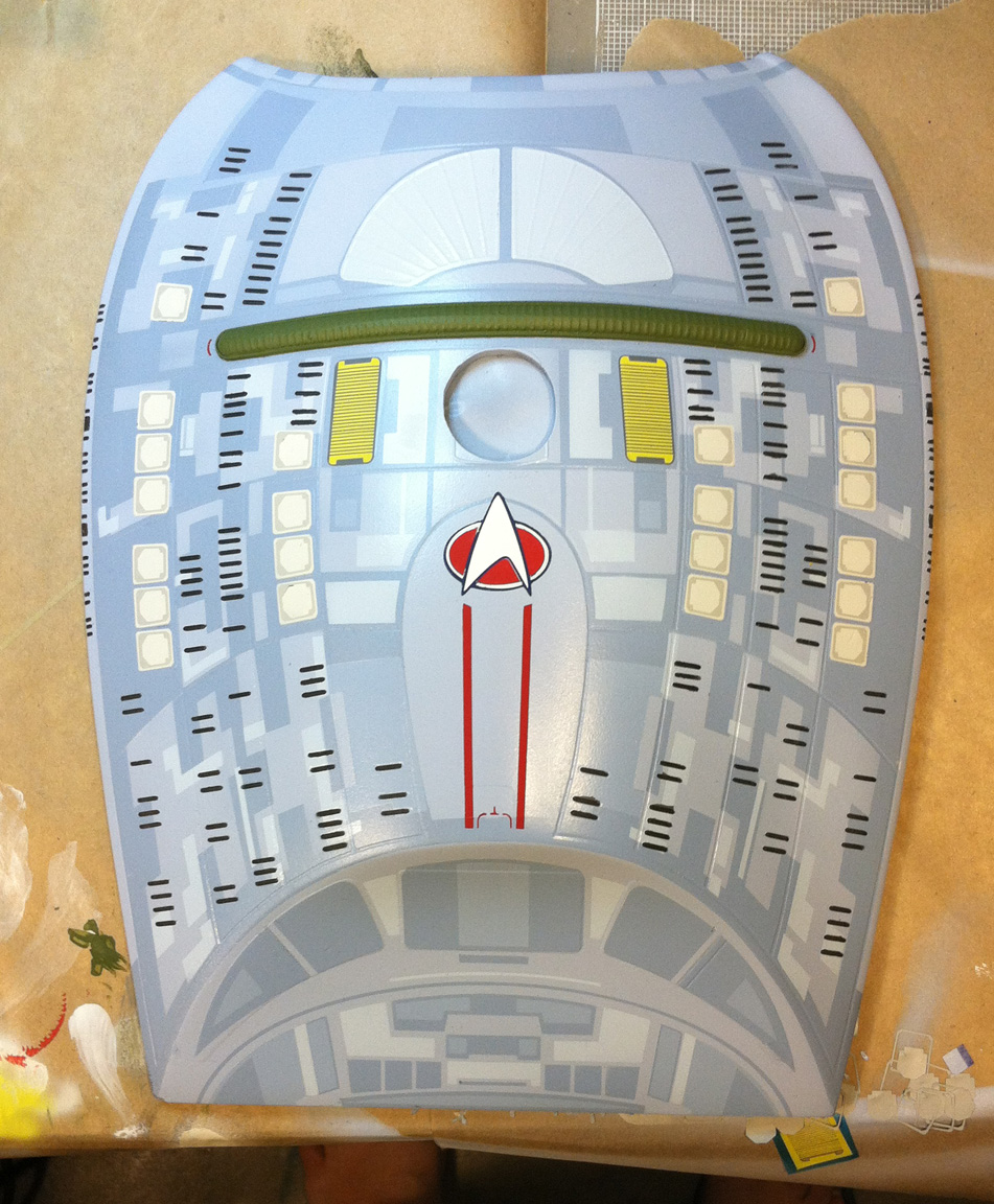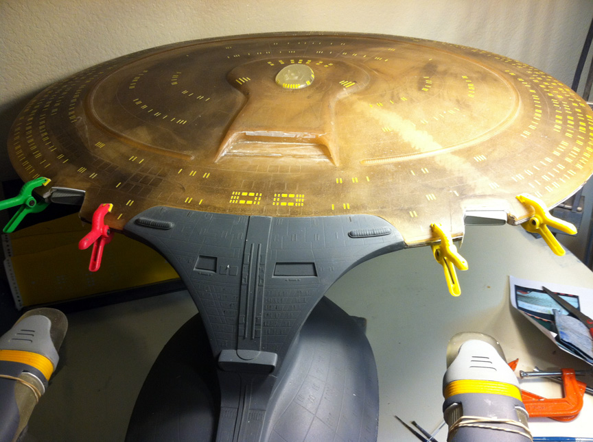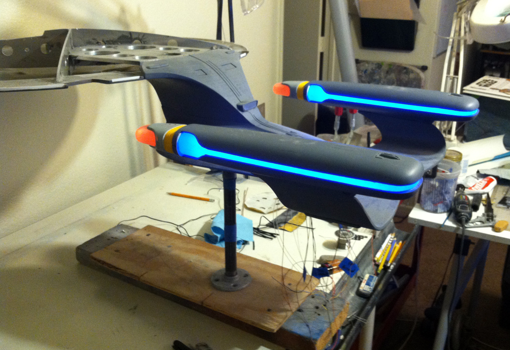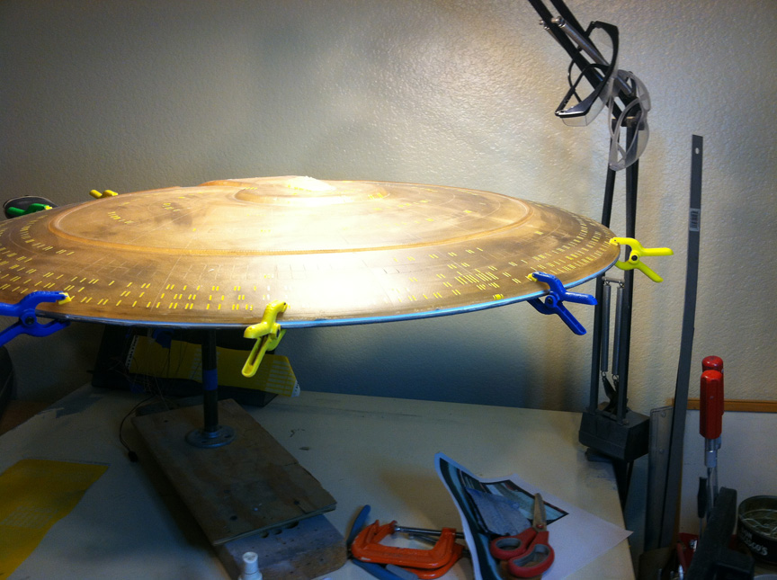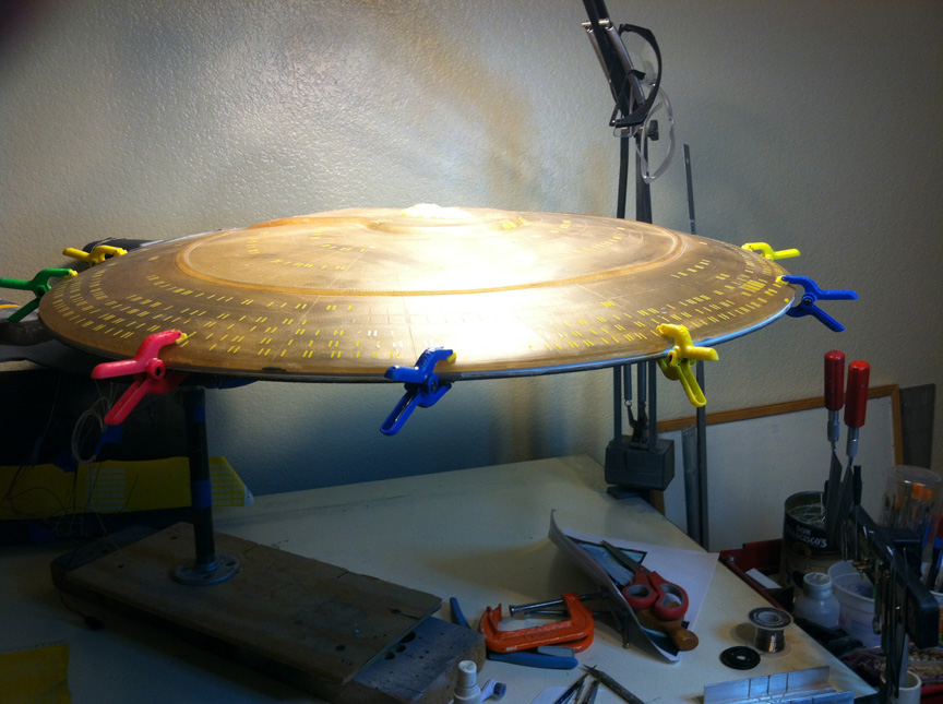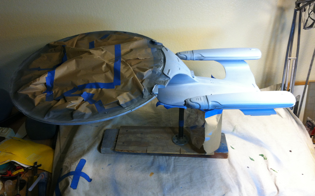 After a slight break from this project in order to finish the Studio Tydirum and Studio Defiant, Dan Grumeretz is back at the huge 1:650 Enterprise D build (which I was going to label as YAMATO, but decided that we would honor the Enterprise yet another time.). Having fit the entire project together, with the armature cut to fit precisely, some details refined to the GENERATIONS Film model, and the lighting ready to go, Dan has started bringing the piece together with the layers of paint needed on this piece. EVERYTHING you see in these photos is paint… Markings and all… NO DECALS!! The static copper nacelle effect is being tested as you can see in one shot. When the entire ridge section is completed…. it will be amazing looking! All in all, I am excited to report that this piece will be finished by mid January after years upon years of being placed on the back burner. With luck, Blue Screen photos will be coming by the end of January 2014. I am extremely excited about this project, can you tell?!! Dan is doing world class work!! Thank you Dan!