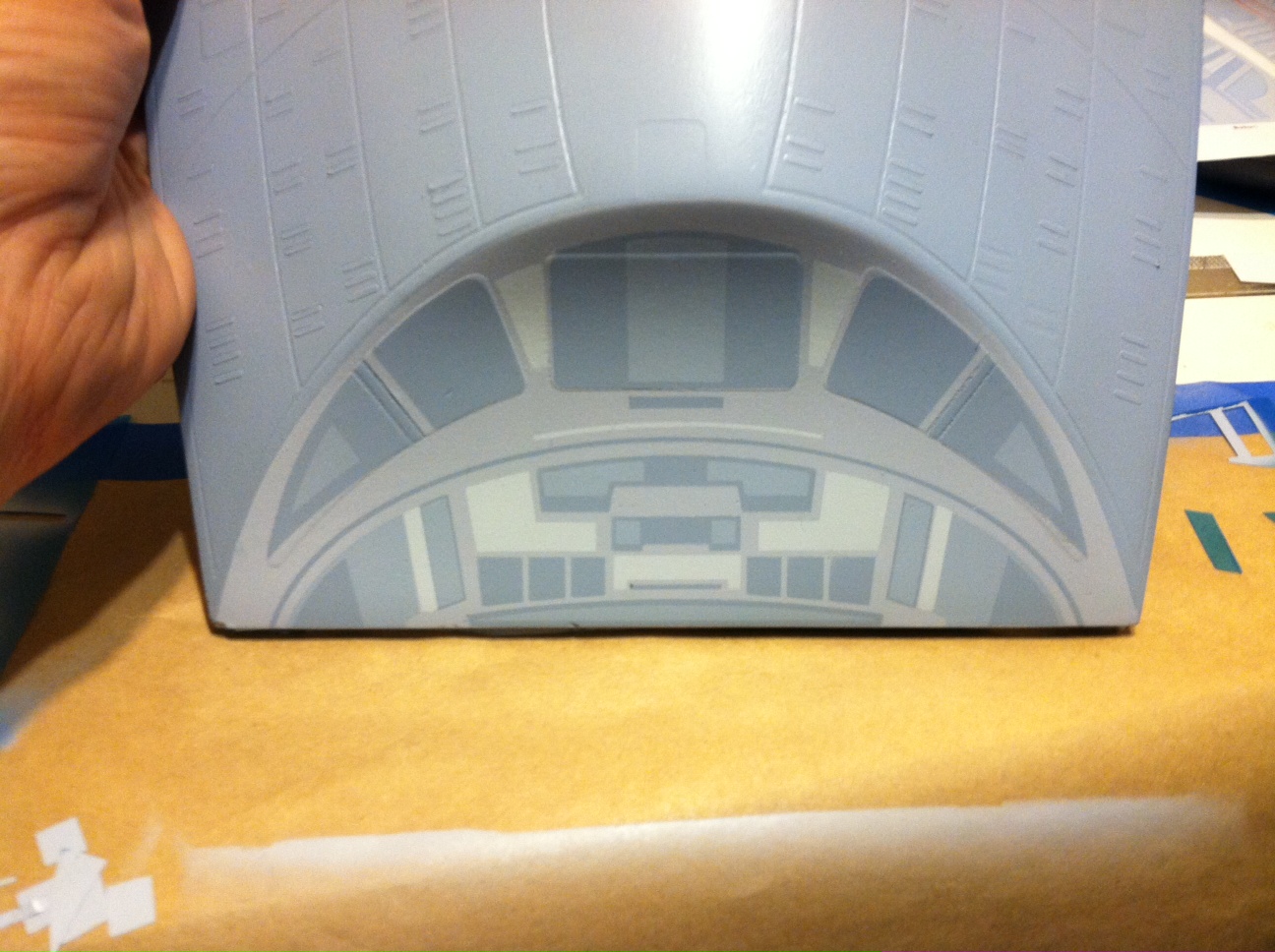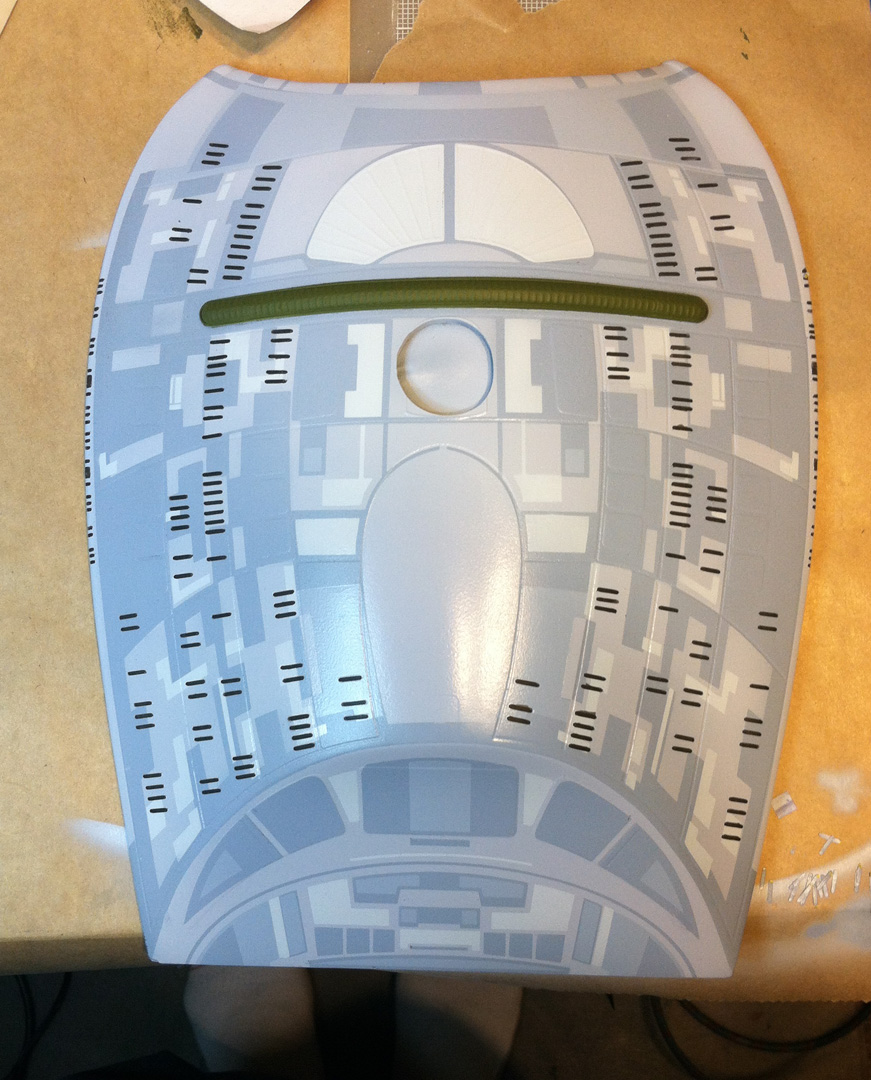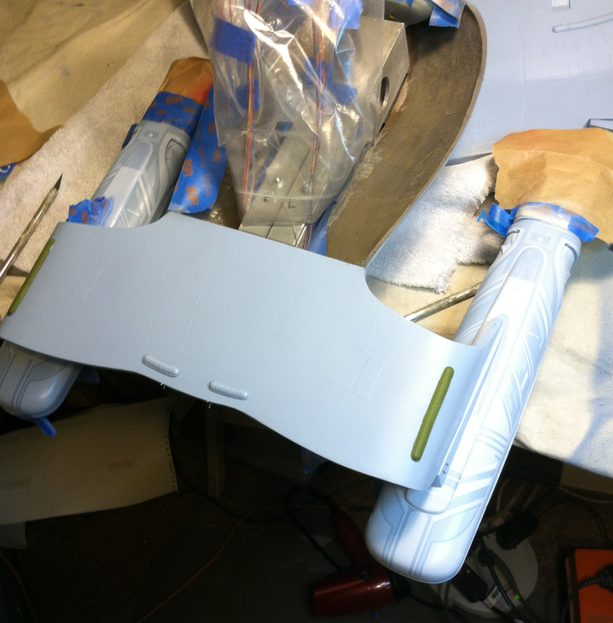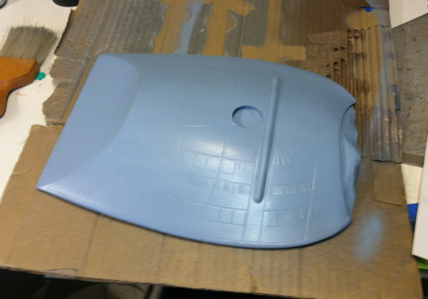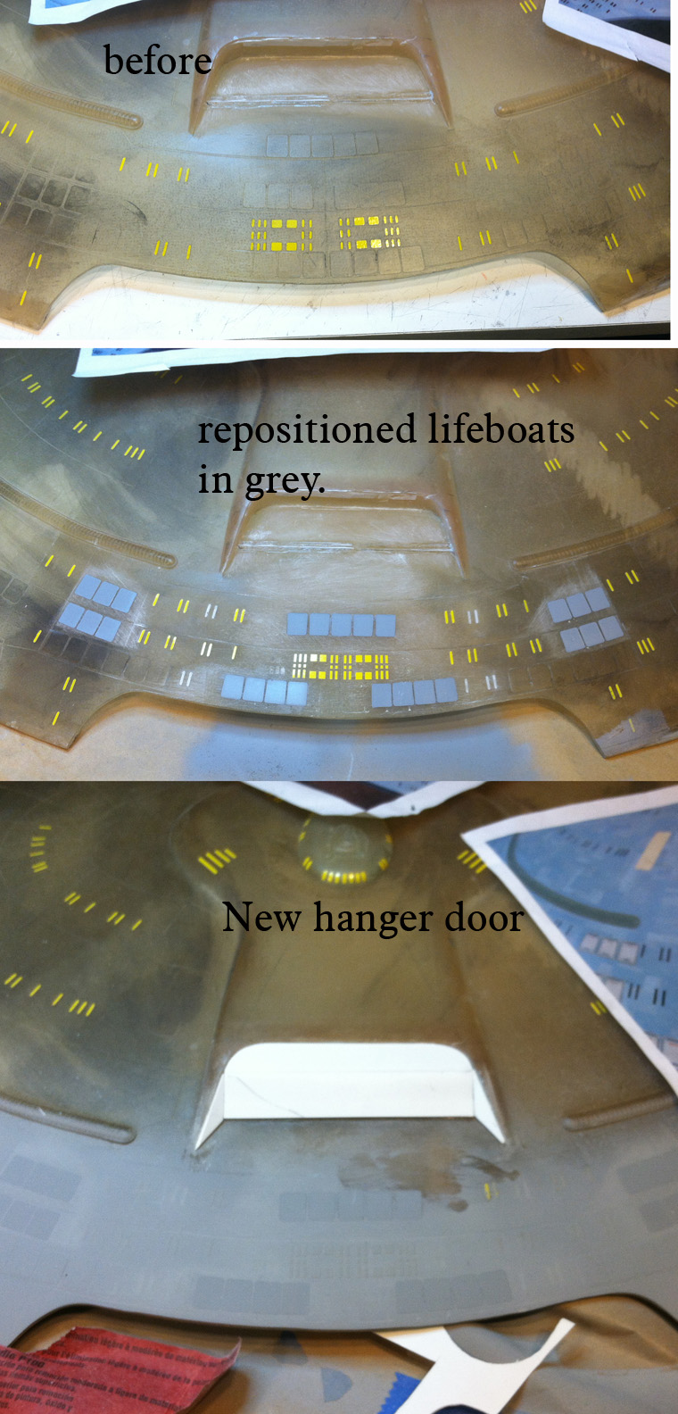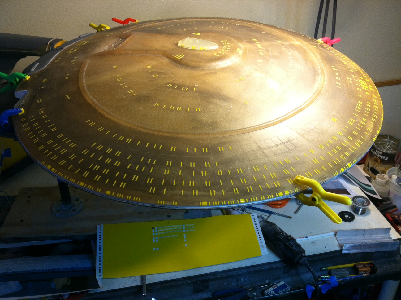 After a slight break from this project in order to finish the Studio Tydirum and Studio Defiant, Dan Grumeretz is back at the huge 1:650 Enterprise D build (which I was going to label as YAMATO, but decided that we would honor the Enterprise yet another time.). Having fit the entire project together, with the armature cut to fit precisely, some details refined to the GENERATIONS Film model, and the lighting ready to go, Dan has started bringing the piece together with the layers of paint needed on this piece. EVERYTHING you see in these photos is paint… Markings and all… NO DECALS!! The static copper nacelle effect is being tested as you can see in one shot. When the entire ridge section is completed…. it will be amazing looking! All in all, I am excited to report that this piece will be finished by mid January after years upon years of being placed on the back burner. With luck, Blue Screen photos will be coming by the end of January 2014. I am extremely excited about this project, can you tell?!! Dan is doing world class work!! Thank you Dan!