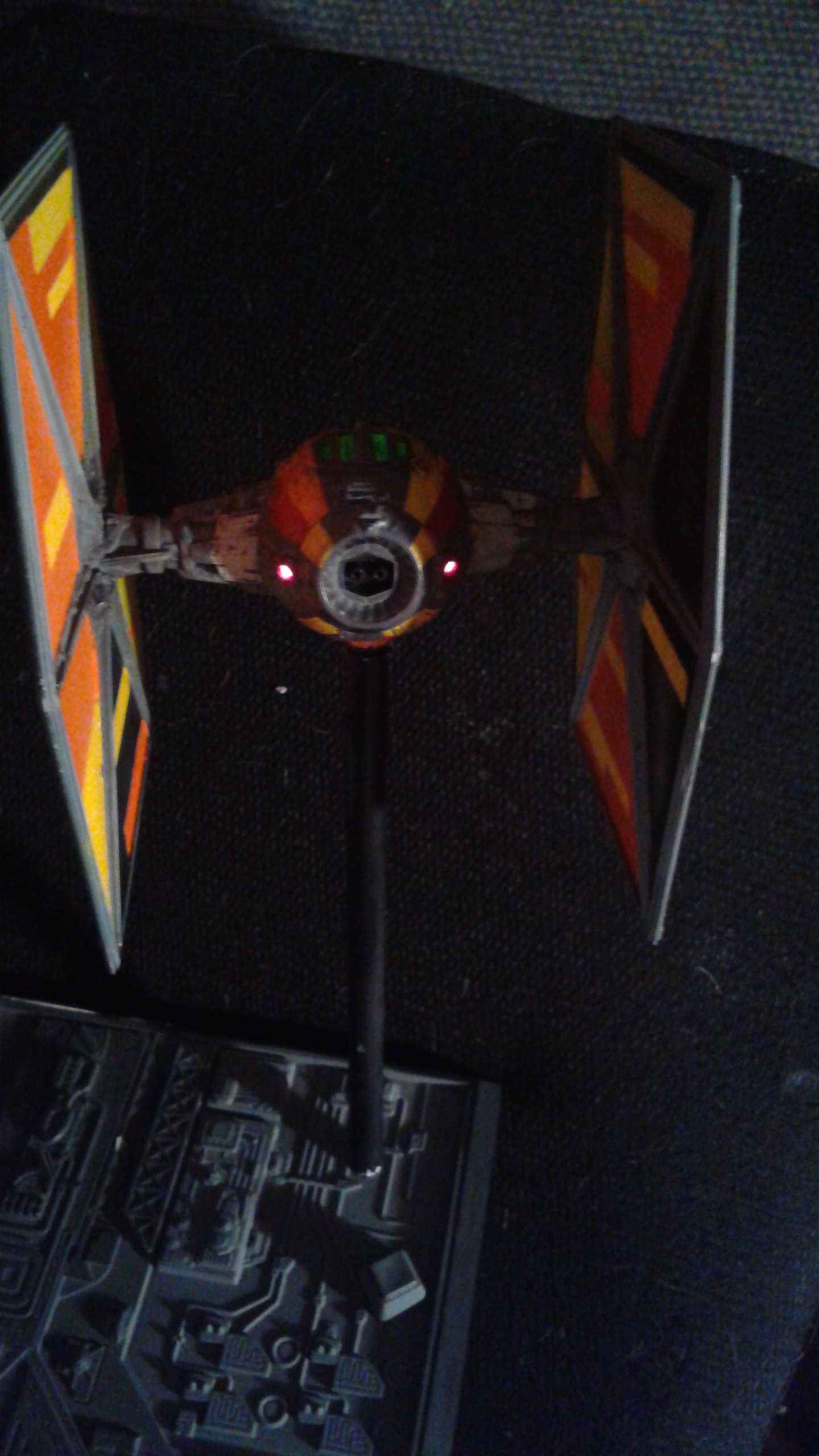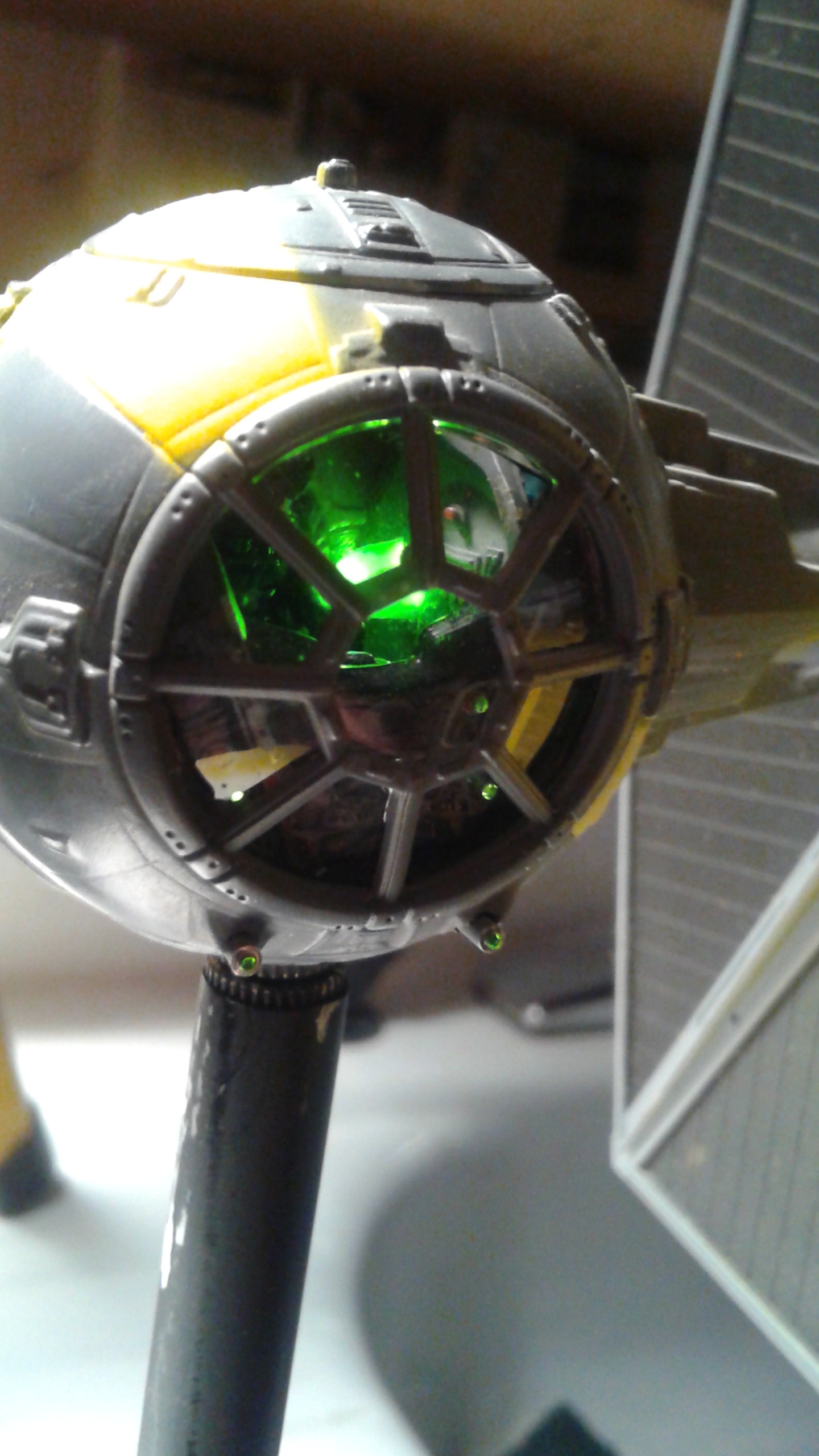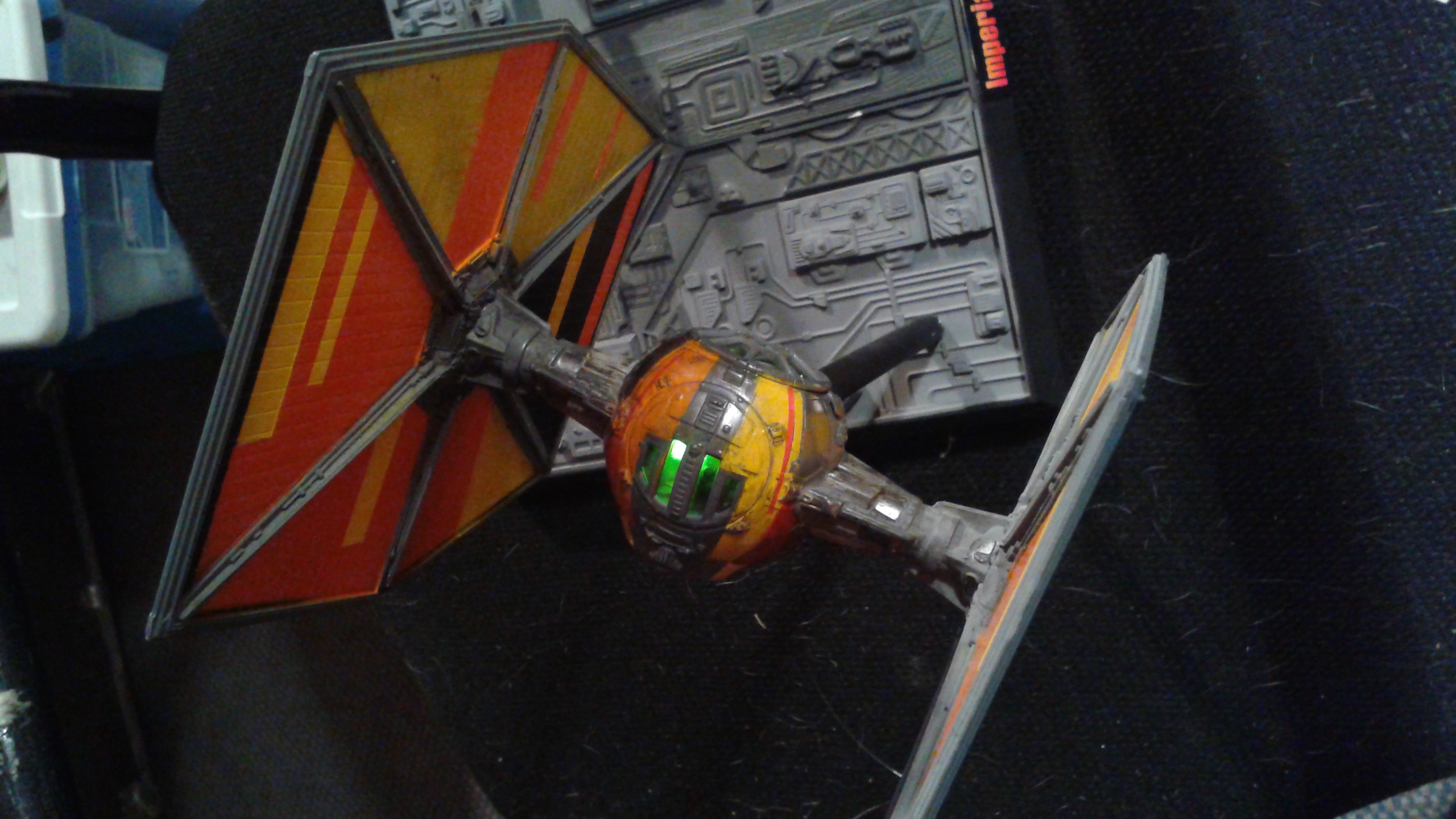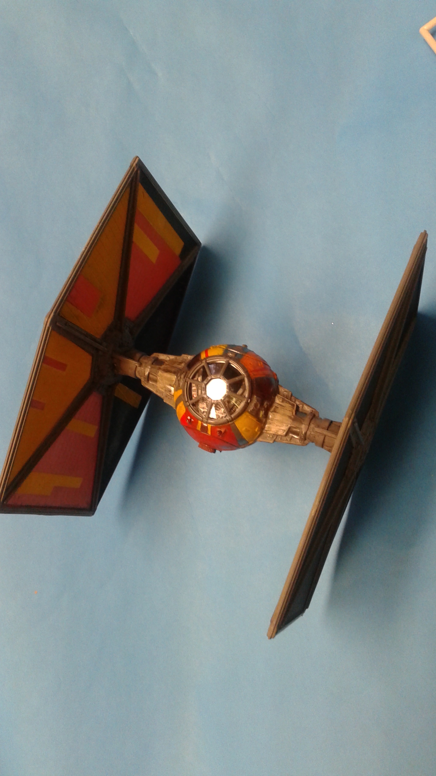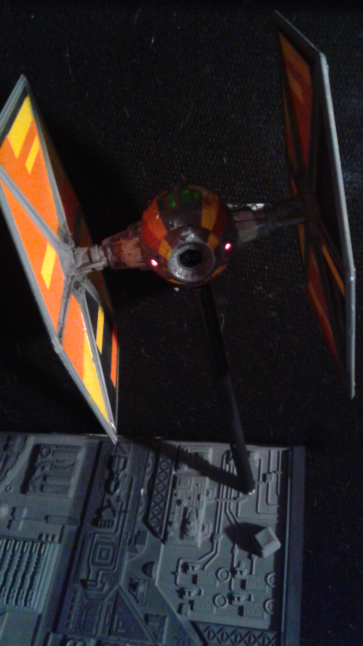 I built this “Rebel Republic TIE Fighter”, from the CGI STAR WARS “Star Wars REBELS” series. It’s not exactly like the stolen rogue fighter in the series, but close. I add weathering and change up the paint scheme a little to make it my own.The cockpit light up with a green LED and the Ion engines are red. Also the Ion Lazer canon’s are green. However if anyone is interested I would sell my Rebel I TIE fighter for $500.+SH $19.95 World wide call for price. Or I can customize one for you if you !