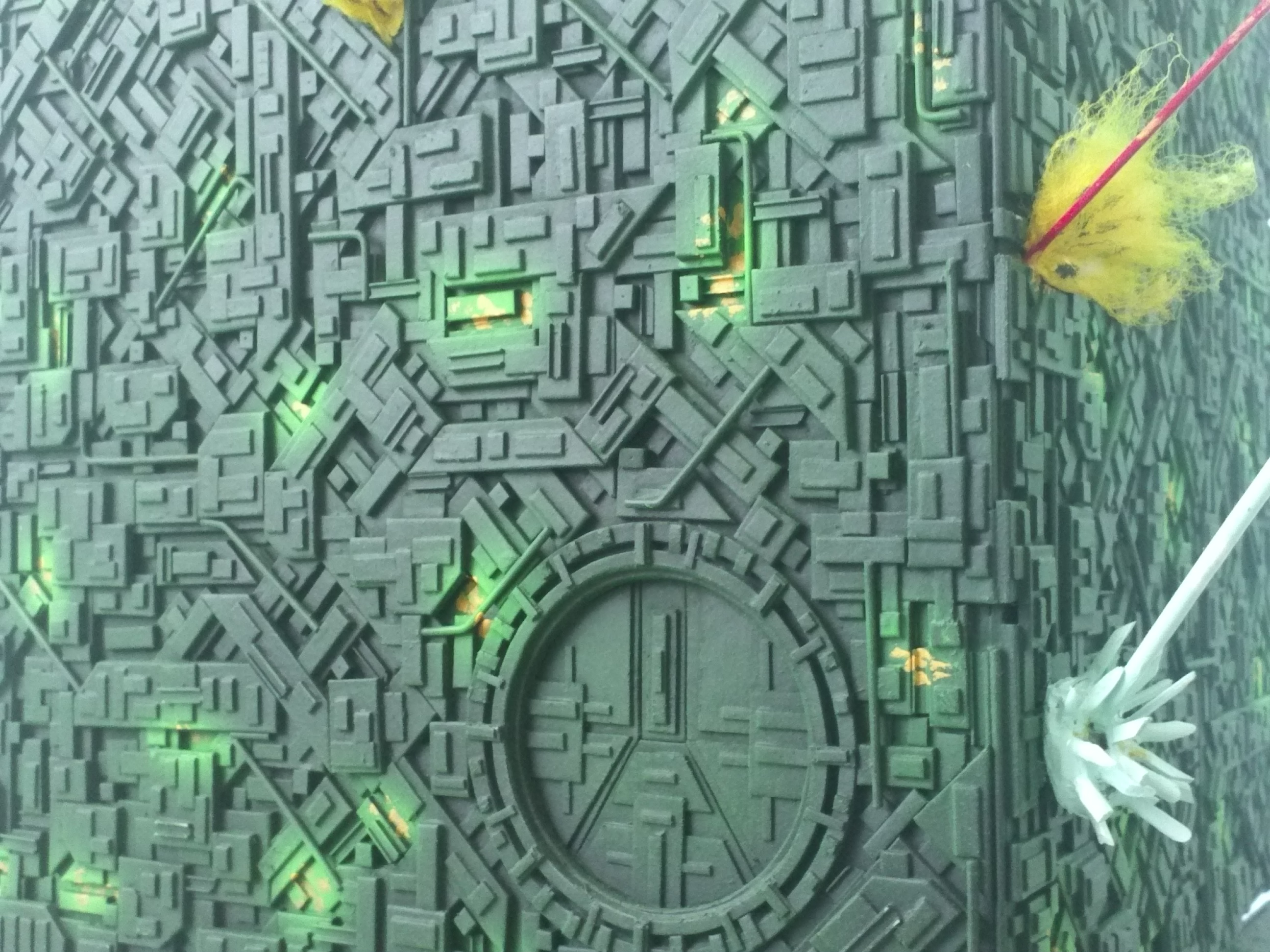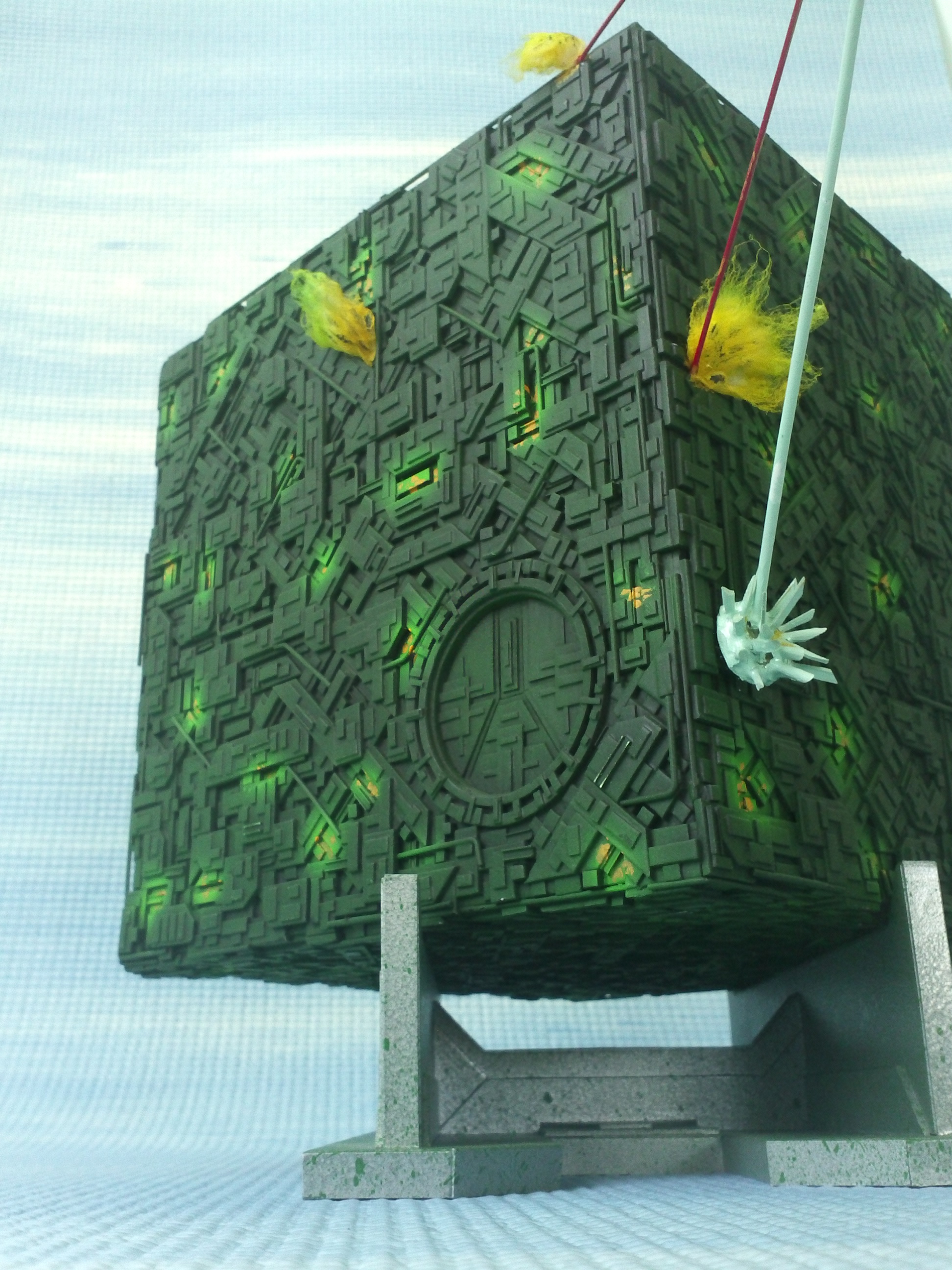 My Borg ship From 2008. There are plastic rods and little rubber magnets for details to the ship. the Borg cutting beam is wire hanger that is holding the little ship in place. the explosions are air brushed cotton balls.