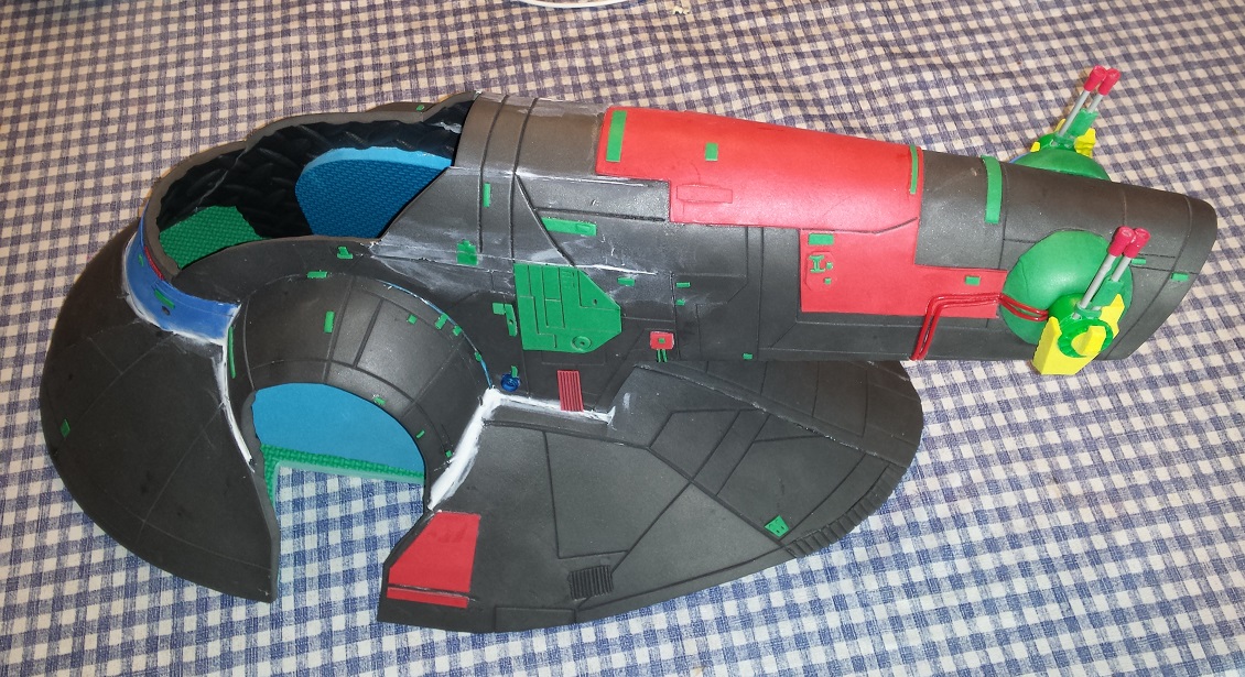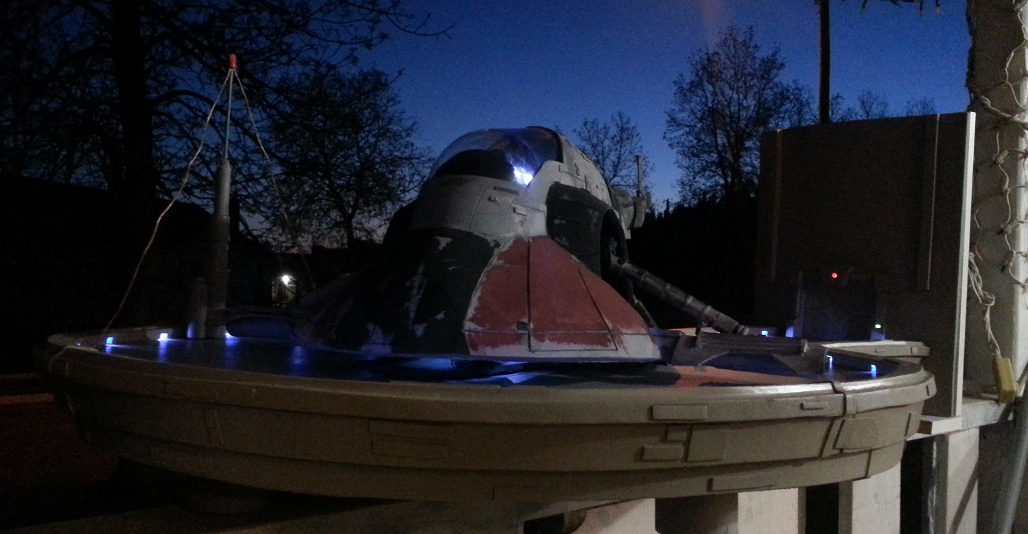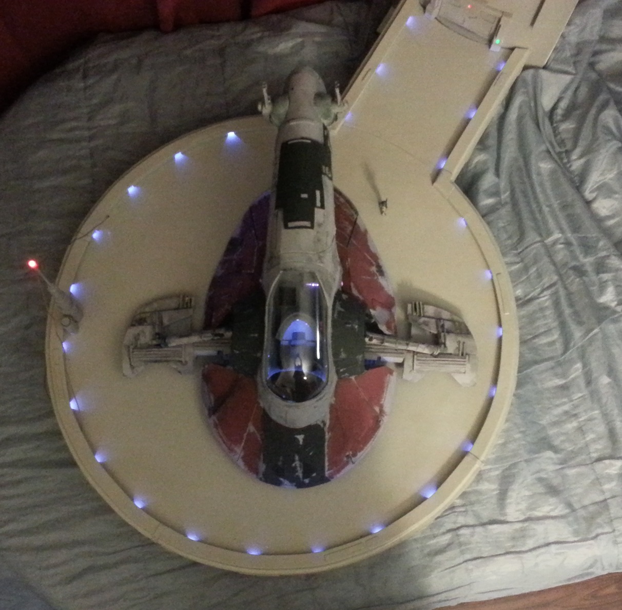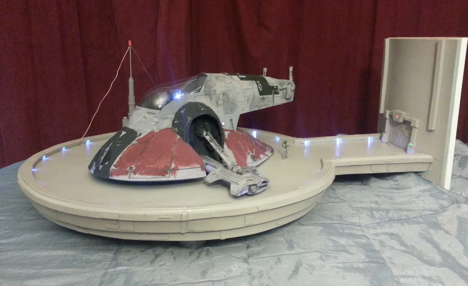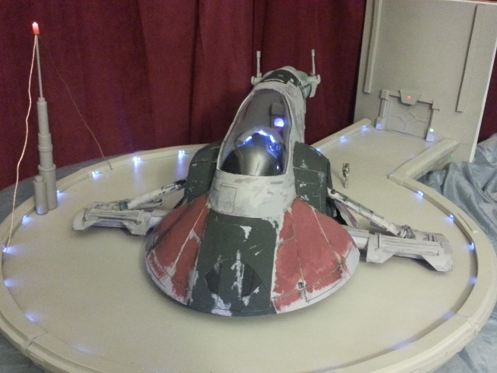 Slave-1 has always been a favorite of mine and I wanted to try my hand at building one from scratch. Having built several other models from EVA foam (plus it being about the only medium I can afford) I wanted to see if it were possible to do it justice. I made the pattern freehand by studying lots of pictures from the movies and also looking at other peoples builds both from kits and freehand. I like to keep the cost of my builds as low as possible (so does my wife!). So I always try and use things I have laying around the house. The main body of the build is as I said foam, but I had to get inventive with some pieces. My main go to for other parts on my builds are always knitting needles and wood dowel, superglue lids, empty till/cash/debit receipt rolls both plastic and cardboard, and electrical connectors. I also used some rivets for this build, I filled them done and used them as hydraulic parts on the wings of Slave-1. The one real tricky part was making the canopy, I tried making it out of foam and it looked ok but it didn’t look great. I have no way of vacuum forming anything so I hunted around trying to find a clear plastic bottle with just the right curve. I was able to find a no name brand of pop/soda that was pretty close. I used a no name brand because most main brand pop/soda bottles have a ridge on them that was in the way. I also struggled with the positioning of the cockpit as I know lots of people do. So I used a little bit of artistic license with that. I was going to attempt the full underneath i.e the engines and stuff but I thought it would be cool to do a complete diorama so I set about making the landing platform. It is not suppose to be Bespin or Kamino it is a combination of the two and again some artistic licensing. The platform is again mostly EVA foam tiles the supports underneath are large till/debit receipt plastic rolls. I did have to make the supports for the wall out of wood simply because the foam would not hold its shape and started to bend. But all in all this build is 98% foam. I use Krylon spray paints and acrylic craft paints to paint all my builds. The Boba Fett figure is a mini figure that came free with the Saga line of Star Wars figures they came in blue and red and were like little hologram figures. I just painted it up.