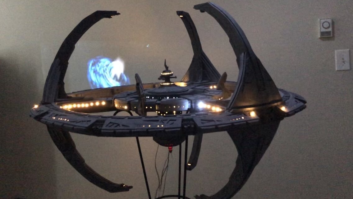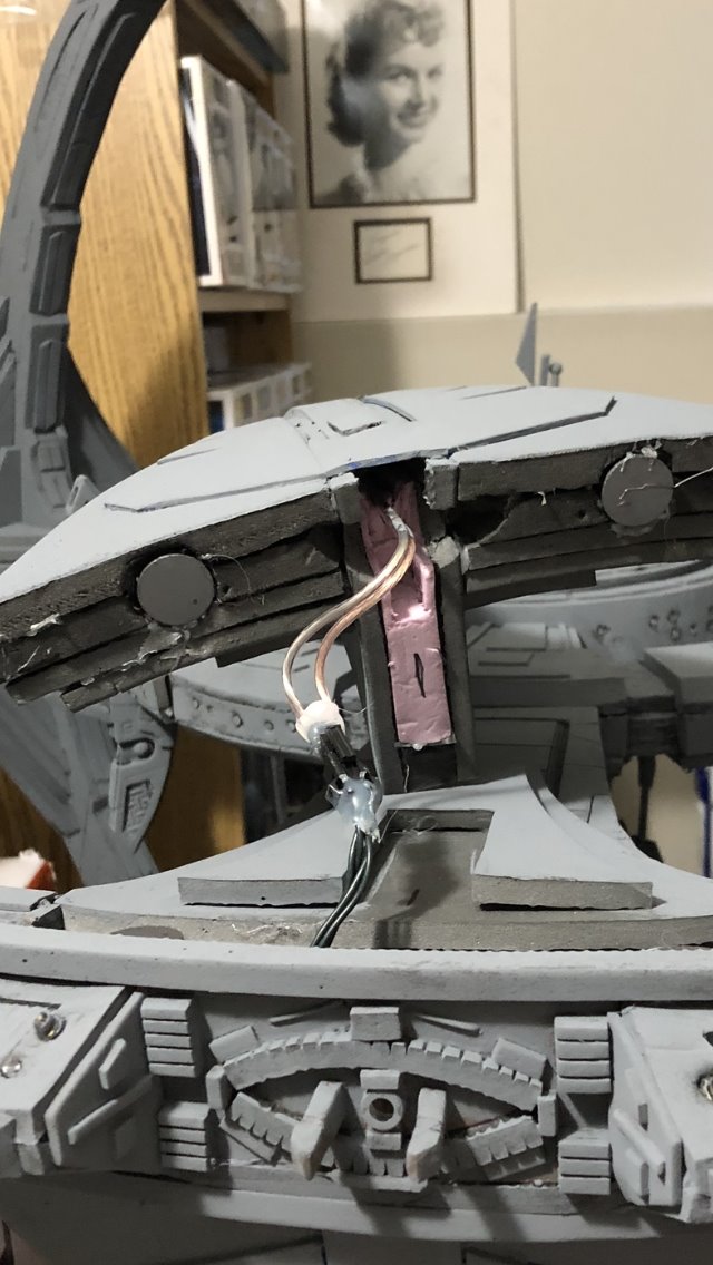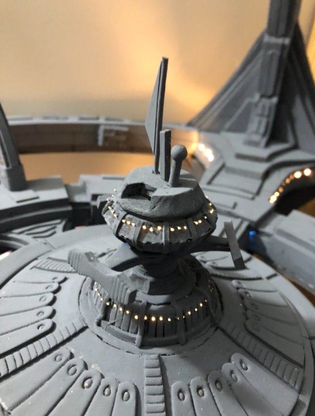 For the display stand we were lucky enough to find on one of our many thrift store hunts, a three legged flower pot stand. That when turned upside down works pretty well to display the station on. We also bought a cheap $40 projector and edited a video of the Wormhole opening and closing and use this as part of our display. As always we try and keep the costs of our builds to less than $200 CDN. For the small details we use anything and everything. Paper clips, toothpics, small scraps of plastic, you name it. Sometimes we even just use the reverse side of the EVA foam that has a detail on it.