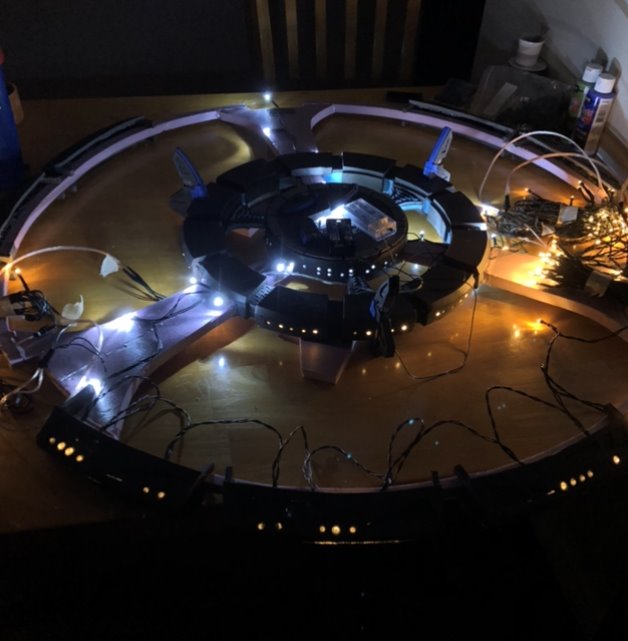We have built various Star Wars and Star Gate replicas and thought it time we did a Star Trek build. As more and more people are building with EVA foam, we try and pic projects that will stand out among the crowd. That is why we chose to do DS9. This build proved a little harder at first then we had planned. Mainly because as we were building we kept deciding to add more detail, more LED’S, this in-turn added more weight to the outer rings meaning we needed more than just the light pink foam insulation that we were using as an inner structure. So we had to pull some sections apart and work a wooden frame inside.