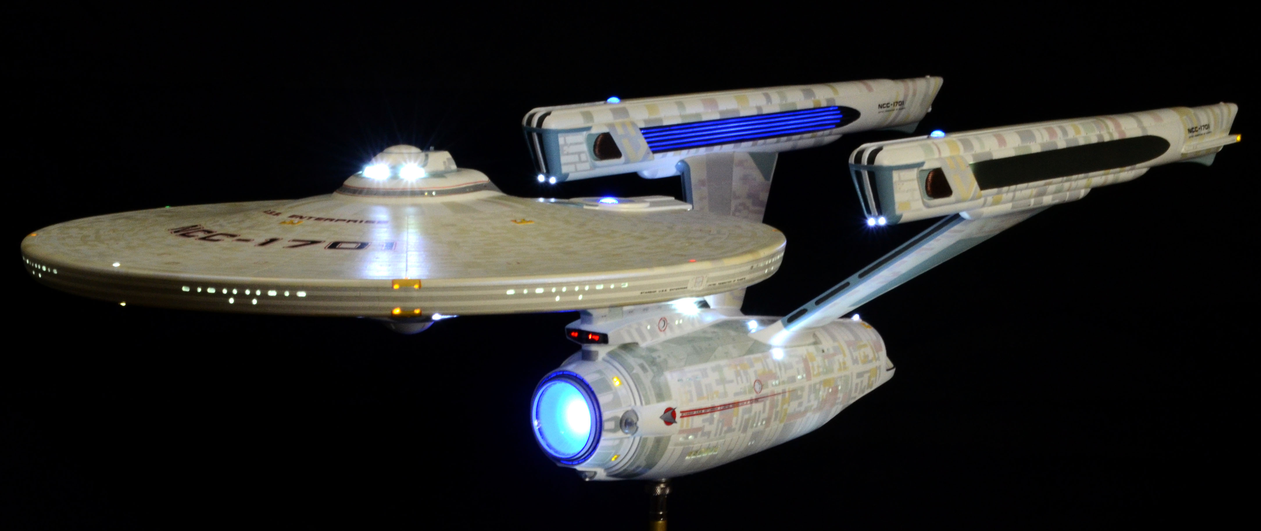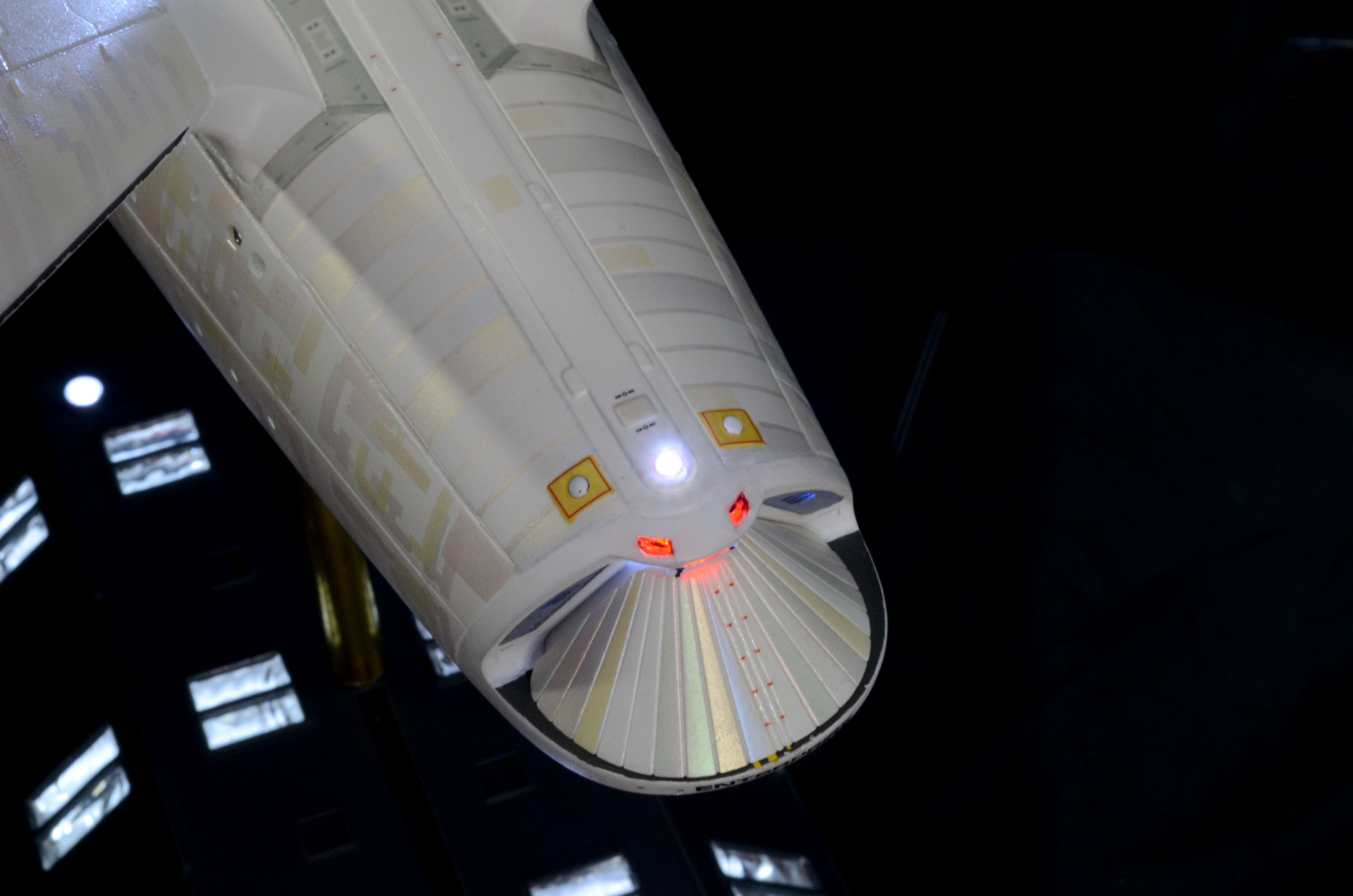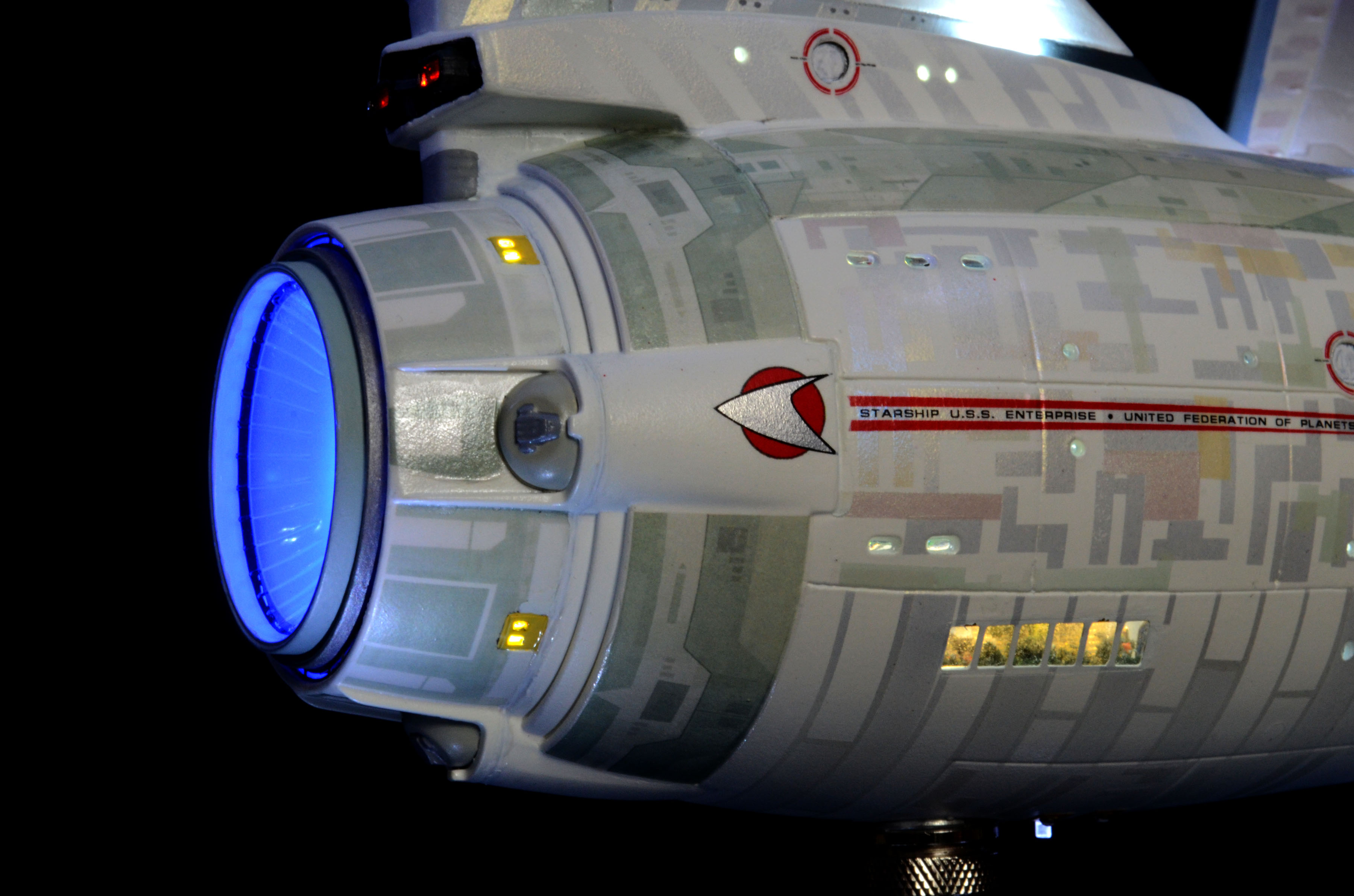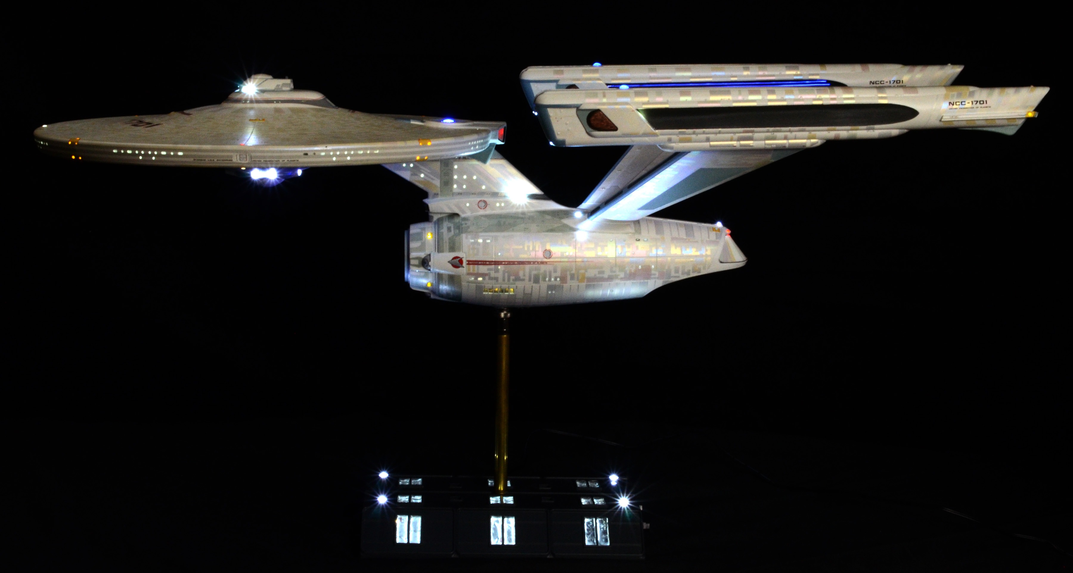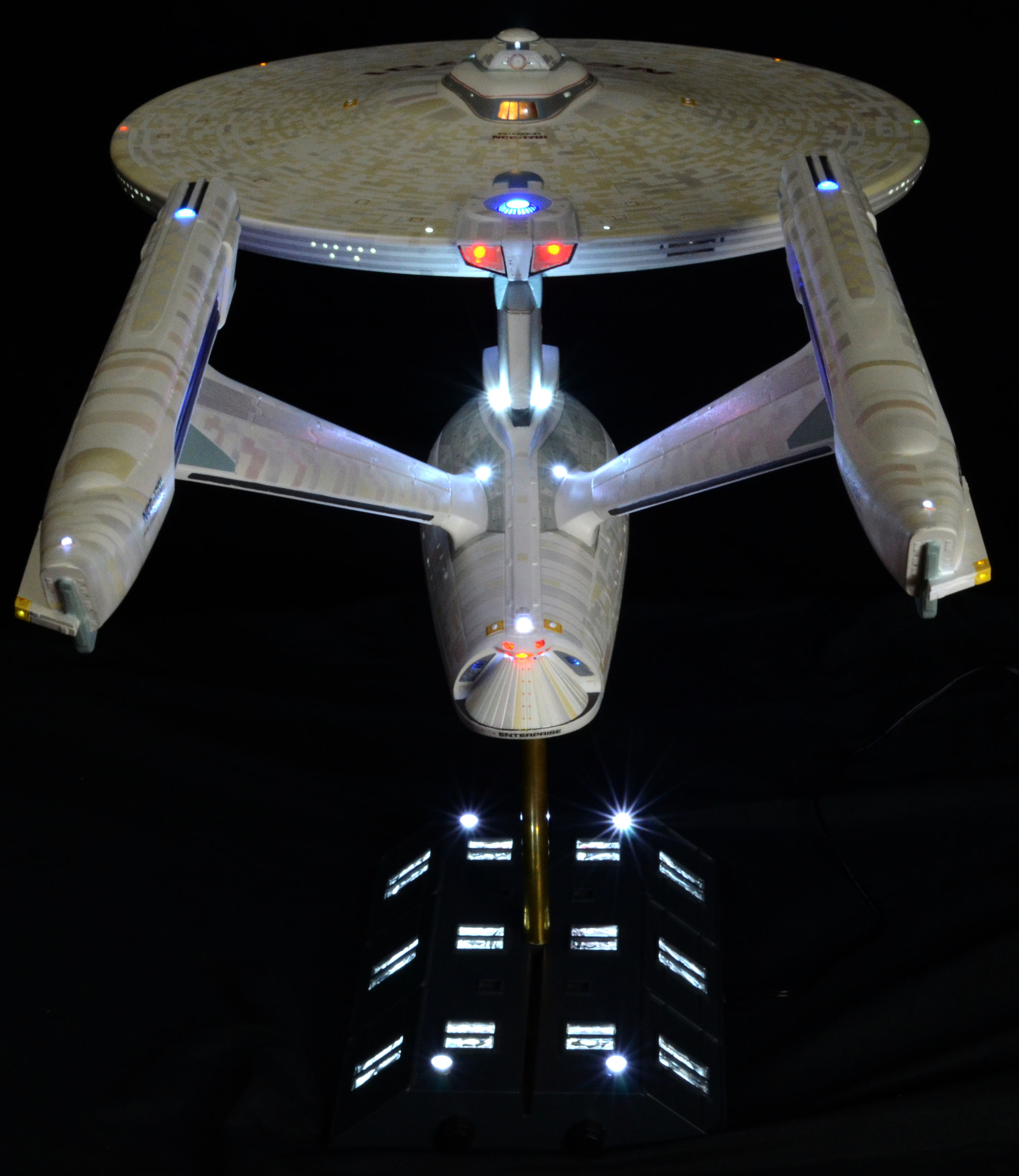 All lighting is LED, including all lights and spotlights on the base. The lighting is powered by one new variable voltage power adapter. There are two on/off switches on the right side of the base. One switch controls all of the lighting on the ship and the other controls the lighting on the base. You can have either set of lights on or off at any time. Navigation and strobe lights blink – please see the video for lighting display and timing. Impulse engines glow flickering red. The ship is not permanently mounted to the base. It is secured to the base by a screw-down connector but can be removed or rotated in any direction for display.