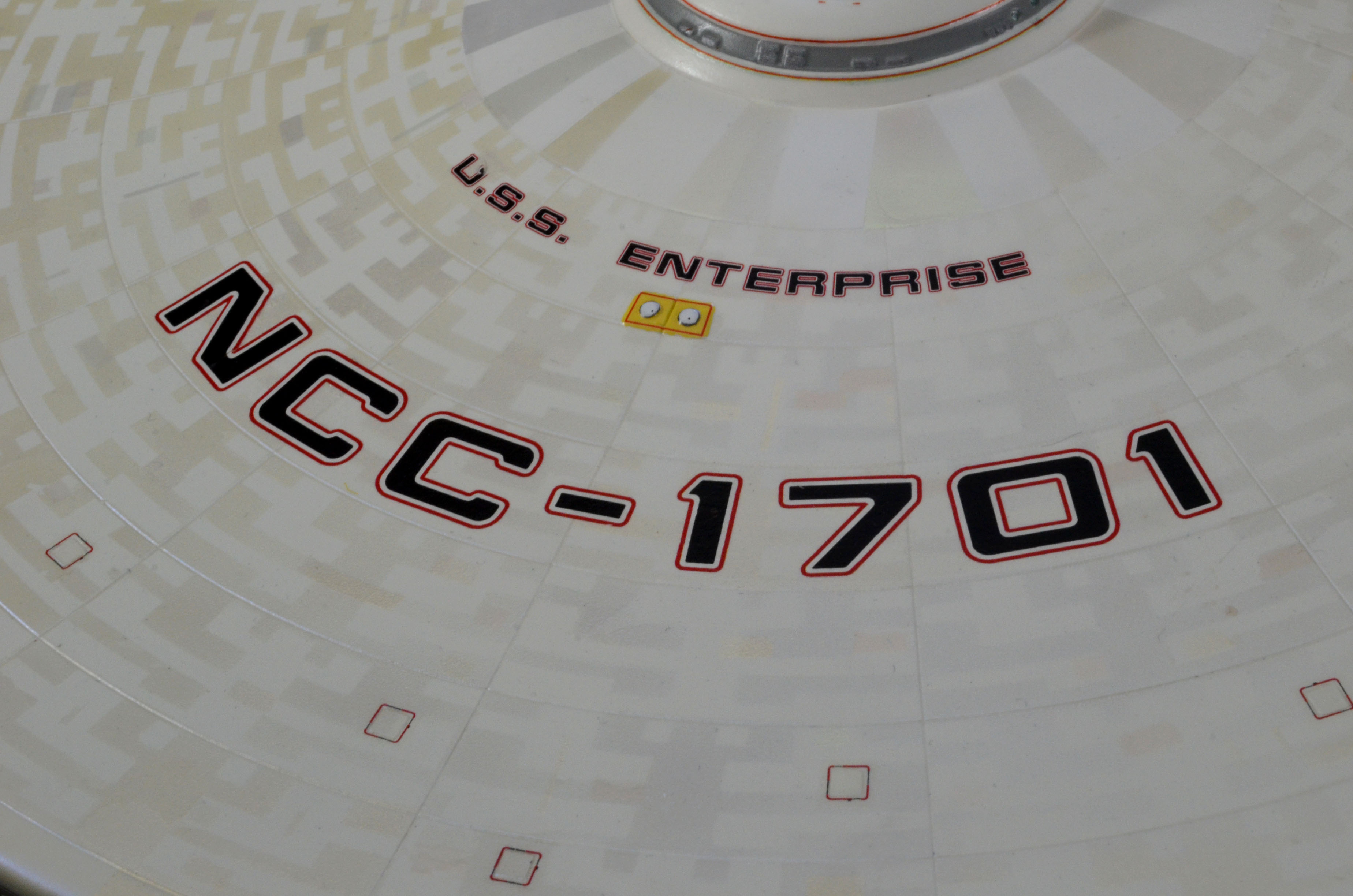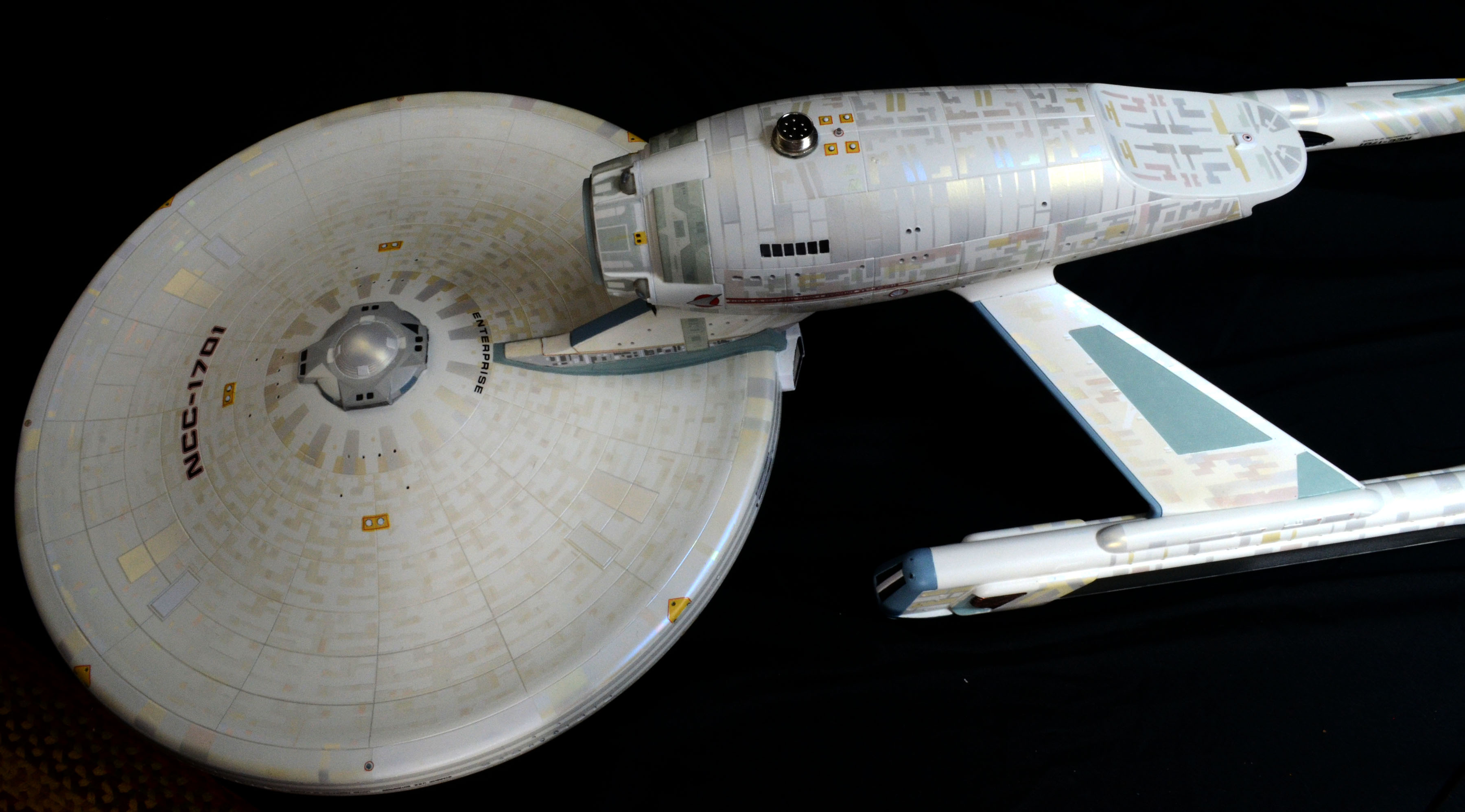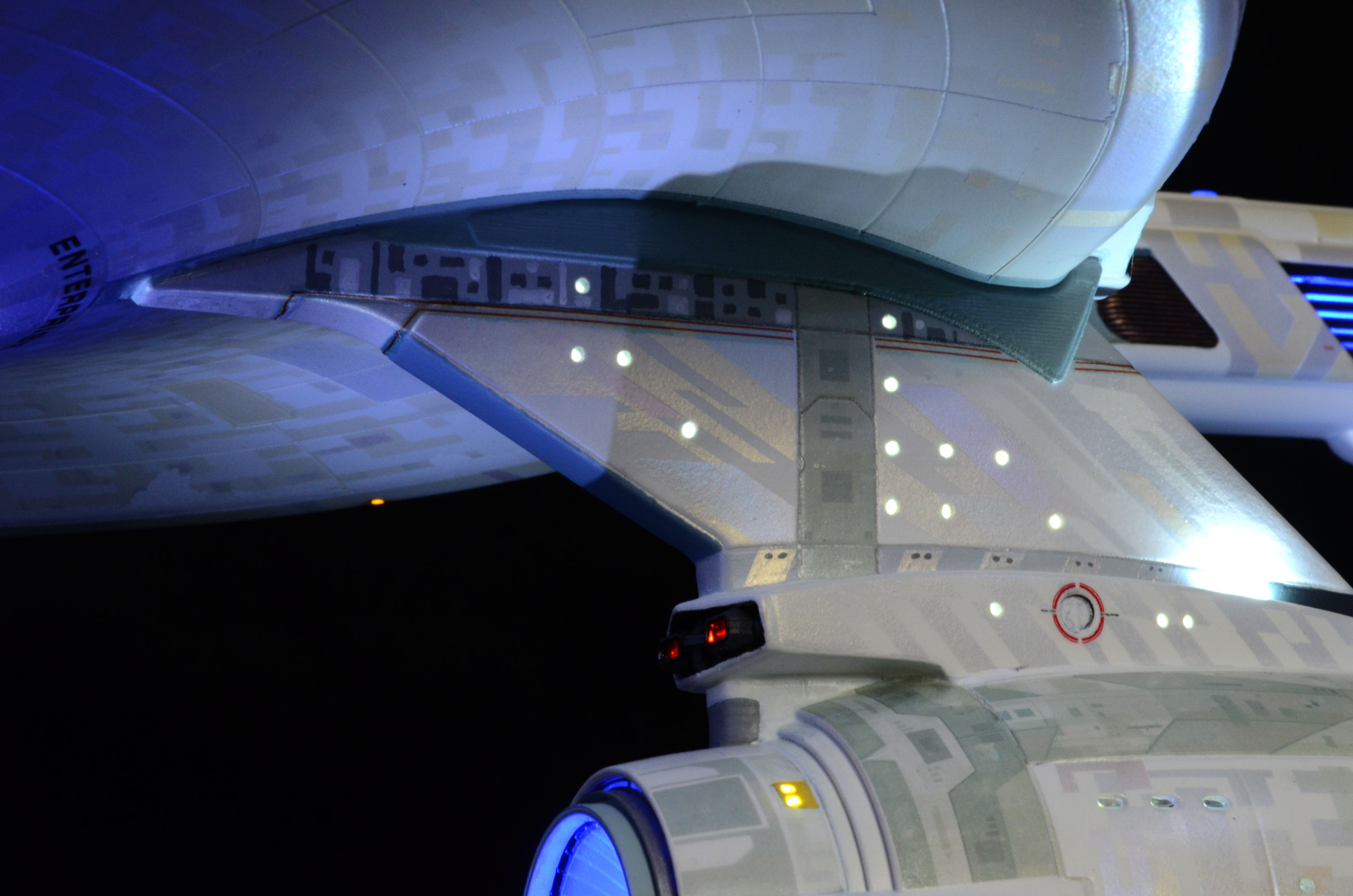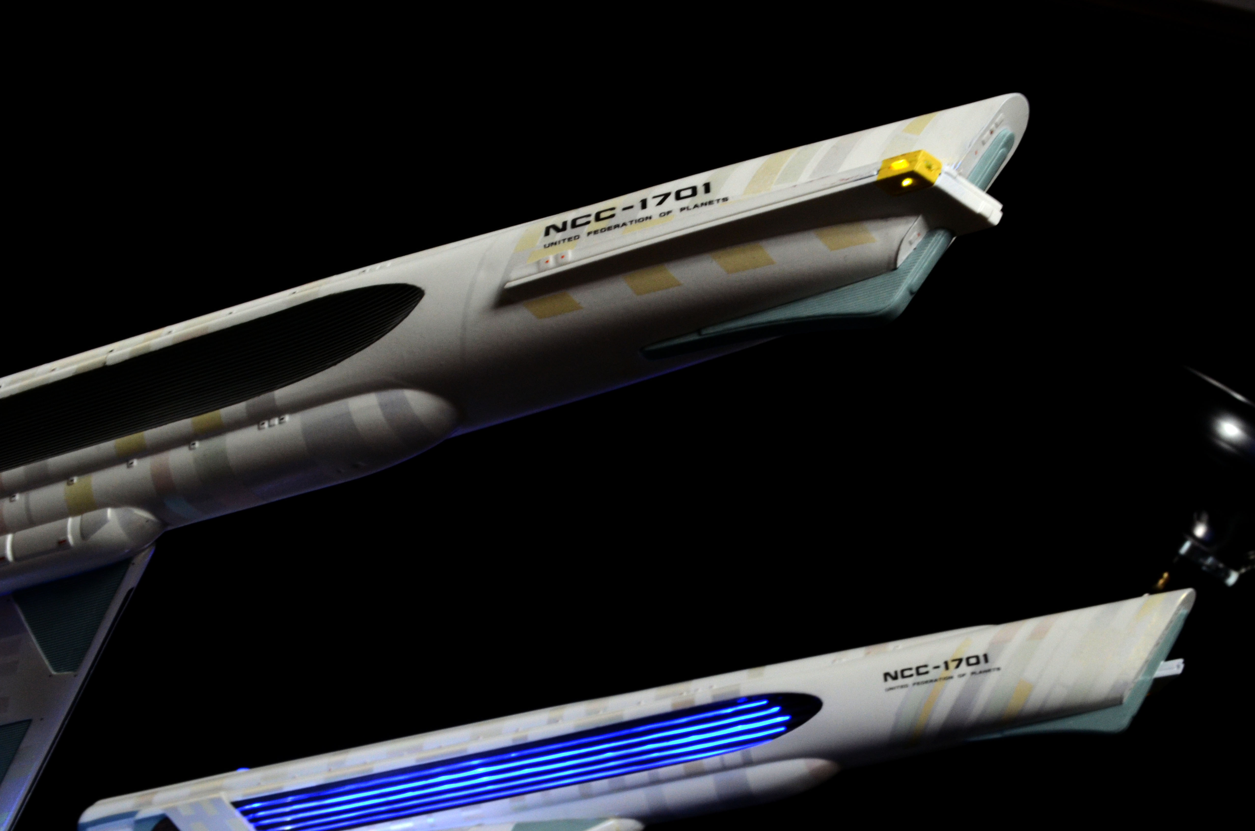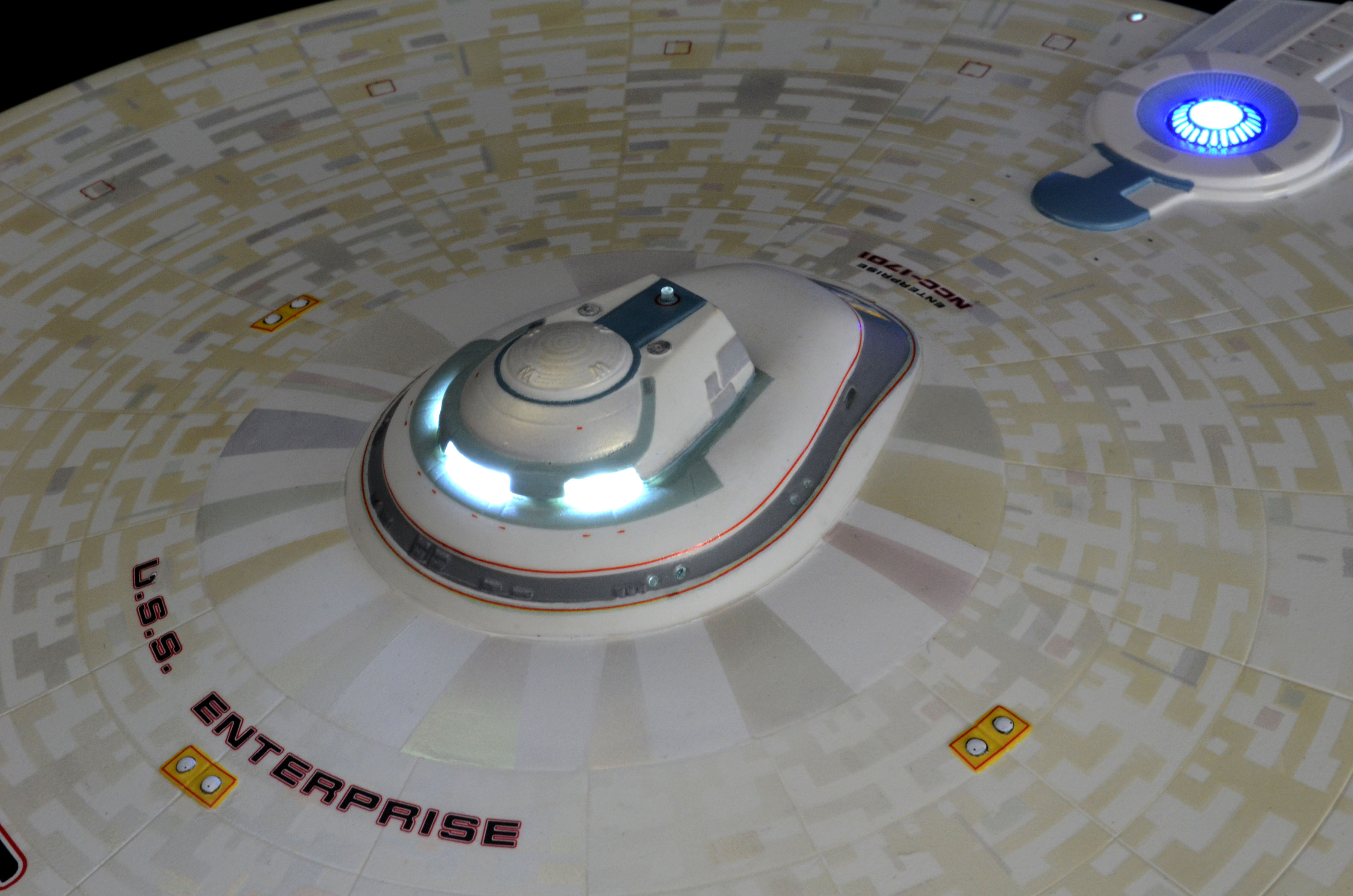 All lighting is LED, including all lights and spotlights on the base. The lighting is powered by one new variable voltage power adapter. There are two on/off switches on the right side of the base. One switch controls all of the lighting on the ship and the other controls the lighting on the base. You can have either set of lights on or off at any time. Navigation and strobe lights blink – please see the video for lighting display and timing. Impulse engines glow flickering red. The ship is not permanently mounted to the base. It is secured to the base by a screw-down connector but can be removed or rotated in any direction for display.