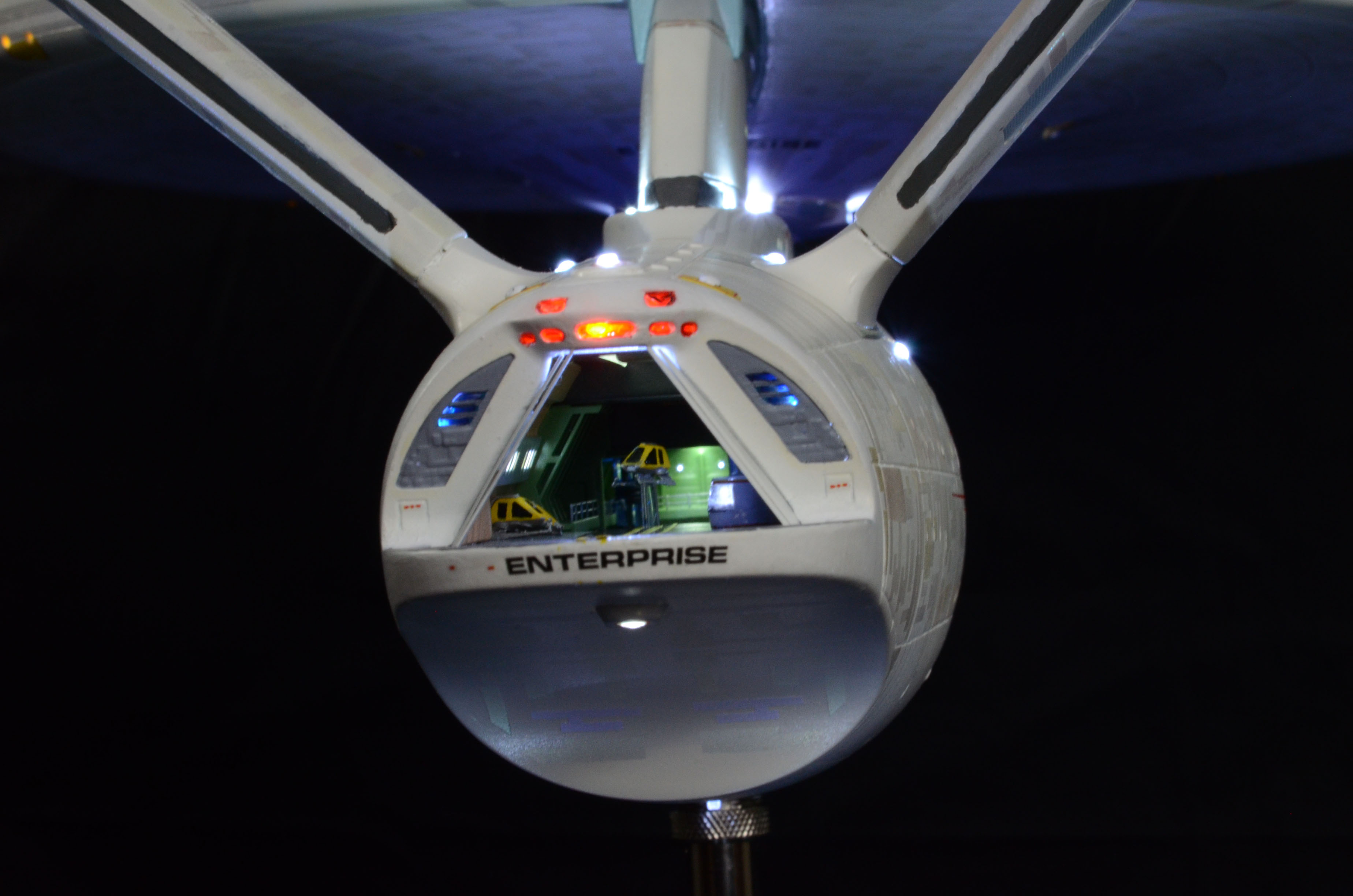 This model was made from a Polar Lights USS Enterprise Refit kit using supplemental parts for added detail. The hull has been fully detailed with a 4-color Aztec pattern using iridescent paints (Red/Blue/Green/Gold). The base color is off-white. The model features a completed and detailed officer’s lounge, arboretum, and shuttle/landing bay. There is also a recreation deck but that’s barely visible through the windows. The landing bay door section can be added or removed.