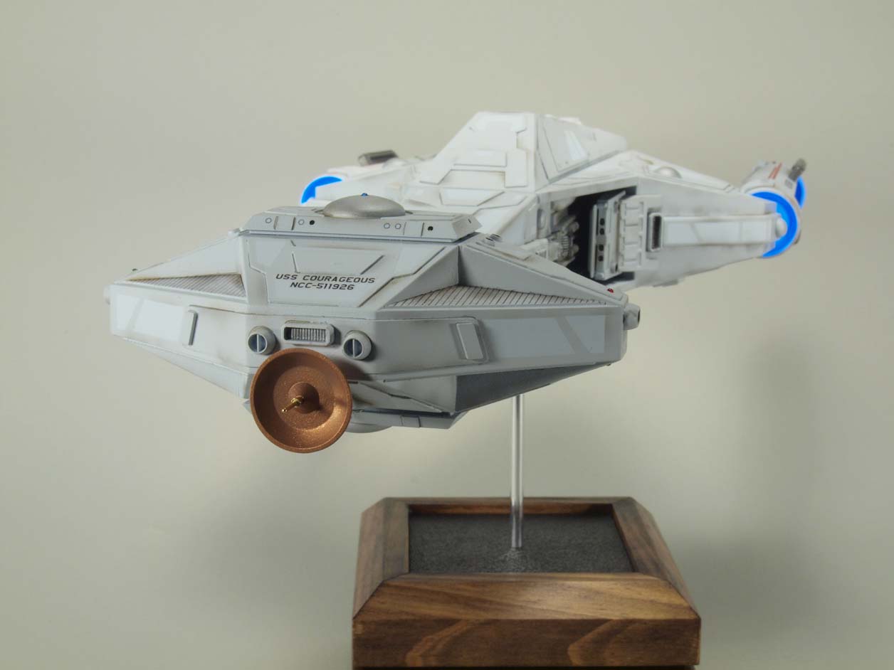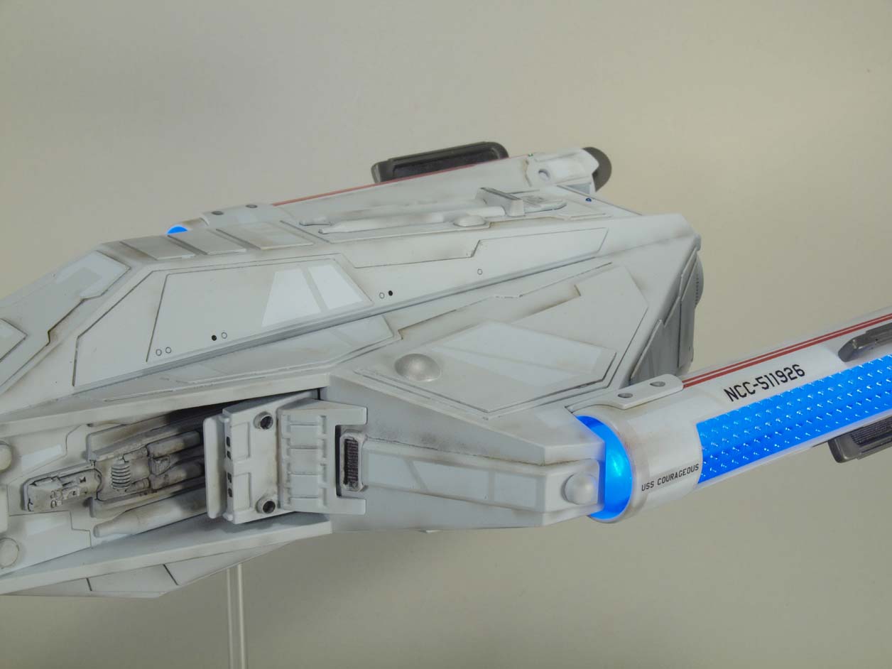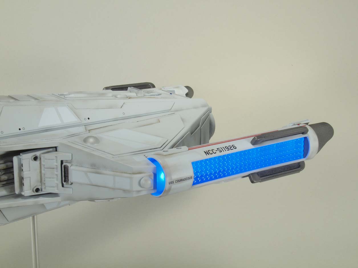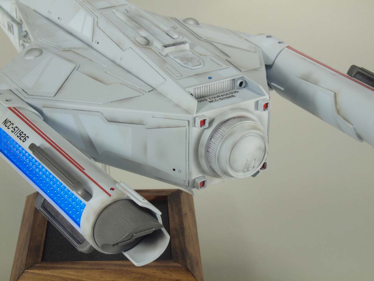 Even though I loved the design, I wanted to do my own variation using the basic design as a start and giving it a more modern look. Styrene is used exclusively for the construction and LED lighting was added to the warp nacelles. The model is 1/537 scale and measures 17” in length.