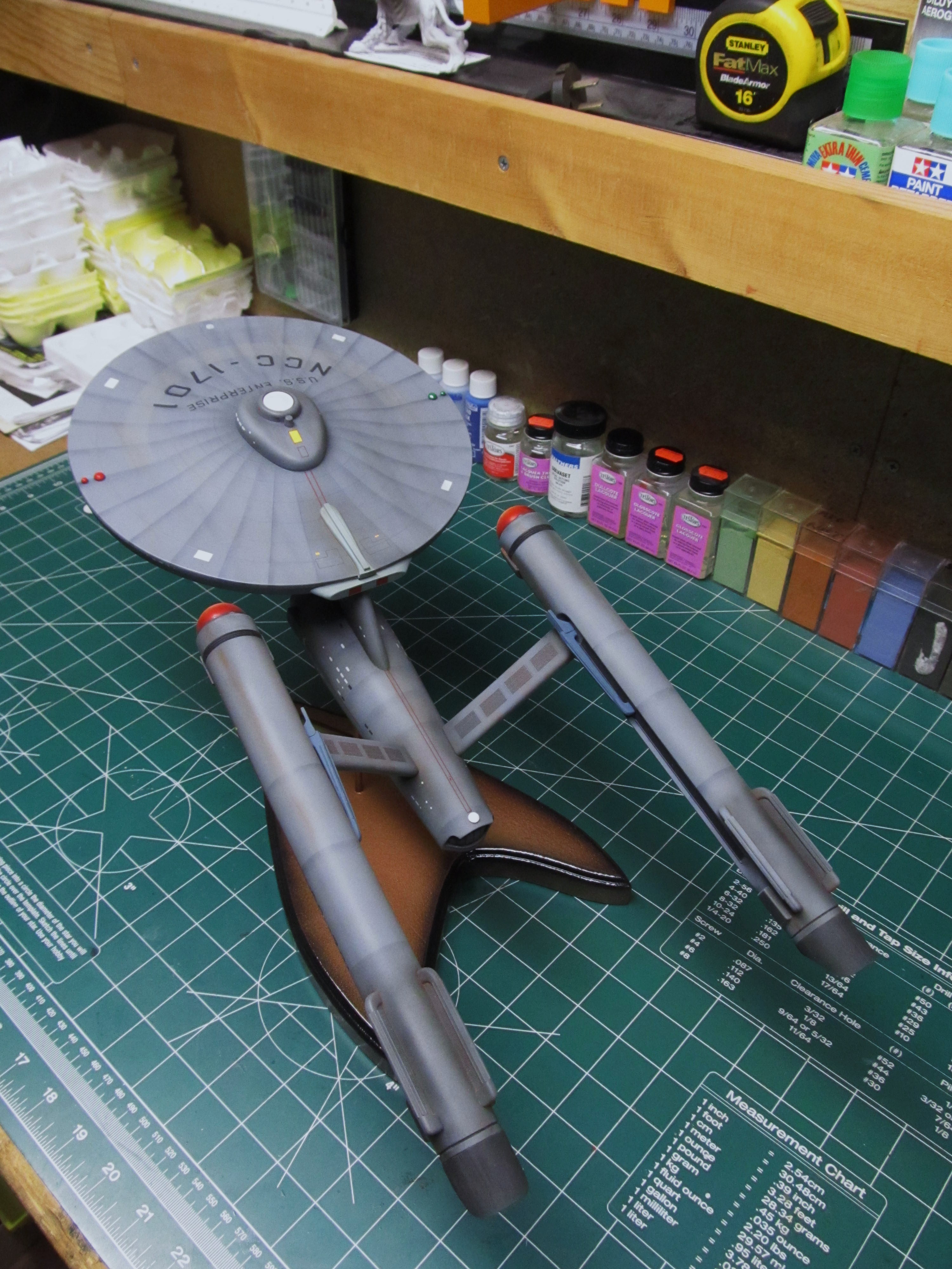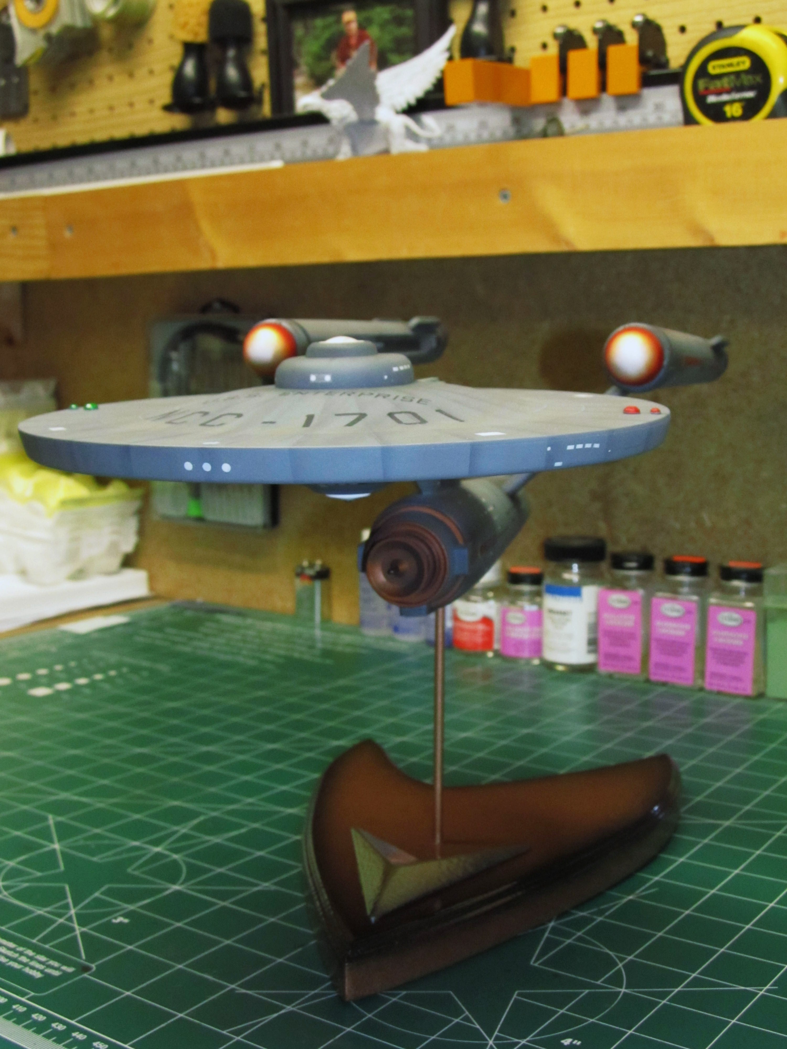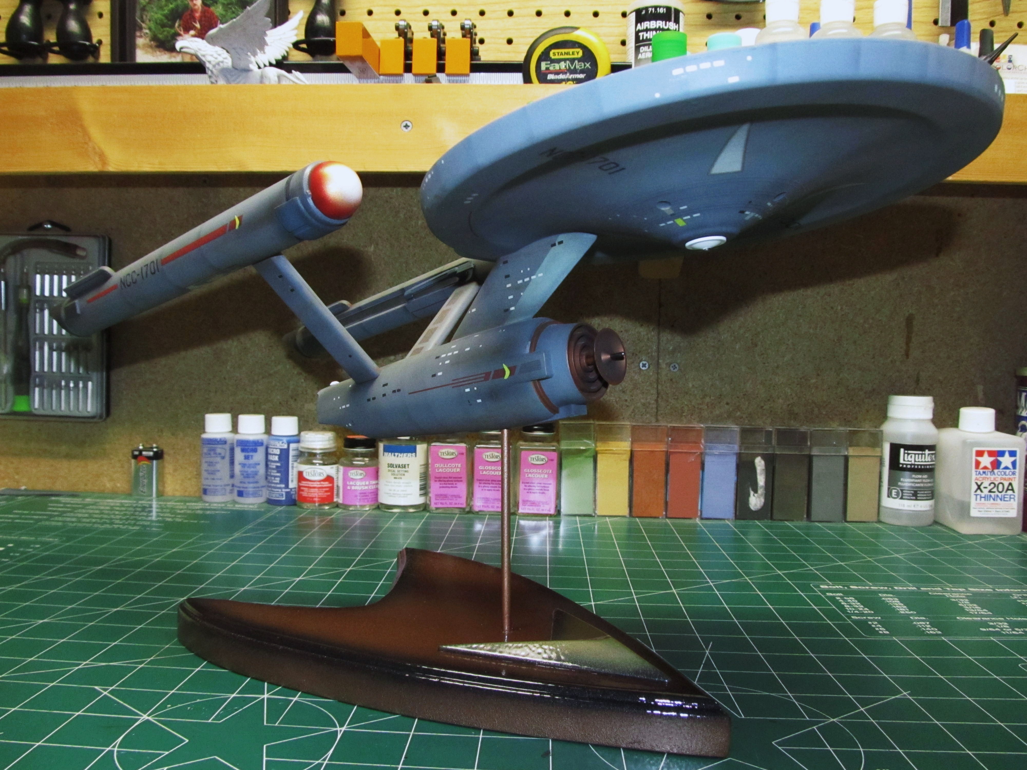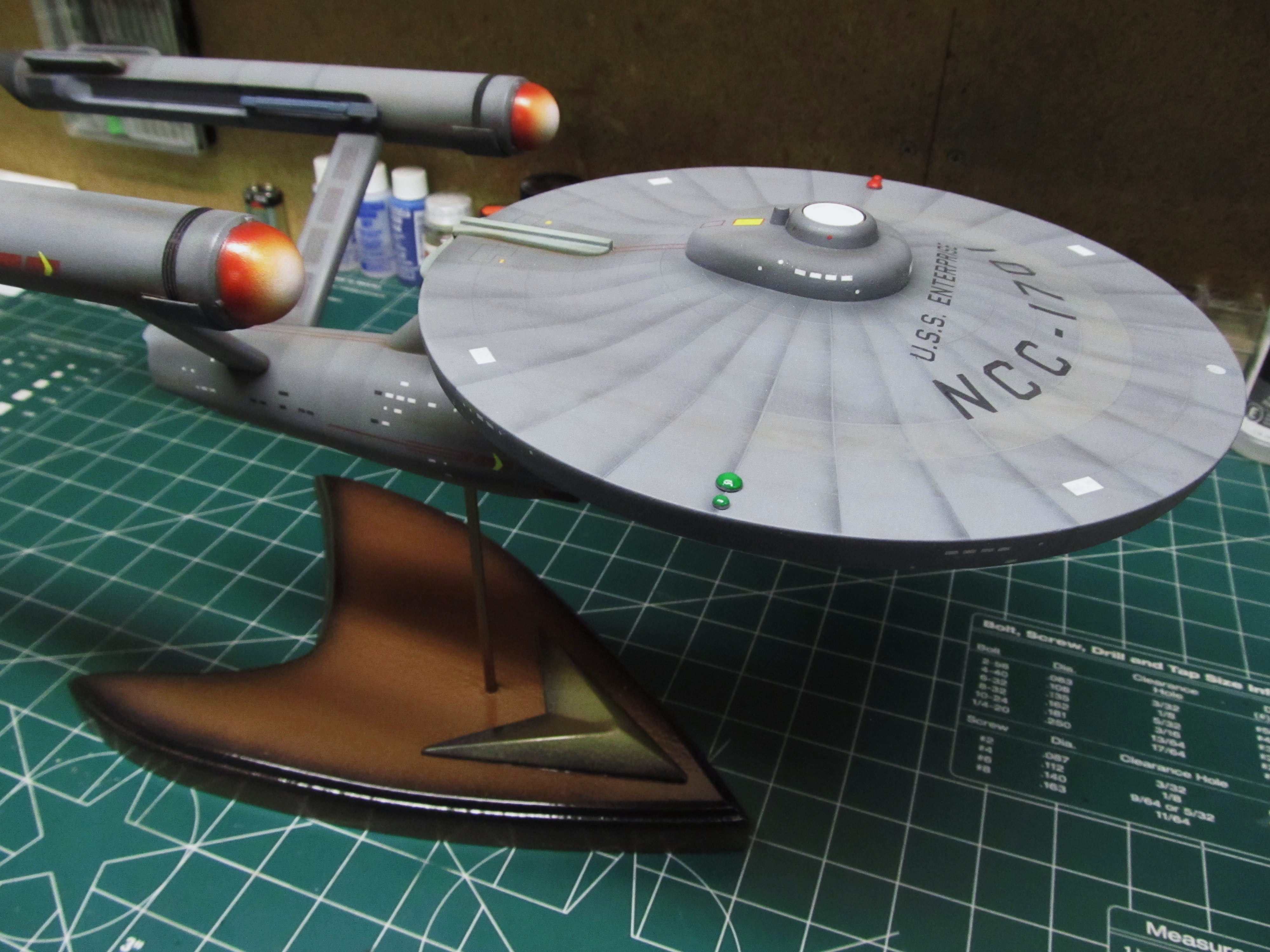 Model Description: These are photos of the completed 1/650 AMT USS Enterprise. This was a model that I wanted to build for a long time. I think it turned out real nice and I would like to share it with all who are interested. Months of work went into this build after looking at hundreds of images, photos and even clips from The TV series. I used a slightly darker base color Gray than the original filming model so as not to wash out the fine detail under harsh photo lighting. I think that all would agree, looking at the photo shopped image it worked very well. The model is of course not screen accurate but most definitely an exceptional representation. The Enterprise is currently posted in the models for sale section of (starburstmodels.com) along with a special photo shopped image in addition to the one I am sending to you that my son (Michael) and I worked on together for quite some time. The model is Listed For $1,200.00 and I will review all serious inquires and offers. I hope all who are interested enjoy the Enterprise as much as I did working on the build.