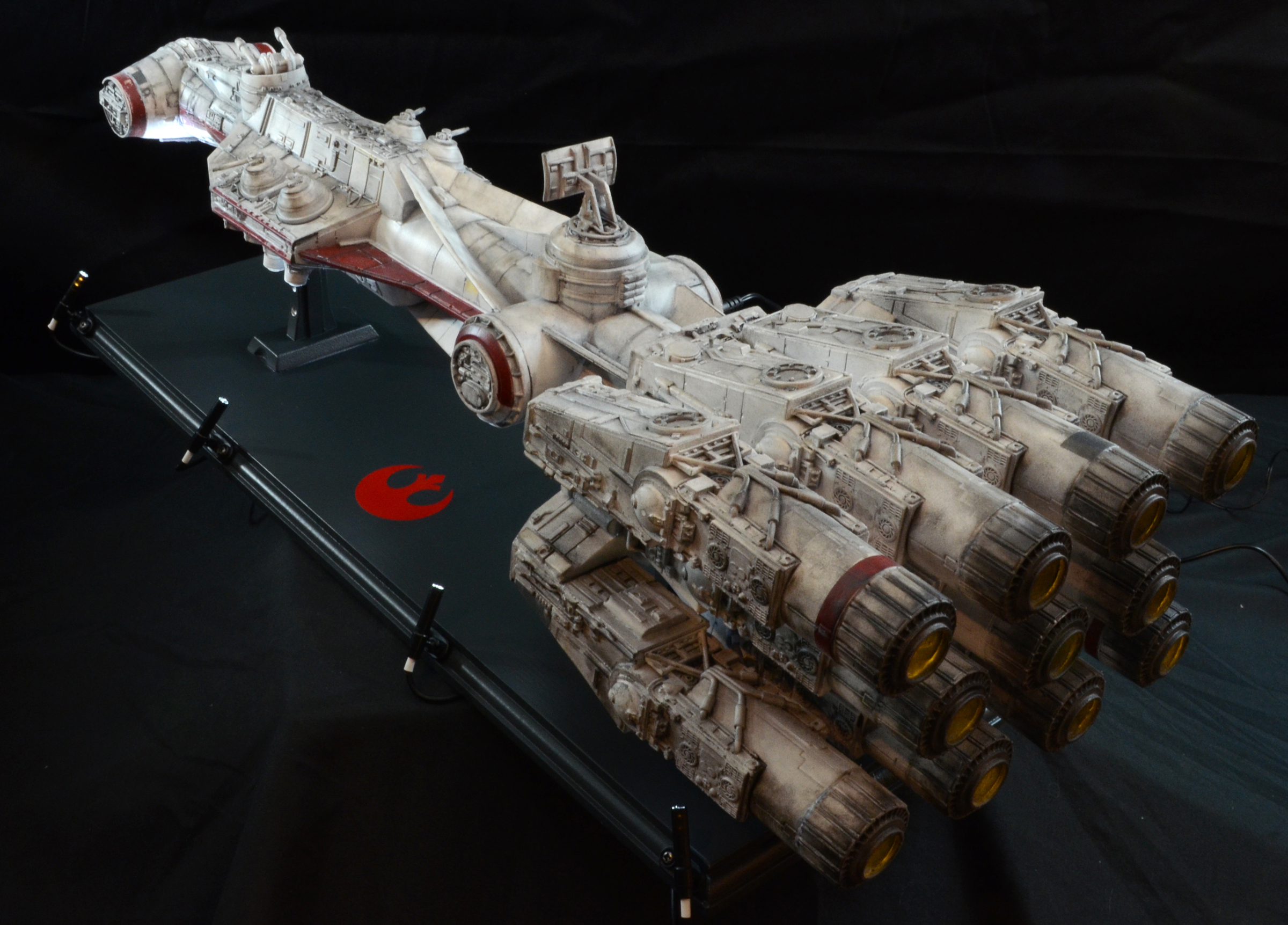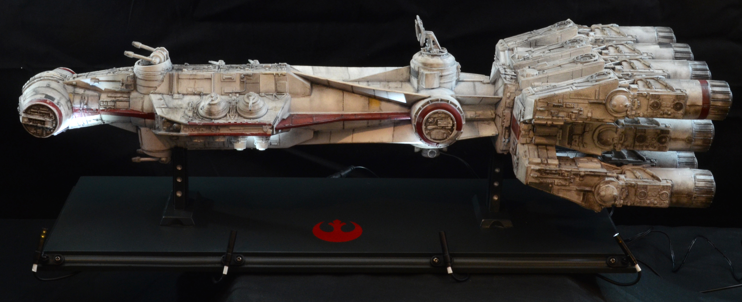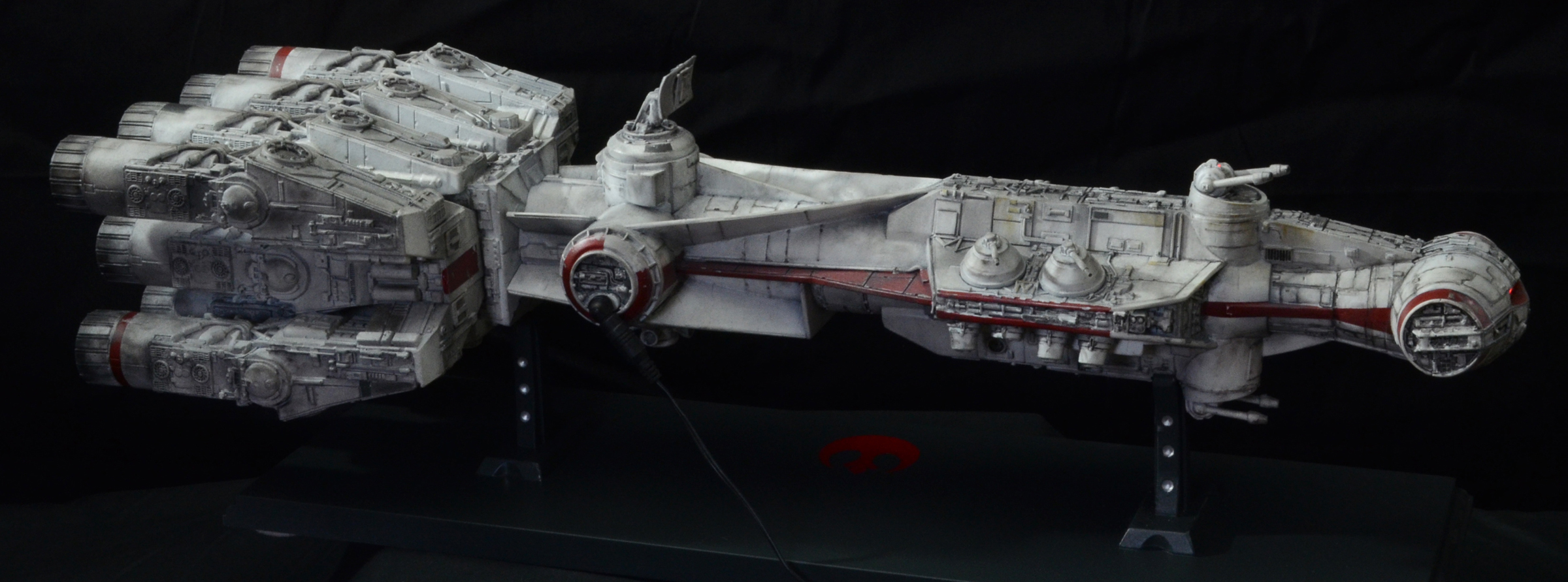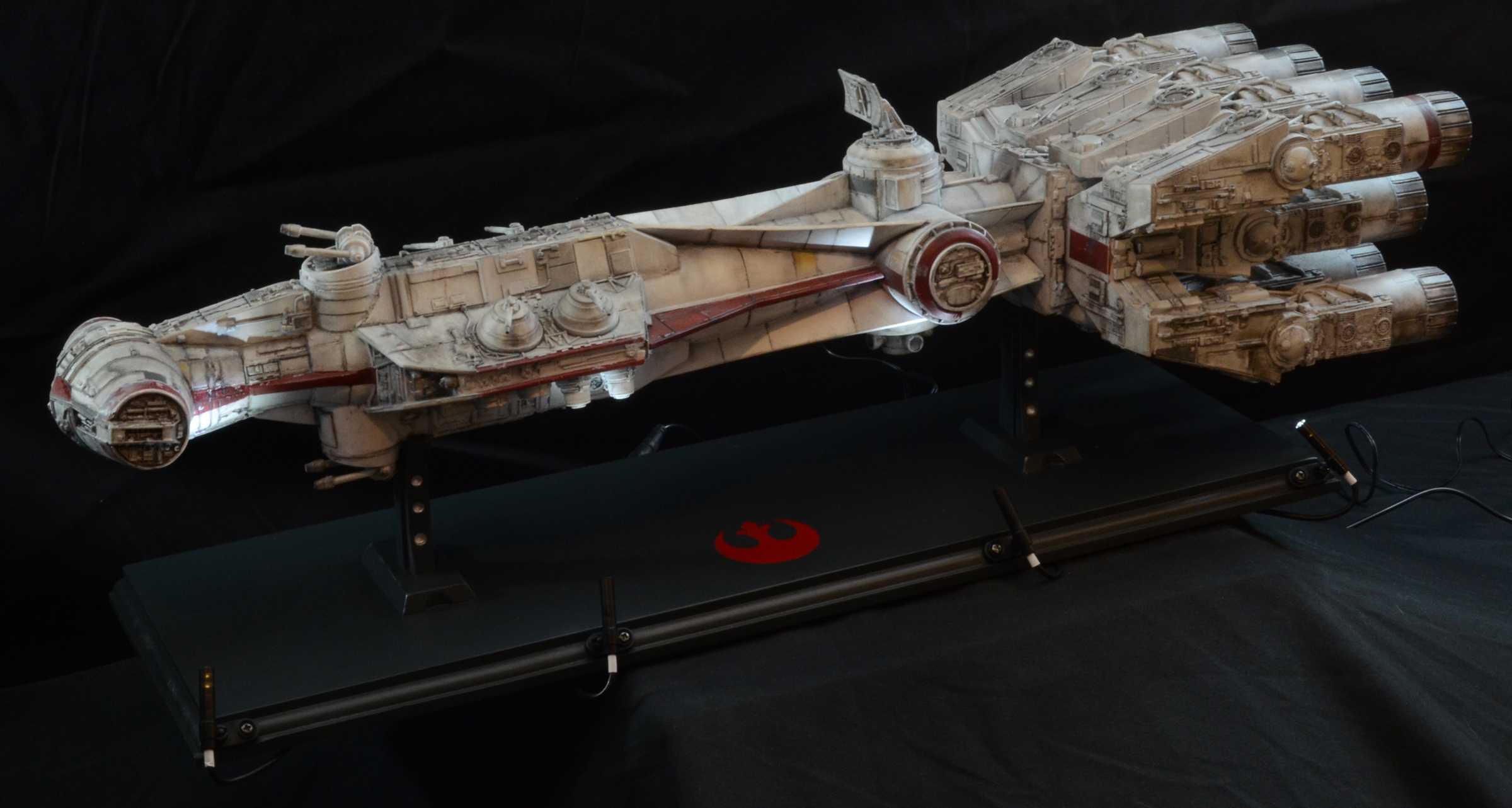 27” long version of the Tantive IV Blockade Runner seen in Star Wars Episode IV: A New Hope. The model is lit with LED lighting and some fiber optics. The engines light, as well as the cockpit area and 2 small red fiber optic lights on the turret guns above the cockpit/bridge area. All lights on the model are controlled by a 9V wall plug with switch included. No batteries required. The stand is made of wood with resin posts. The 4 spotlights on the stand/base are controlled by a separate switch from the model lights, so you can turn on the base lights or keep them off. The model is not permanently mounted to the base and can be removed.