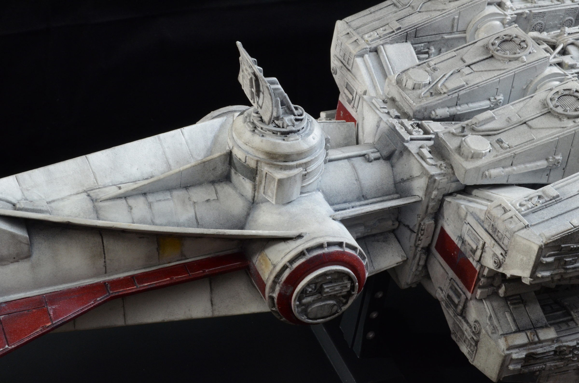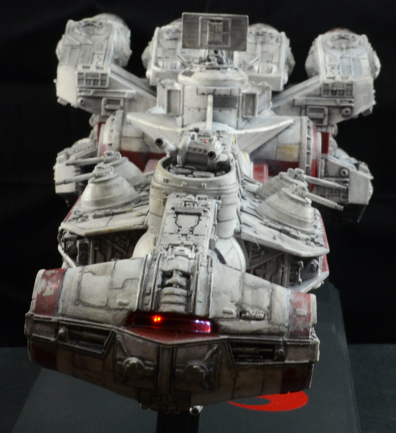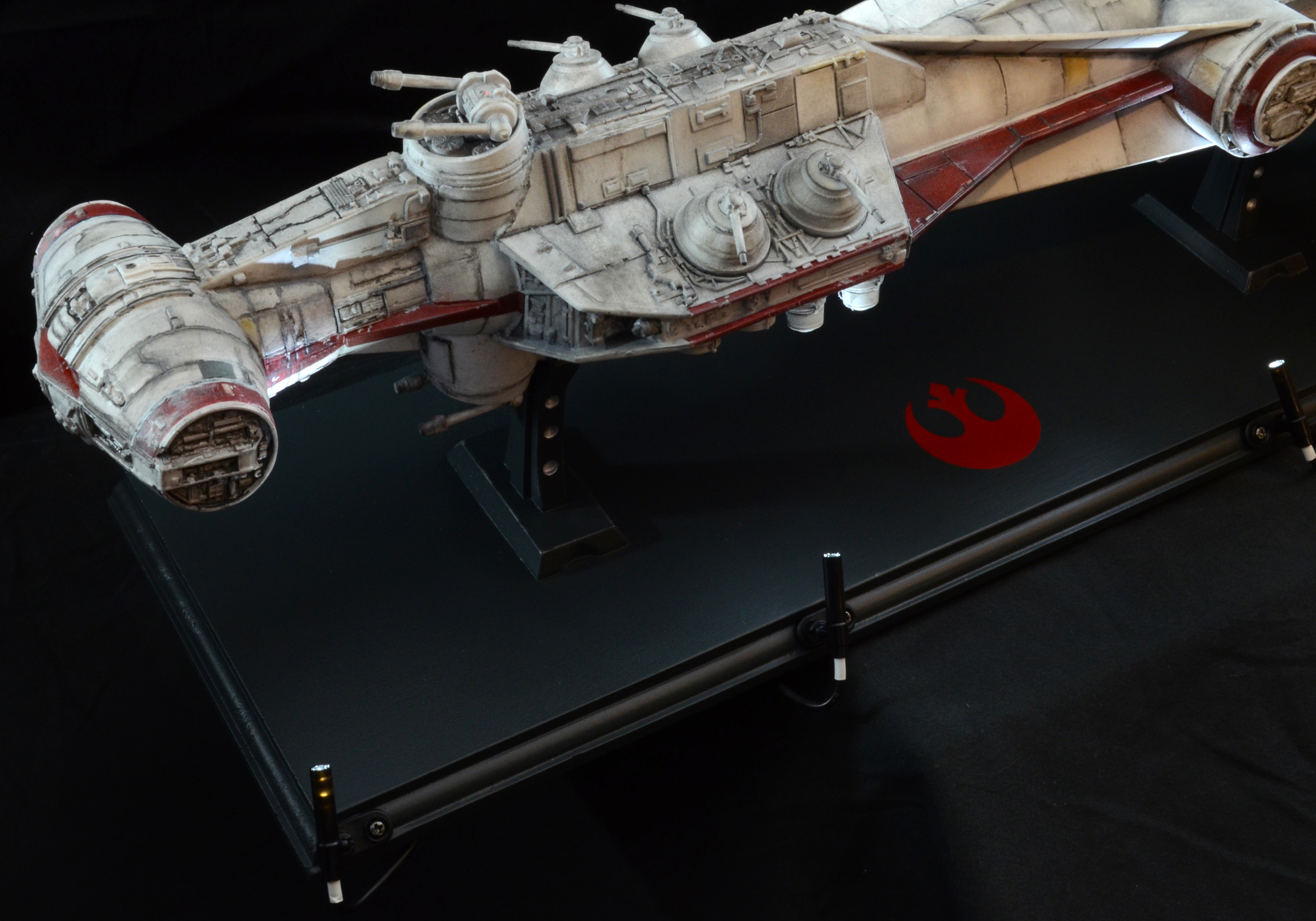 27” long version of the Tantive IV Blockade Runner seen in Star Wars Episode IV: A New Hope. The model is lit with LED lighting and some fiber optics. The engines light, as well as the cockpit area and 2 small red fiber optic lights on the turret guns above the cockpit/bridge area. All lights on the model are controlled by a 9V wall plug with switch included. No batteries required. The stand is made of wood with resin posts. The 4 spotlights on the stand/base are controlled by a separate switch from the model lights, so you can turn on the base lights or keep them off. The model is not permanently mounted to the base and can be removed.