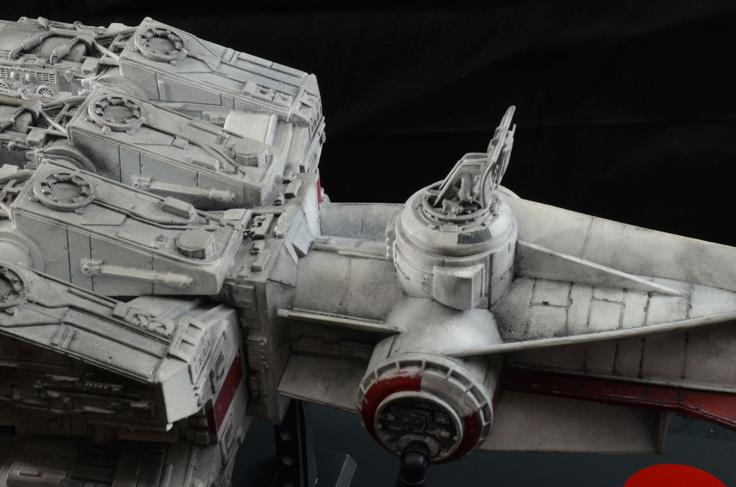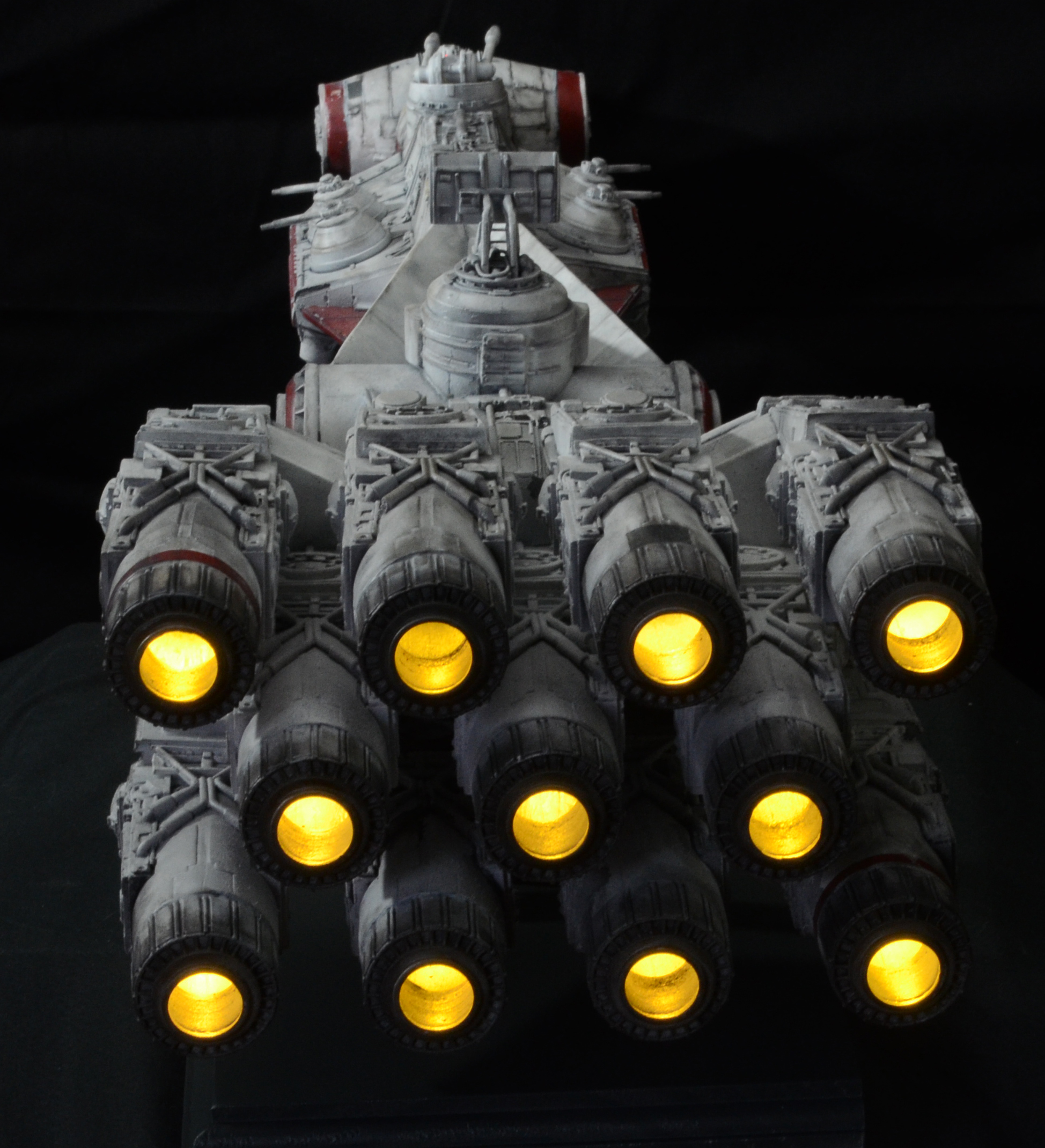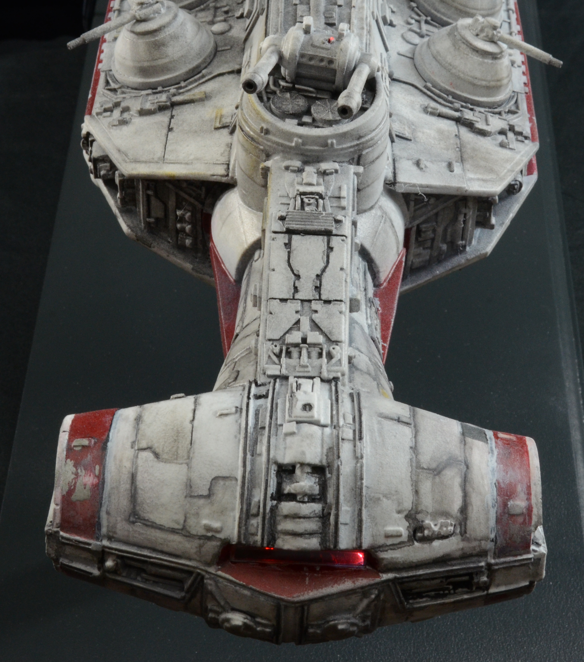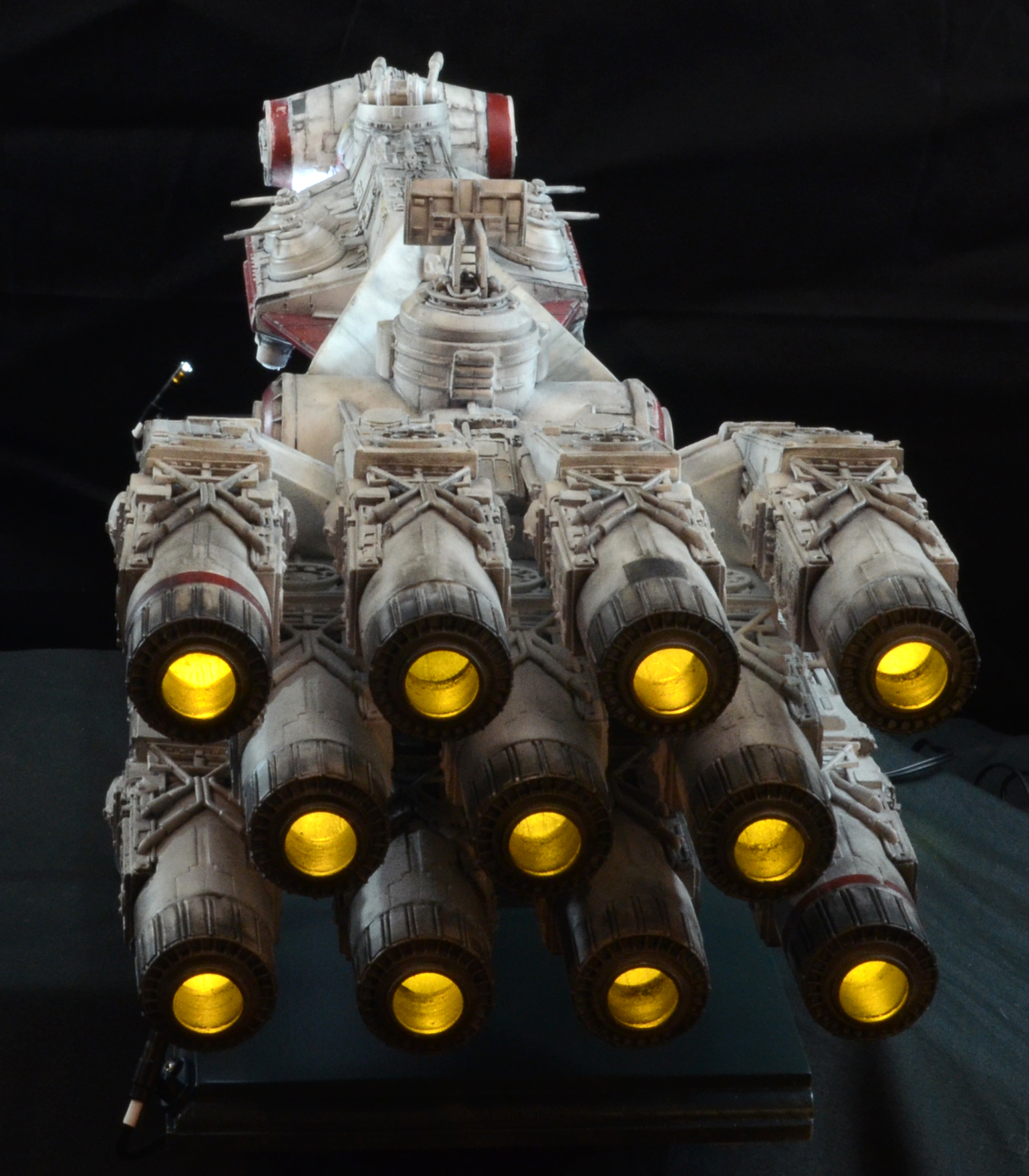 27” long version of the Tantive IV Blockade Runner seen in Star Wars Episode IV: A New Hope. The model is lit with LED lighting and some fiber optics. The engines light, as well as the cockpit area and 2 small red fiber optic lights on the turret guns above the cockpit/bridge area. All lights on the model are controlled by a 9V wall plug with switch included. No batteries required. The stand is made of wood with resin posts. The 4 spotlights on the stand/base are controlled by a separate switch from the model lights, so you can turn on the base lights or keep them off. The model is not permanently mounted to the base and can be removed.