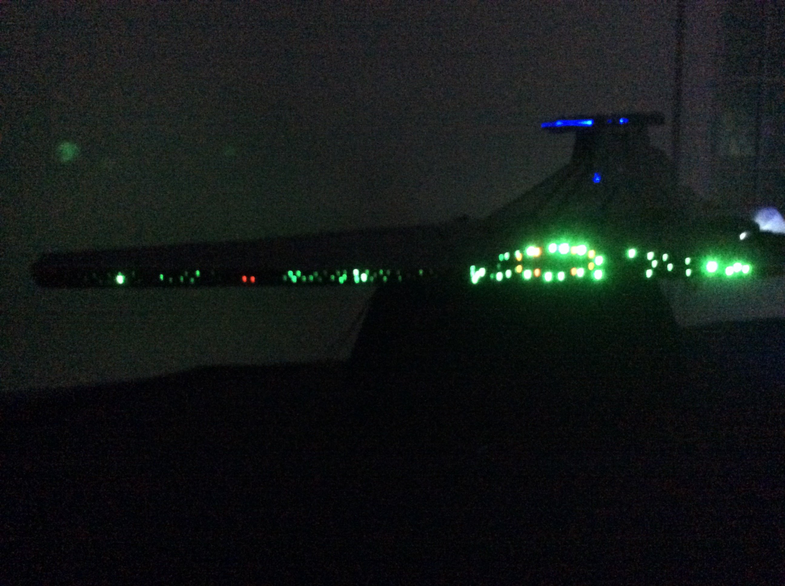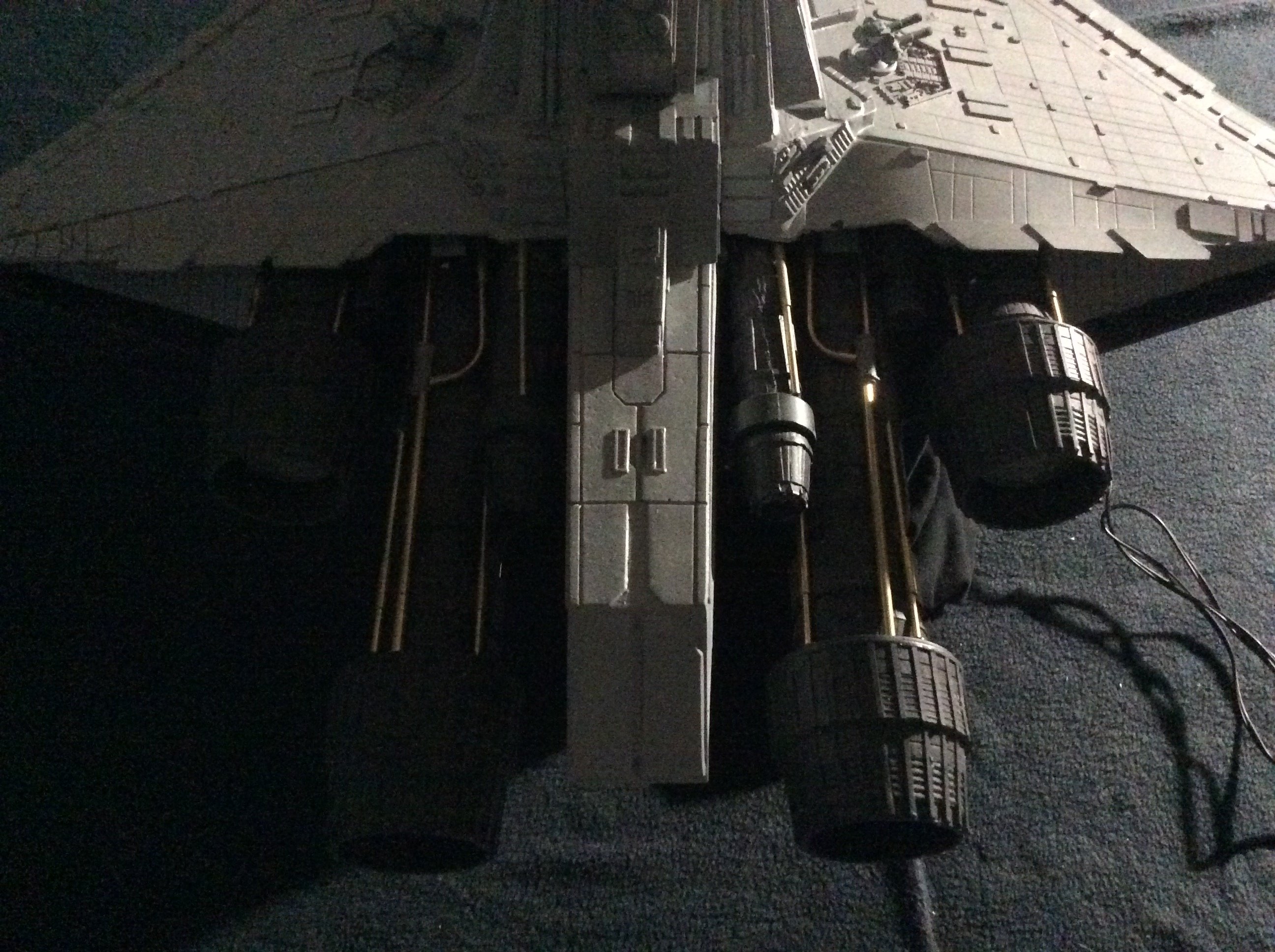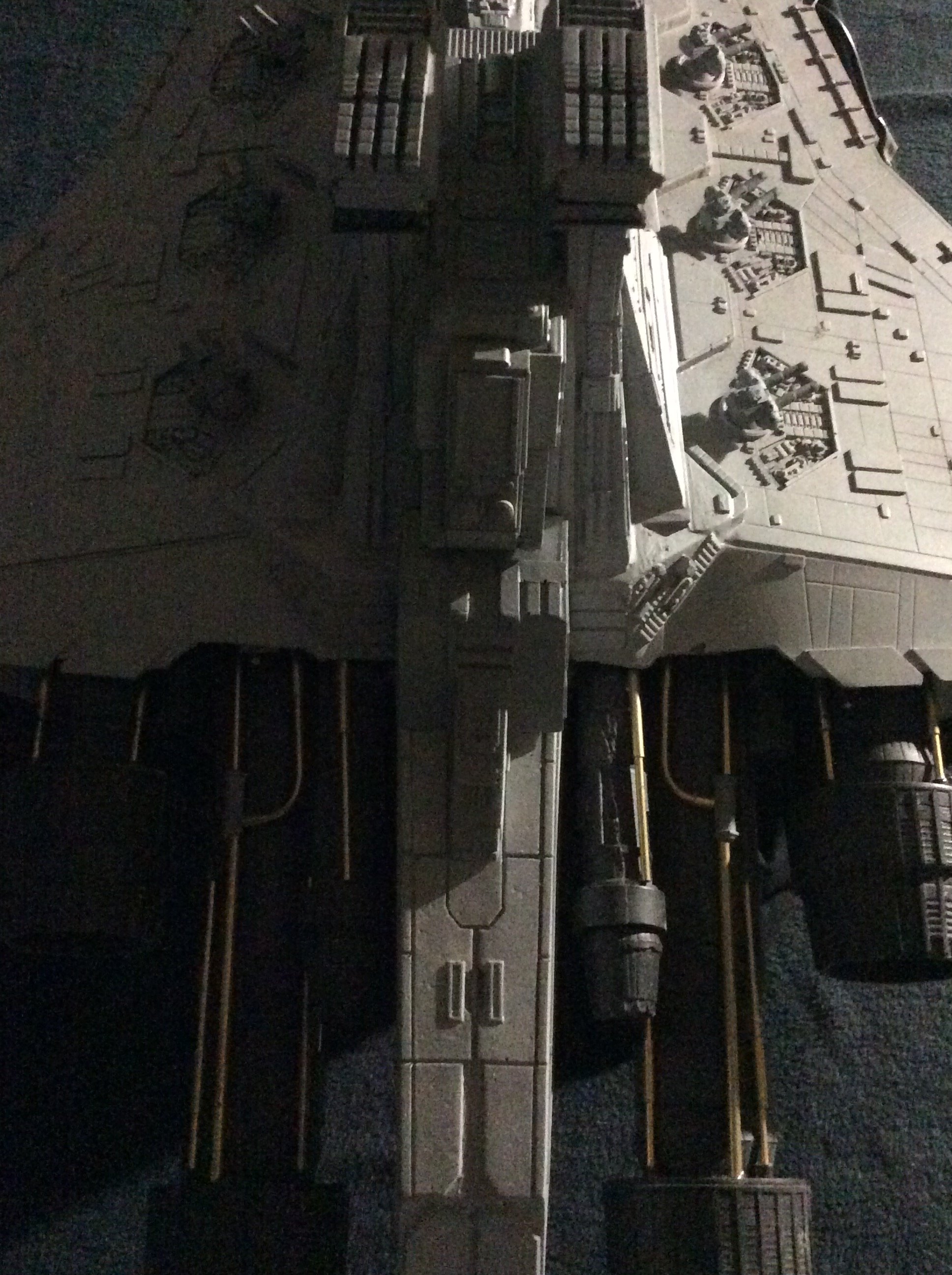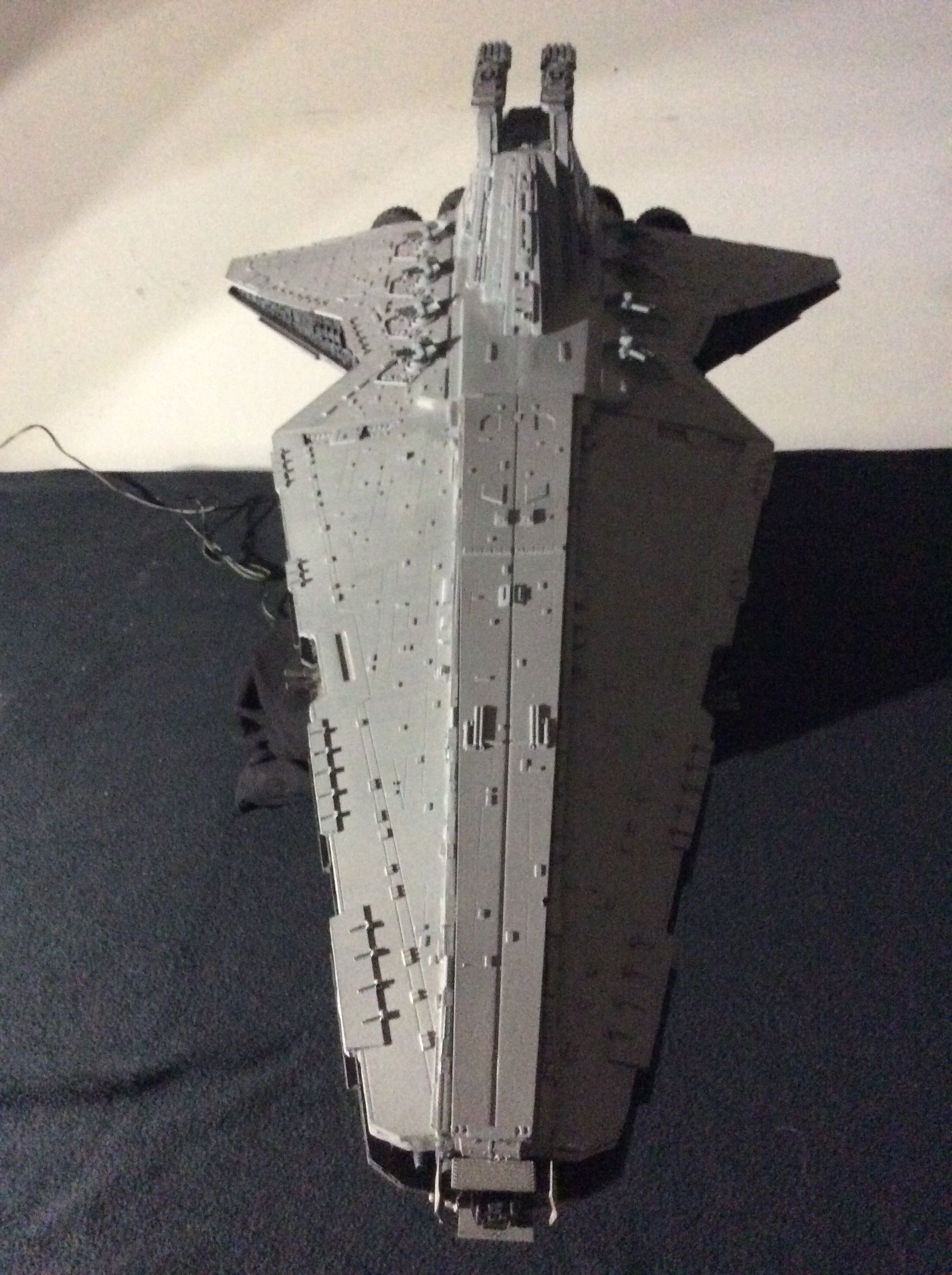 Here is the 40.5”-41” Venator Class Destroyer – Imperial version. It’s a big model and is fully lit. I made some changes to the front nose and engine section to reflect the Destroyer as seen on screen in Revenge of the Sith. Comes with a stand and power supply. Fiber optic cable was used to light up the trenches and bottom hanger. The deck guns are movable and can be positioned any direction. Brass piping was used to replace the resin piping that came with the kit. The Venator model will ship out FedEx, fully insured and packed by FedEx, which shall be paid for by the buyer. I would rather not send this overseas.