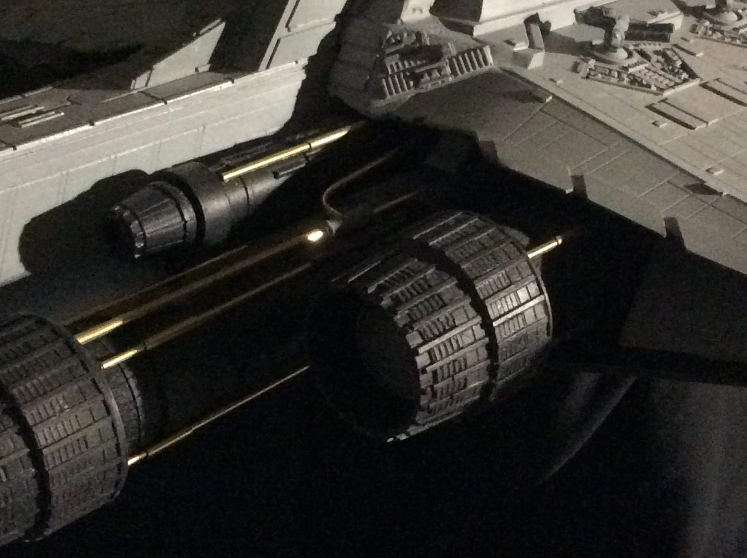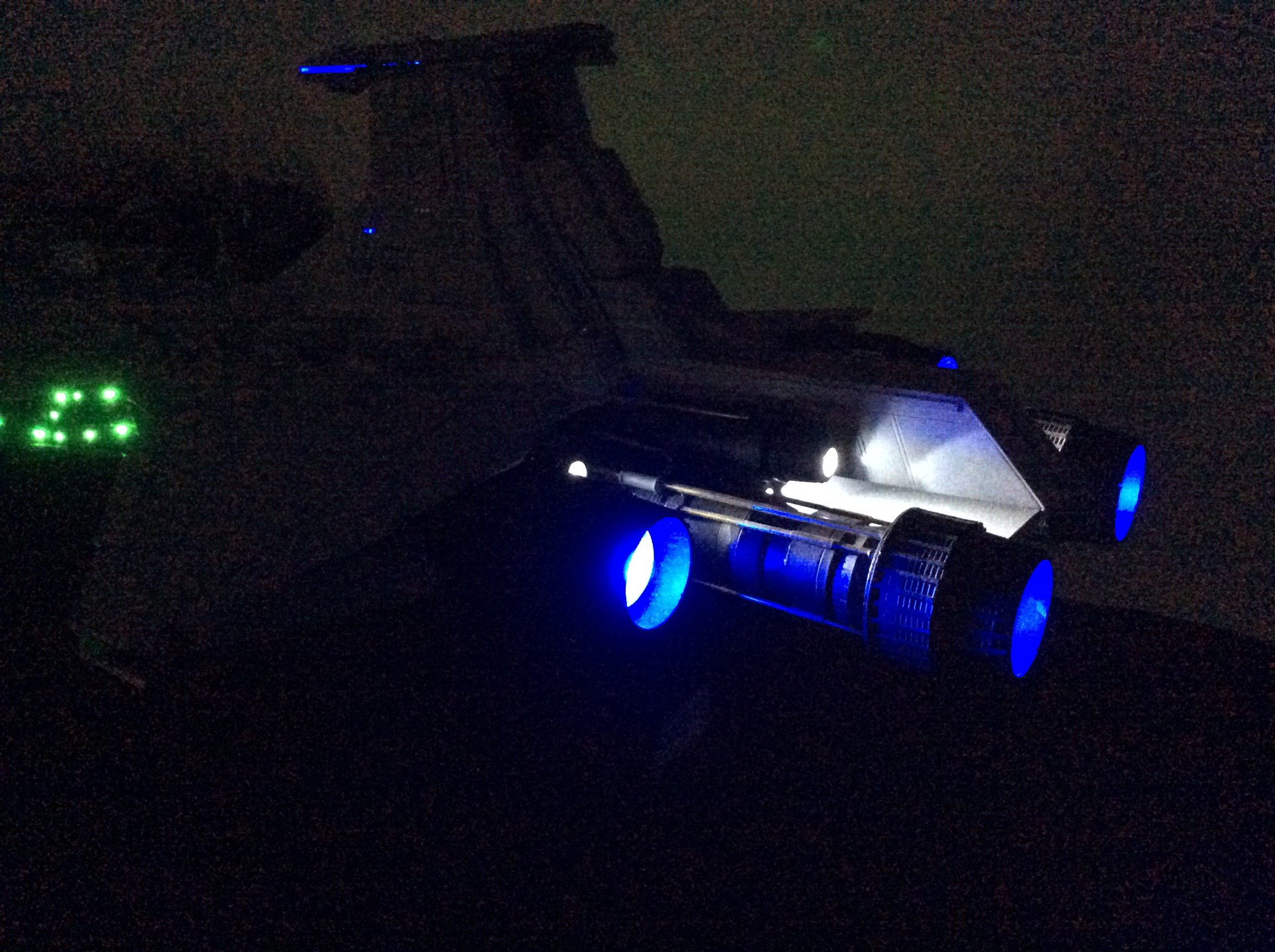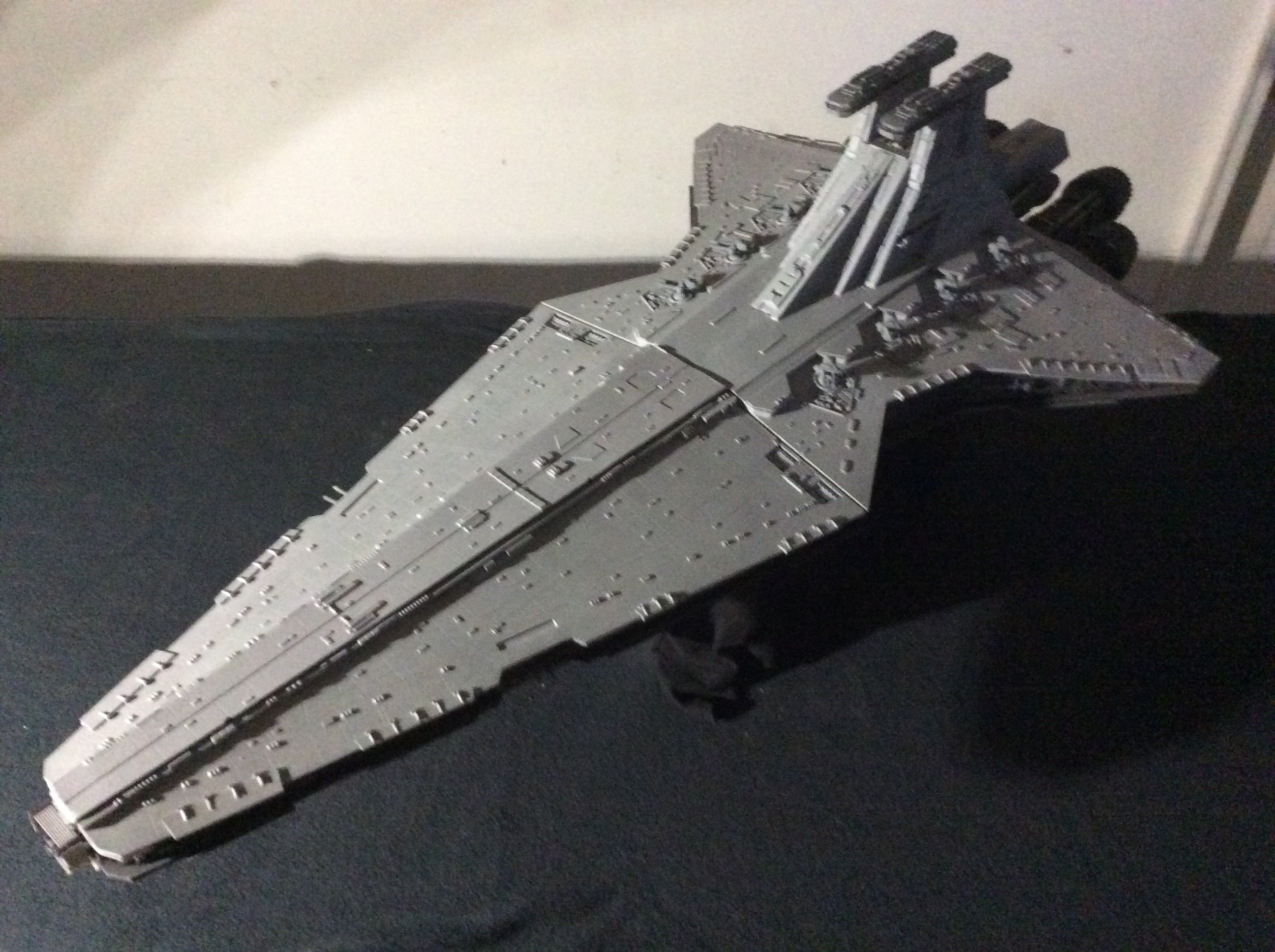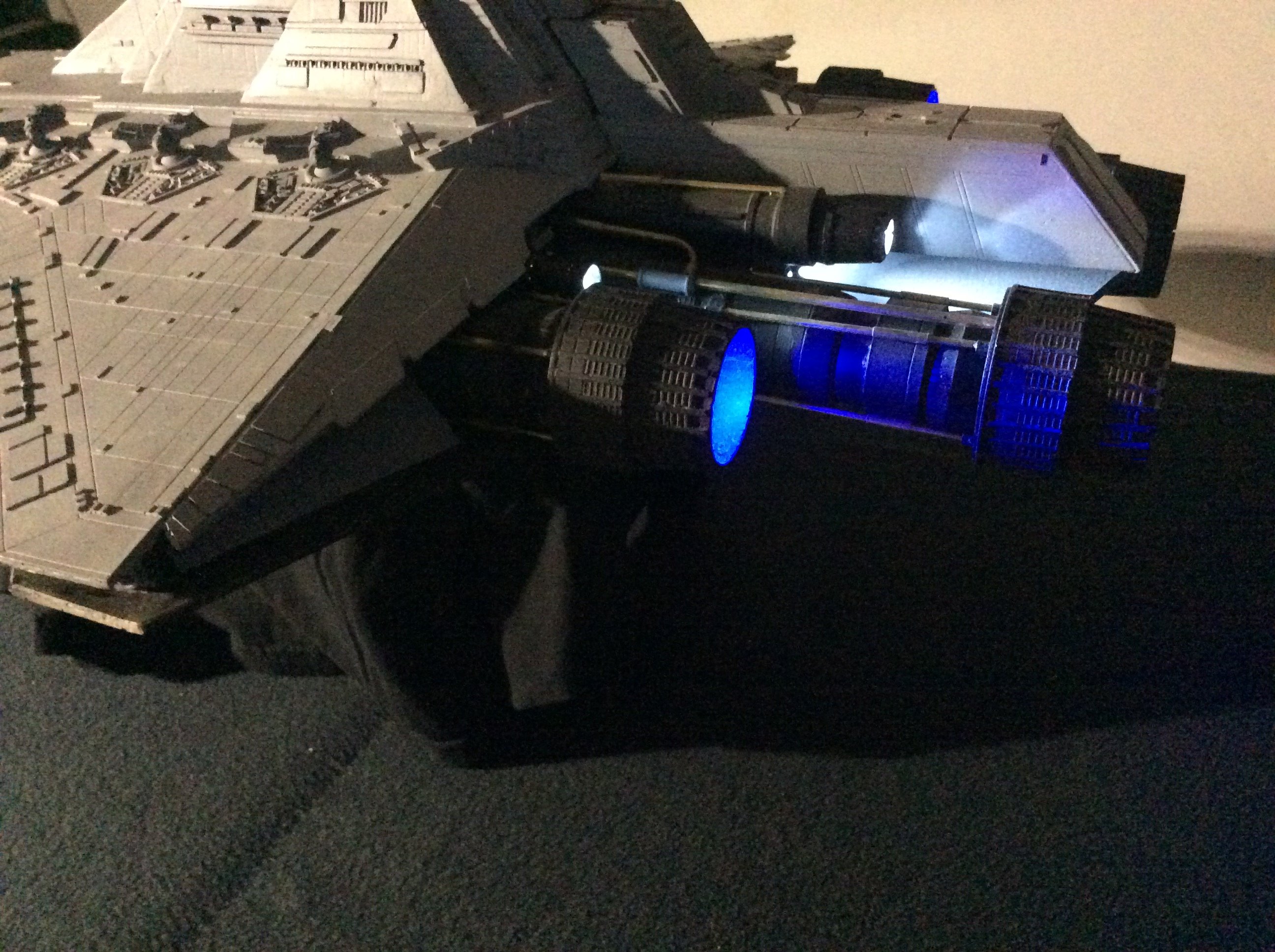 Here is the 40.5”-41” Venator Class Destroyer – Imperial version. It’s a big model and is fully lit. I made some changes to the front nose and engine section to reflect the Destroyer as seen on screen in Revenge of the Sith. Comes with a stand and power supply. Fiber optic cable was used to light up the trenches and bottom hanger. The deck guns are movable and can be positioned any direction. Brass piping was used to replace the resin piping that came with the kit. The Venator model will ship out FedEx, fully insured and packed by FedEx, which shall be paid for by the buyer. I would rather not send this overseas.