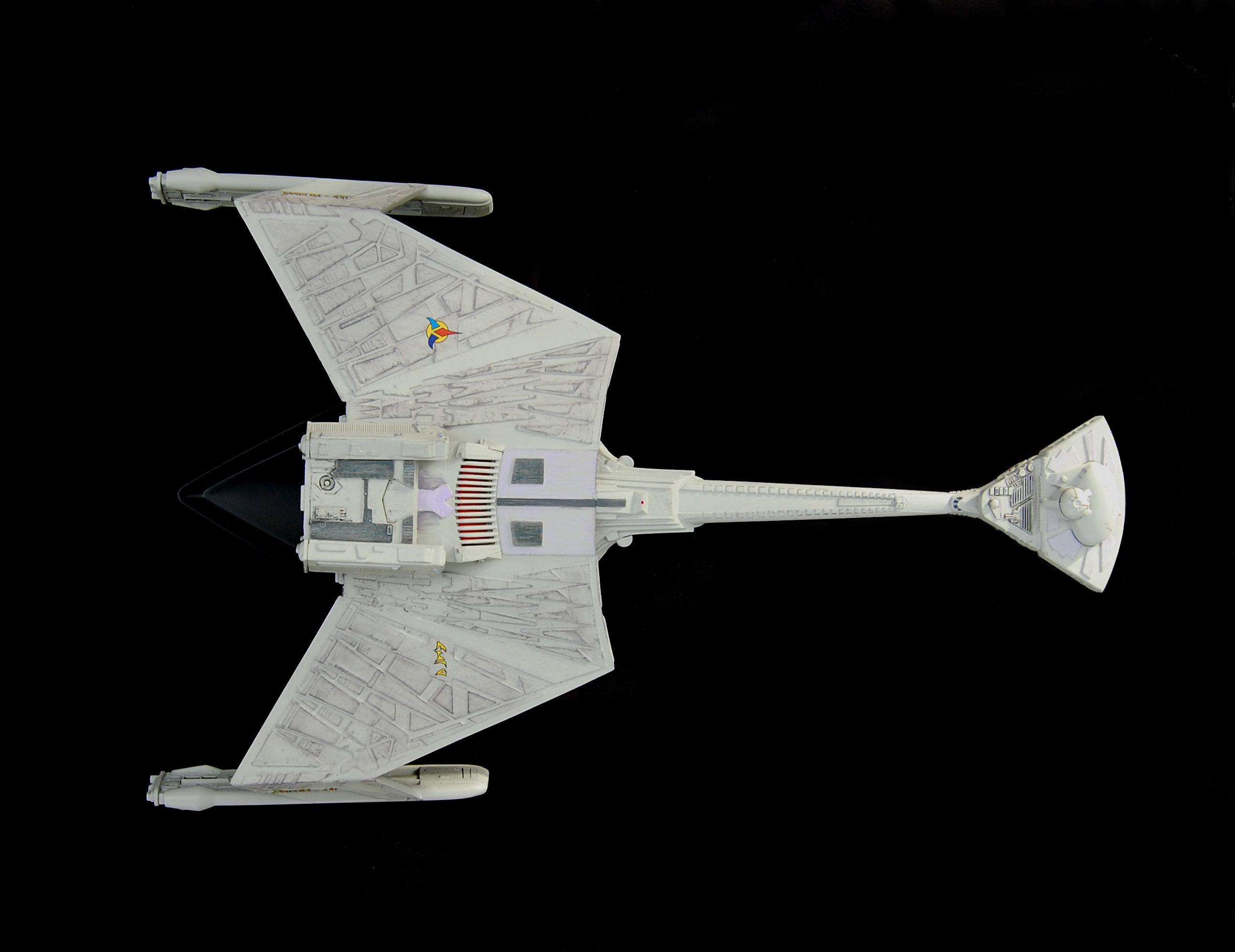 I chose to paint the model in a grey shade and purple highlights to match how it looks on film, and ignore the complex green/purple shading as seen in independent photos of the filming miniatures.