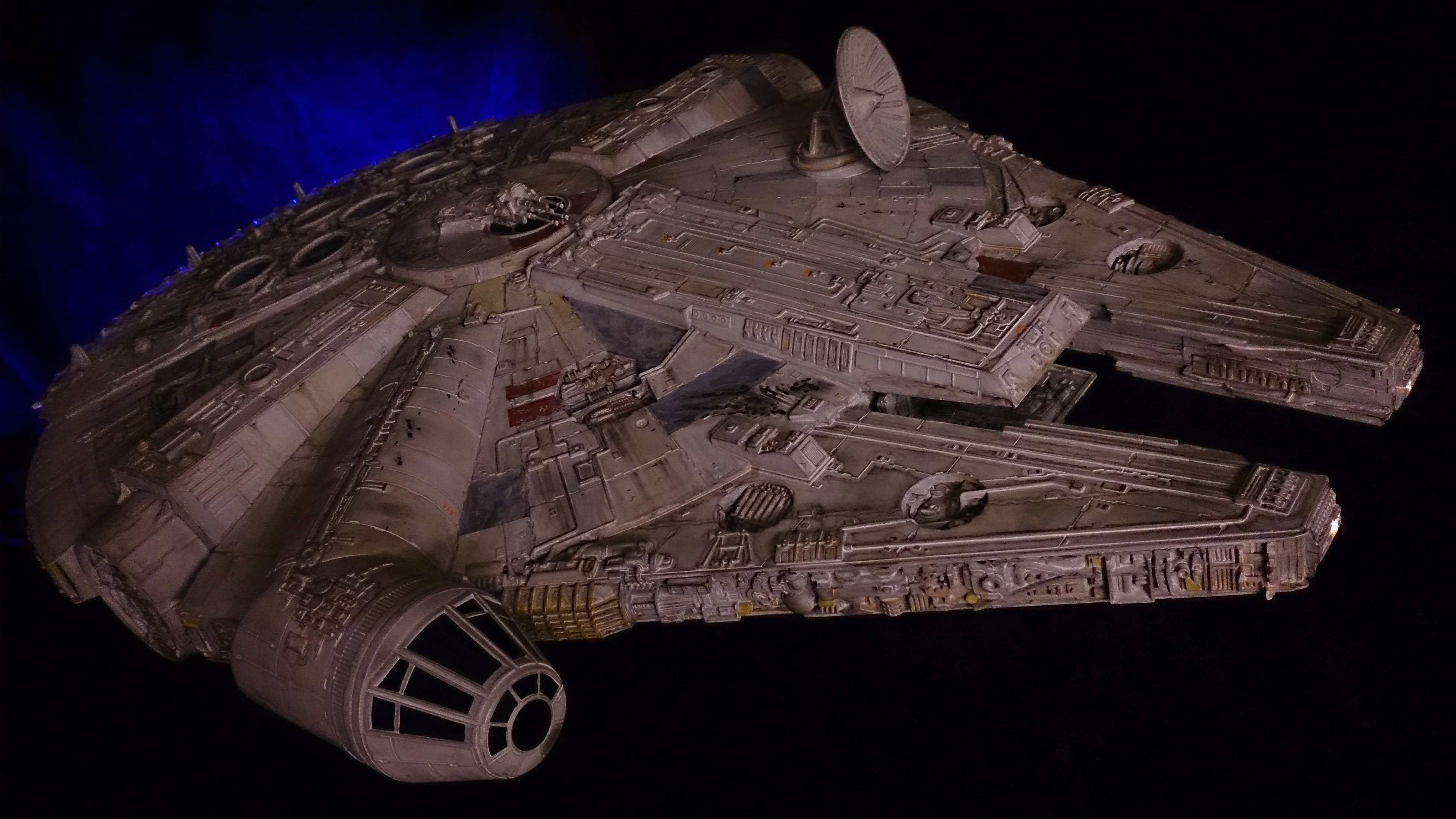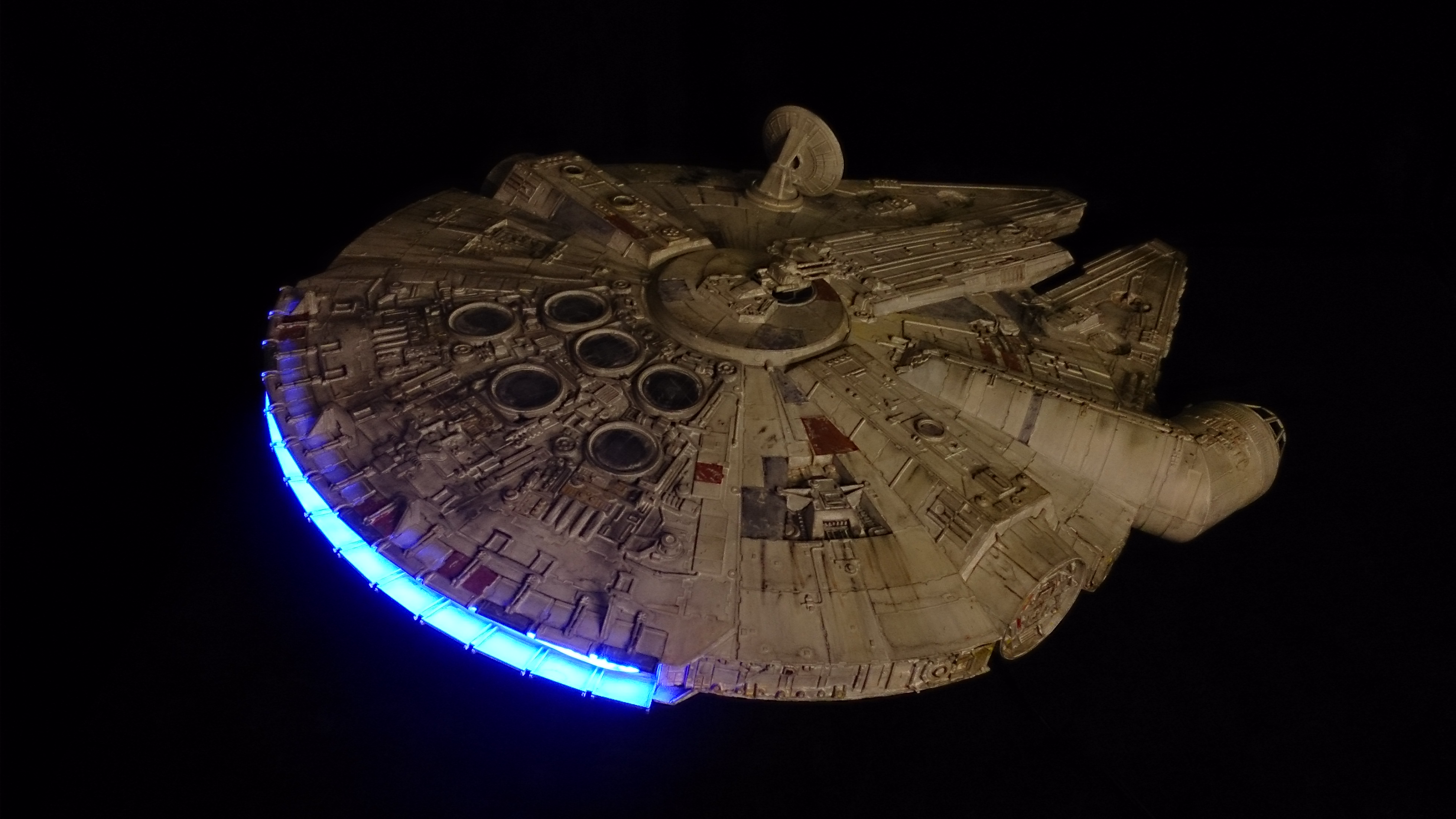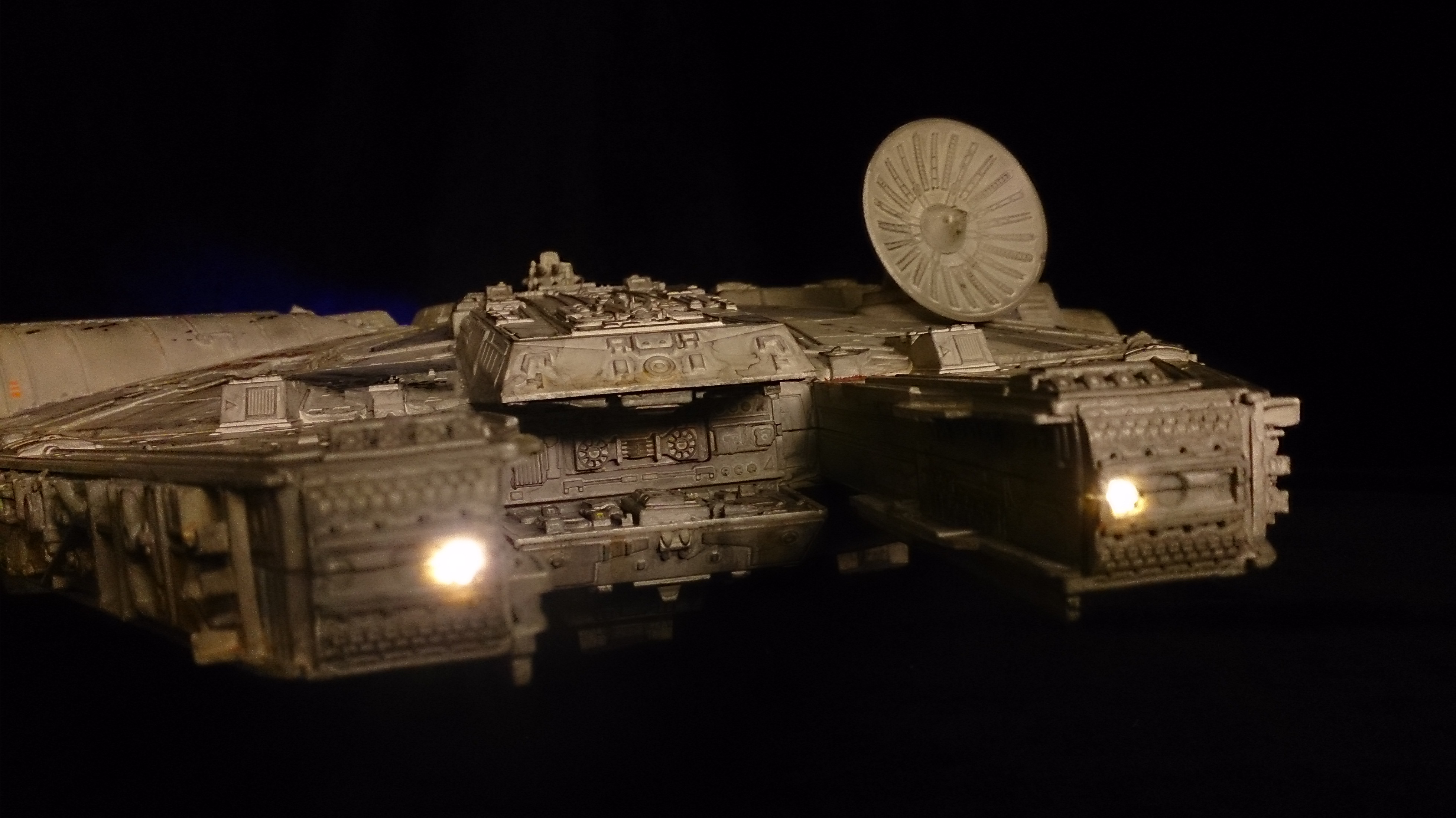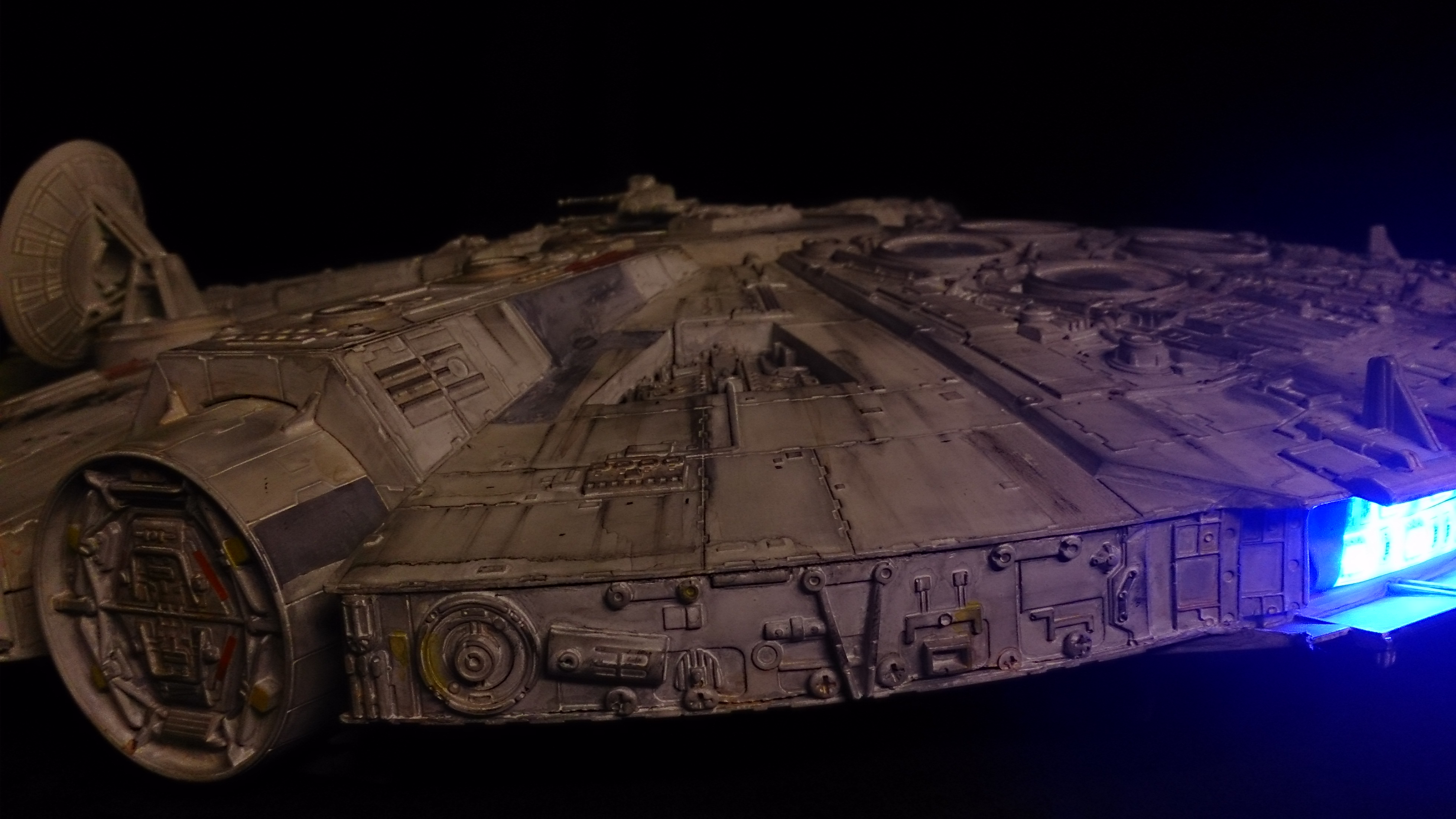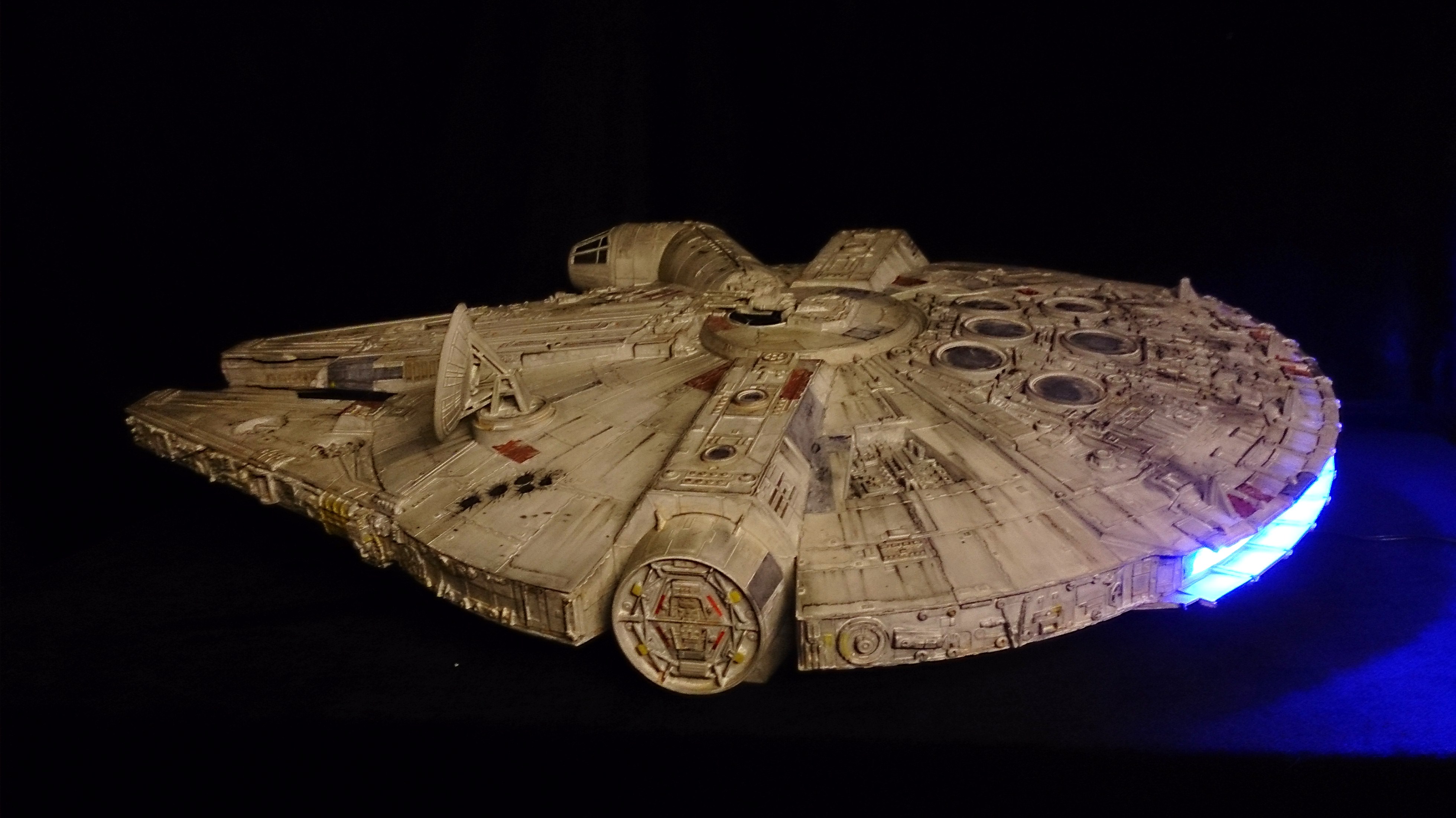 I now offer a DELUXE VERSION with LED lights in the rear hyperdirve , LED lights on the front plus new custom made movie style side panels kit bashed the original ILM way! it also now has Jaw box top, bottom and rear panels and 6 x engine grills added too. It comes with a stand and power supply and a very detailed weathered paint job.