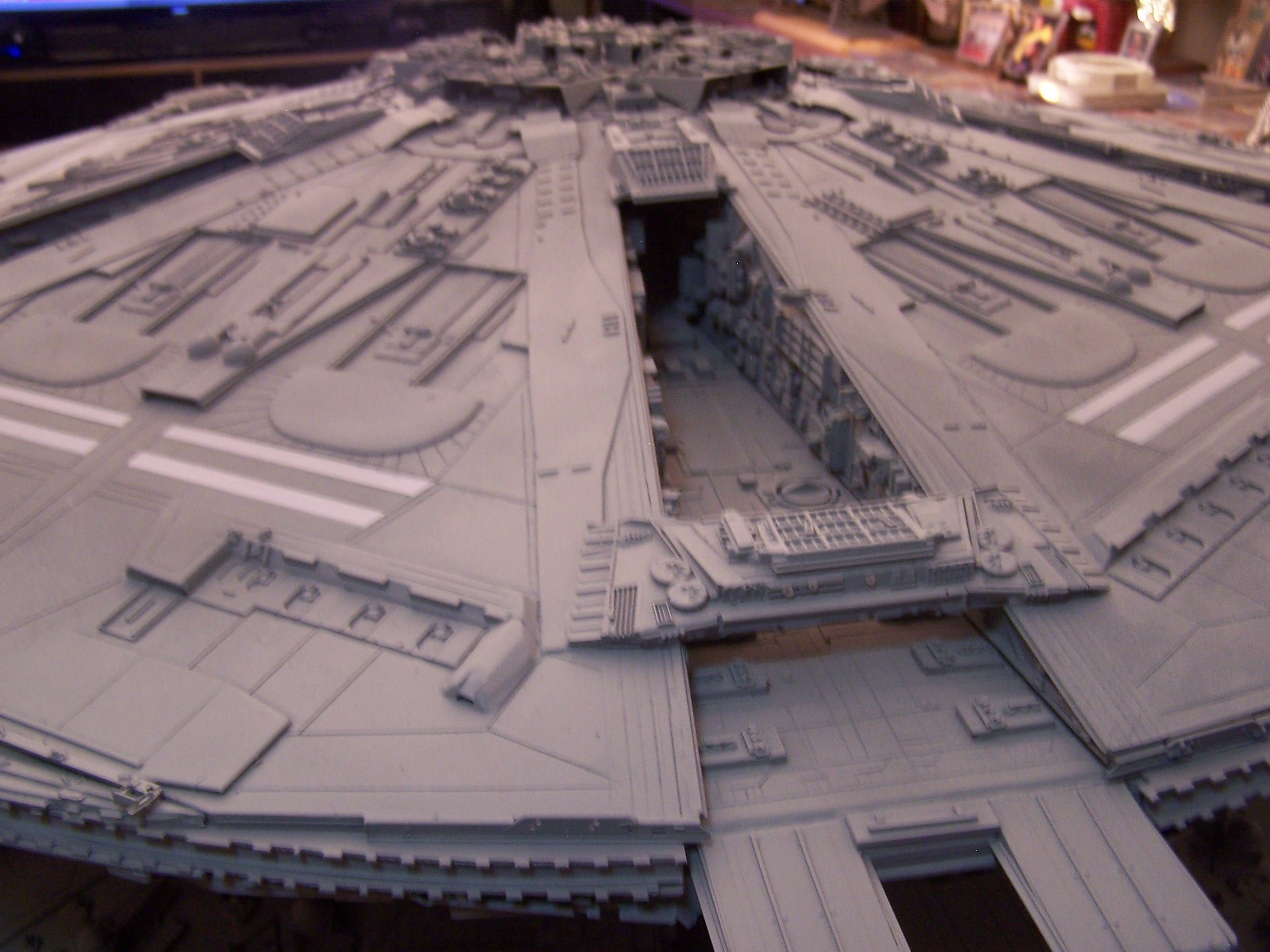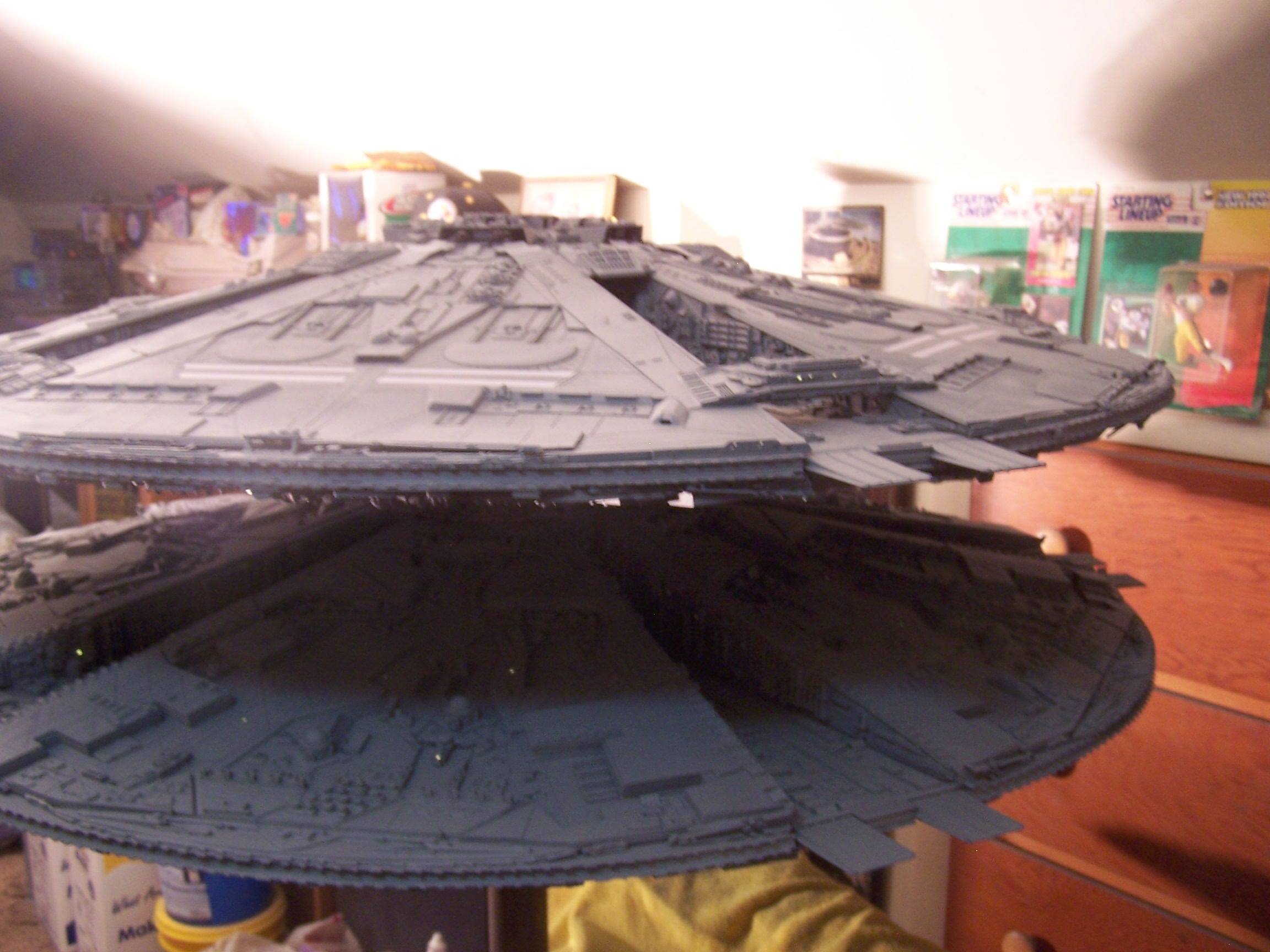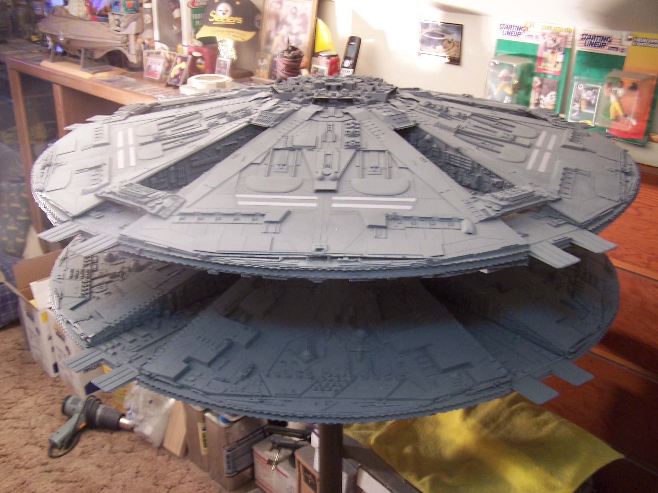 I present FOR SALE my scratch build of the Battlestar Galactica studio scale Basestar from the 1978-79 series and film. I didn’t do the astek paint scheme, and went with a darker shade of grey wanted to have it look more on screen most times it looked dark. Also, the bay area’s are a little narrow compared to the studio model. I have a sound card coming to make the engine noise for that correct display appeal.
