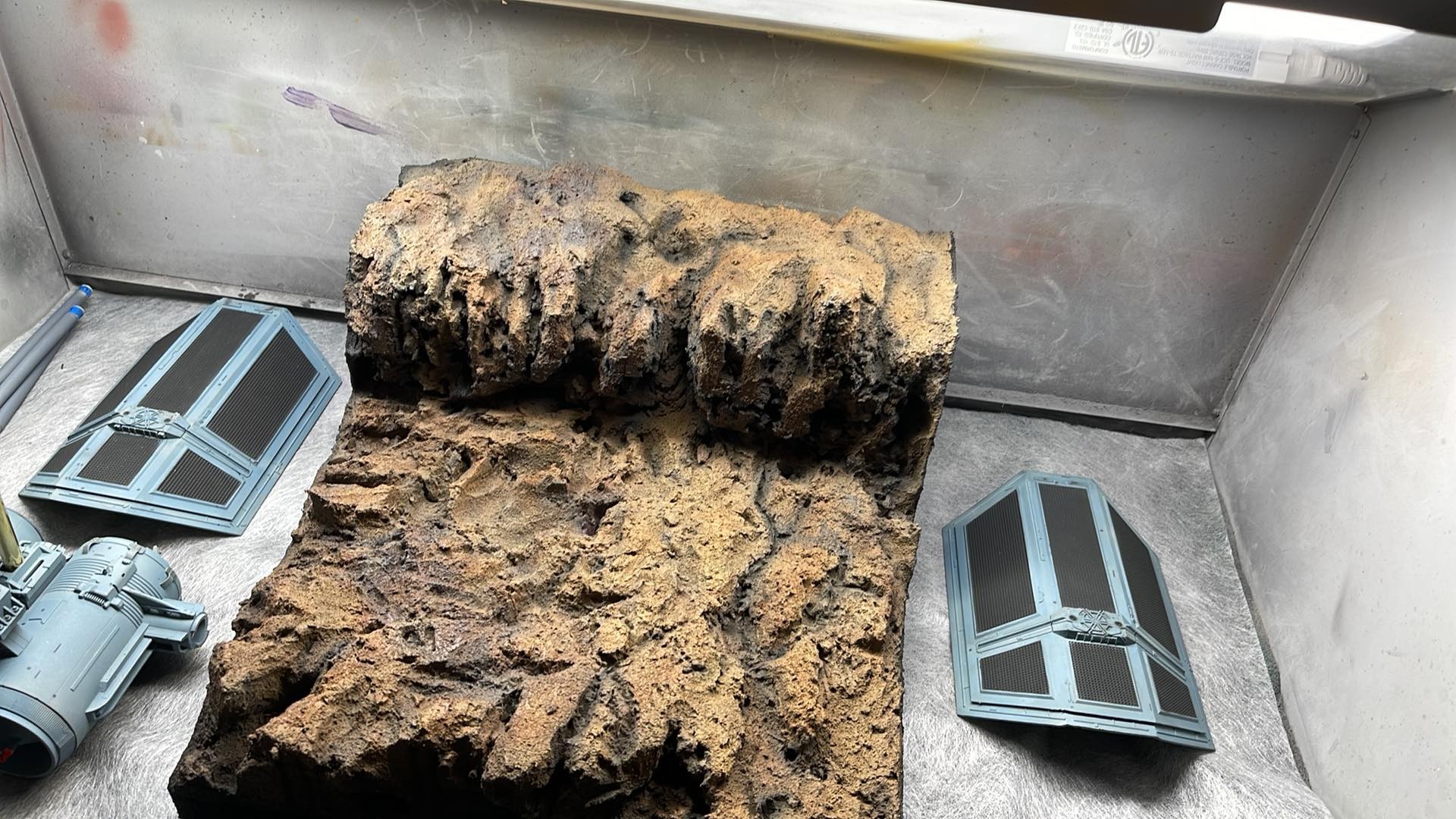 These are made to order. Please excuse the lighting in the room. All Archive X is used. Acrylic or Enamel customer’s choice. Engines are lit with leds and run off a 9v battery which is housed at the back of the model. Plaque is included. Studio Tie Bomber which is 1/48 as ilm used off the shelf MPC Vadar kit from ANH for the wing donors.
