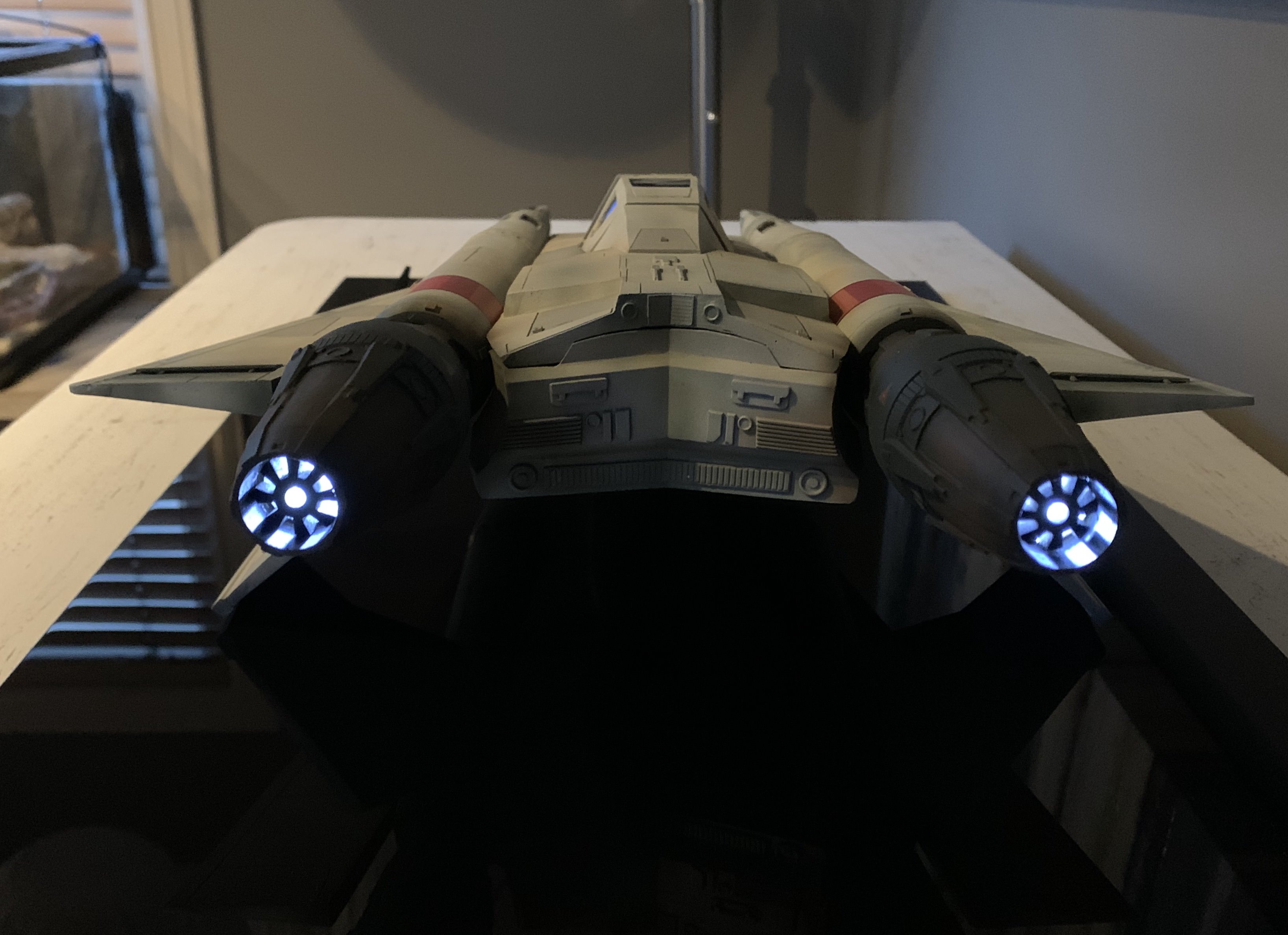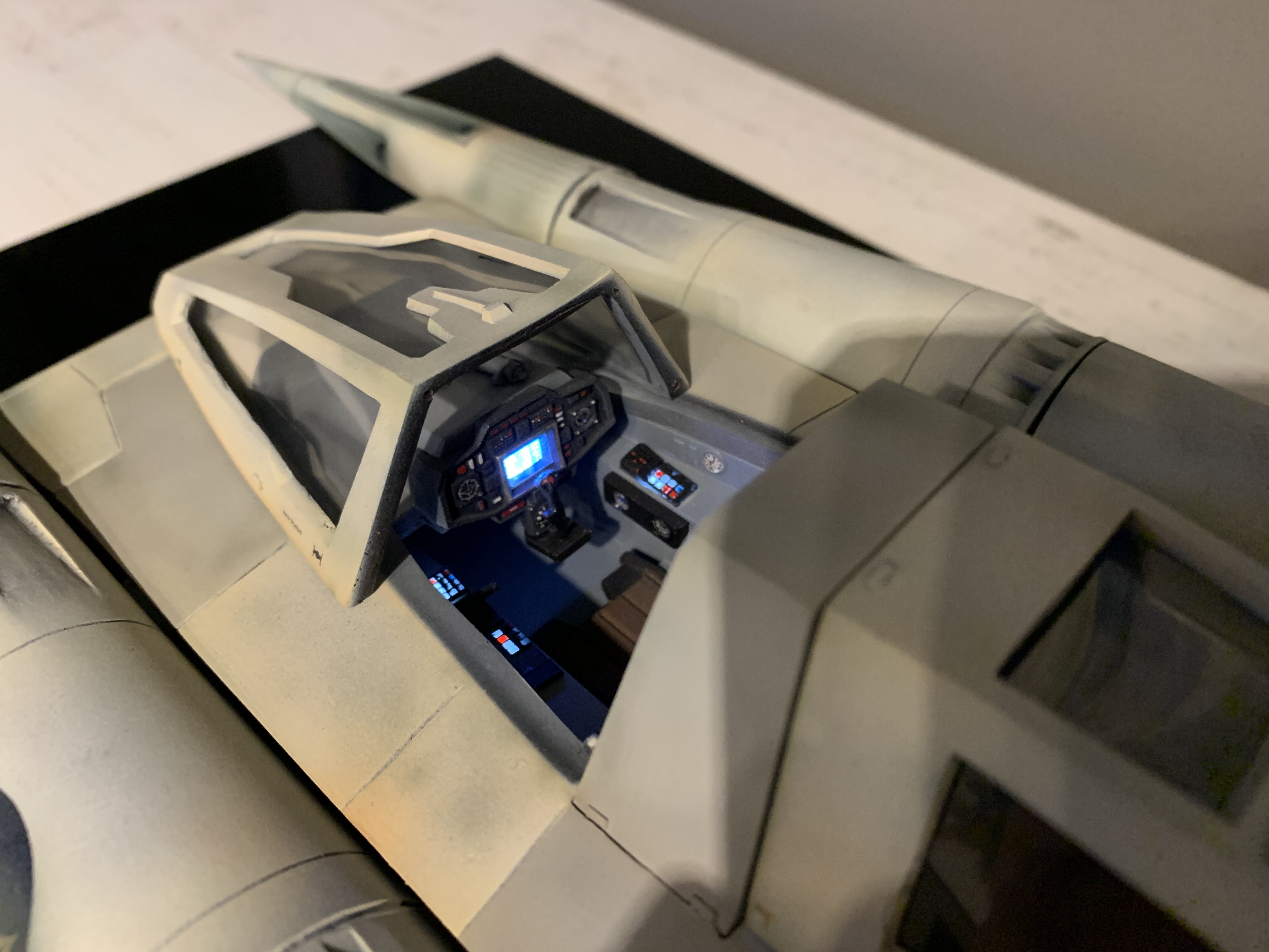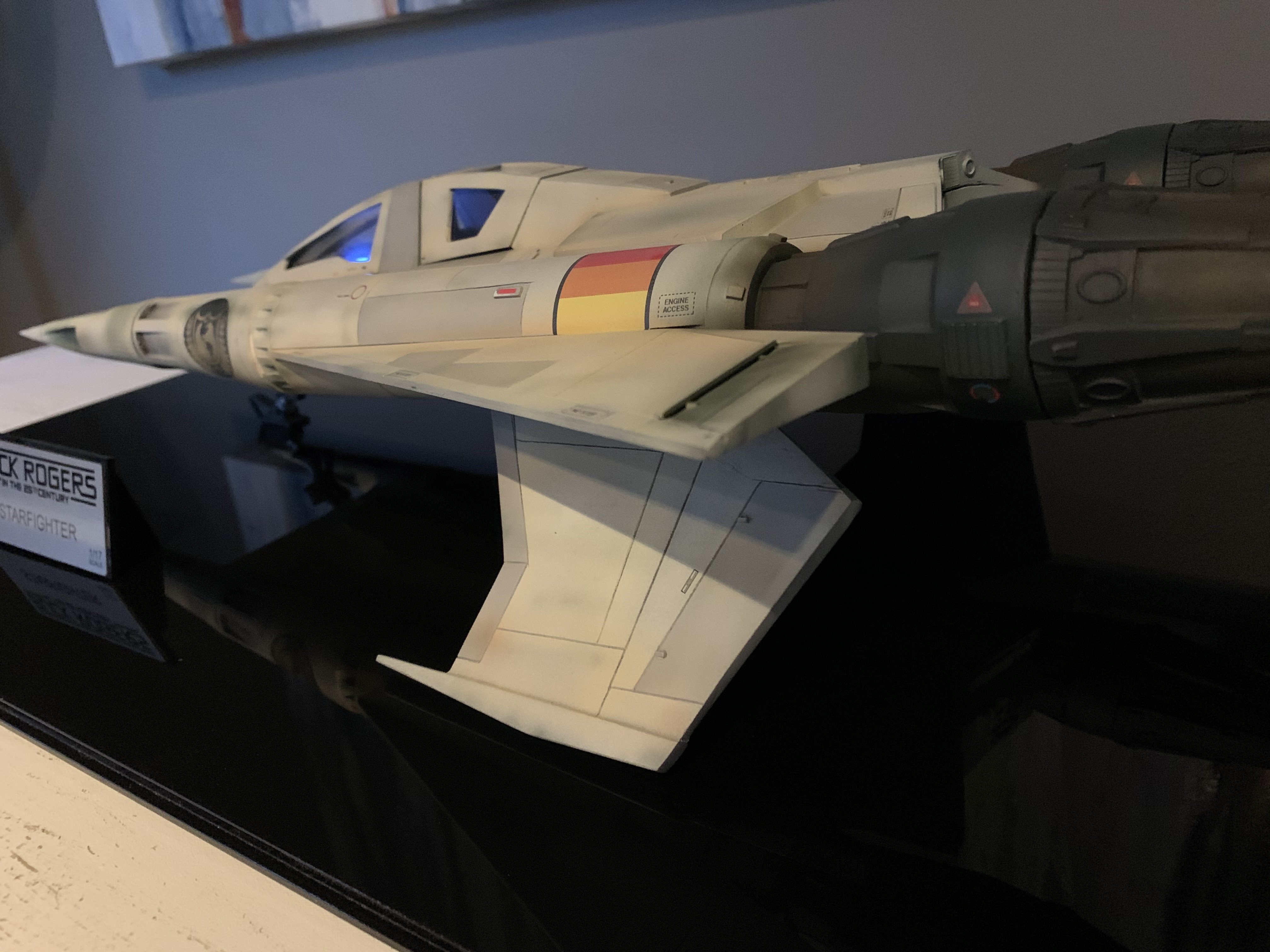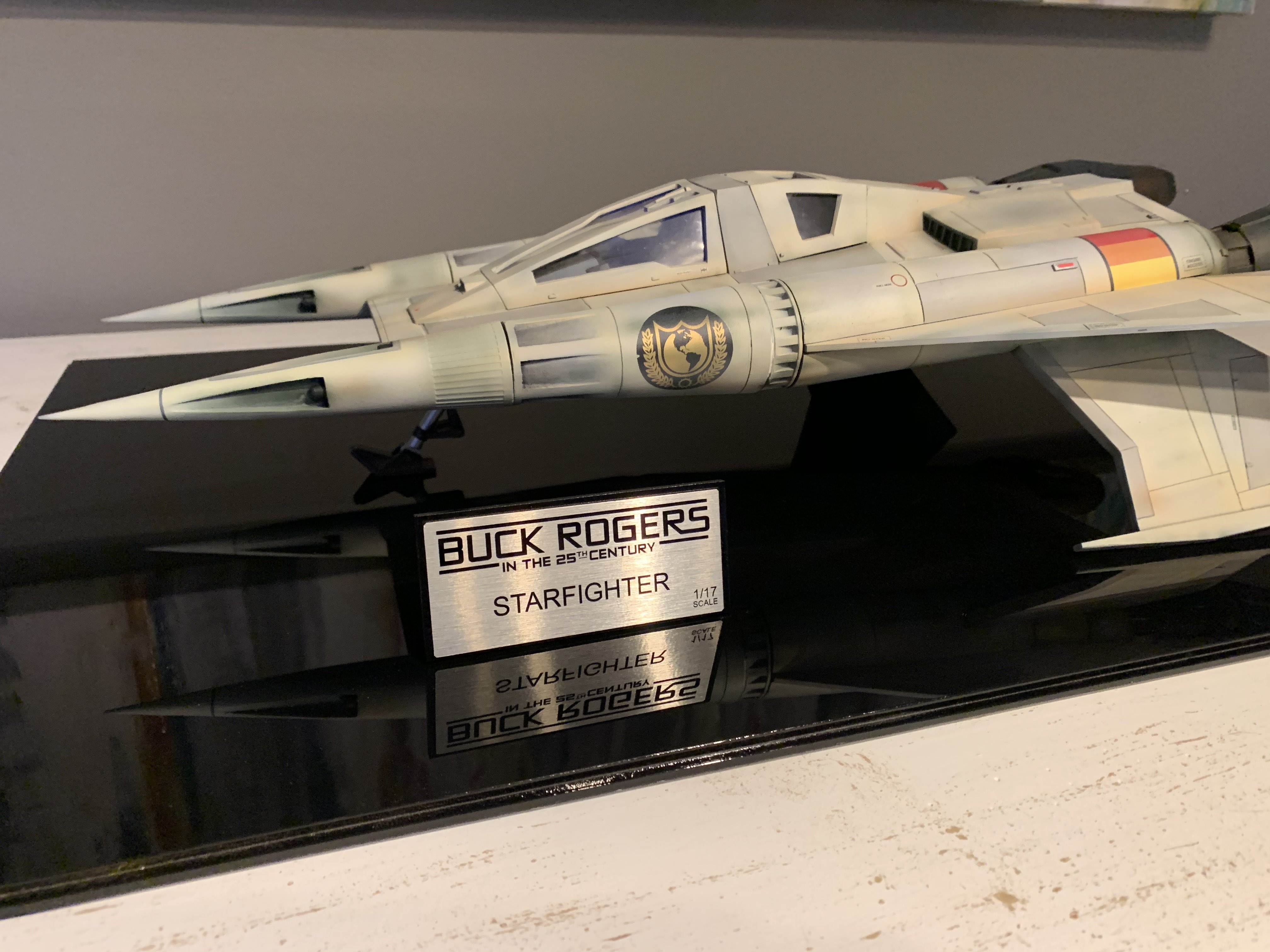 This is my version of Dynamic Digital Creations Buck Rogers Starfighter. It’s 1/17 scale and measures approx 22 inches long, 12 inches wide and 5 inches tall and is made from resin and some 3D printed parts. The engines light up along with cockpit buttons and main targeting screen that are powered by a 9 volt battery hidden behind the rear removable cover. All painted and weathered with Mission Models Premium Paints. I had a custom acrylic case and plaque made for this very cool design. I added a few additional touches that were not a part of the original kit such as extra panel lines, some small greeblies and additional detail to the rear portion of the side wings.