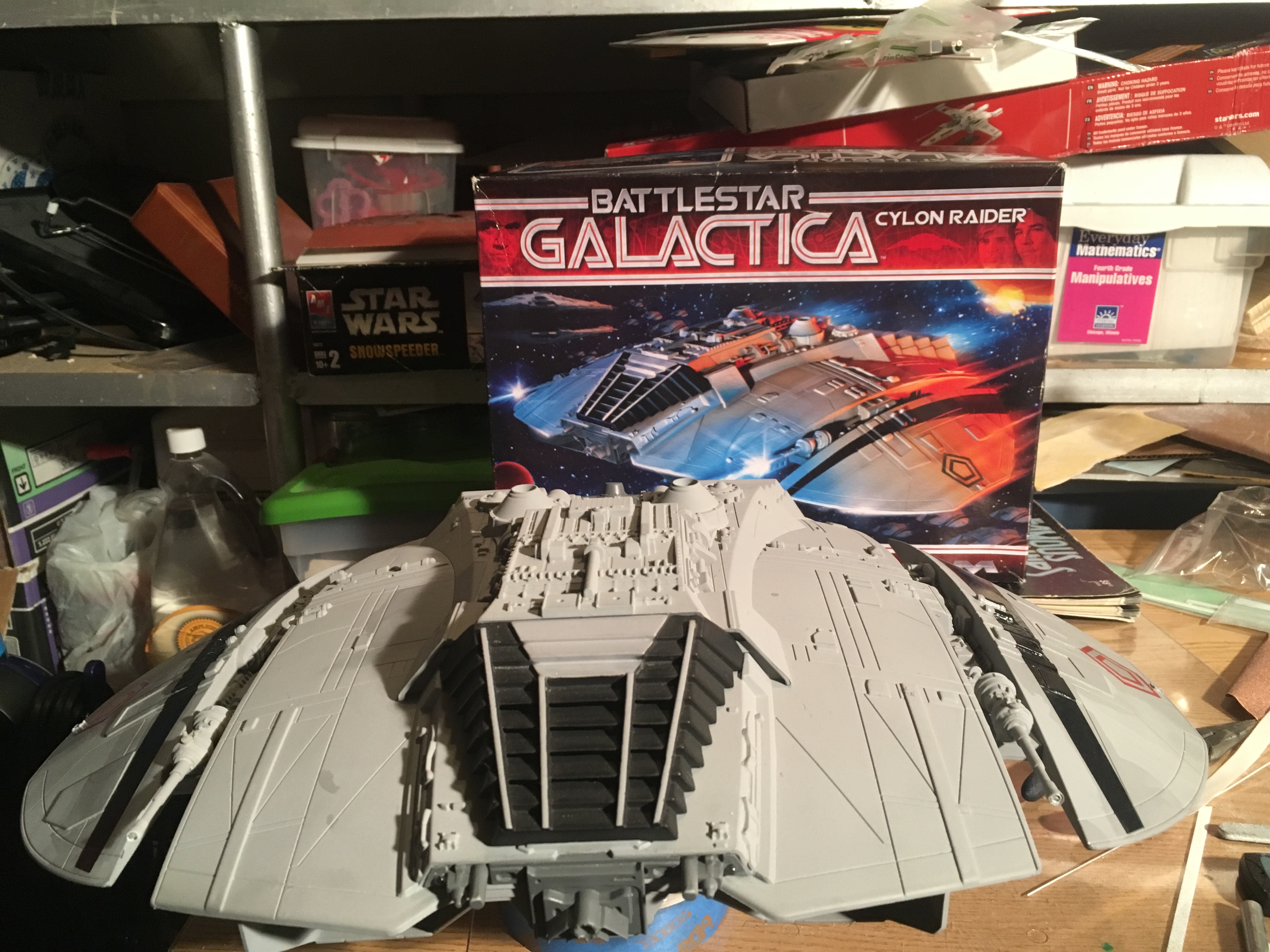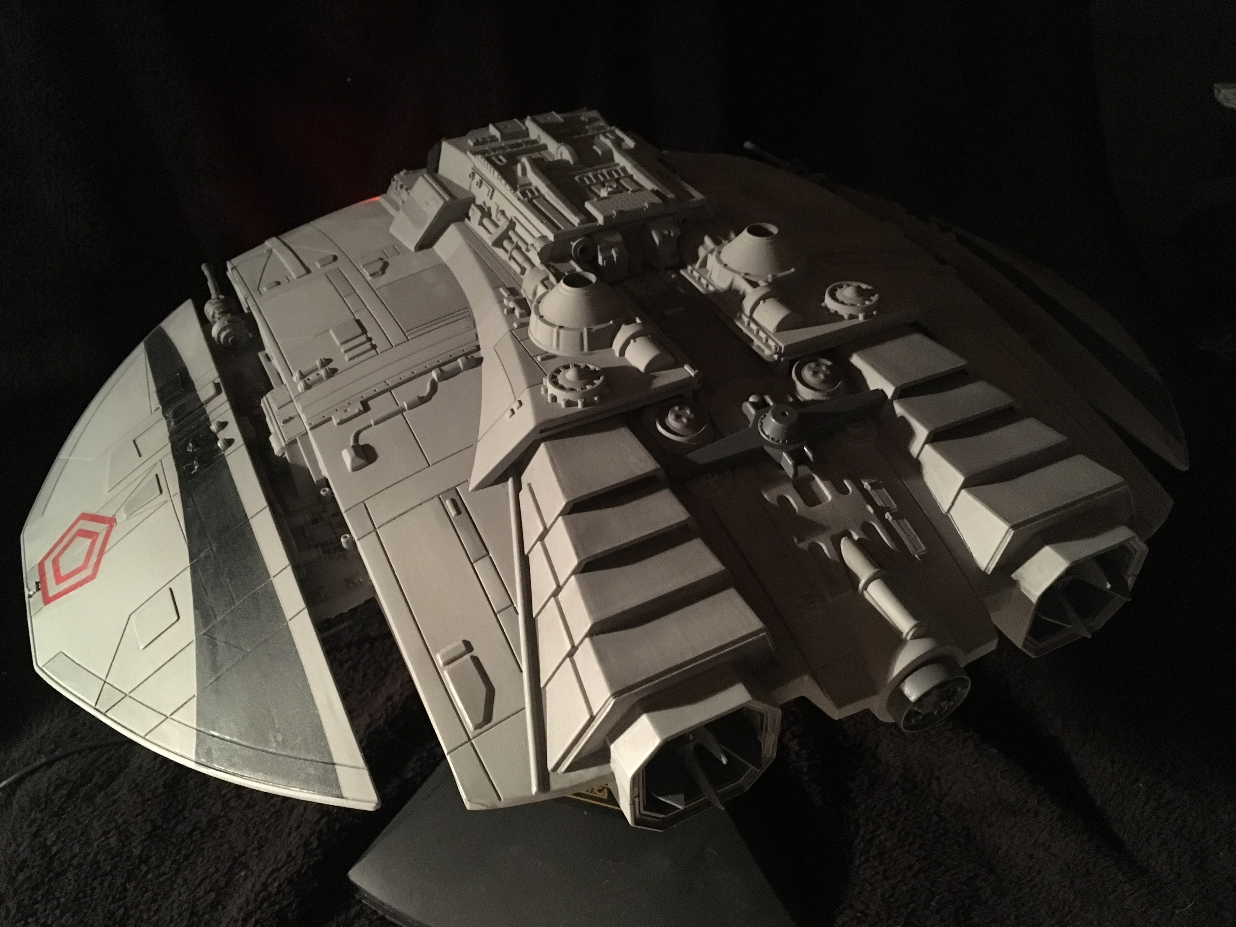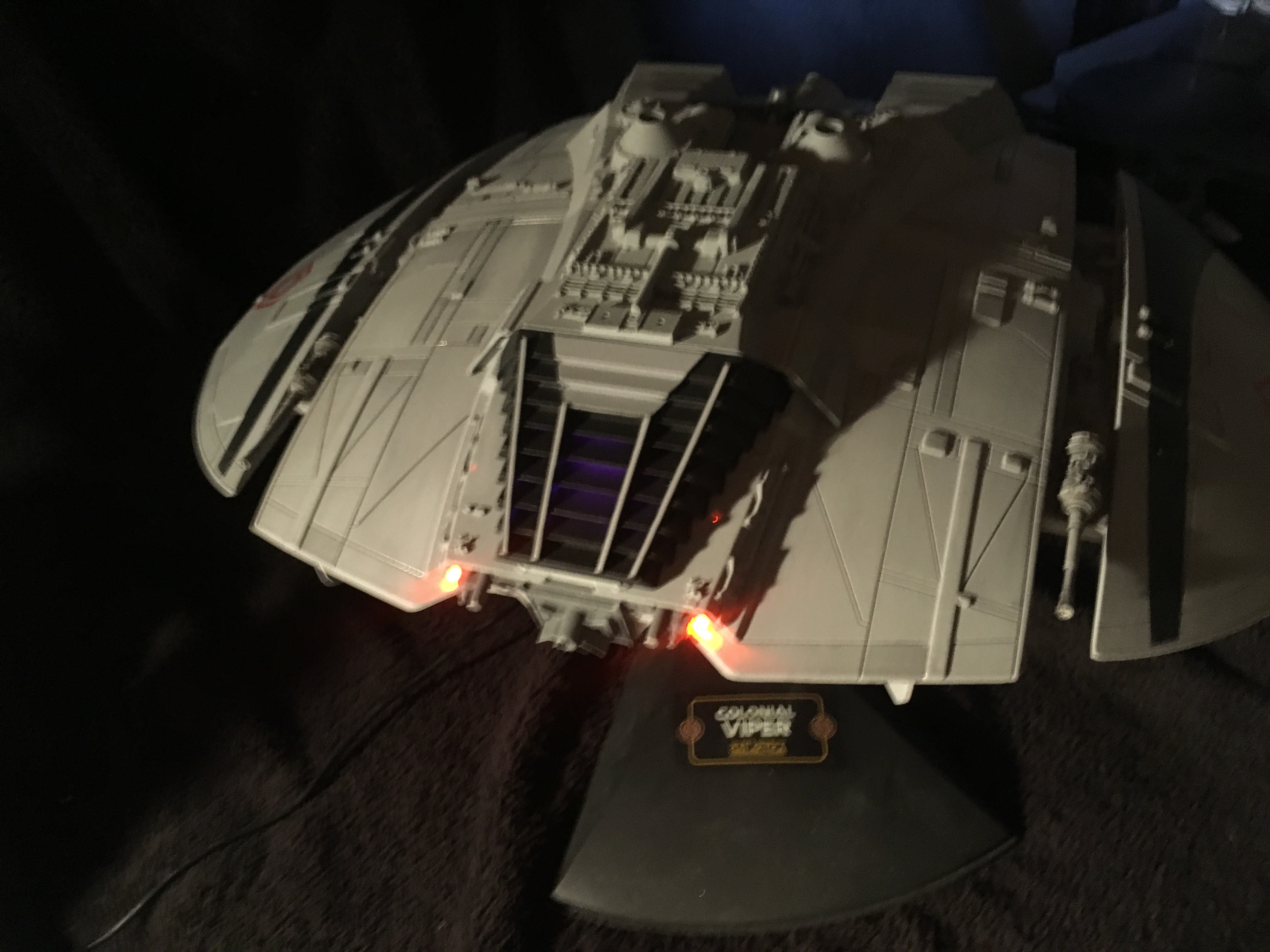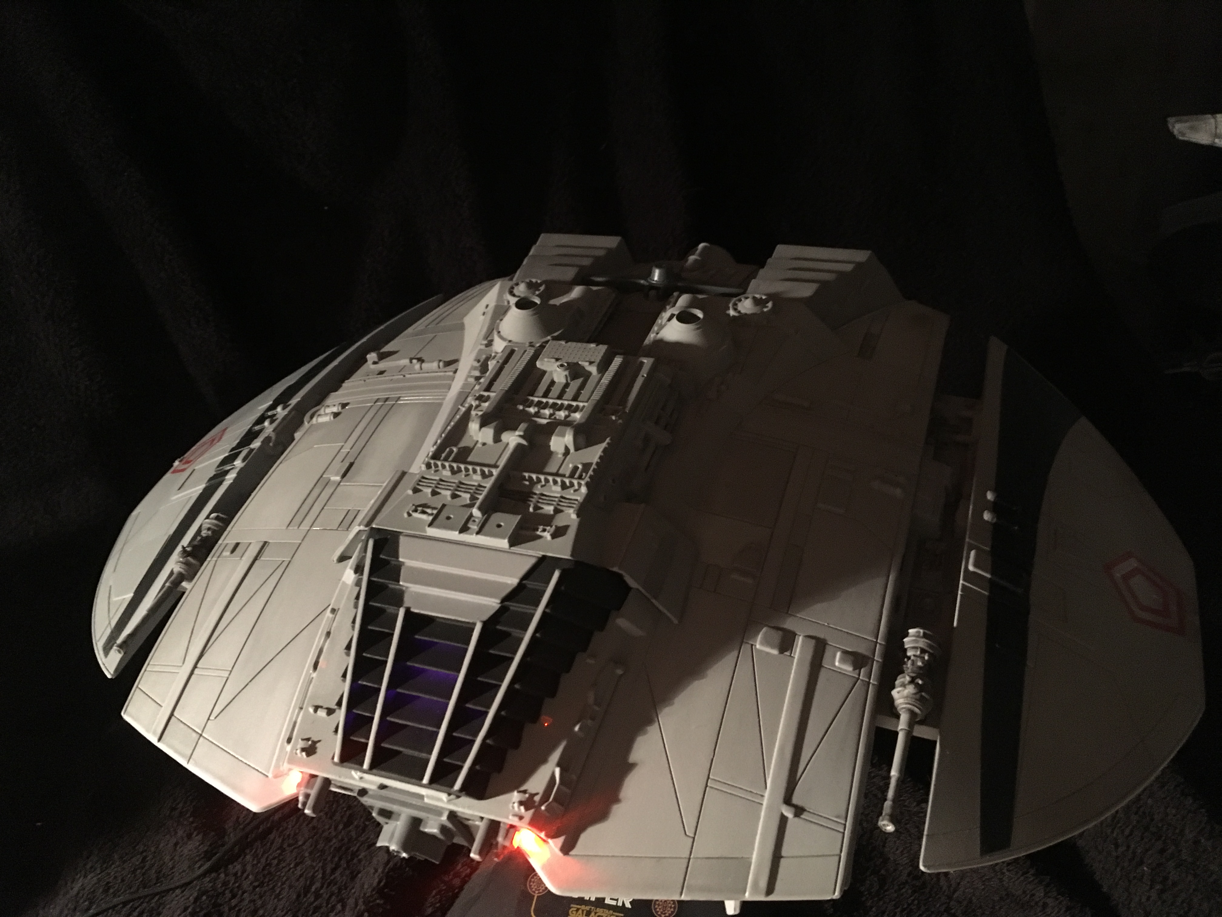 Kit Description: Here is a finished studio scale Cylon Raider. This one has lights, sound and resin centurion with rotating back-and-forth red eyes and resin