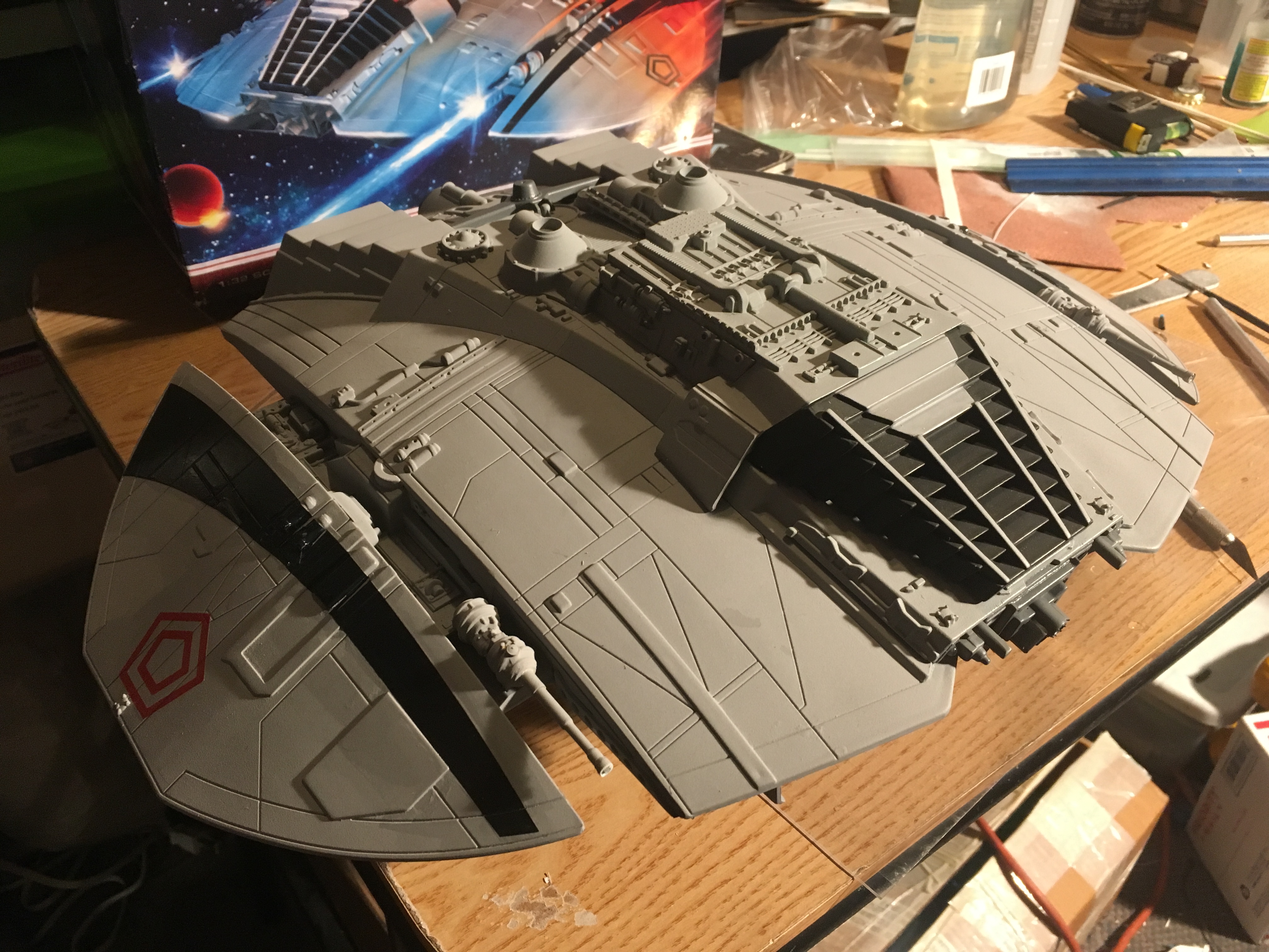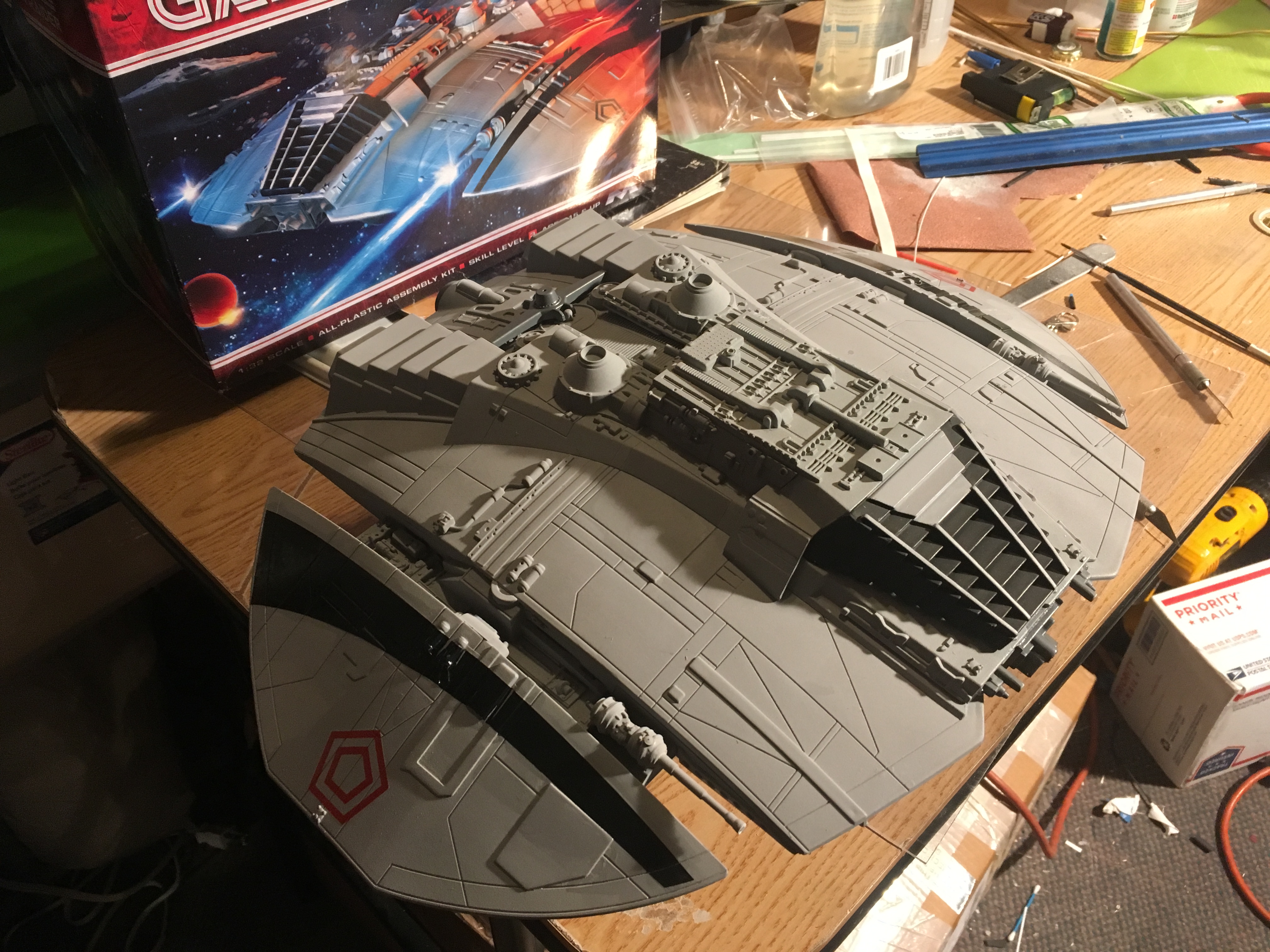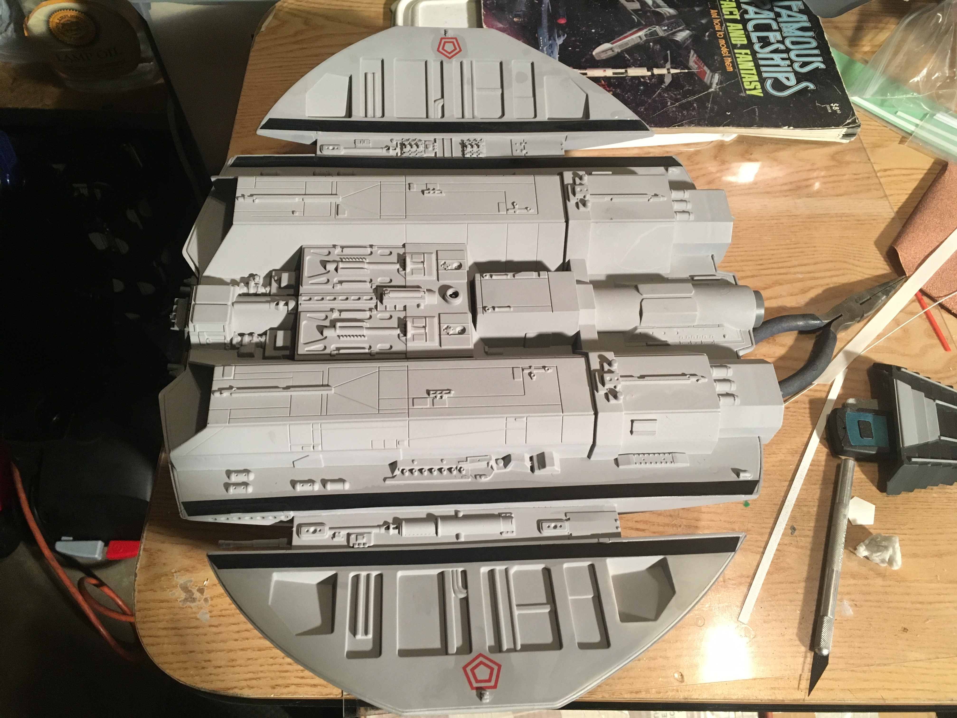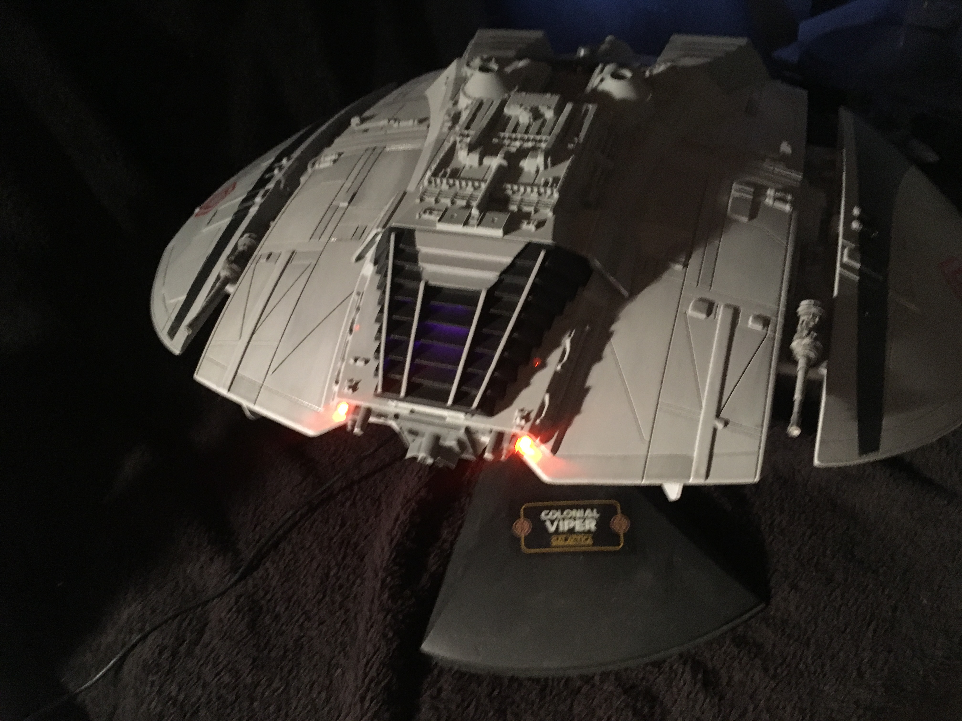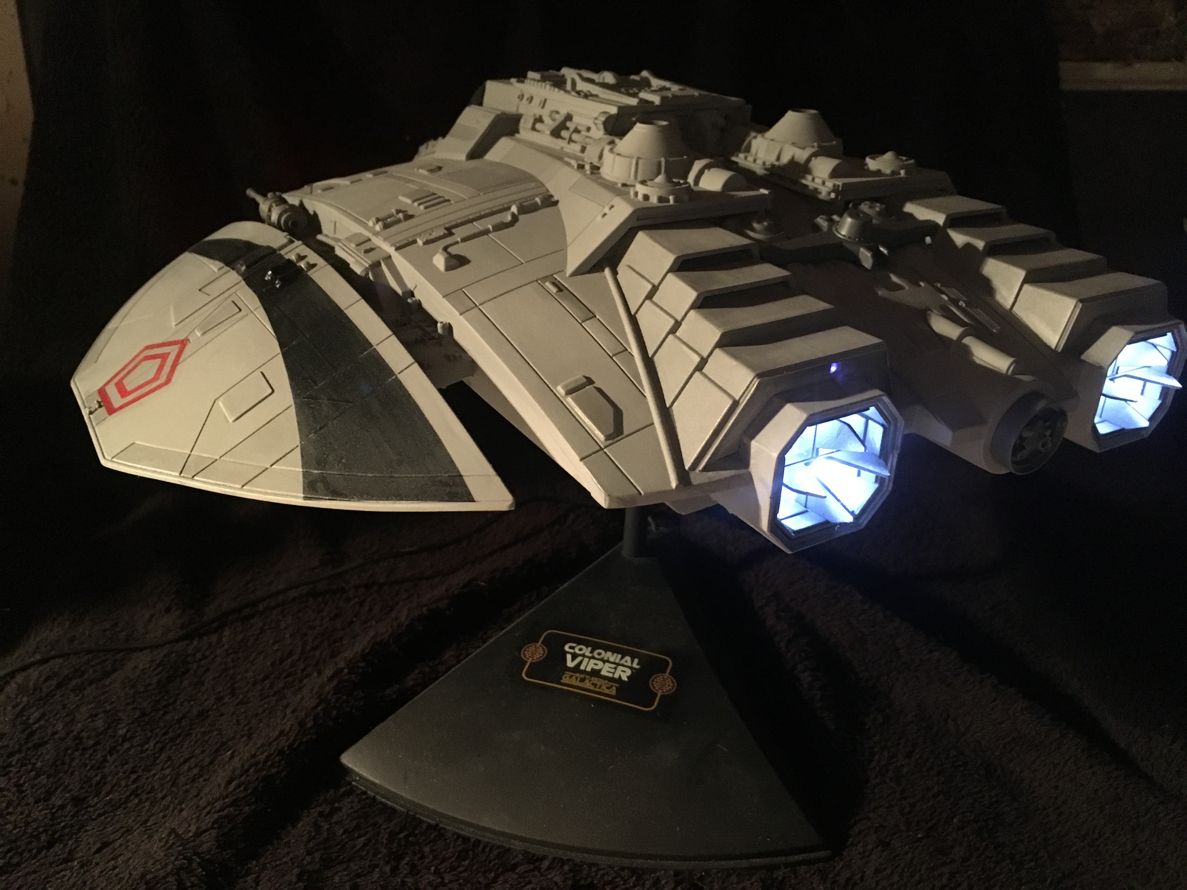 Kit Description: Here is a finished studio scale Cylon Raider. This one has lights, sound and resin centurion with rotating back-and-forth red eyes and resin