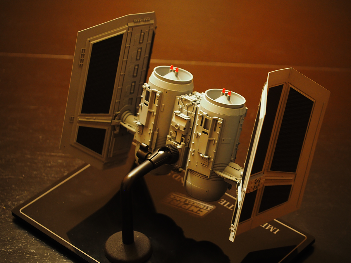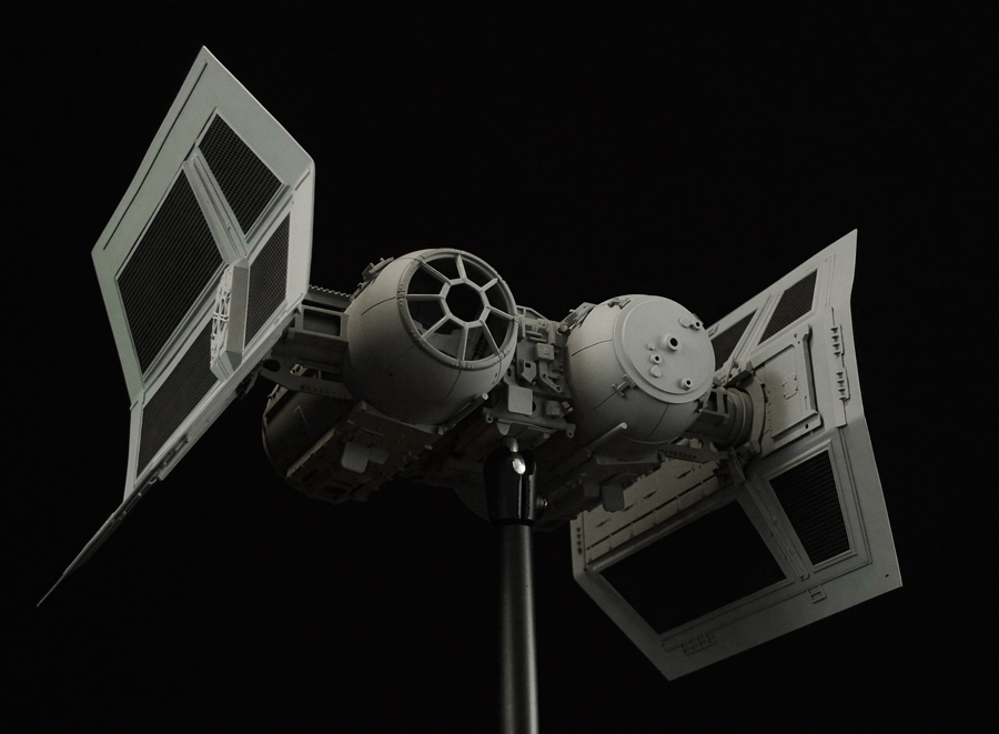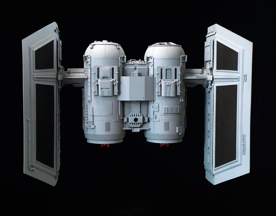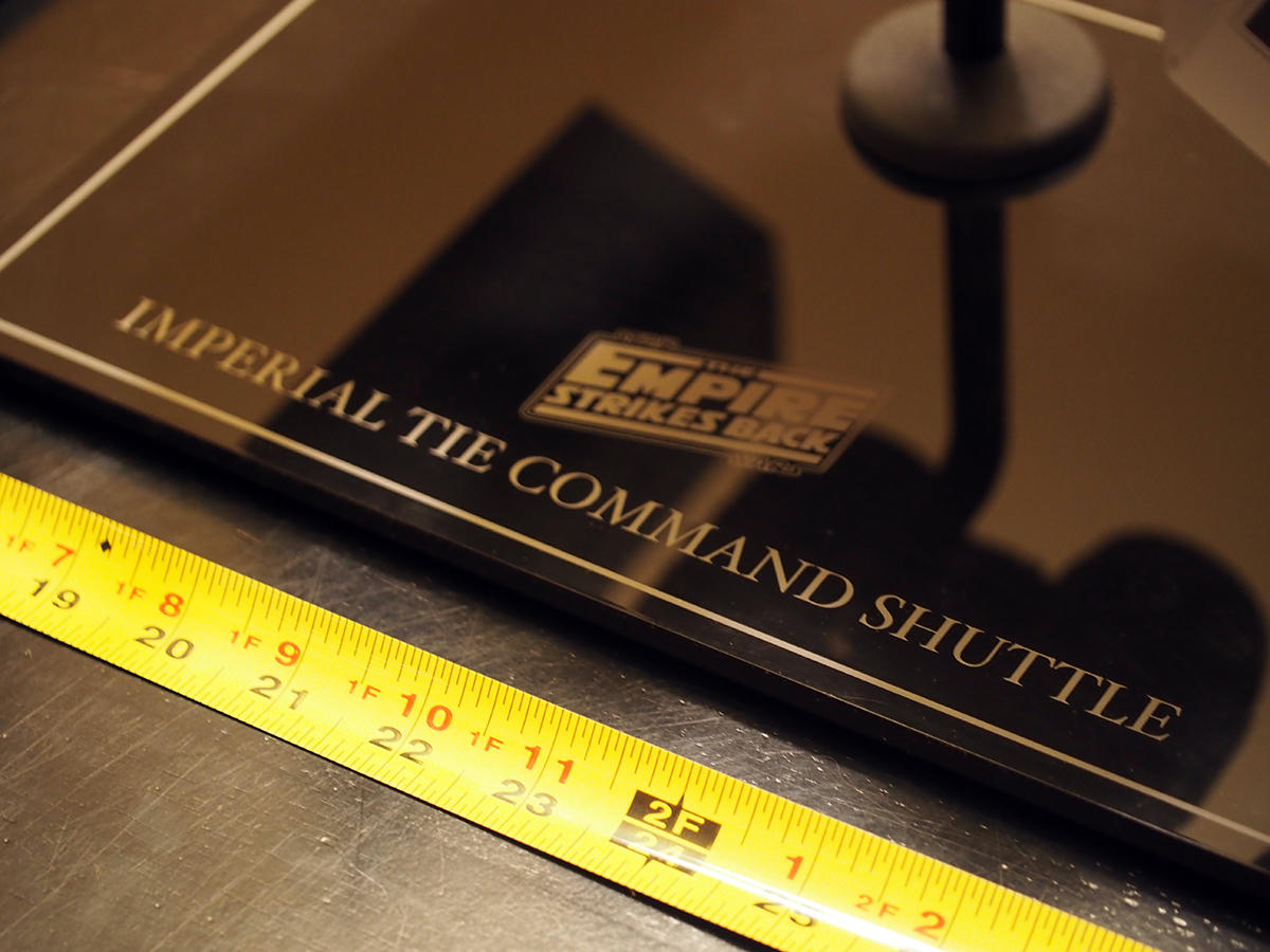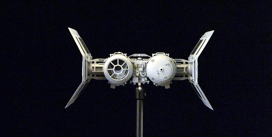 This is one of those rare instances where I was able to make things up within the “world of Star Wars” as I built a studio scale model, trying to think of how ILM would have constructed a riff on their TIE Bomber model. It all started when a discussion sprung up among friends about which models from the original Star Wars trilogy were left to document and build. Someone mentioned Needa’s Shuttle, which I must admit I didn’t even remember seeing. You see, about one hour and ten minutes into The Empire Strikes Back, we catch a glimpse of Captain Needa’s shuttle exiting a Star Destroyer and rocketing over to Vader’s Super Star Destroyer. It occurs between Yoda’s “That is why you fail” line and Vader’s “Apology accepted, Captain Needa” line. Most model fans agree that it was most likely the TIE Bomber model, with it’s wings flipped around (so that they angled outwards), but the resolution is so poor and the model is so small against the screen, it could be anything. The ever-well-connected-and-talented Gene Kozicki unearthed a storyboard that showed the Bomber model-esque configuration, which supports the theory. So as a fun exercise, a group of us (led by Gene) decided it would be fun to make our own shuttle models as a creative exercise. I got a little carried away, using all styrene and machined pieces in conjunction with lasercut wing extensions, with the model and firmly mounted to an adjustable rod on a laser etched display base. A price of $1,600 was realized and this piece now resides in the collection of David Adami.