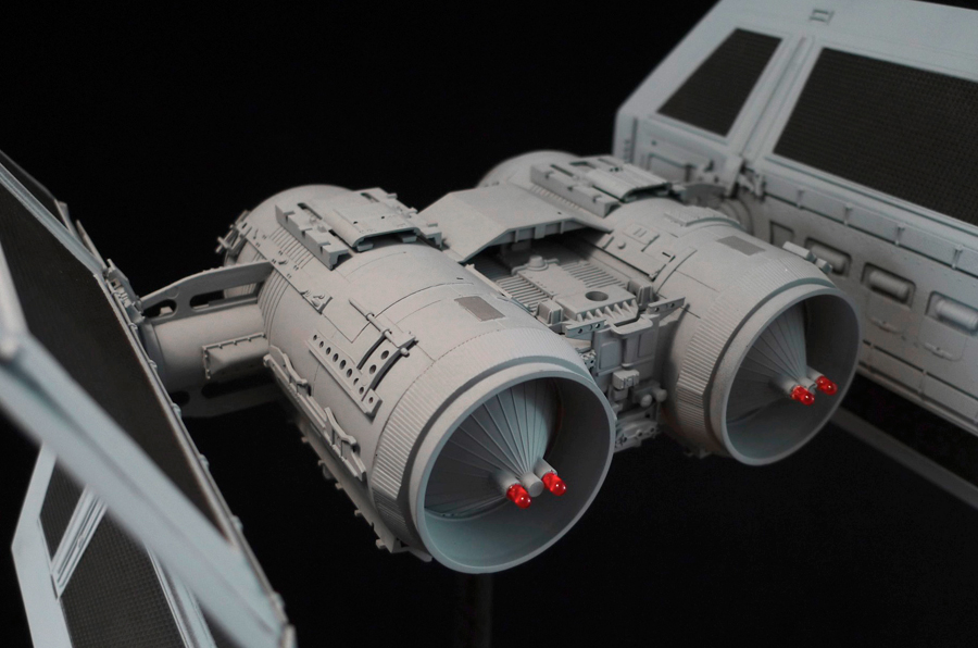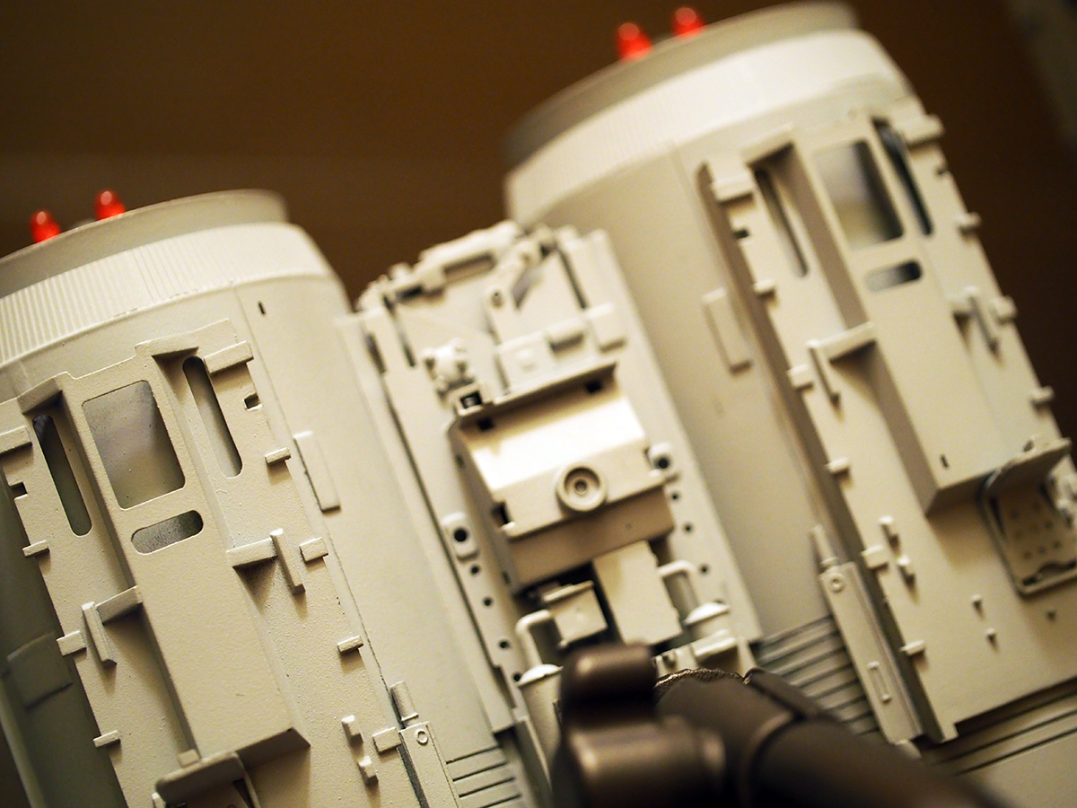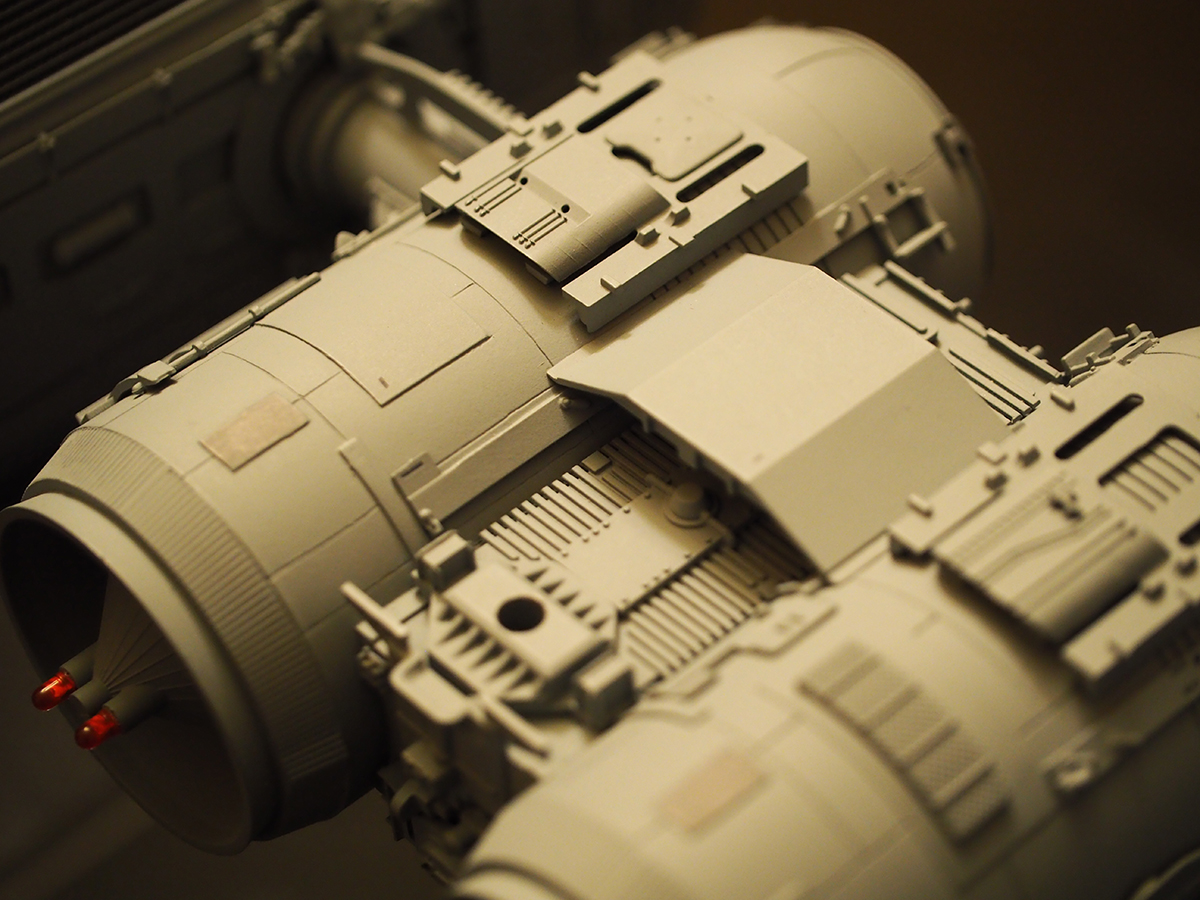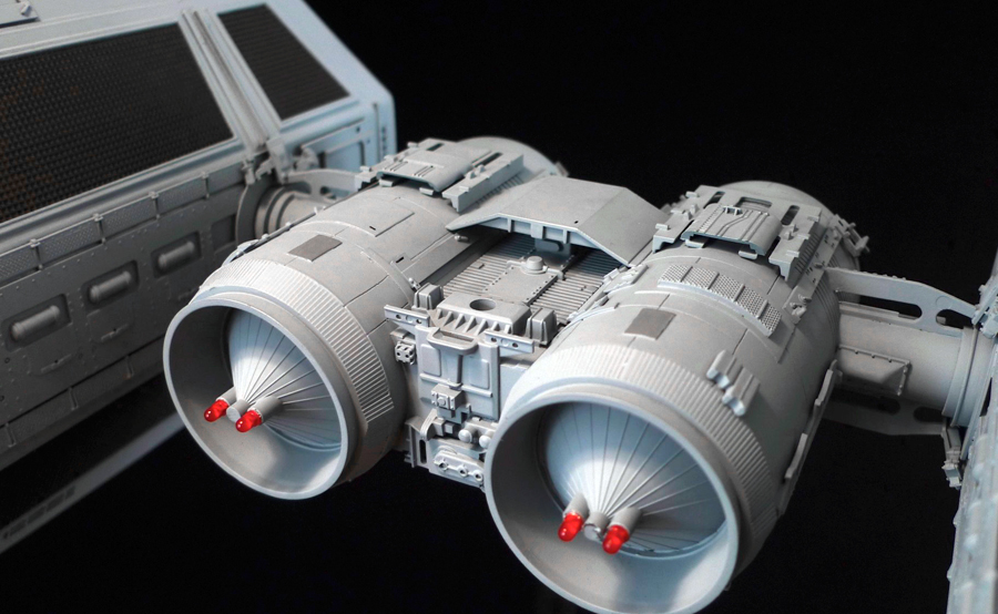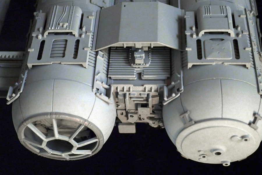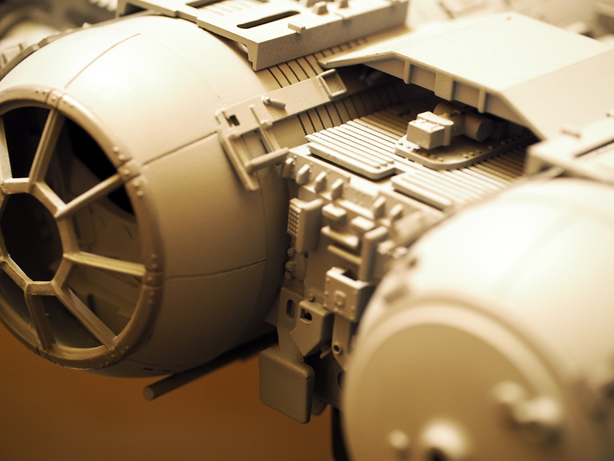 This is one of those rare instances where I was able to make things up within the “world of Star Wars” as I built a studio scale model, trying to think of how ILM would have constructed a riff on their TIE Bomber model. It all started when a discussion sprung up among friends about which models from the original Star Wars trilogy were left to document and build. Someone mentioned Needa’s Shuttle, which I must admit I didn’t even remember seeing. You see, about one hour and ten minutes into The Empire Strikes Back, we catch a glimpse of Captain Needa’s shuttle exiting a Star Destroyer and rocketing over to Vader’s Super Star Destroyer. It occurs between Yoda’s “That is why you fail” line and Vader’s “Apology accepted, Captain Needa” line. Most model fans agree that it was most likely the TIE Bomber model, with it’s wings flipped around (so that they angled outwards), but the resolution is so poor and the model is so small against the screen, it could be anything. The ever-well-connected-and-talented Gene Kozicki unearthed a storyboard that showed the Bomber model-esque configuration, which supports the theory. So as a fun exercise, a group of us (led by Gene) decided it would be fun to make our own shuttle models as a creative exercise. I got a little carried away, using all styrene and machined pieces in conjunction with lasercut wing extensions, with the model and firmly mounted to an adjustable rod on a laser etched display base. A price of $1,600 was realized and this piece now resides in the collection of David Adami.