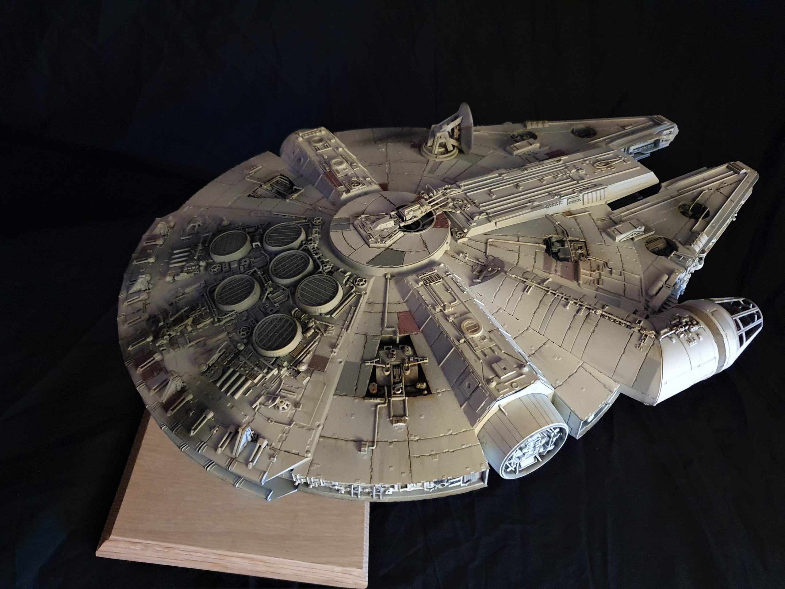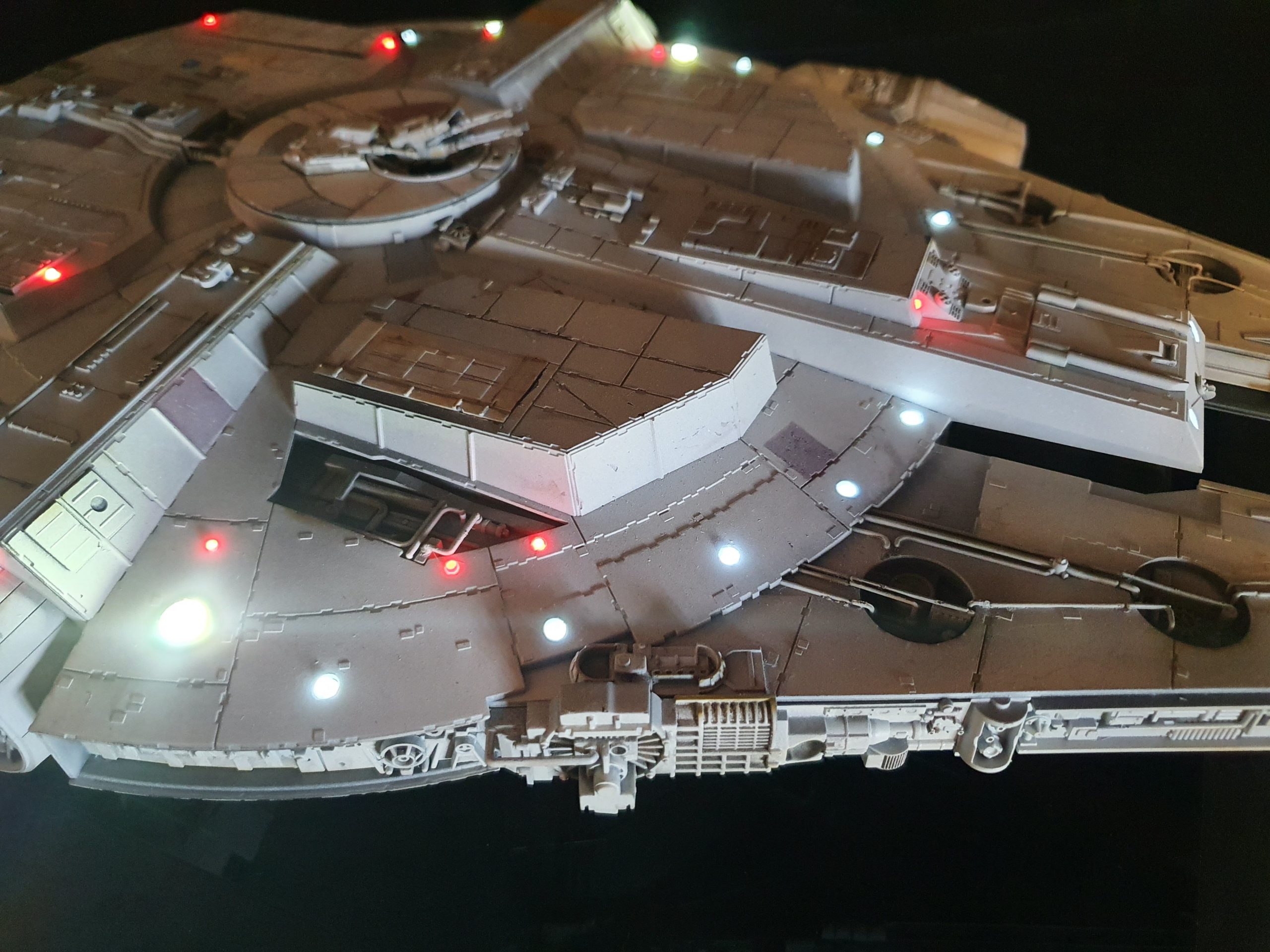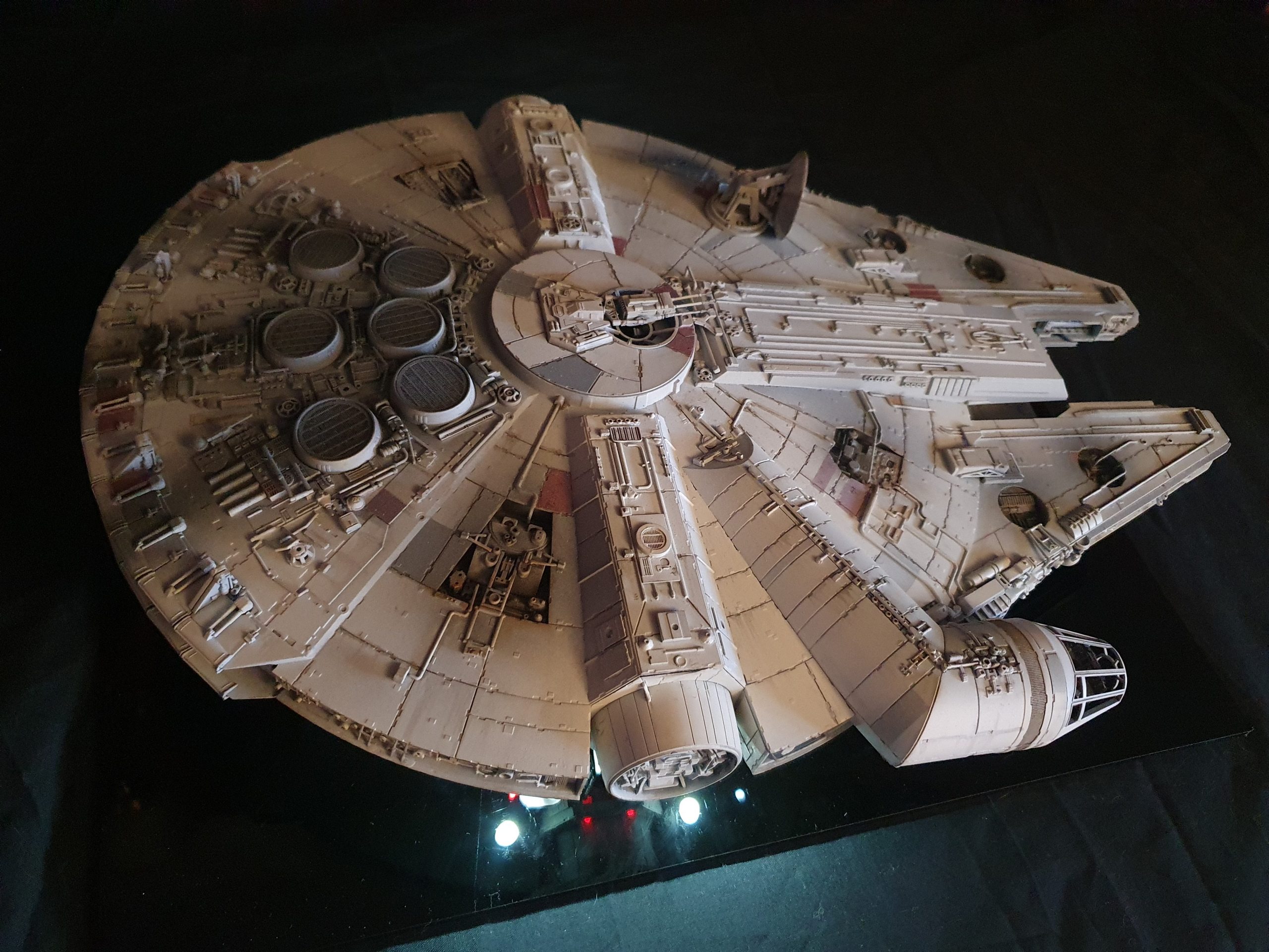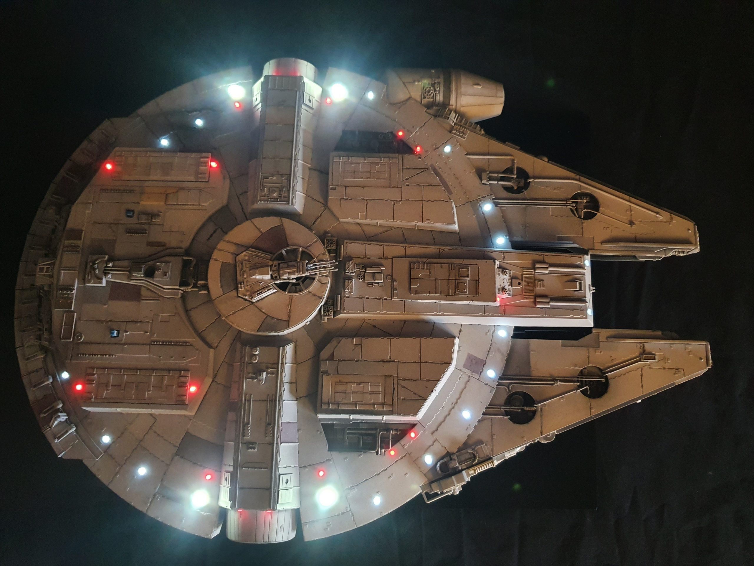 A 1/72 Fine Molds Millennium Falcon, fully lit and also includes the landing lights and collision light son the underside of the ship. The engines, cockpit, front lights and gun wells are lit separately to the landing lights and there are 2 separate push button switches on the underside of the model to activate these. The model is battery powered by two 12v 23a batteries, one for each circuit. The Falcon can be set in either landed configuration or there is a Panavise mount for flight configuration. The batteries are held in using strong earth magnets in the rear landing bays. The landing gear and covers are interchangeable so you can decide how you best want to display the model. Chewie and C3PO are in the cockpit and Luke and Han are manning the quad lasers in the lit gun wells, naturally the fastest hunk of junk is well weathered! The photoetched set from Paragrafix and the solo resin factory upgrade parts have also been used to make the display. I am also going to include a Bandai 1/48 Snowspeeder and a Revell 1/50 T-70 resistance X-Wing free with the sale .