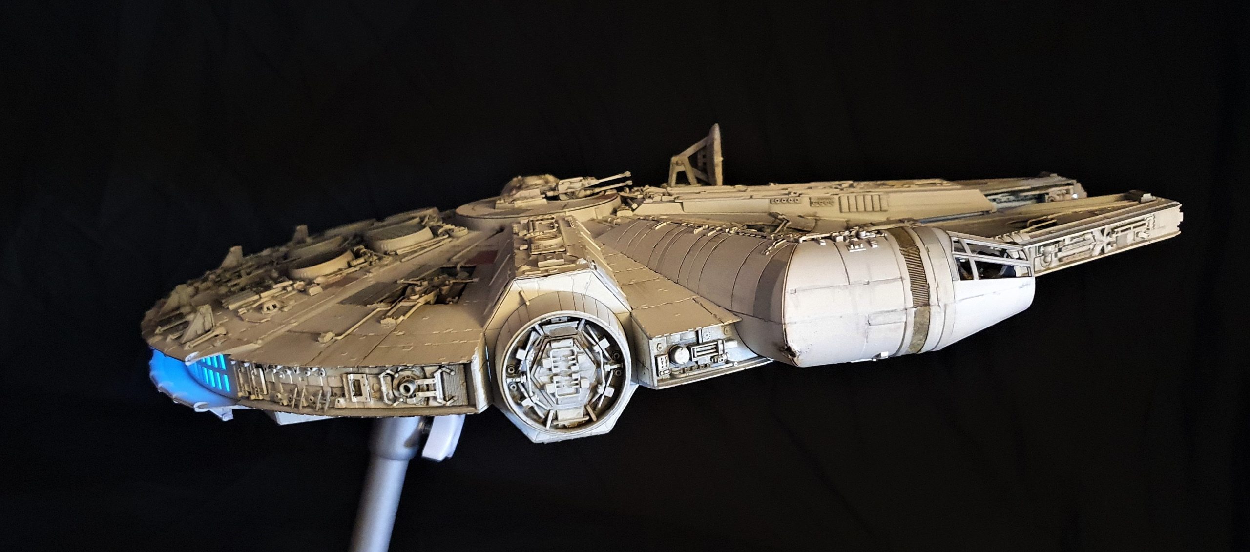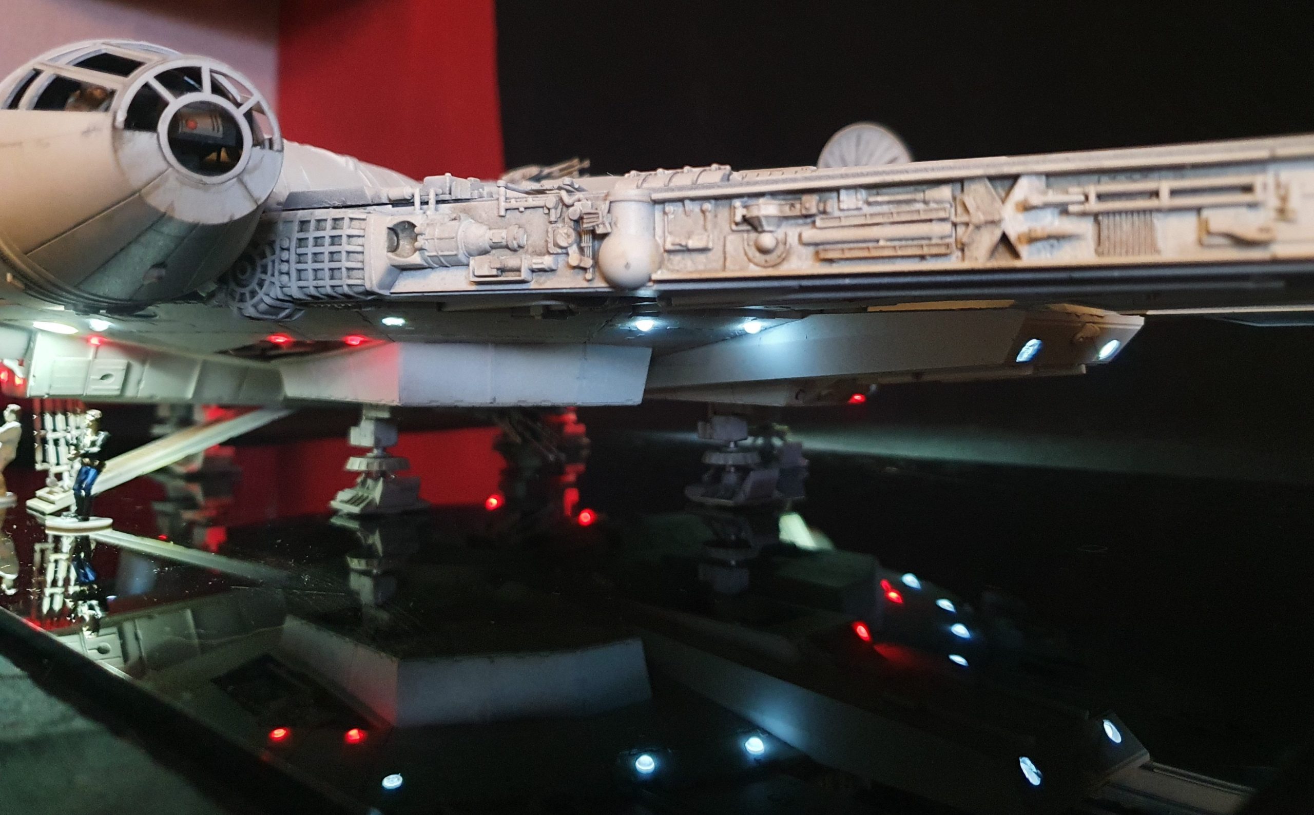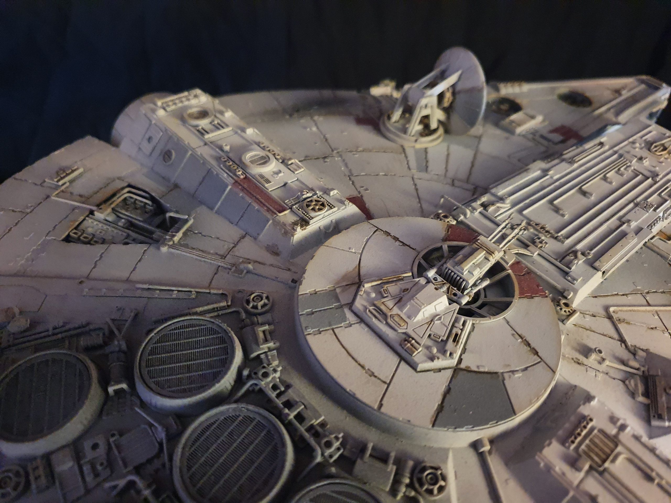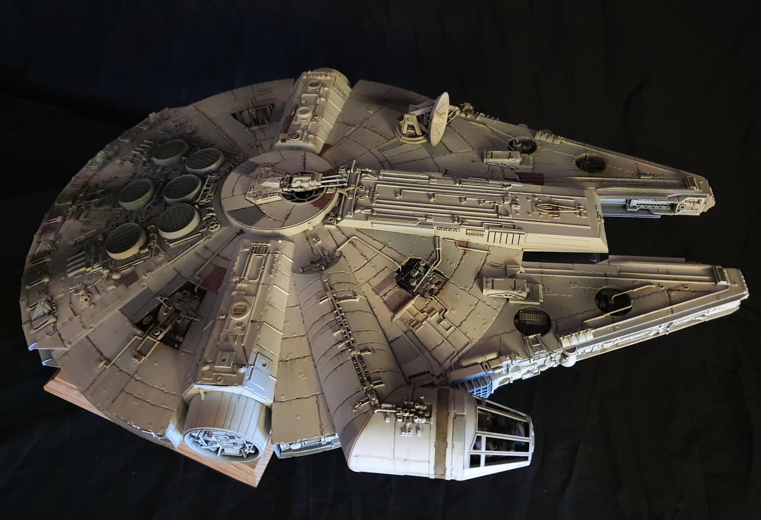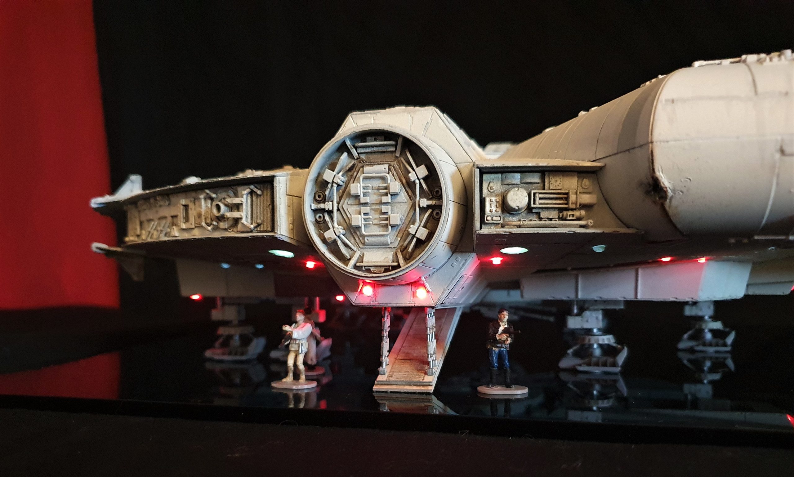 A 1/72 Fine Molds Millennium Falcon, fully lit and also includes the landing lights and collision light son the underside of the ship. The engines, cockpit, front lights and gun wells are lit separately to the landing lights and there are 2 separate push button switches on the underside of the model to activate these. The model is battery powered by two 12v 23a batteries, one for each circuit. The Falcon can be set in either landed configuration or there is a Panavise mount for flight configuration. The batteries are held in using strong earth magnets in the rear landing bays. The landing gear and covers are interchangeable so you can decide how you best want to display the model. Chewie and C3PO are in the cockpit and Luke and Han are manning the quad lasers in the lit gun wells, naturally the fastest hunk of junk is well weathered! The photoetched set from Paragrafix and the solo resin factory upgrade parts have also been used to make the display. I am also going to include a Bandai 1/48 Snowspeeder and a Revell 1/50 T-70 resistance X-Wing free with the sale .
