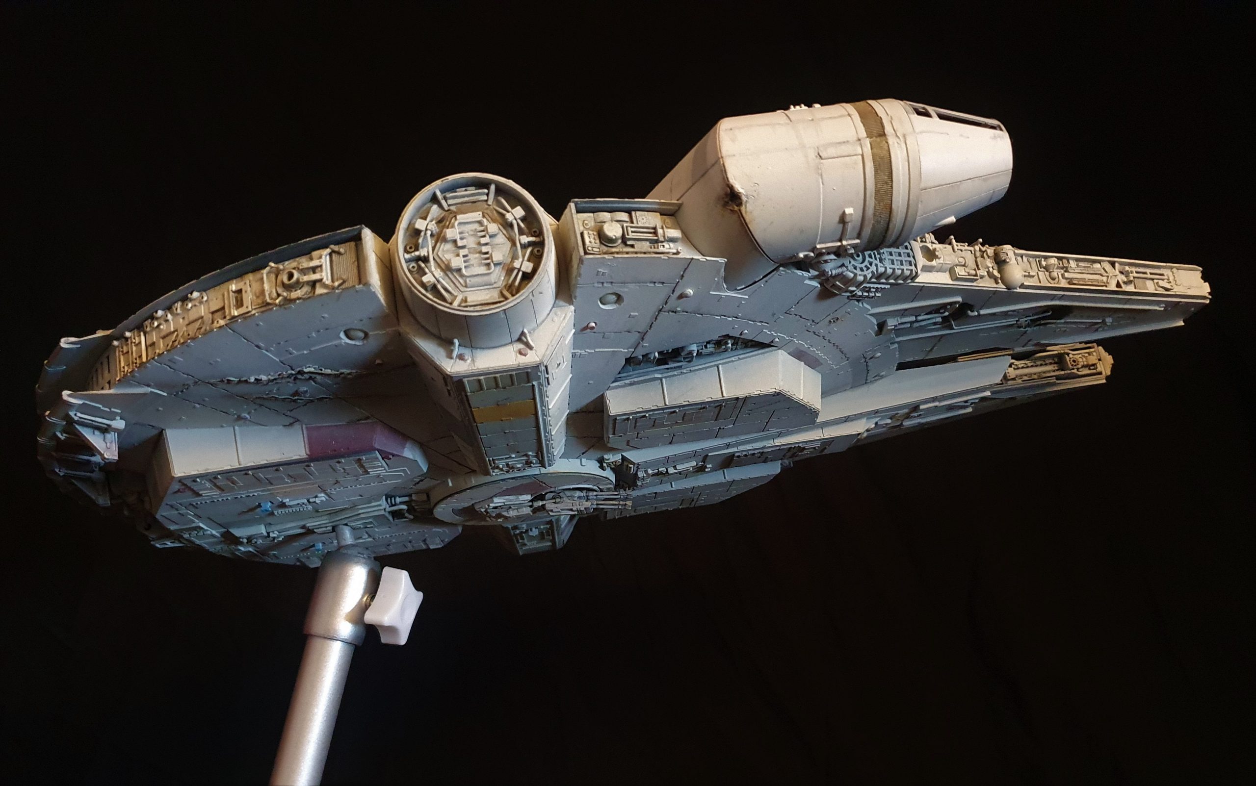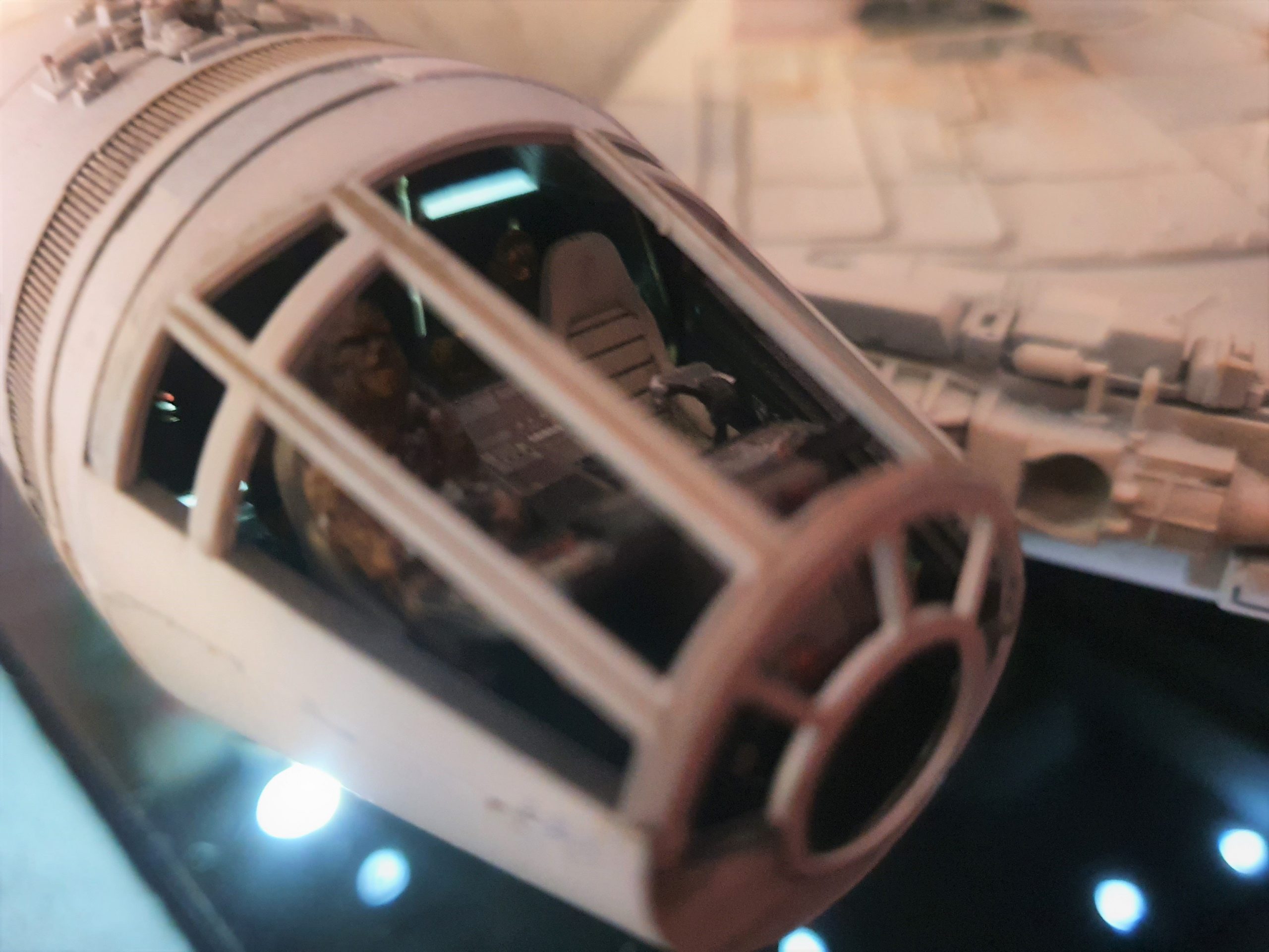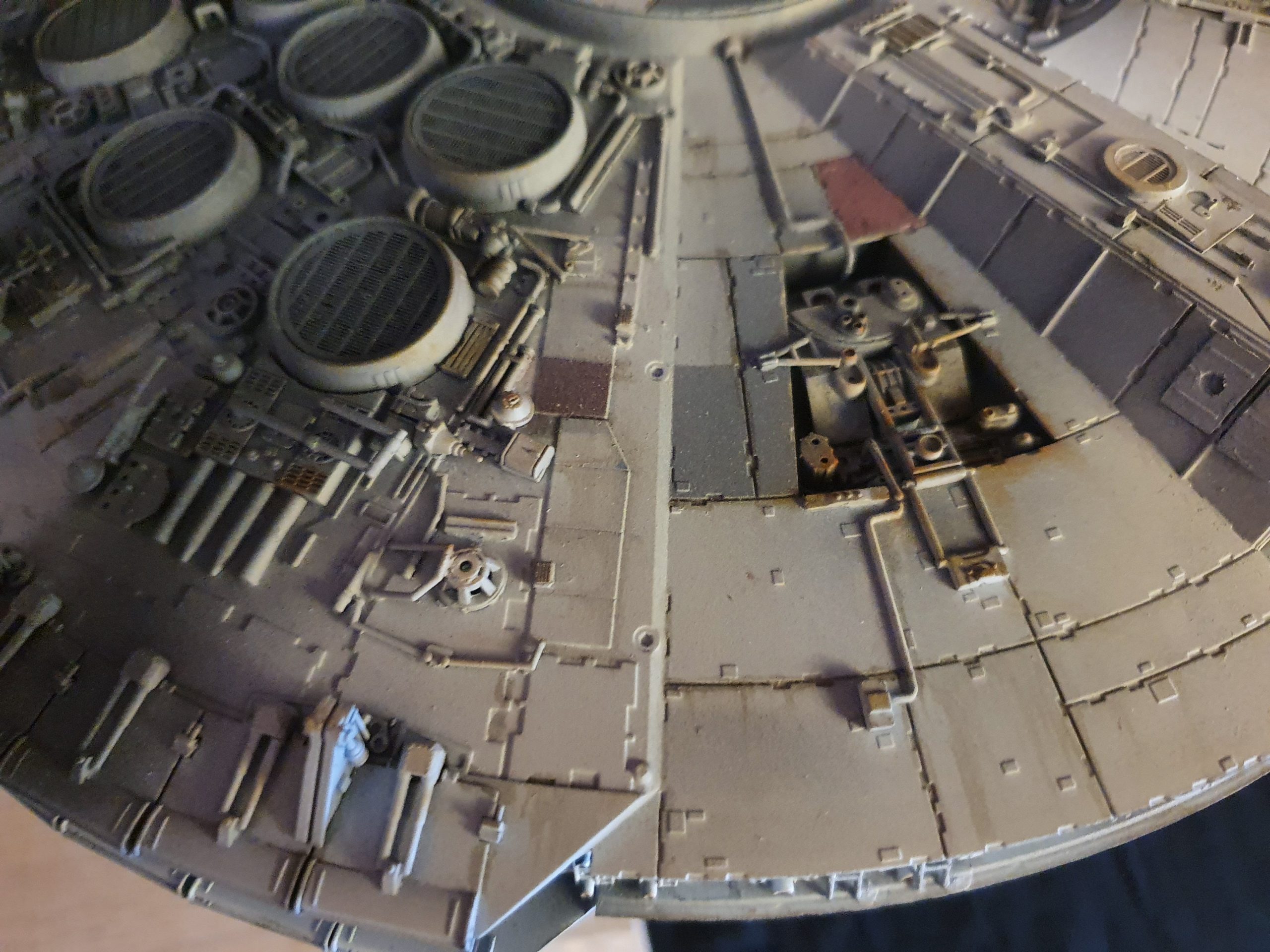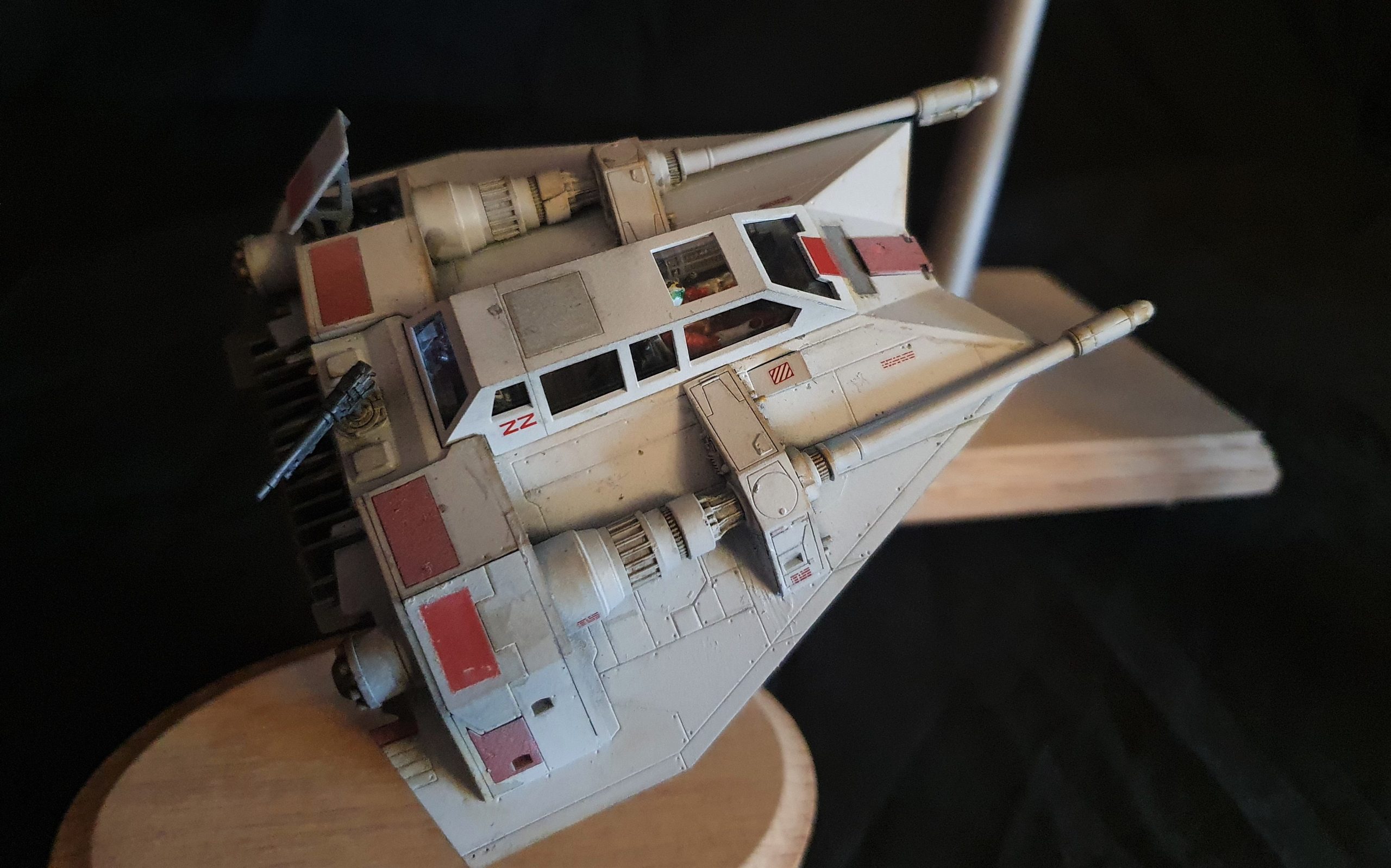 A 1/72 Fine Molds Millennium Falcon, fully lit and also includes the landing lights and collision light son the underside of the ship. The engines, cockpit, front lights and gun wells are lit separately to the landing lights and there are 2 separate push button switches on the underside of the model to activate these. The model is battery powered by two 12v 23a batteries, one for each circuit. The Falcon can be set in either landed configuration or there is a Panavise mount for flight configuration. The batteries are held in using strong earth magnets in the rear landing bays. The landing gear and covers are interchangeable so you can decide how you best want to display the model. Chewie and C3PO are in the cockpit and Luke and Han are manning the quad lasers in the lit gun wells, naturally the fastest hunk of junk is well weathered! The photoetched set from Paragrafix and the solo resin factory upgrade parts have also been used to make the display. I am also going to include a Bandai 1/48 Snowspeeder and a Revell 1/50 T-70 resistance X-Wing free with the sale .