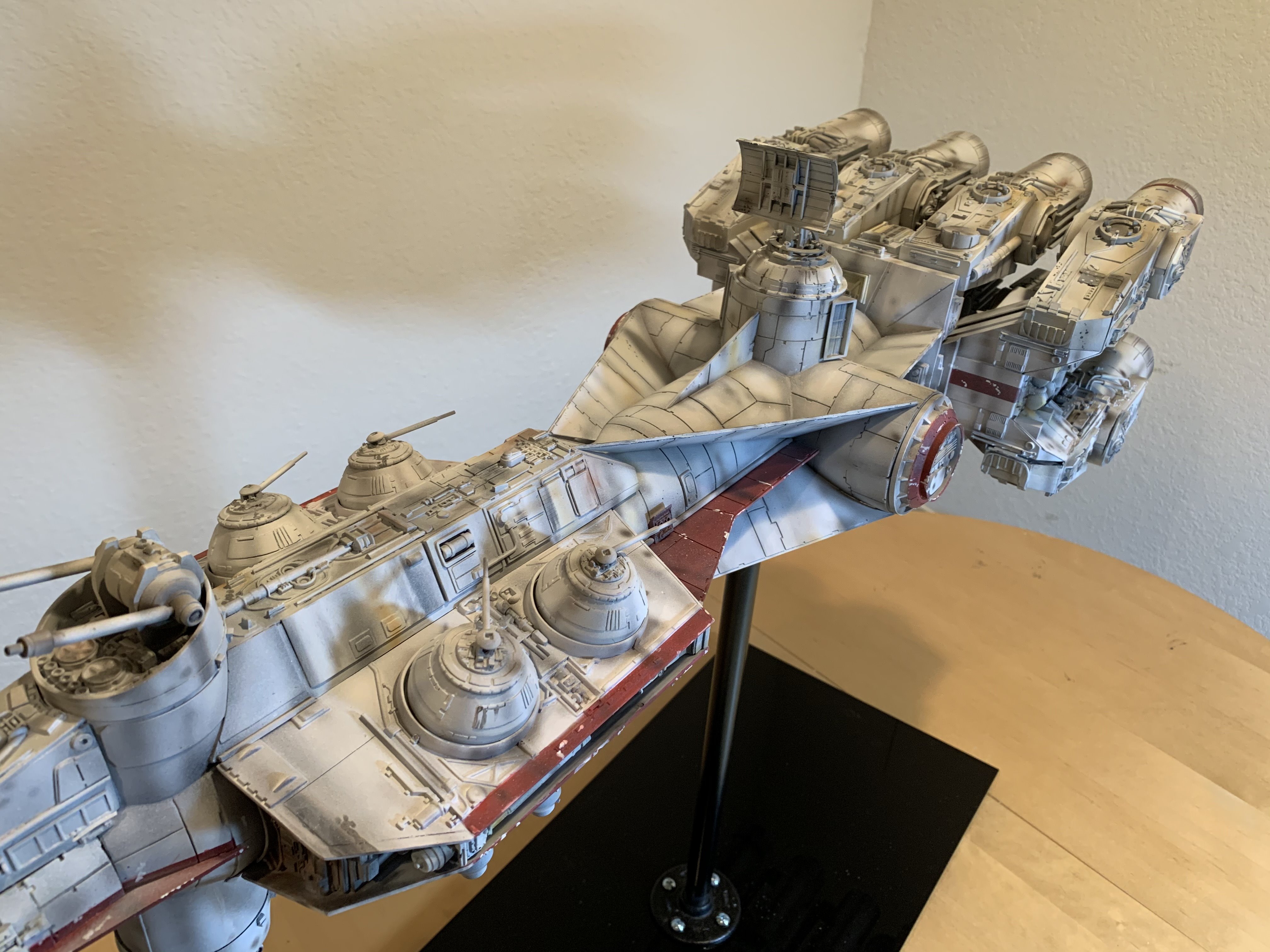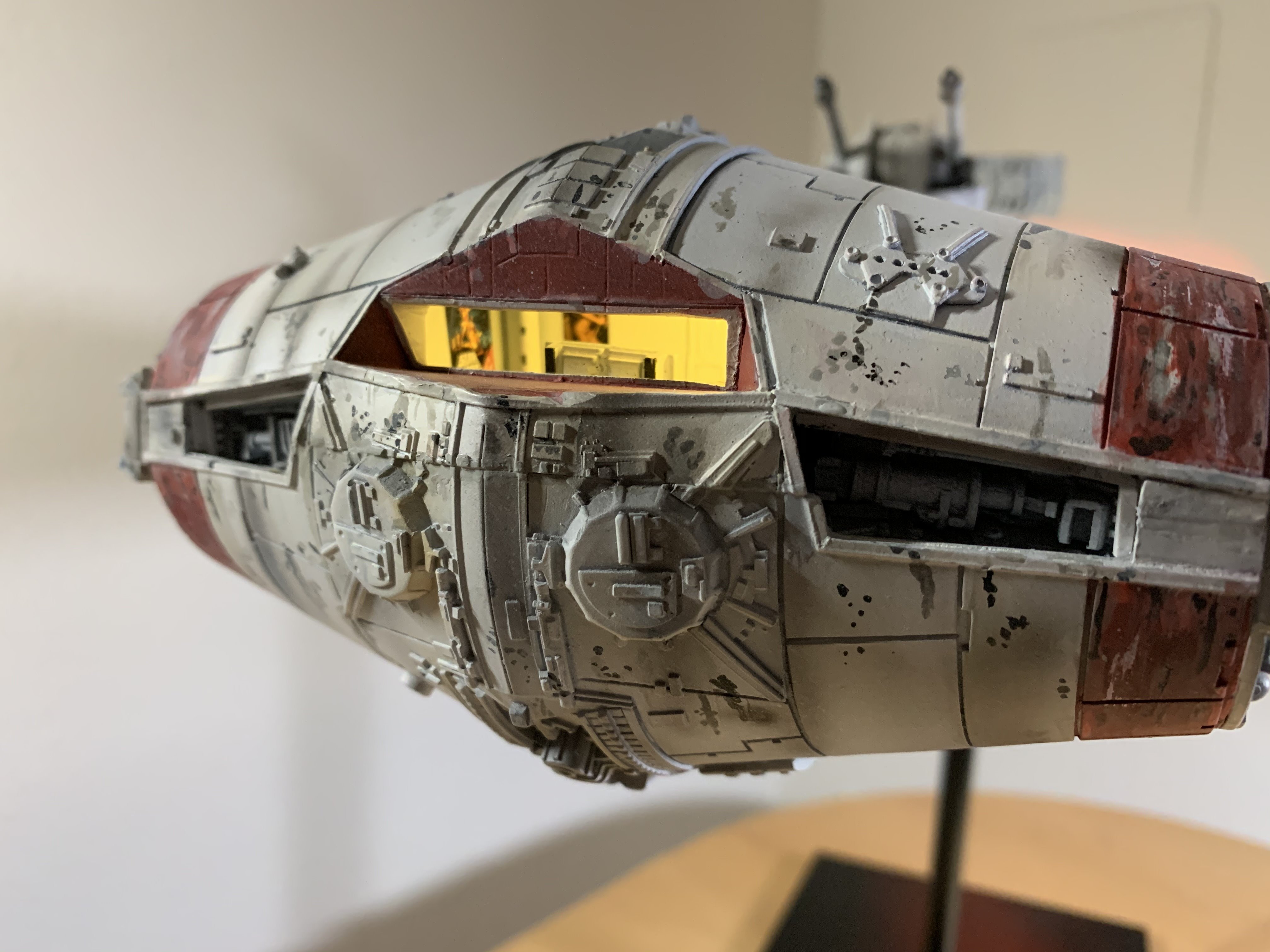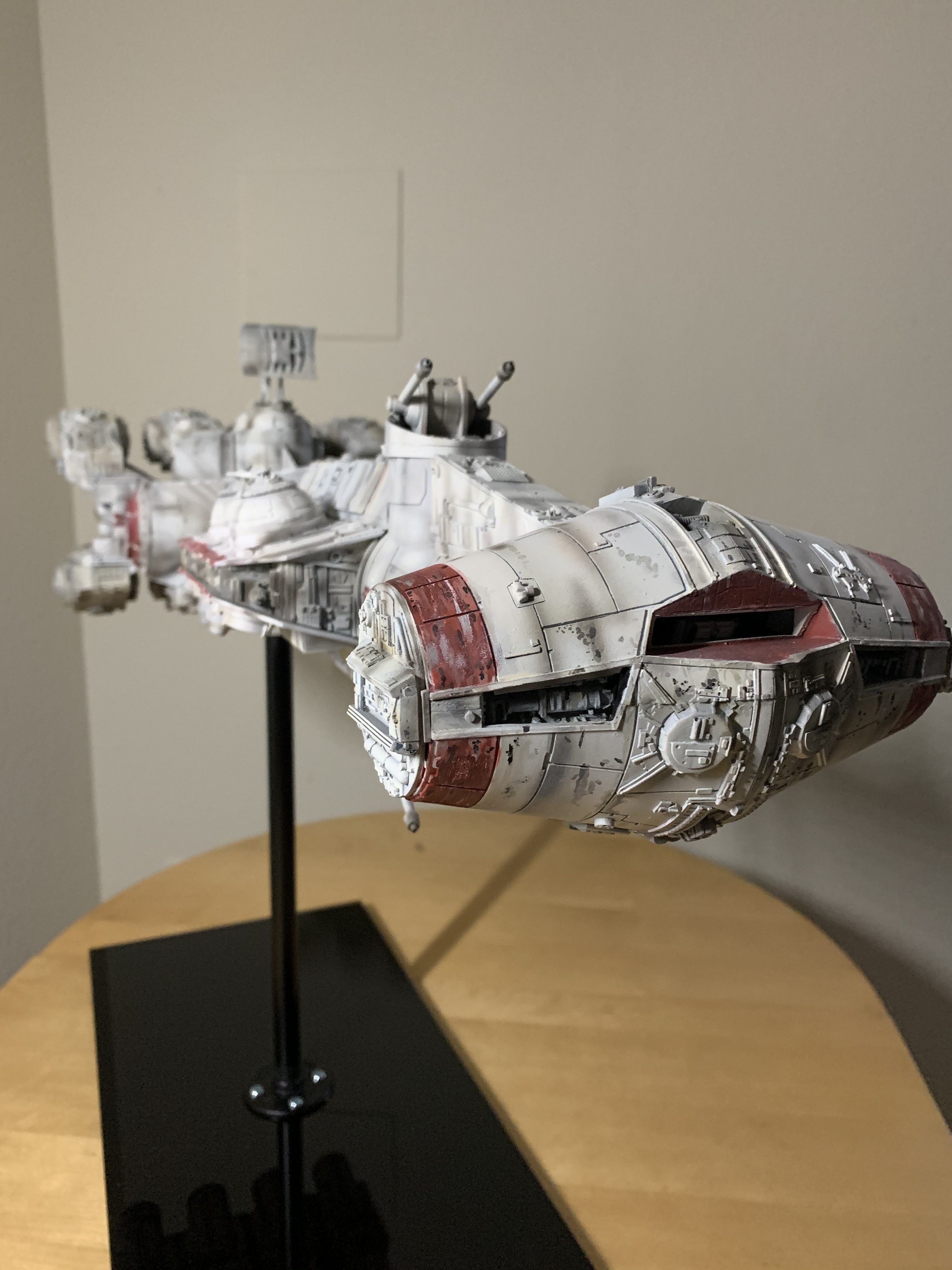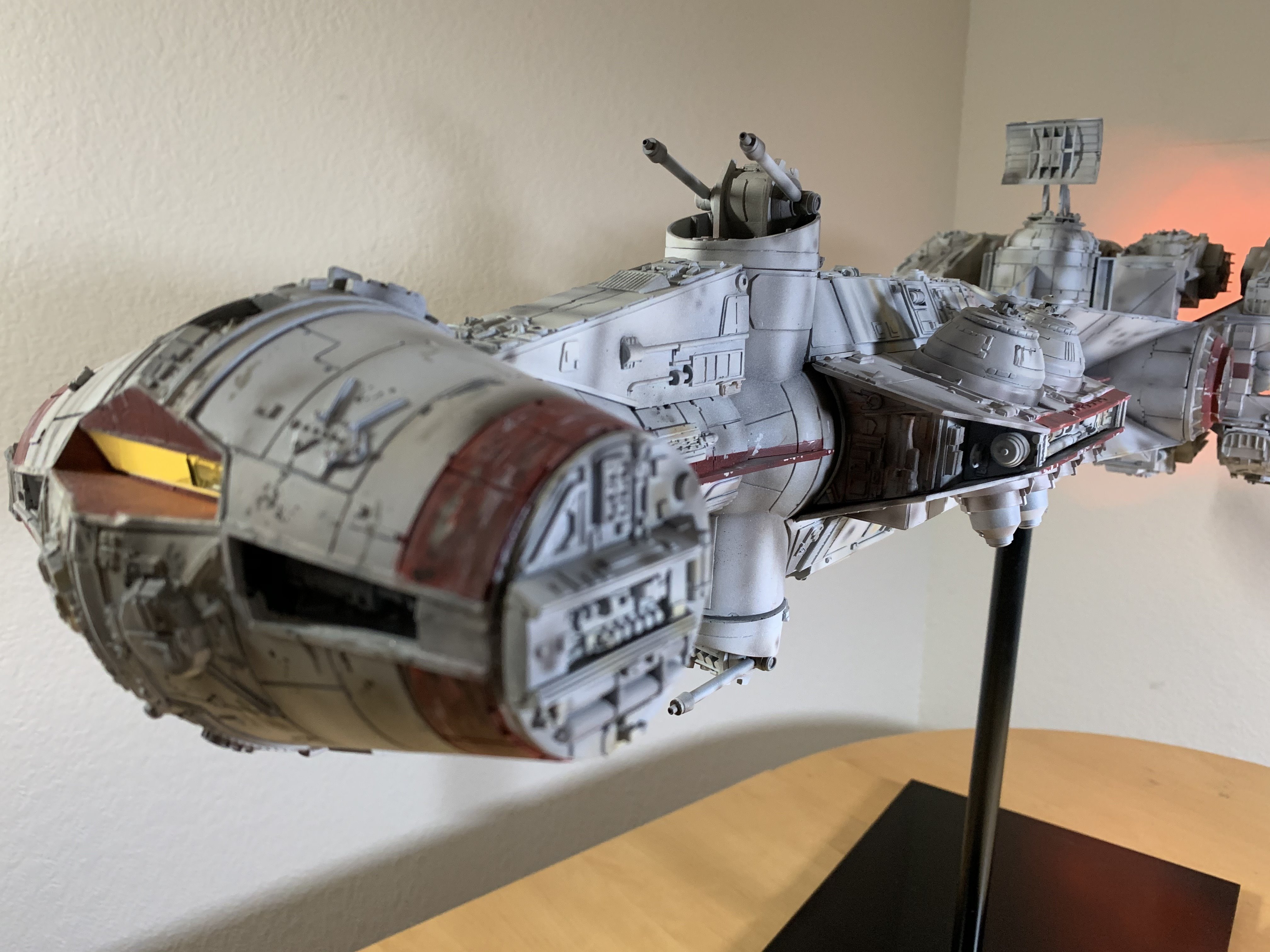 This is my Korbanth Blockade Runner buildup. Measuring in at almost 38 inches in length, this kit was a joy to build! Painted with Archive X enamels, it’s guns and radar dish are positionable as well. It’s fully lit and has a scratch built bridge interior, which includes both Star Wars and Centerfold posters. This is a large model, and weighs in at almost 25 pounds with the base. Runs on a single 9-volt battery, easily accessed through side bulkhead.