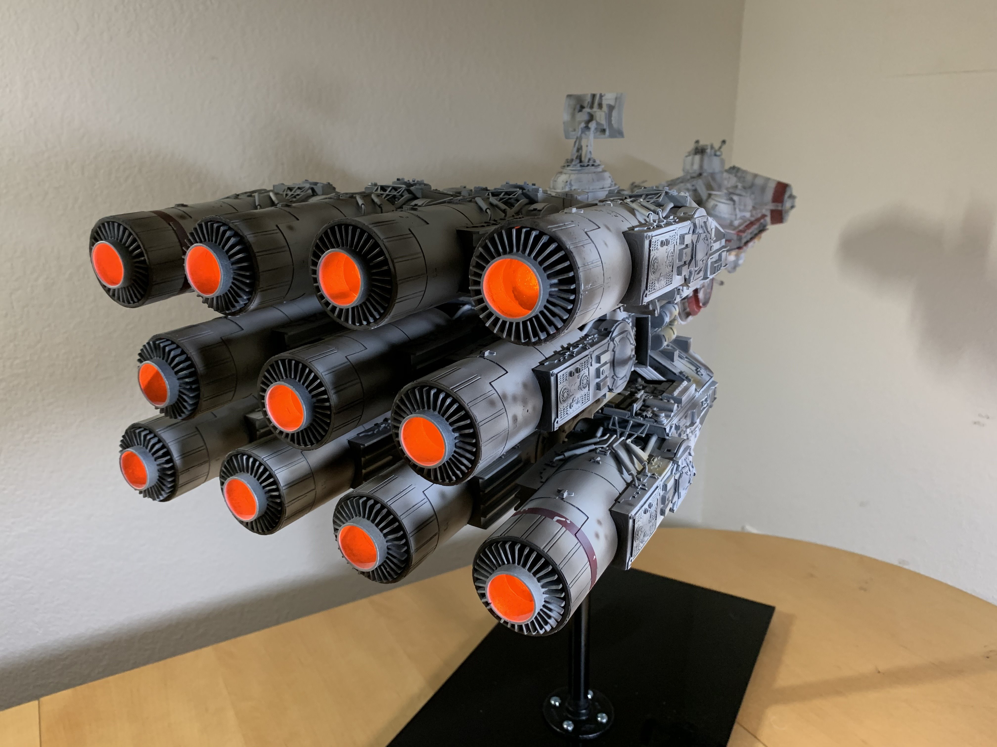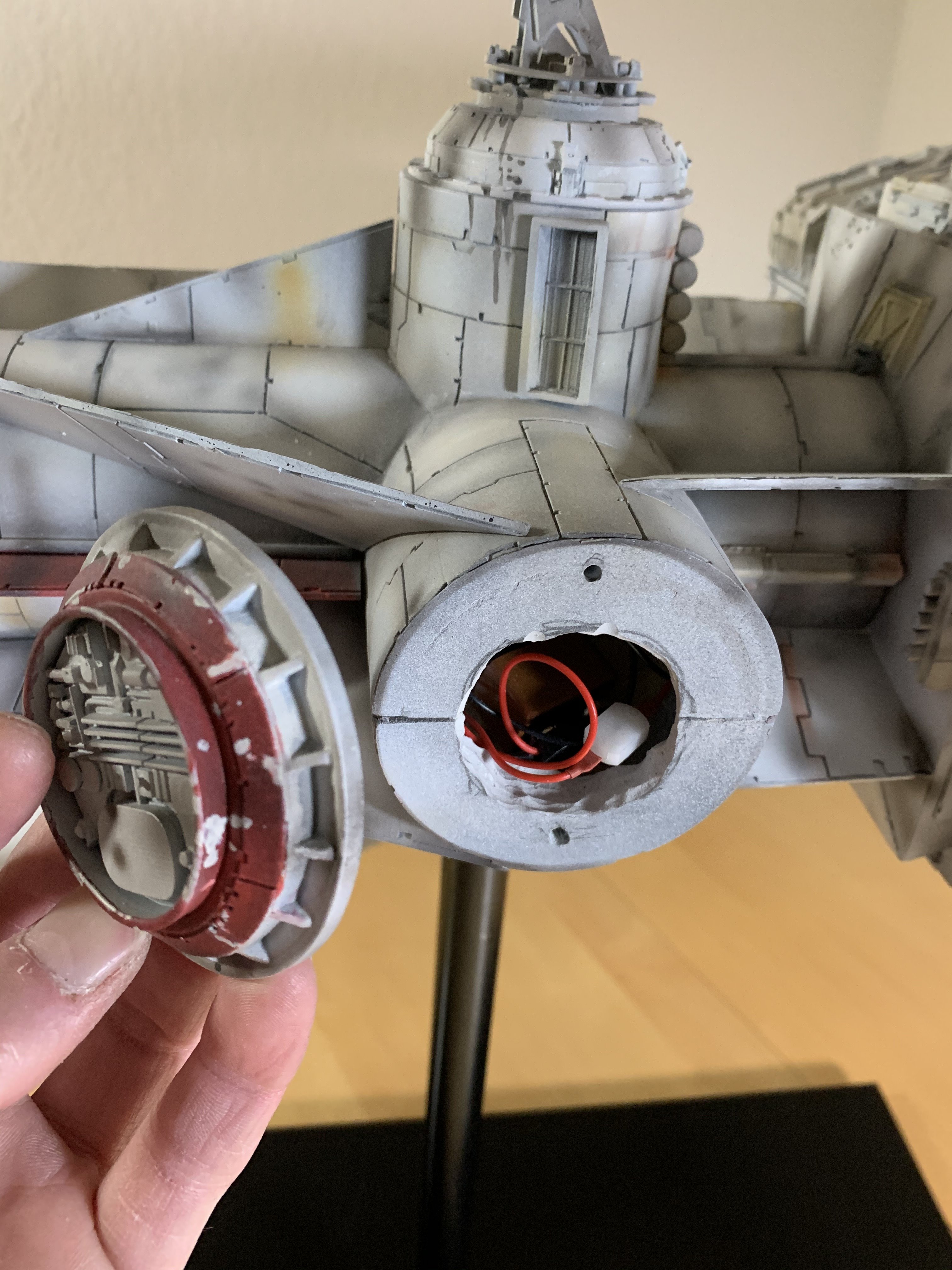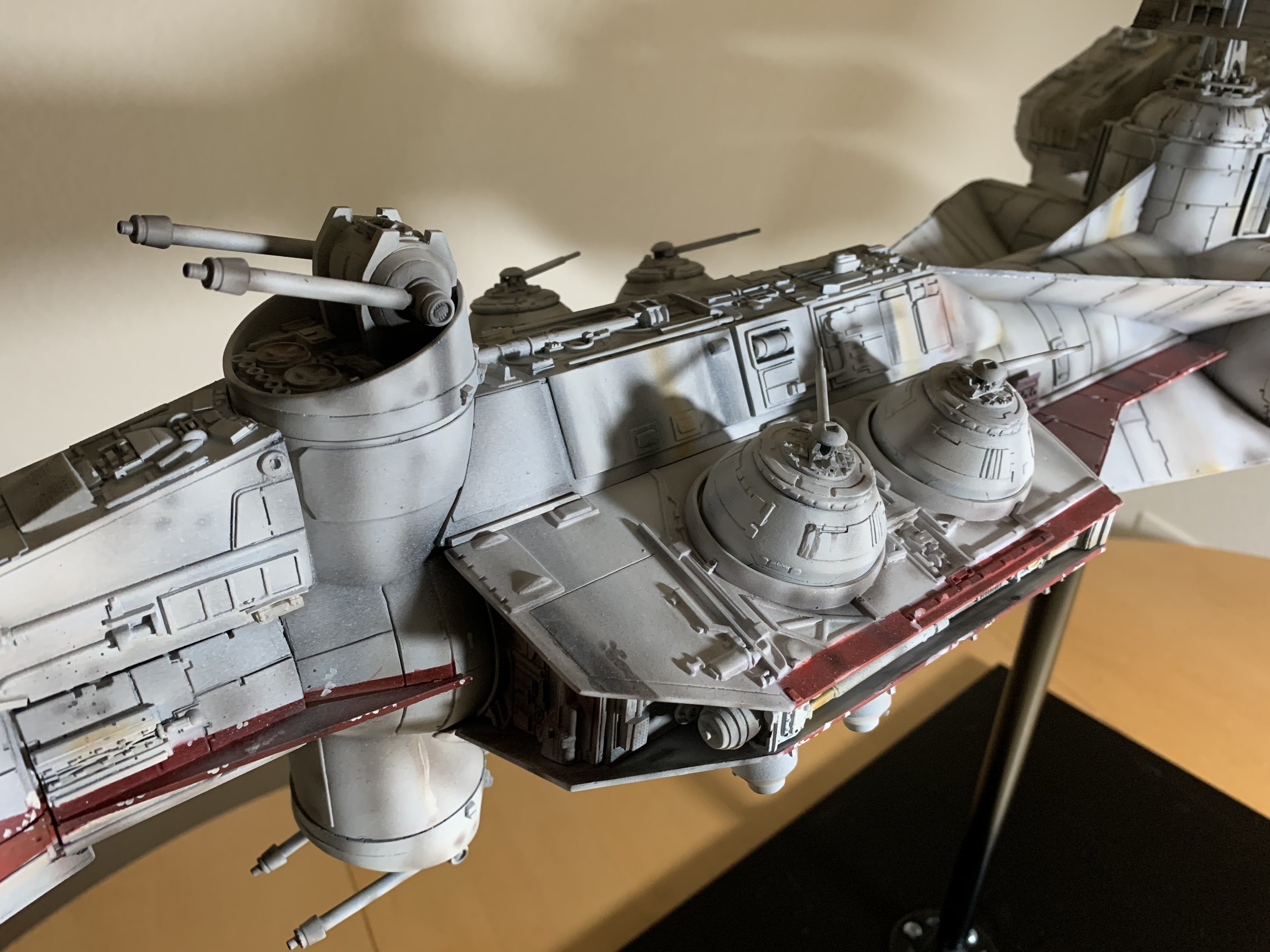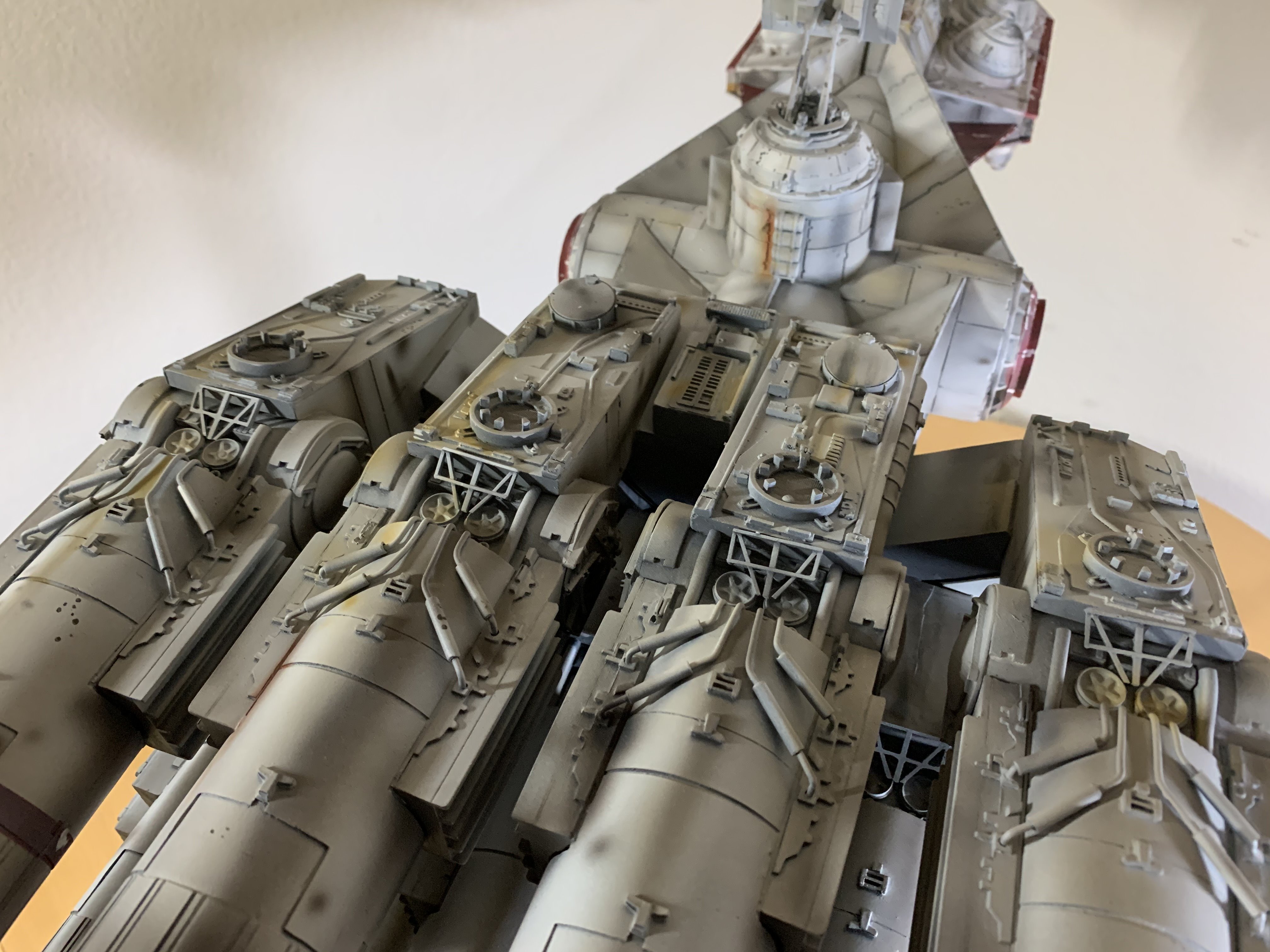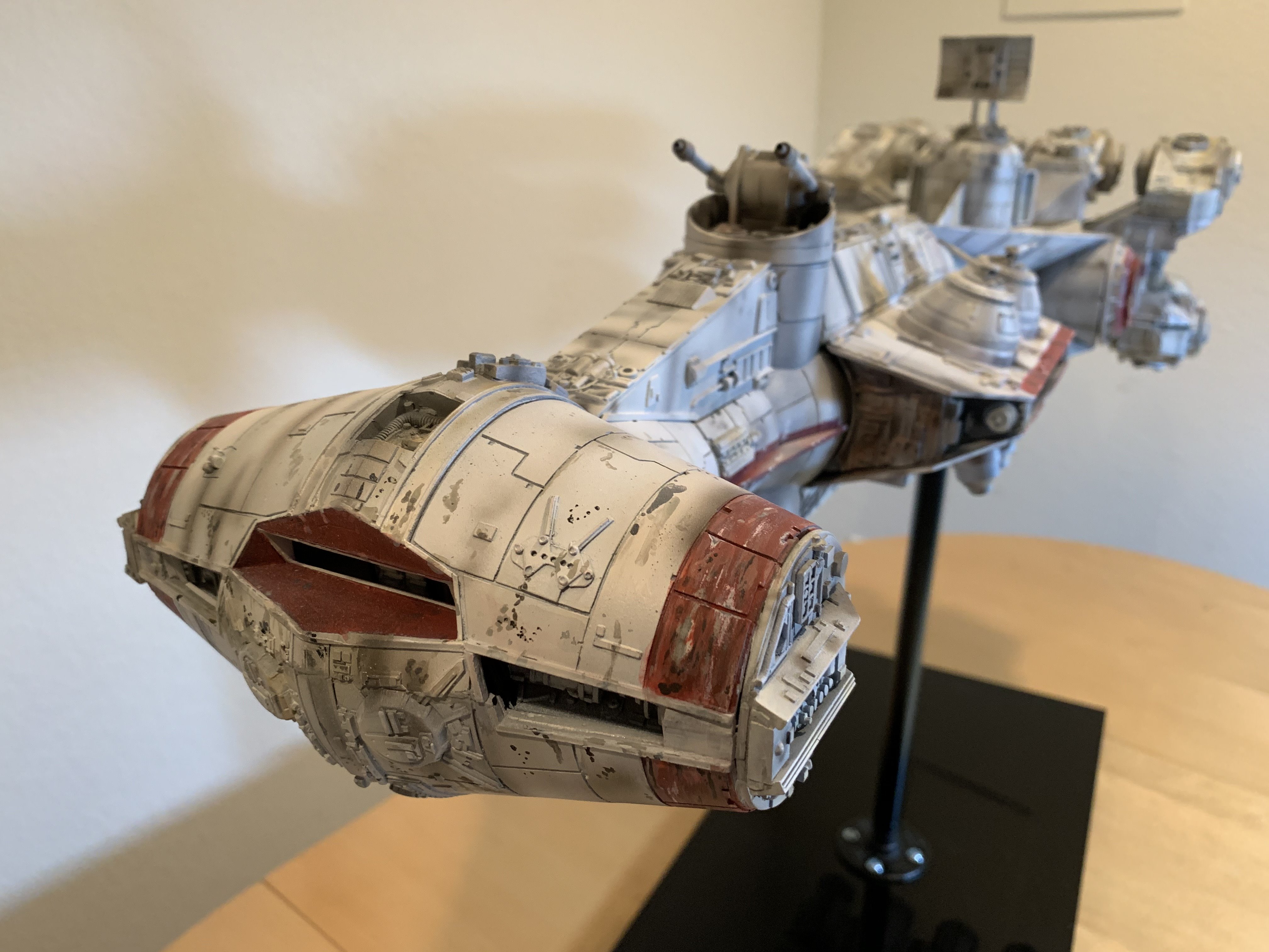 This is my Korbanth Blockade Runner buildup. Measuring in at almost 38 inches in length, this kit was a joy to build! Painted with Archive X enamels, it’s guns and radar dish are positionable as well. It’s fully lit and has a scratch built bridge interior, which includes both Star Wars and Centerfold posters. This is a large model, and weighs in at almost 25 pounds with the base. Runs on a single 9-volt battery, easily accessed through side bulkhead.